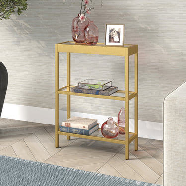 Clean, minimalist lines and sturdy tempered glass make this console table the perfect addition to your living room, bedroom or entryway. Proudly display knick-knacks, magazines and more on the tempered glass top and lower shelves. The streamlined look and neutral metallic finish pairs seamlessly with your existing color scheme and décor style, while its modest dimensions create extra storage in the smallest spaces.