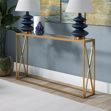 Featuring modern geometric sides, this console table is the perfect addition to your living room or entryway. The glass tabletop can hold up to 40 lbs and will welcome any guest with the beautiful view of flowers, your favorite photos and any other trinket you choose. The neutral metallic finish allows it to blend seamlessly with your existing color scheme and decor style.