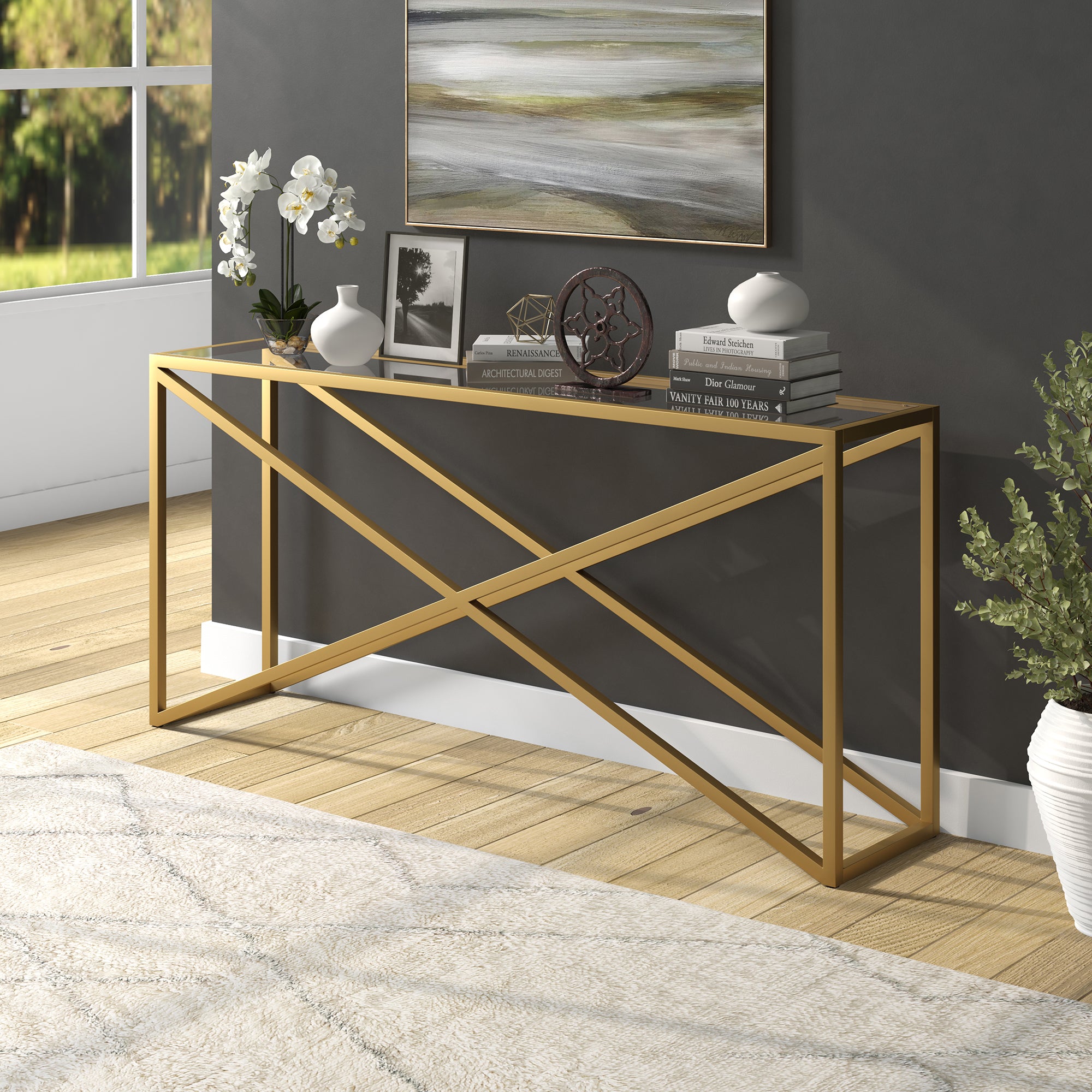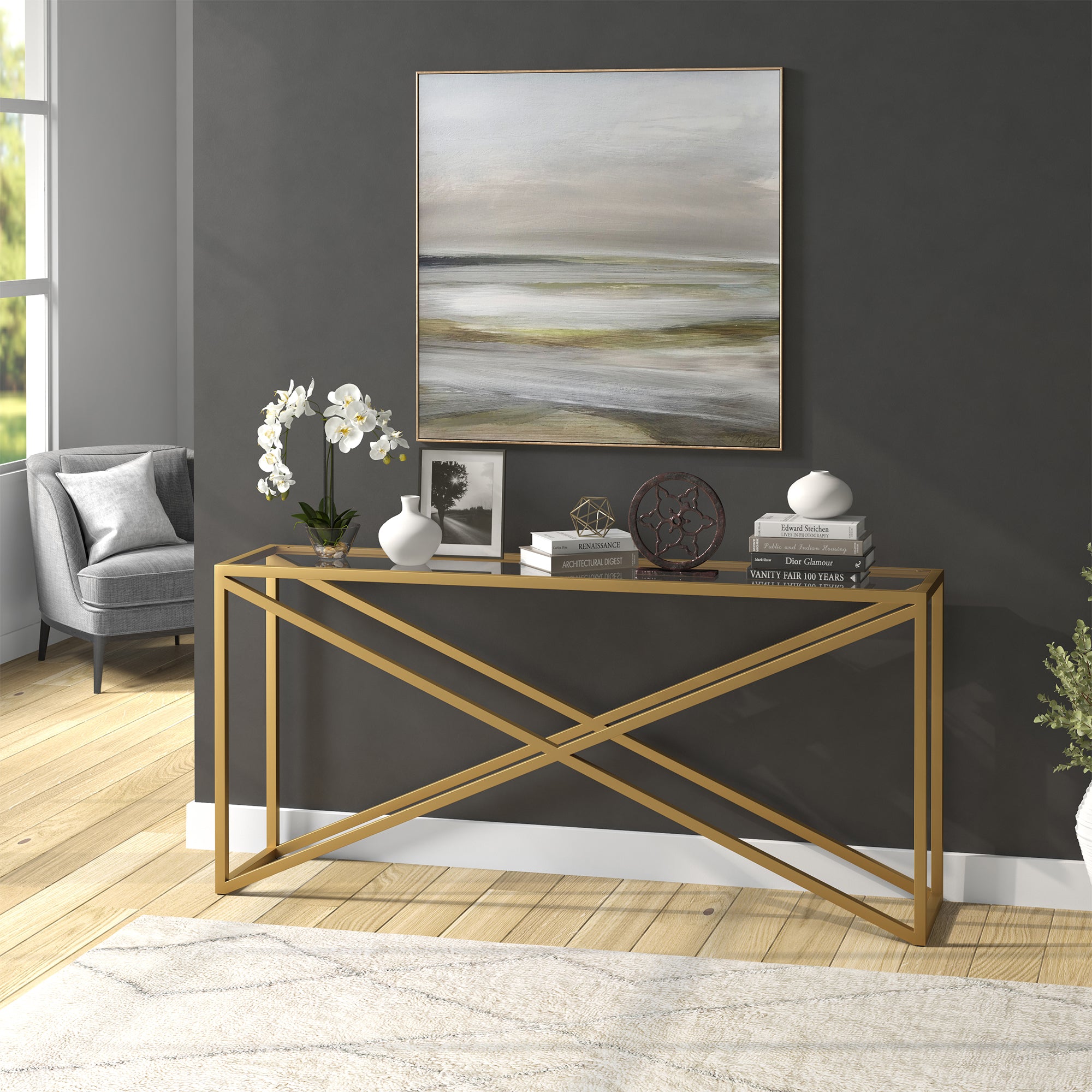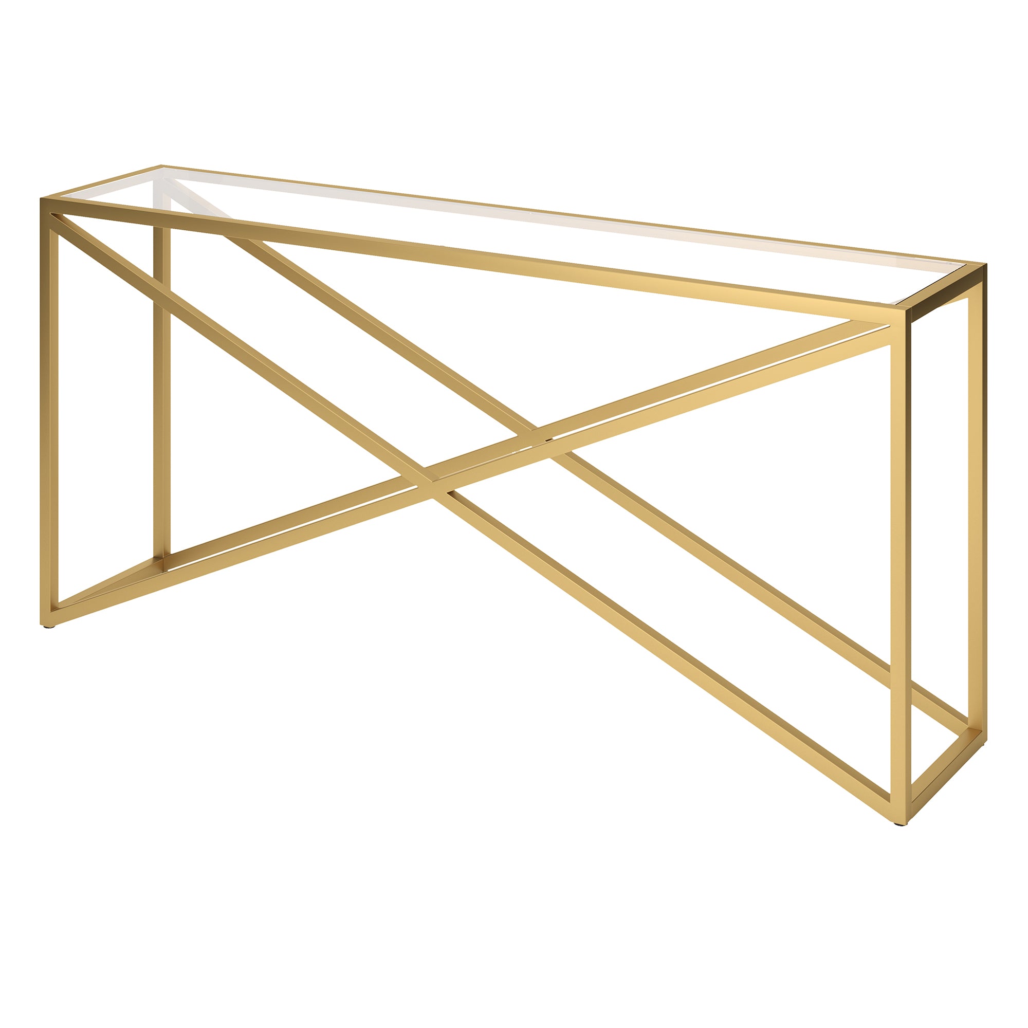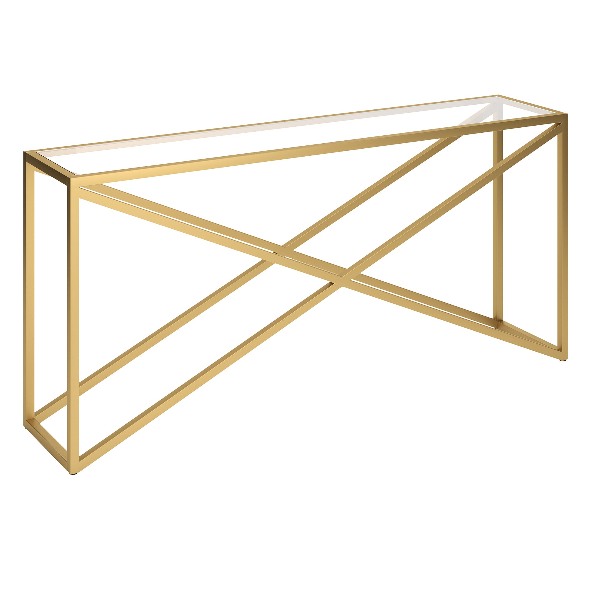 This urban inspired accent table is the perfect pick for your living room or den ensemble. Its base features x-shaped legs creating geometric interest. The top is a transparent tempered glass which shows off the architectural connection and carries the structured design through the frame.