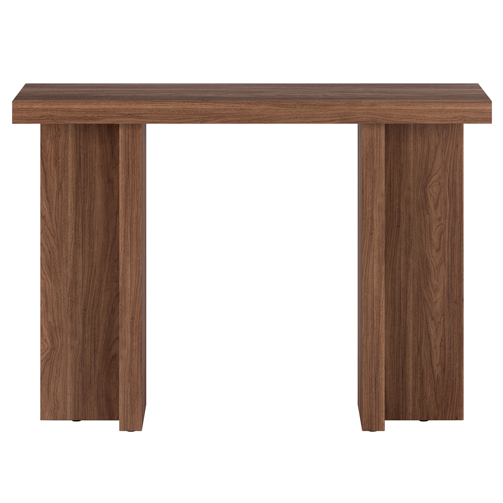 Simple yet eye-catching, this modern console table emphasizes bold, straightforward design. The double pillar style and T-shaped legs create geometric interest, while the natural wood-look finish adds texture and tonal variation to your space. The frame and tabletop are a uniform thickness for the cleanest of lines. Featuring a 50 lb. weight capacity and adjustable leveling feet, this 44" wide piece will imbue your living room, hall, or entryway with an on-trend and functional focal point.