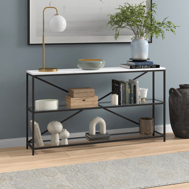 Create a warm welcome with the clean yet striking lines of this 55" console table. Whether tucked behind the sofa or as a display for a menagerie of trinkets, this console table is the perfect backdrop to create a magazine-ready display. With its durable steel frame and faux marble top, it creates a contemporary glam look in any living area. The clean lines of the tabletop and frame are offset by the geometric X-framed back supports, creating visual interest and making it easy to incorporate into a variety of styles and spaces.