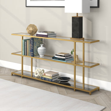 A bold linear profile sets this modern contemporary console table apart. Its inset frame echoes the cantilevered design of mid-century architecture, while the durable tempered glass shelves create an artful backdrop for framed photos, flowers, or your favorite collections of decorative items. The eye-catching look can blend in or stand our wherever you need an extra bit of storage.