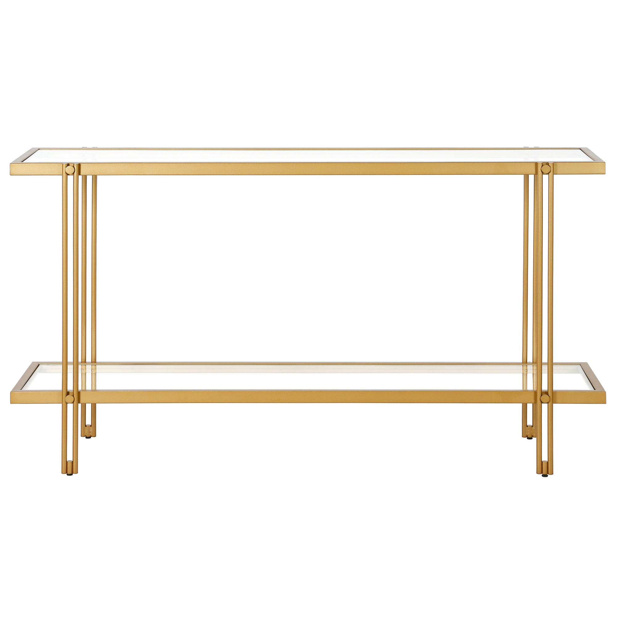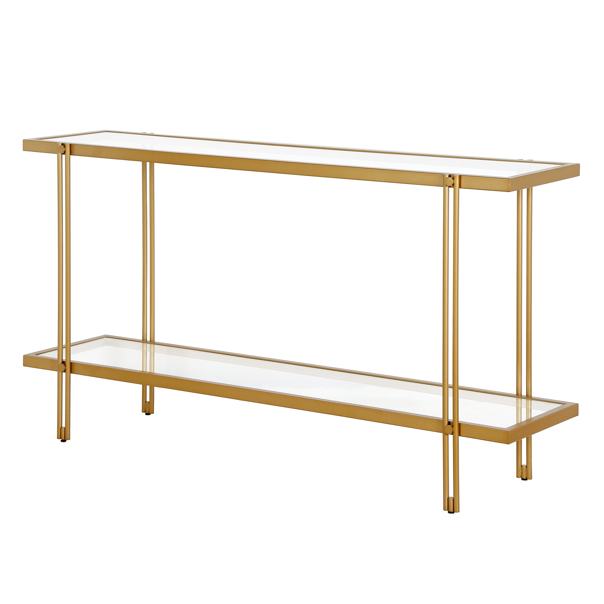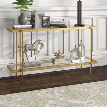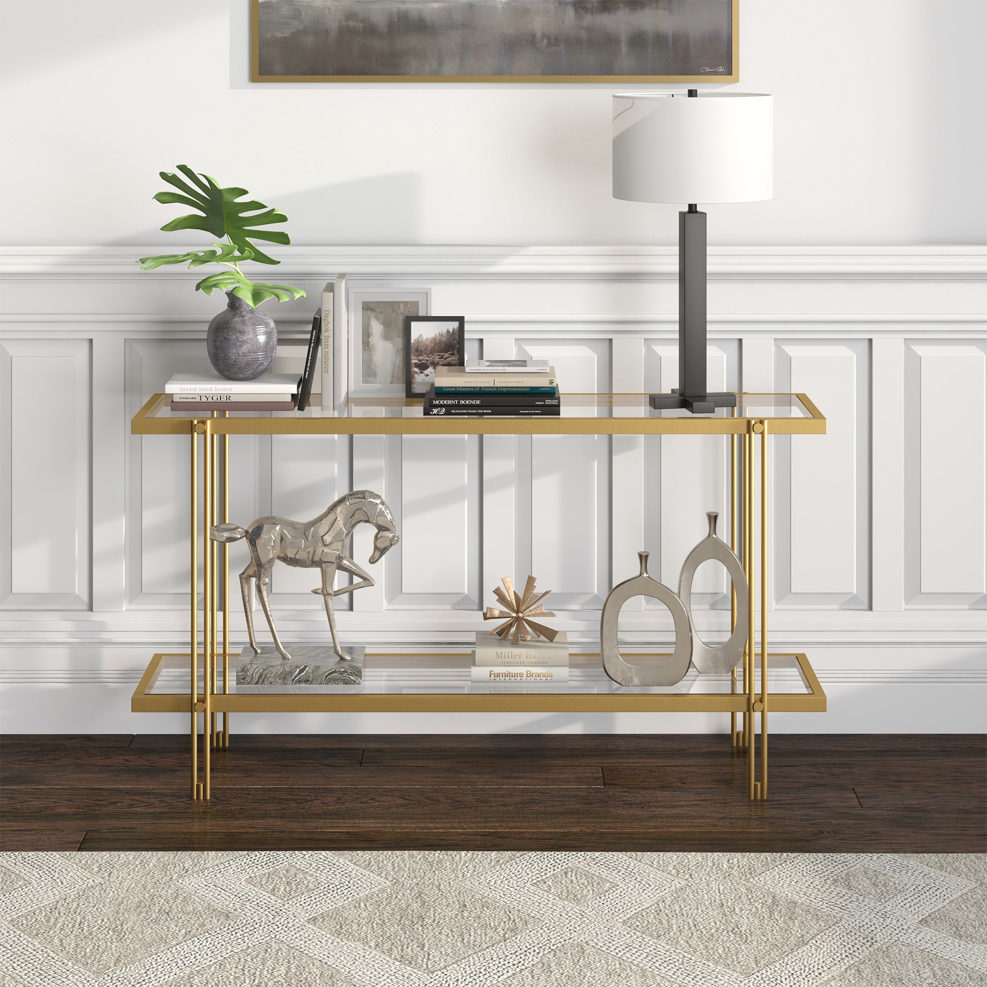 Complete your hallway or living room ensemble in modern style with this contemporary console table. Crafted of premium steel hand-crafted in a brass finish, this sofa or entryway table features a clean-lined rectangular silhouette on four straight legs. The open lower glass shelf is great for housing books, magazines, and extra belongings.