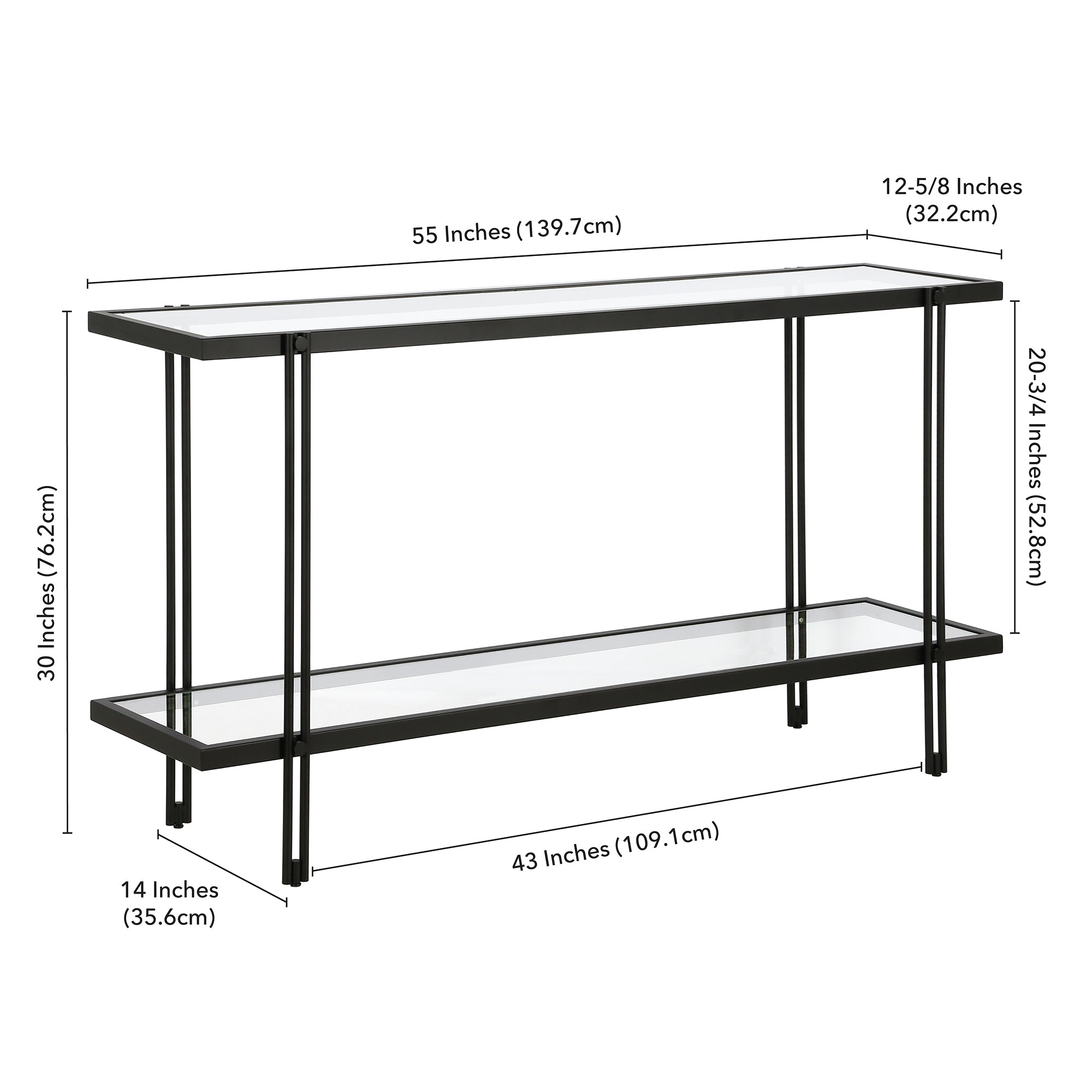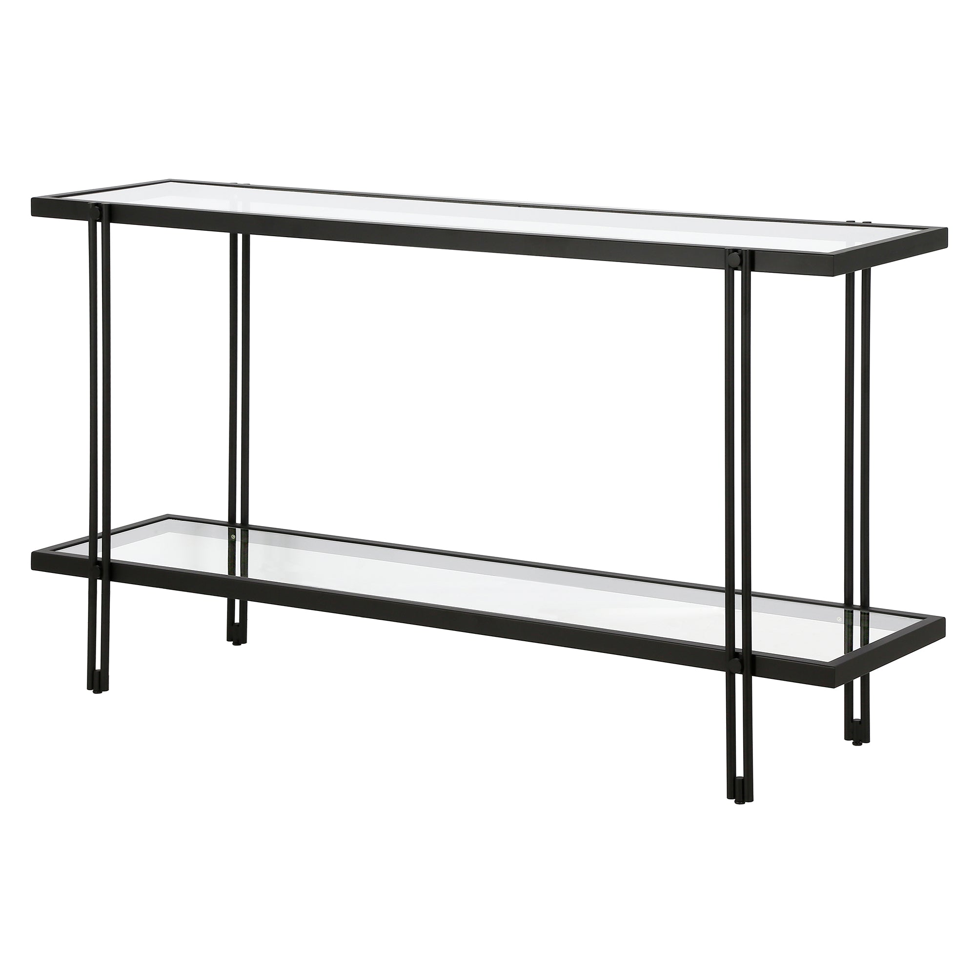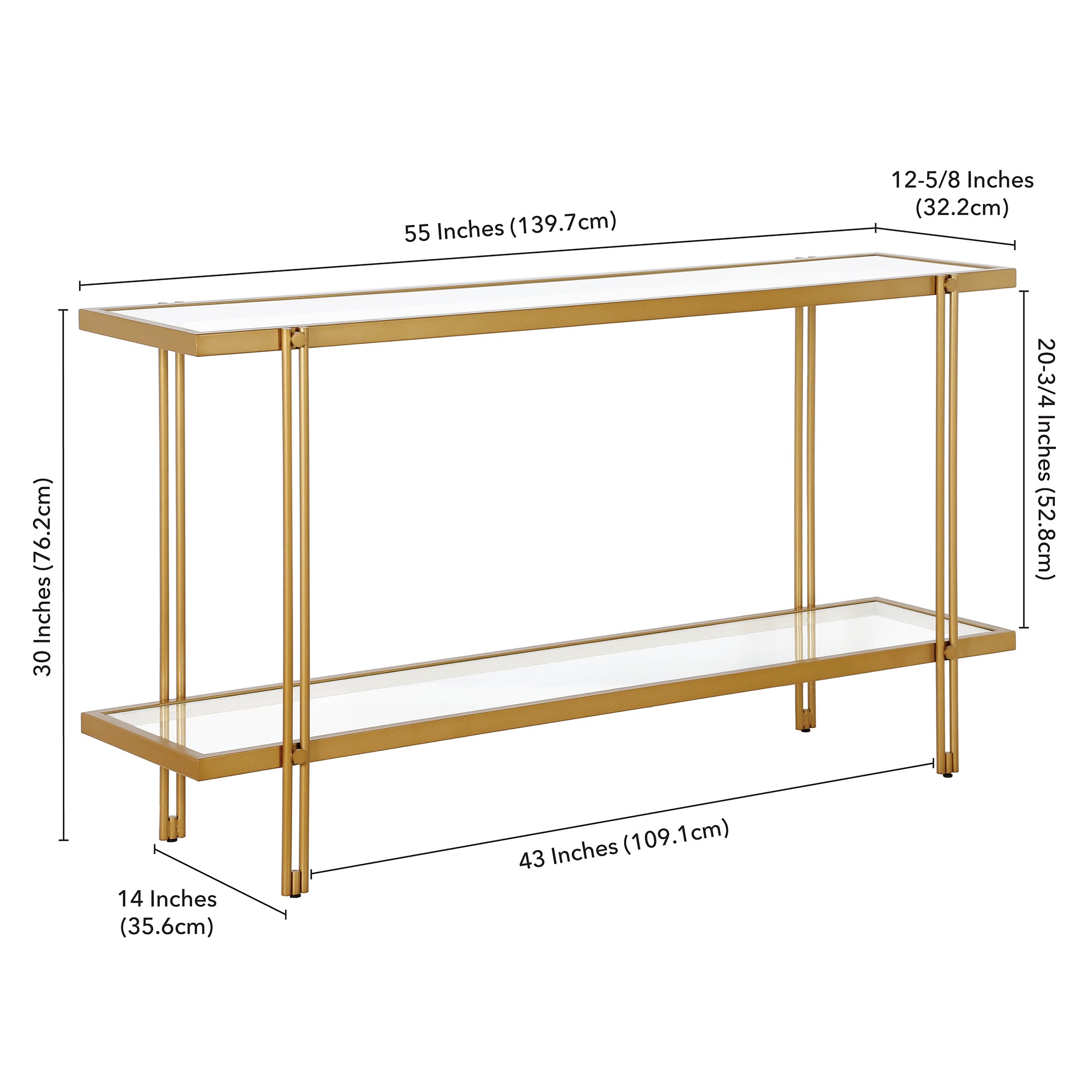 Complete your hallway or living room ensemble in modern style with this contemporary console table. Crafted of premium steel hand-crafted in a brass finish, this sofa or entryway table features a clean-lined rectangular silhouette on four straight legs. The open lower glass shelf is great for housing books, magazines, and extra belongings.