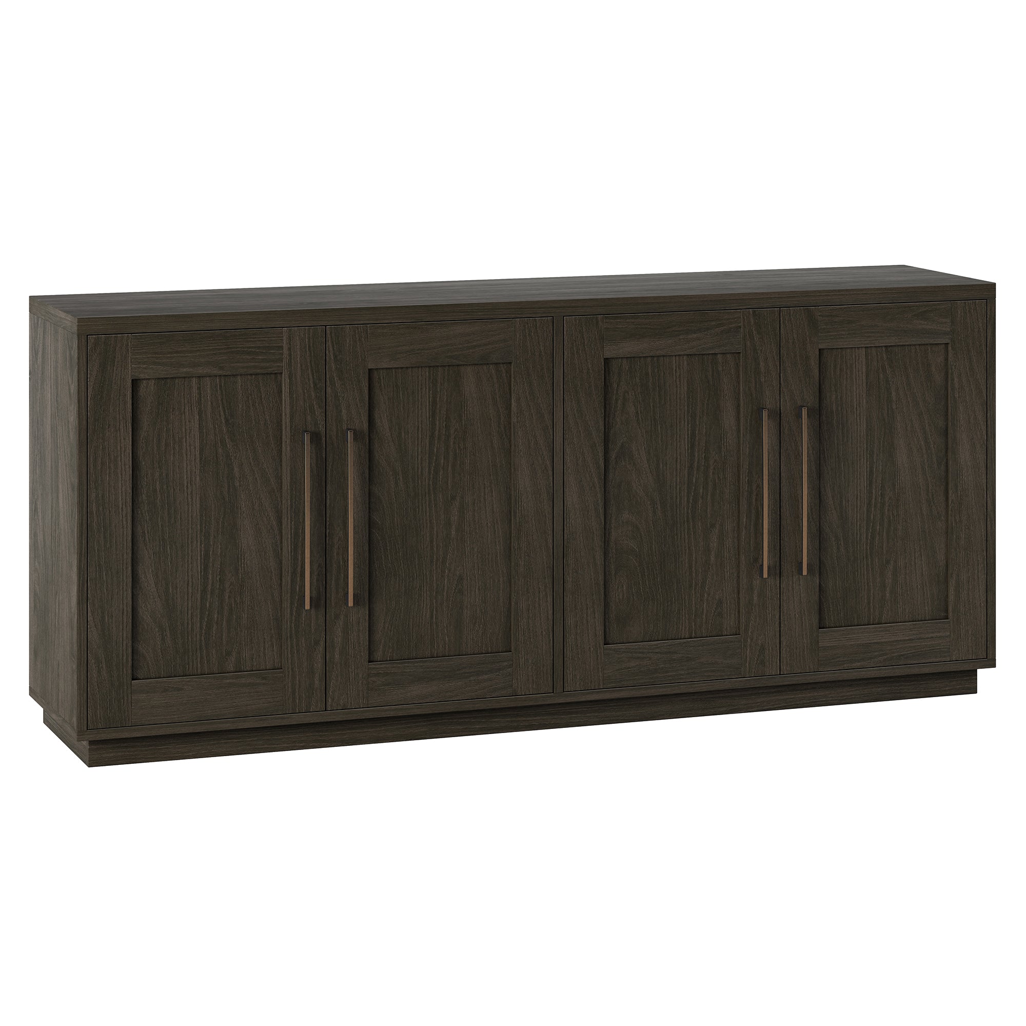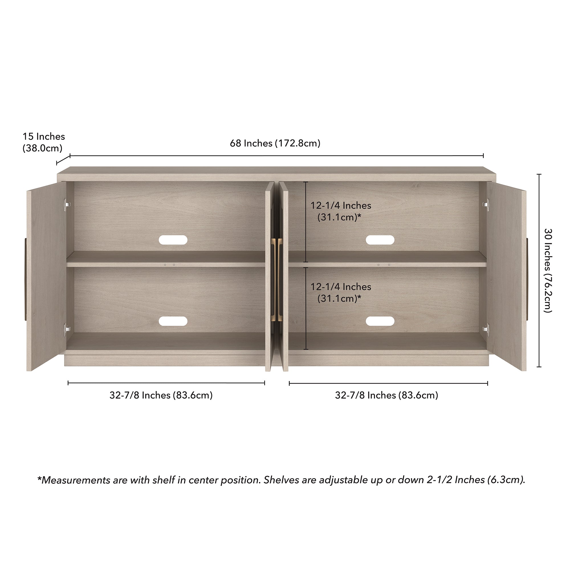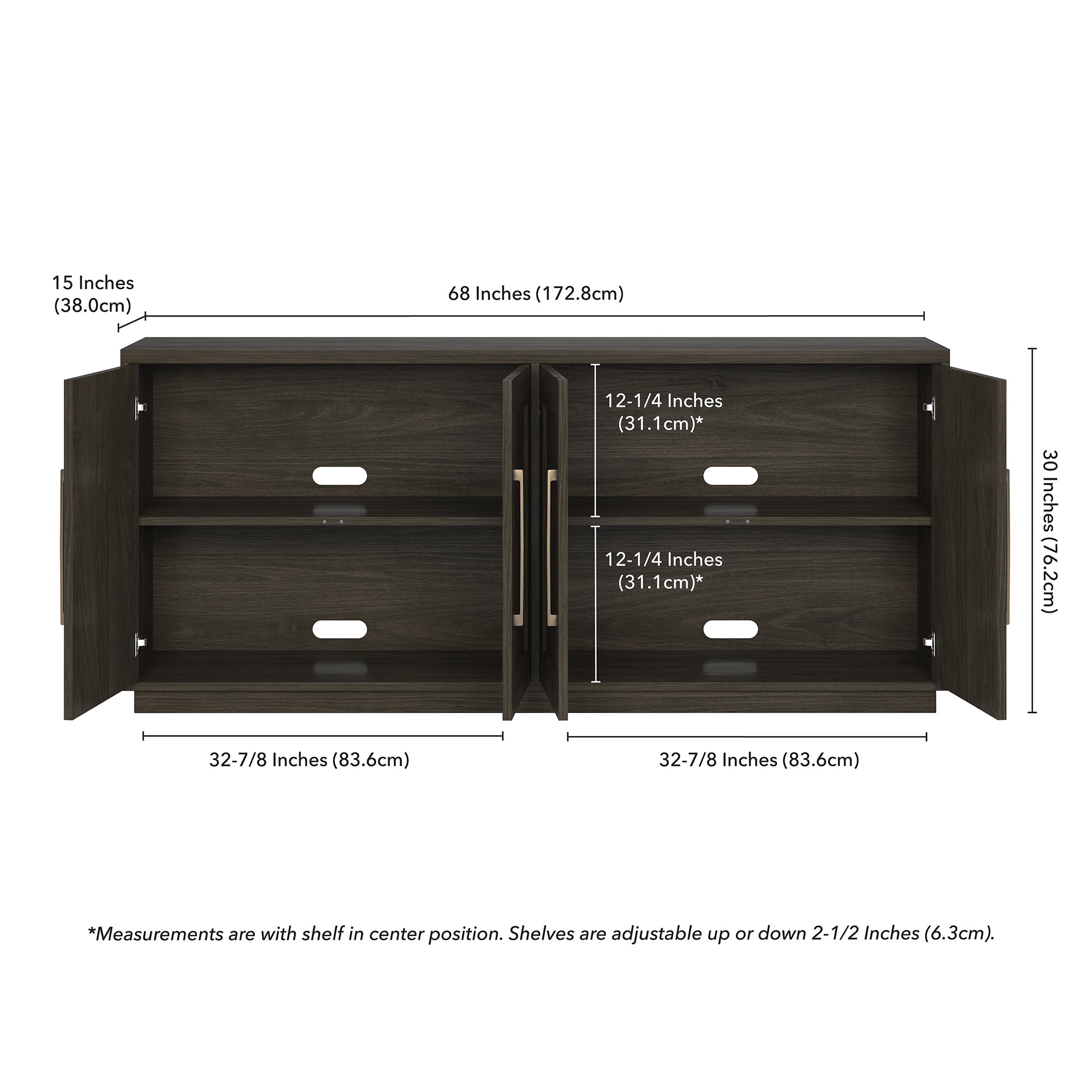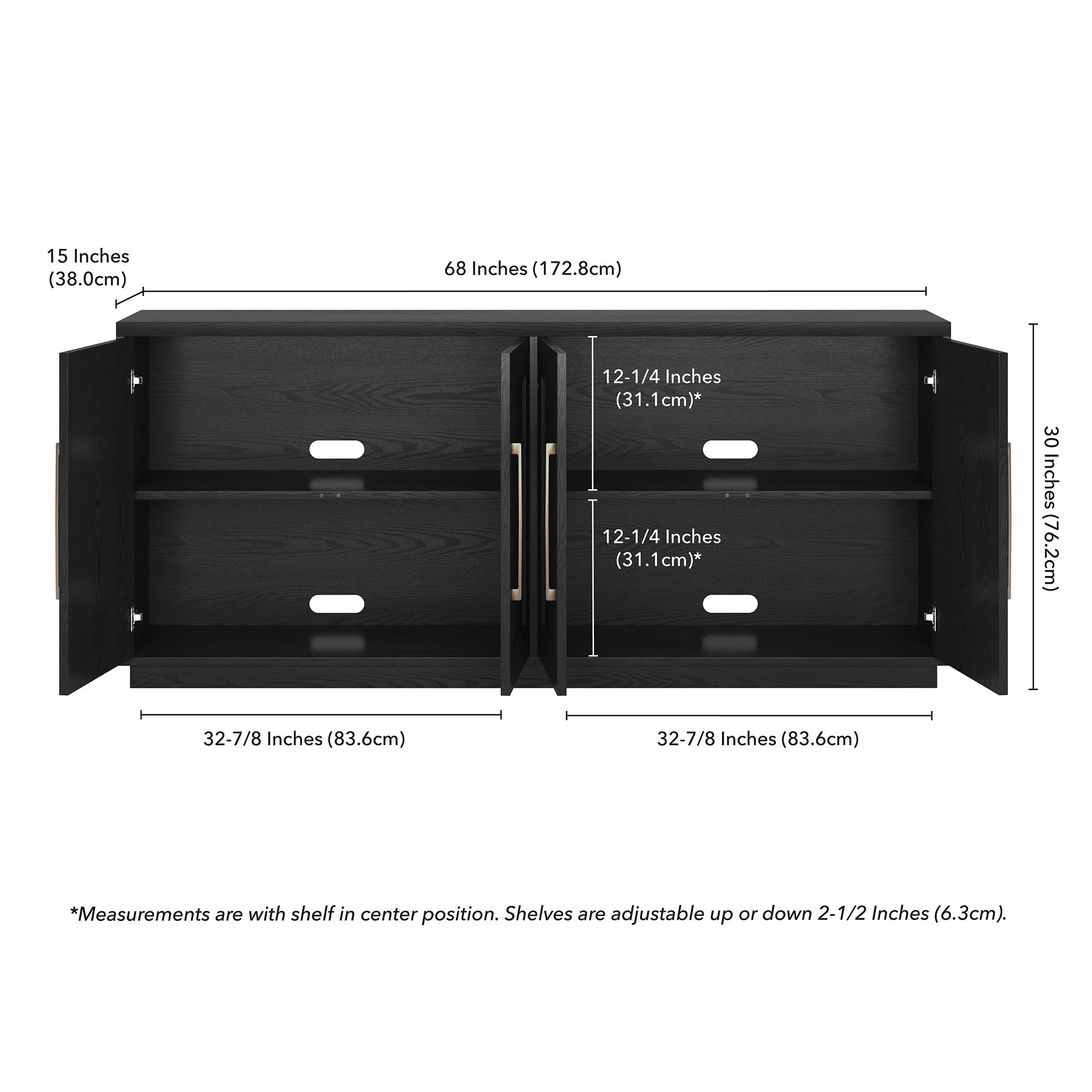 Cultivate effortless transitional style with the clean lines and eye-catching details of this 68” Buffet Table. Easy to style with many design inspirations, a rich wood-tone finish complements sleek metal cabinet handles. Featuring dual-level closed cabinet shelving, there’s plenty of storage space for your consoles and media collections, while cable management cut-outs in the finished back panel keep your cable and cord situation in check. Whether placed in your dining room or kitchen as a traditional buffet, or your living room for additional storage, this sturdy and spacious piece creates endless options for entertaining.