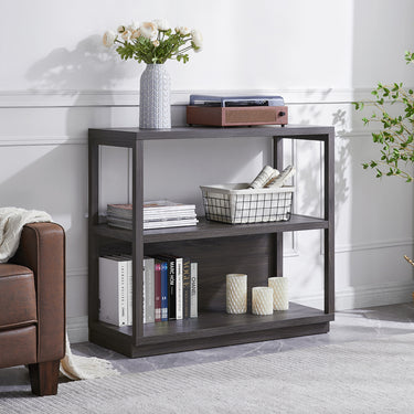Striking in its simplicity, this open plan bookcase emphasizes clean lines and straightforward design. This three-tiered storage solution features open-framed sides that create an airy exposed look, while the lower shelf's finished back anchors the piece and creates a solid backdrop for your library. Finished in a warm wood tone, this bookcase’s compact size makes it the perfect choice for smaller spaces.