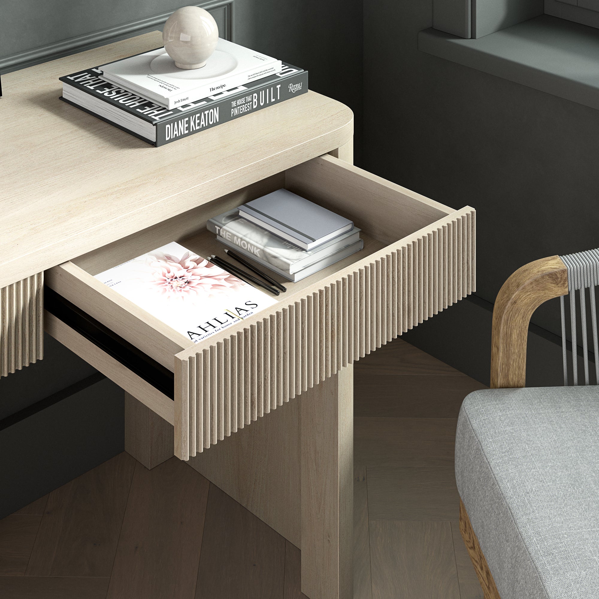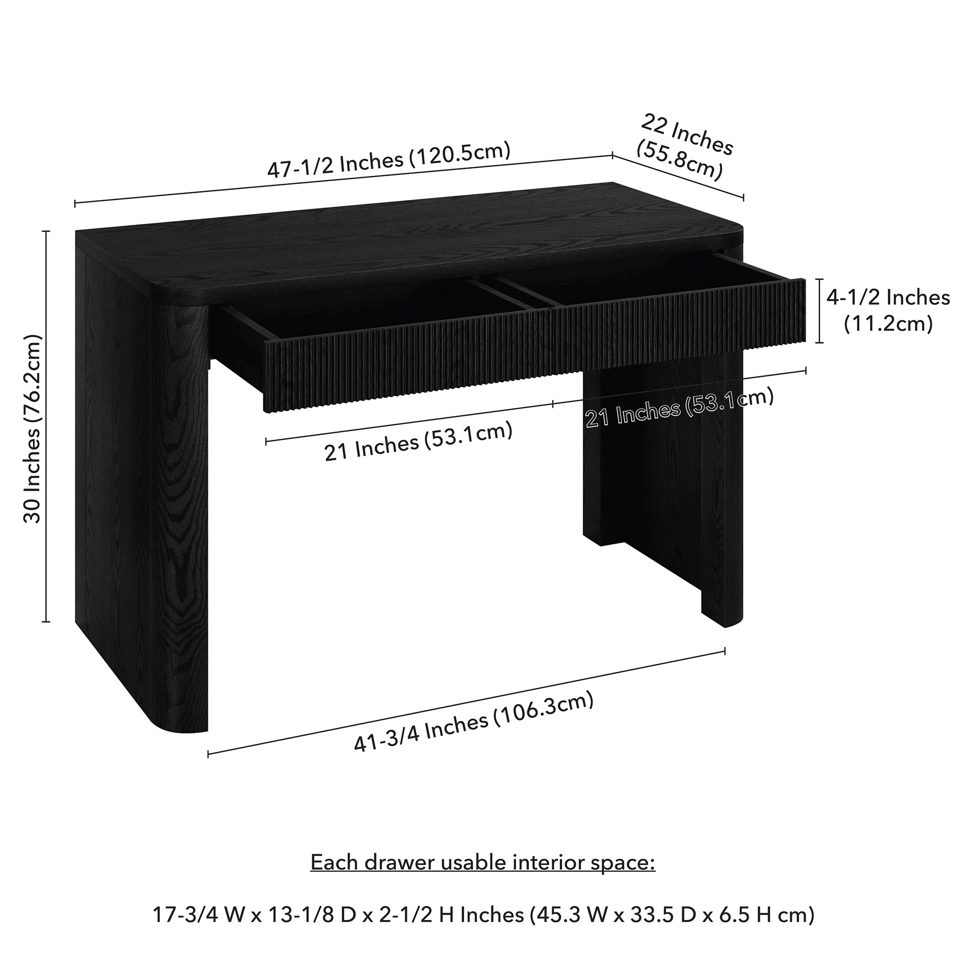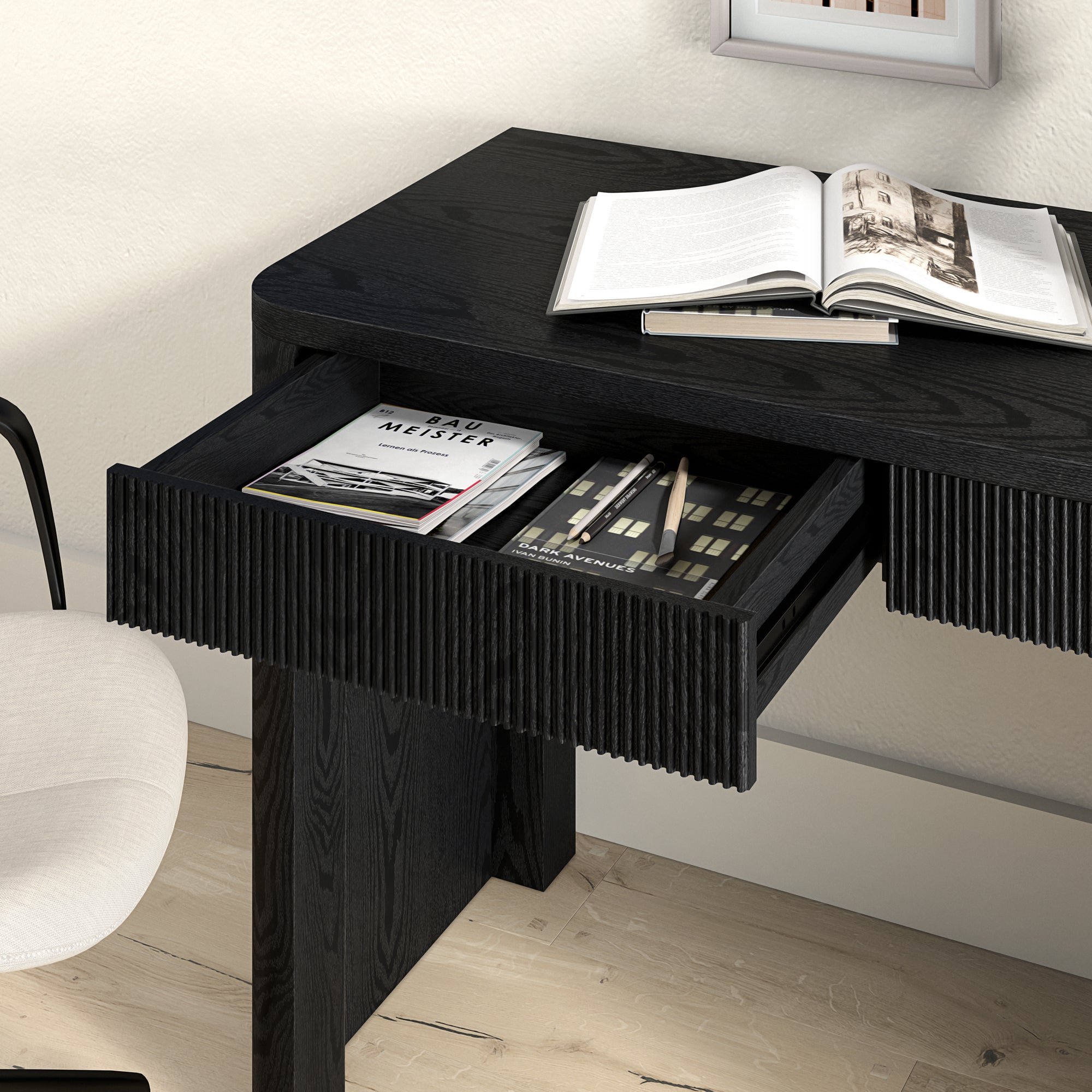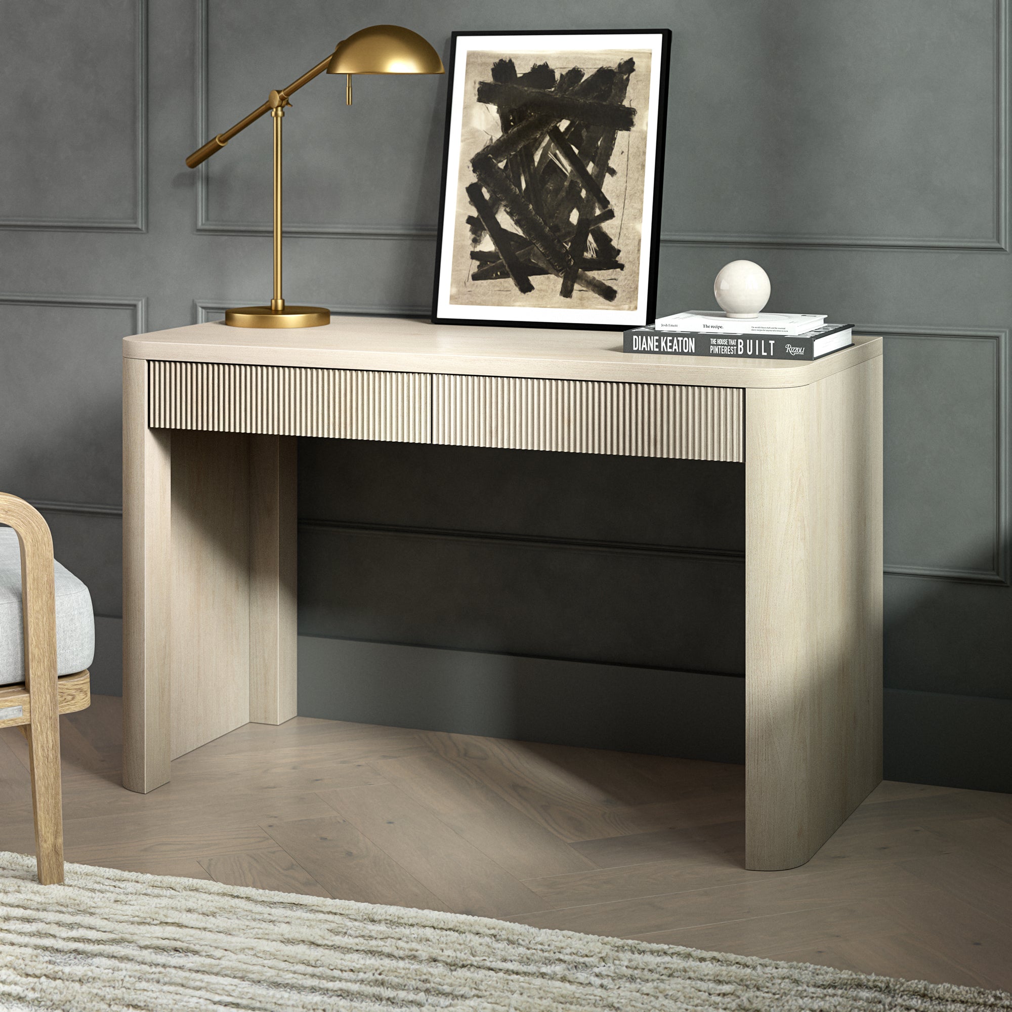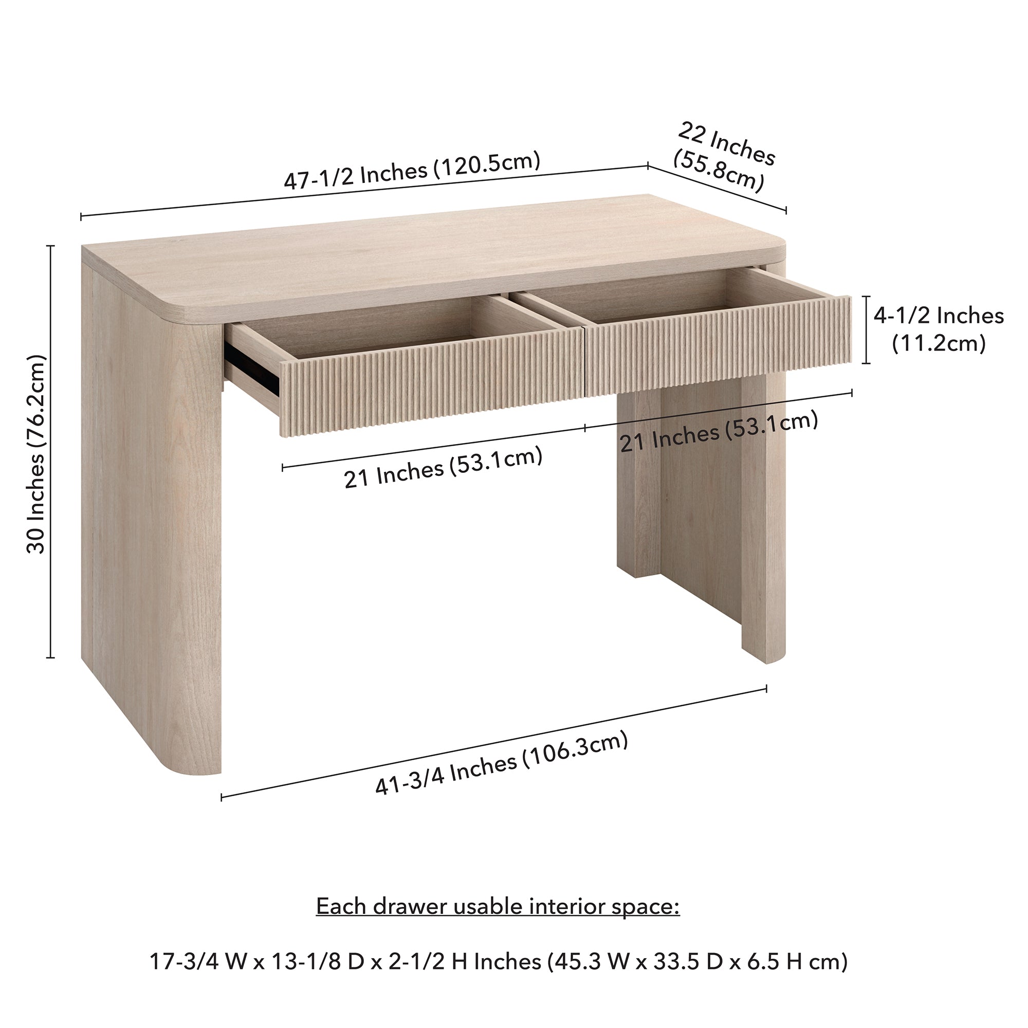 Cultivate on-trend modern style in your home office, game room, or vanity area with this 47.5" desk. With rounded, fluted edges creating a soft, slightly retro shape, topped with a sturdy MDF desktop. This desk features two soft-glide drawers for storage, while the open lower space provides plenty of room to settle in and take on the day. It’s time to work from home in style!