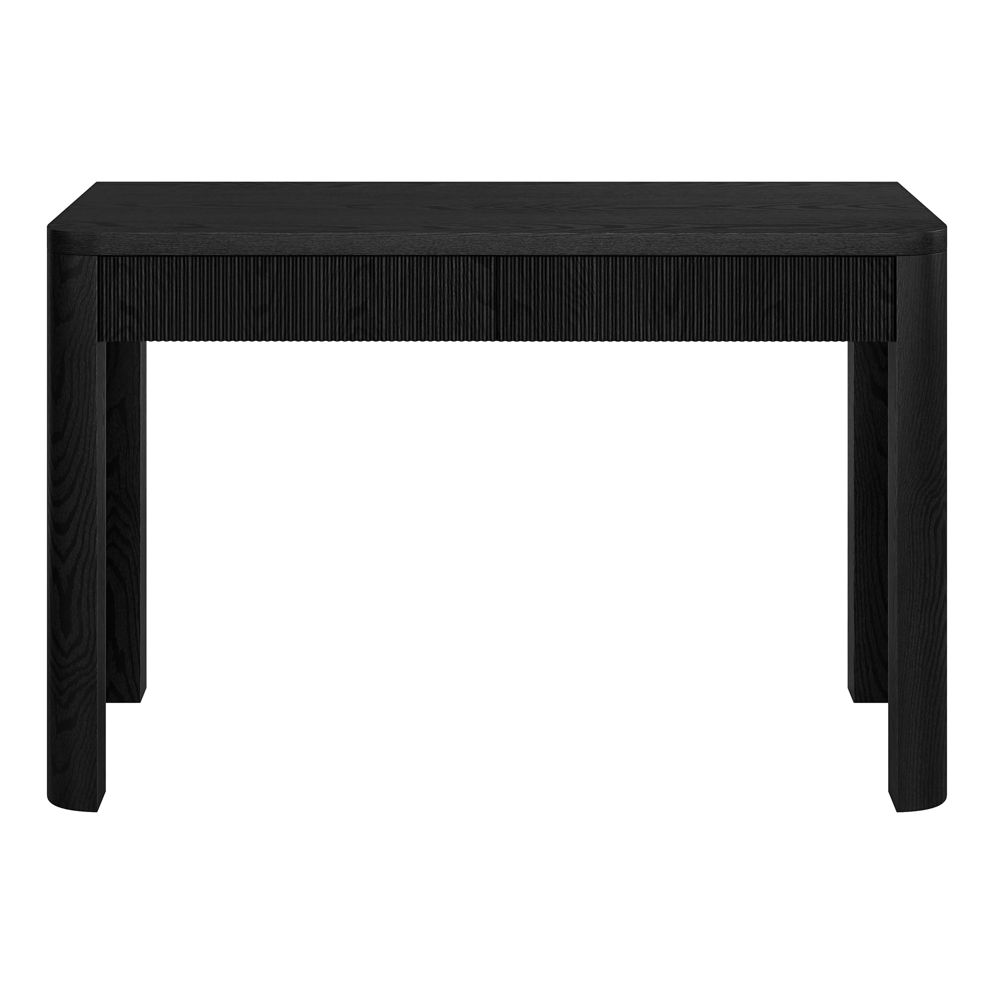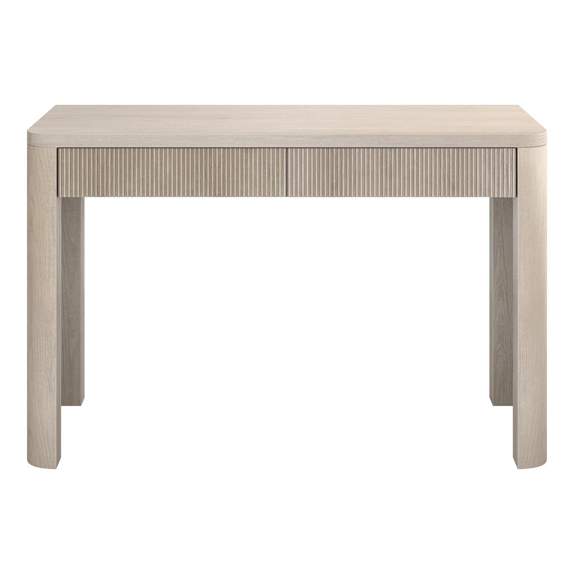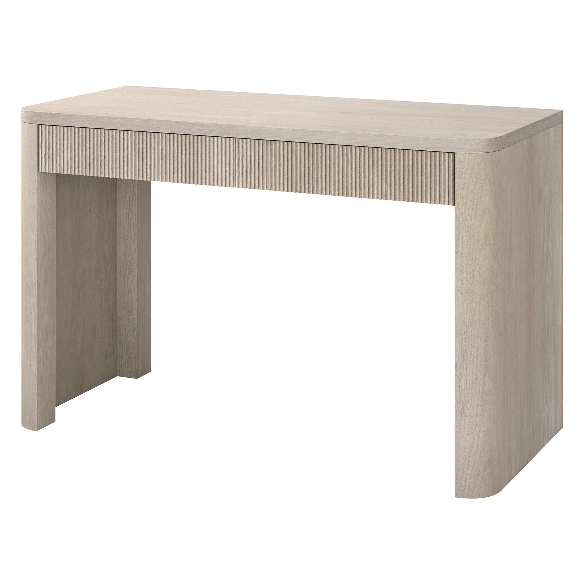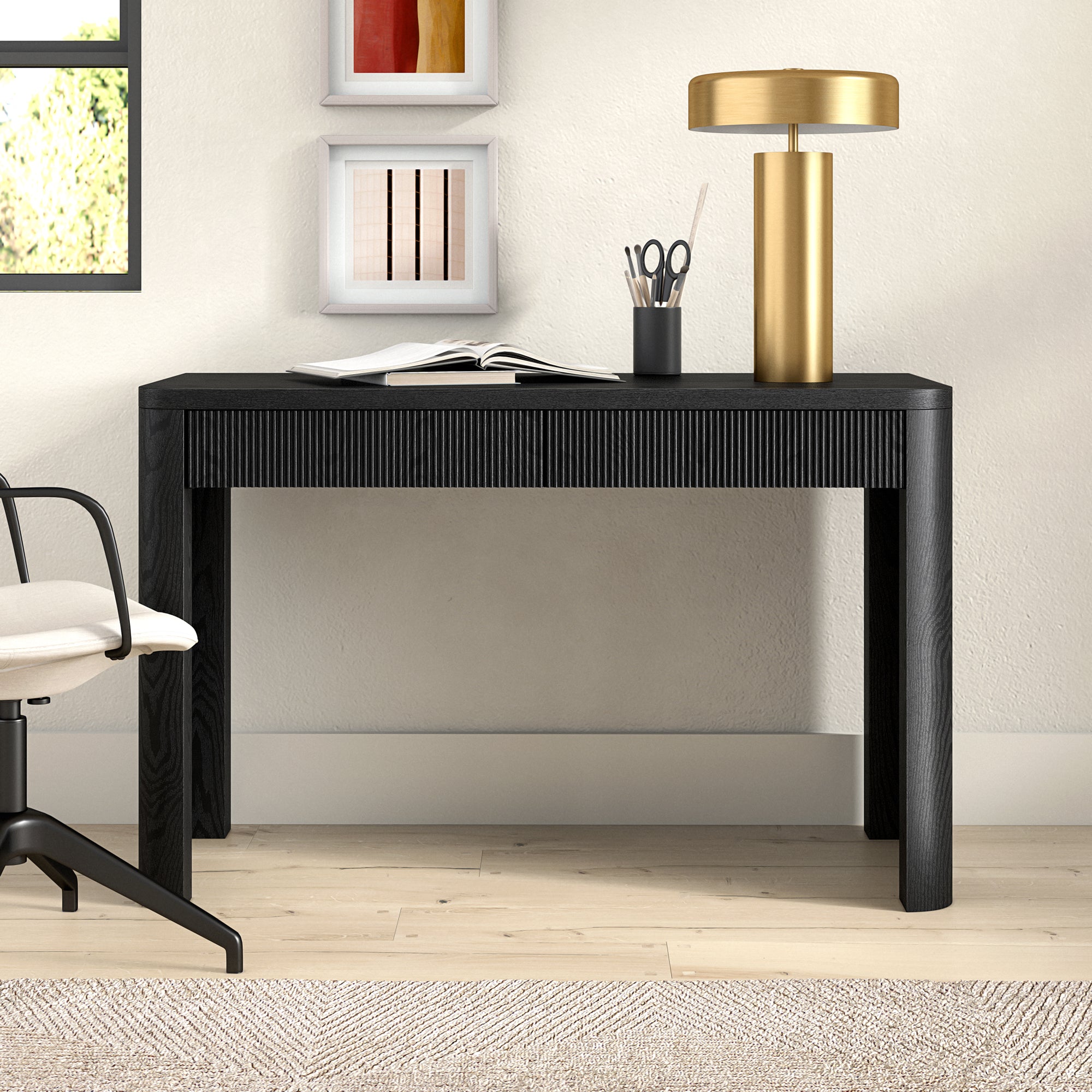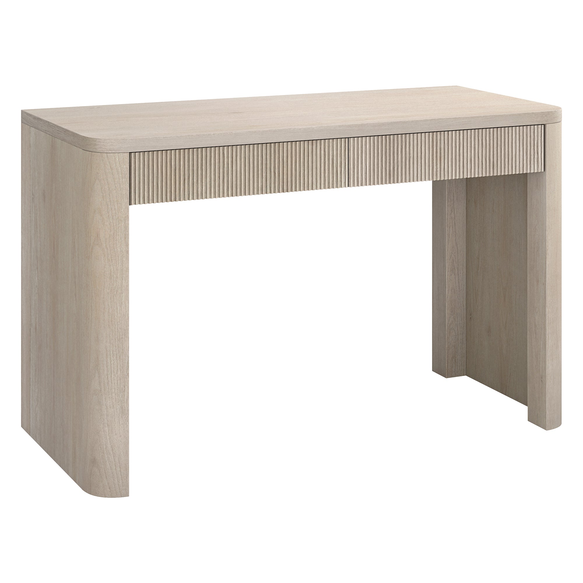Cultivate on-trend modern style in your home office, game room, or vanity area with this 47.5" desk. With rounded, fluted edges creating a soft, slightly retro shape, topped with a sturdy MDF desktop. This desk features two soft-glide drawers for storage, while the open lower space provides plenty of room to settle in and take on the day. It’s time to work from home in style!