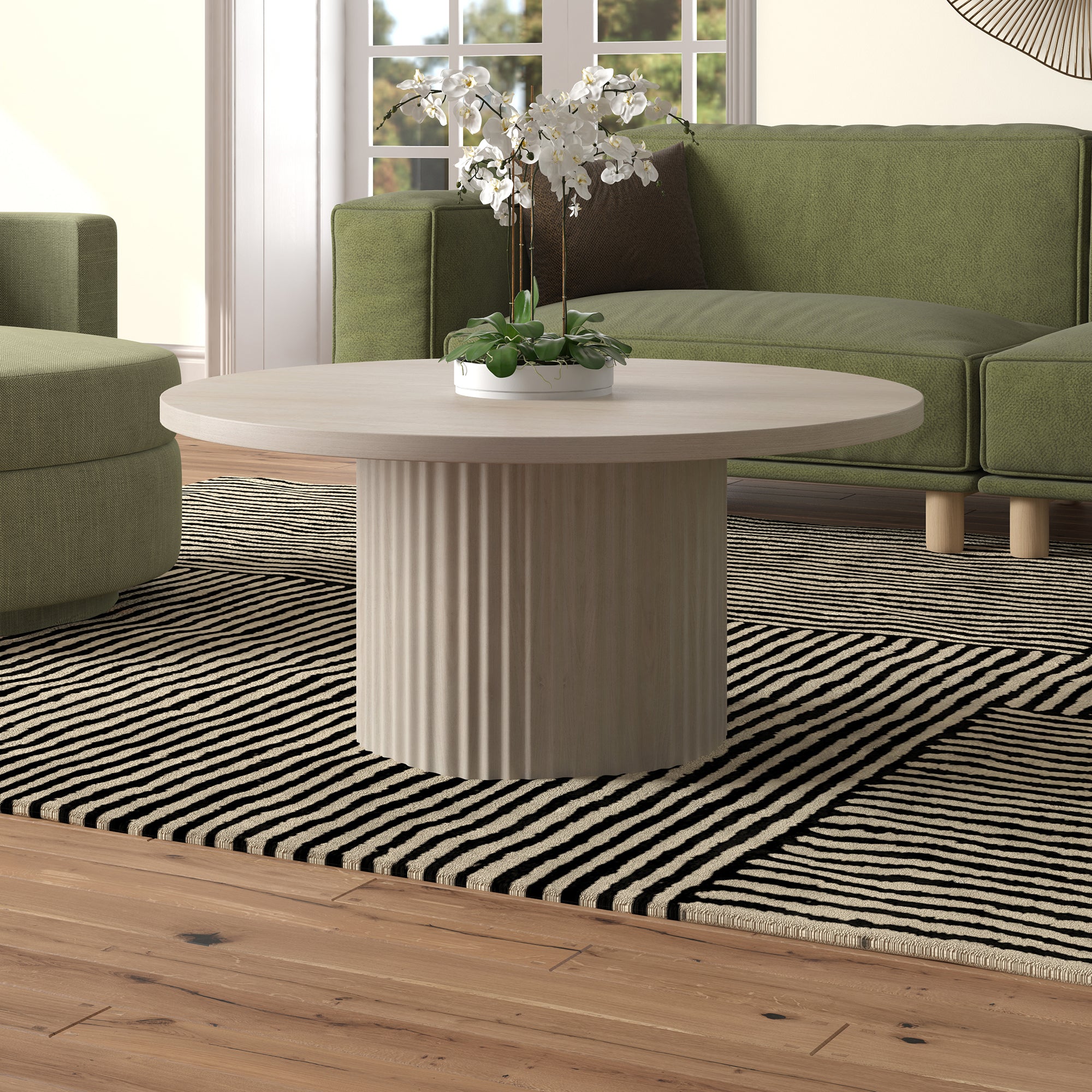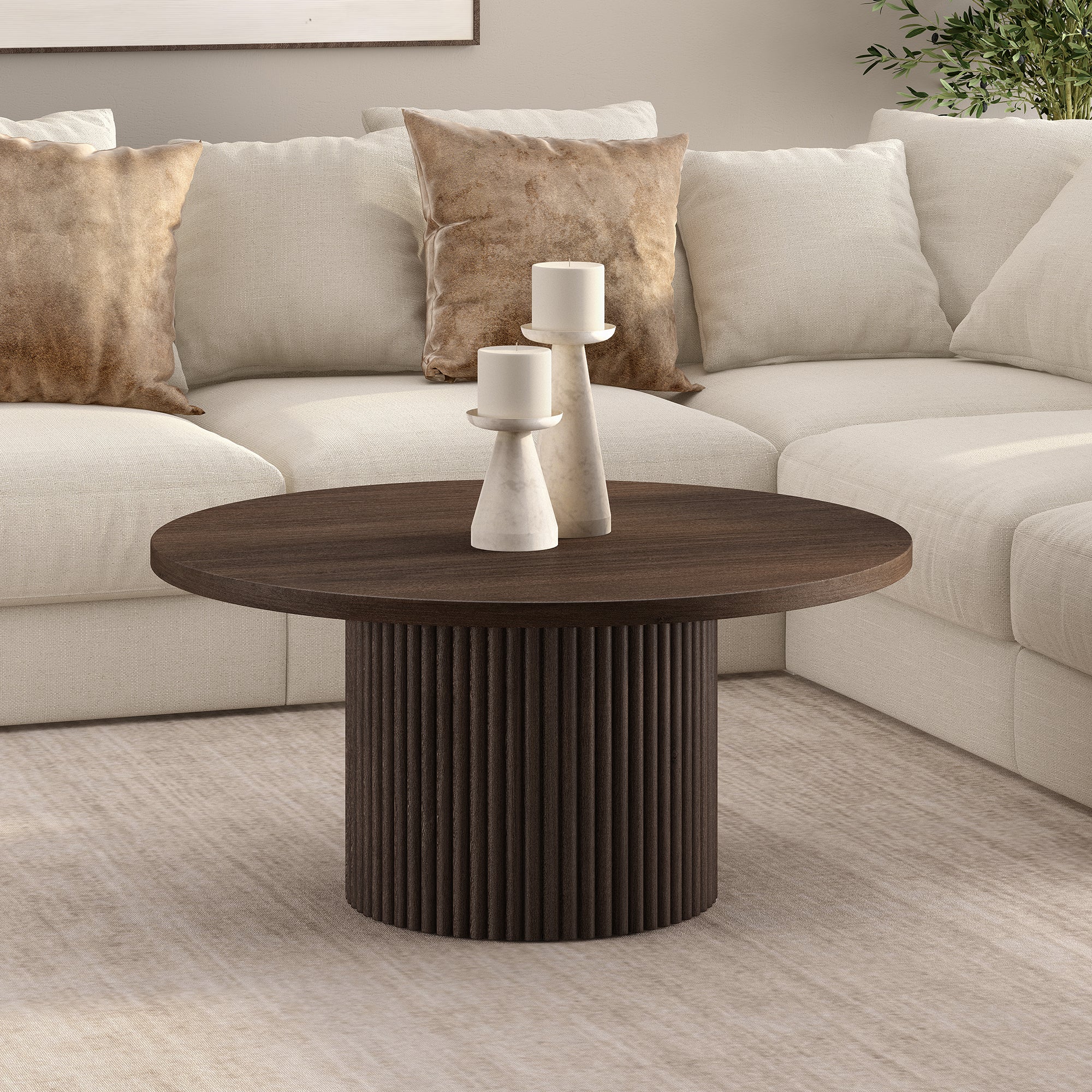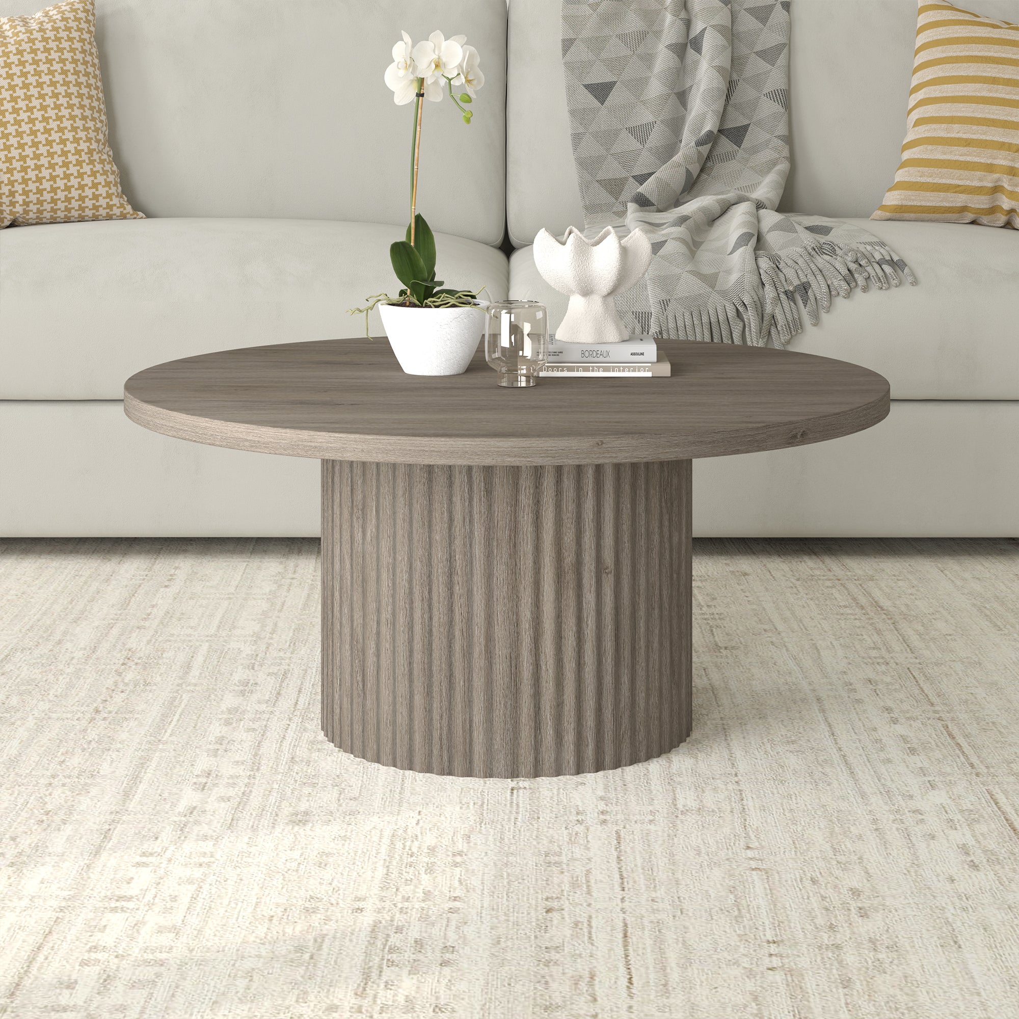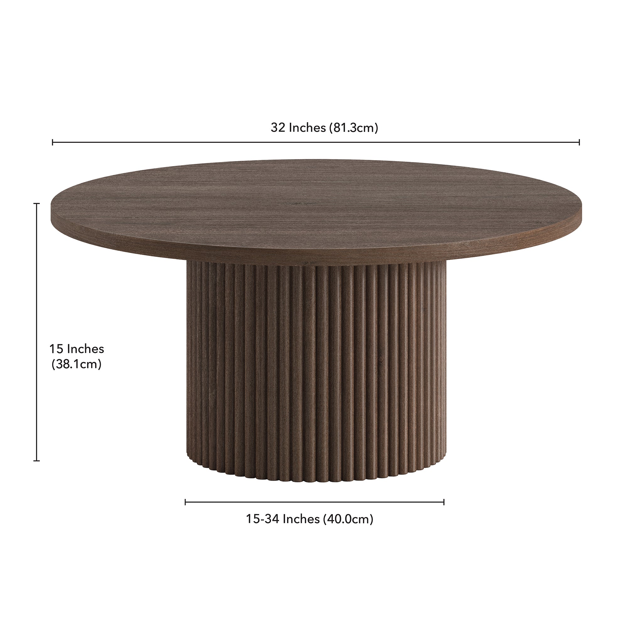 Striking in its simplicity, this minimalist coffee table emphasizes clean lines and straightforward design. The fluted pedestal base anchors the look, while the natural wood-look finish adds texture and tonal variation to your space. Featuring a 75 lb. weight capacity and adjustable leveling feet, this 32" round piece will imbue your living room, family room, or entertainment area with an on-trend focal point.