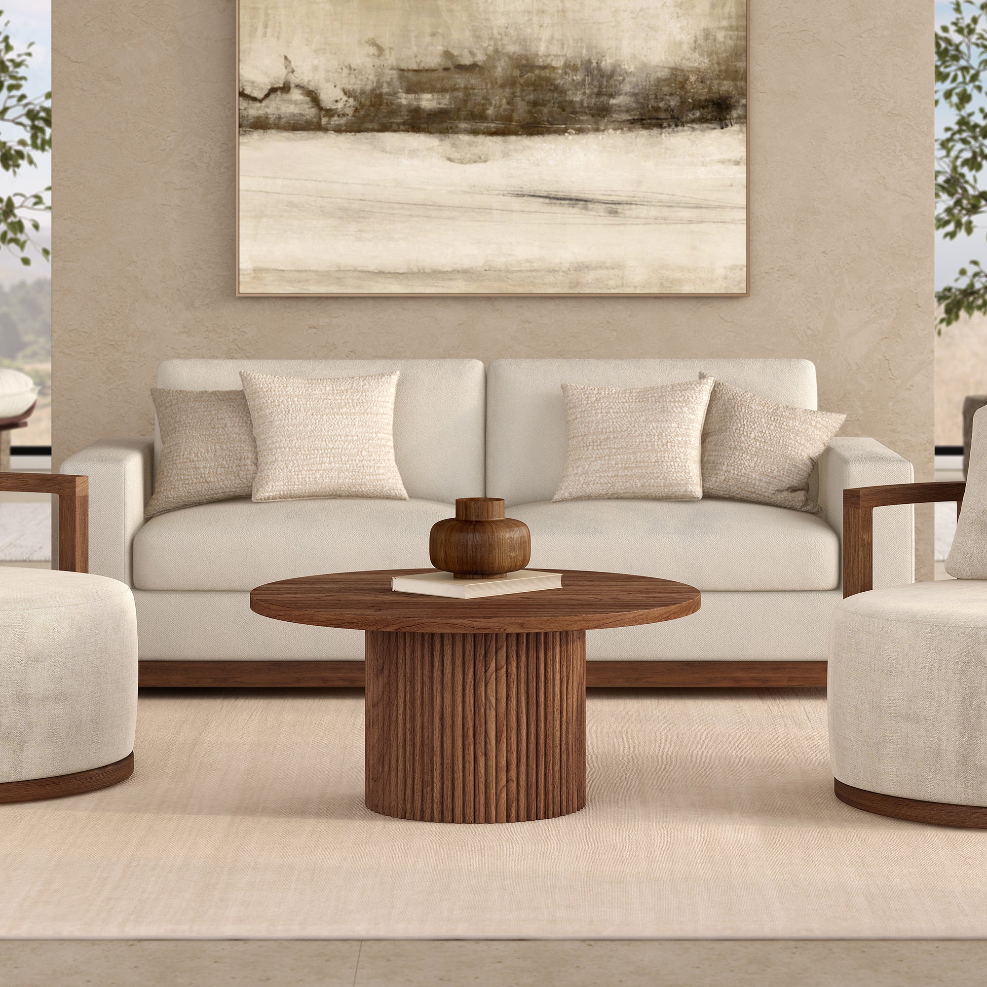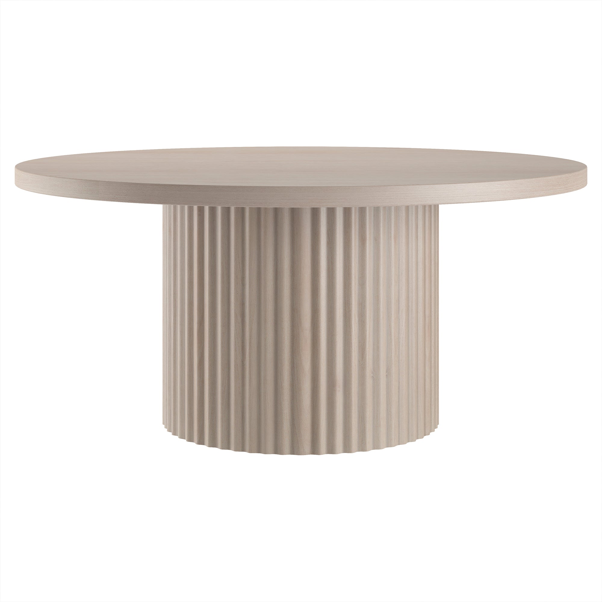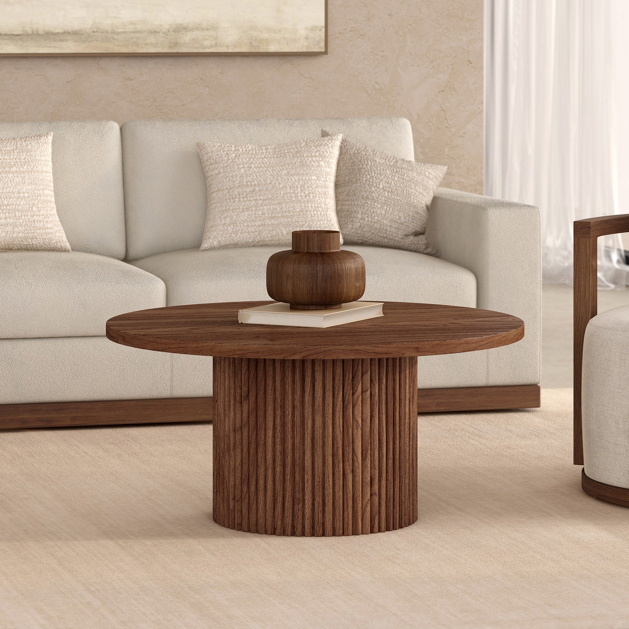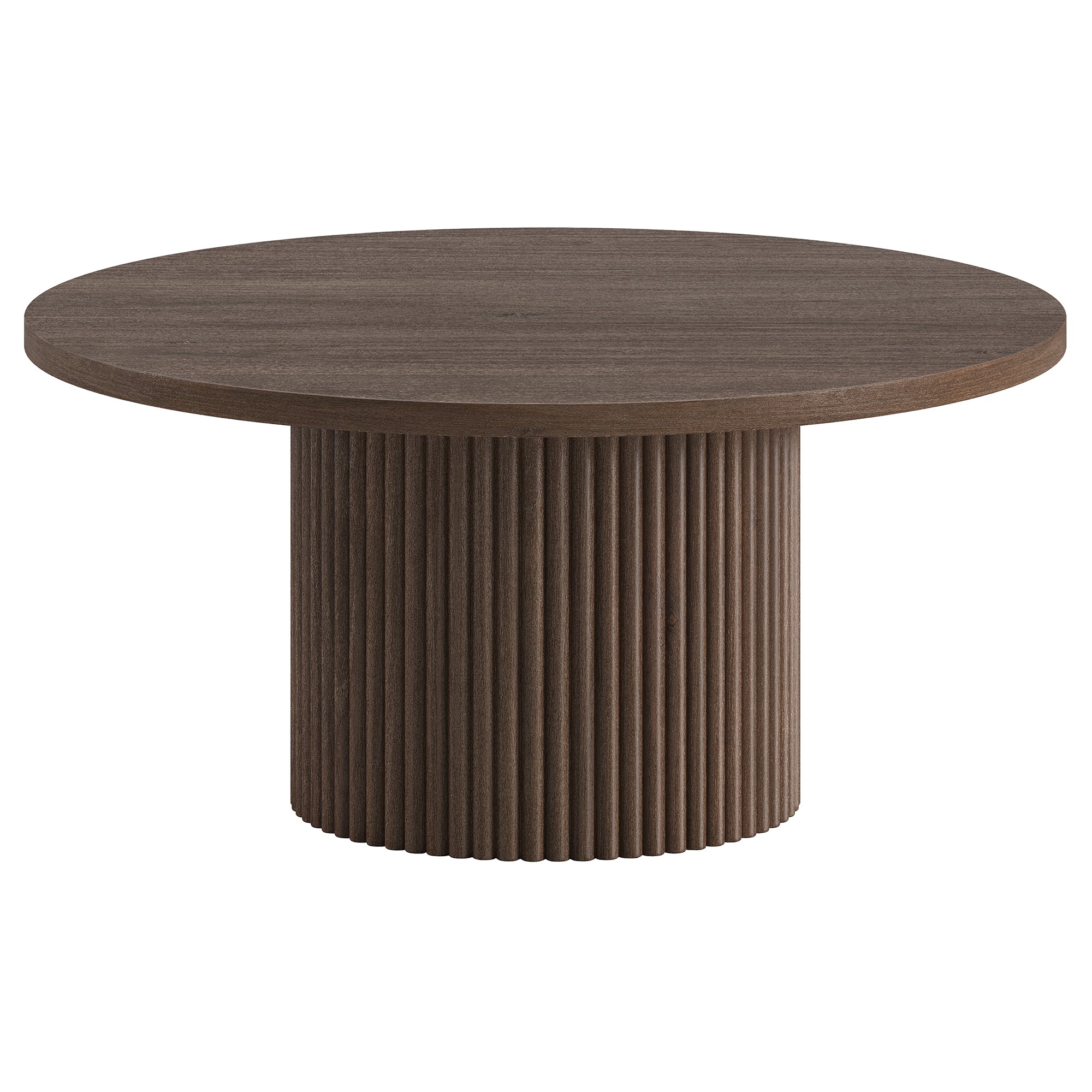 Striking in its simplicity, this minimalist coffee table emphasizes clean lines and straightforward design. The fluted pedestal base anchors the look, while the natural wood-look finish adds texture and tonal variation to your space. Featuring a 75 lb. weight capacity and adjustable leveling feet, this 32" round piece will imbue your living room, family room, or entertainment area with an on-trend focal point.