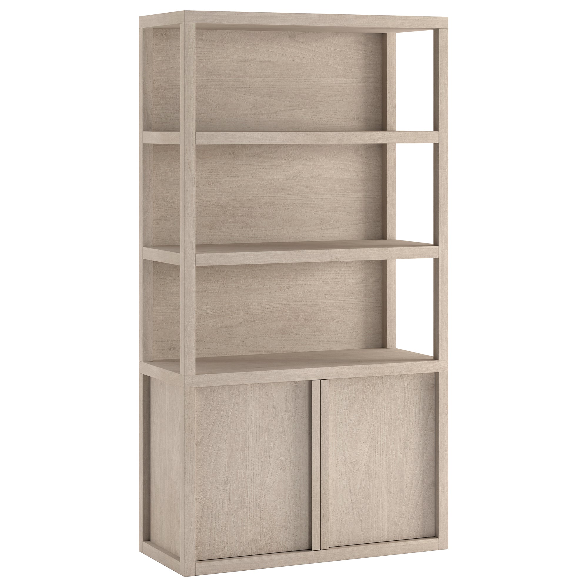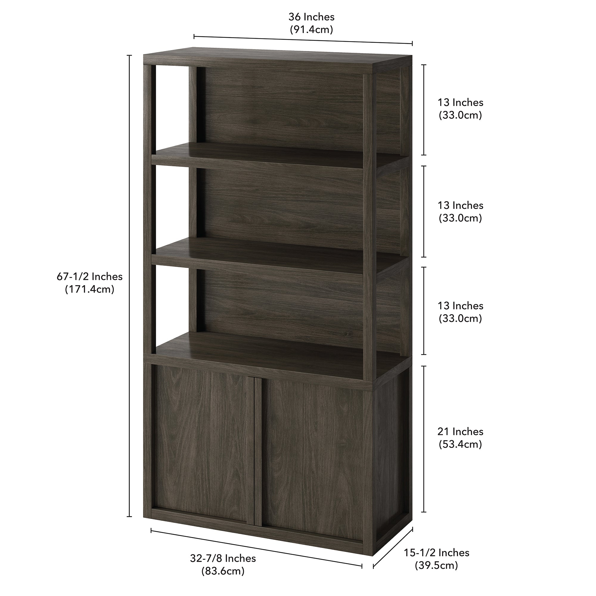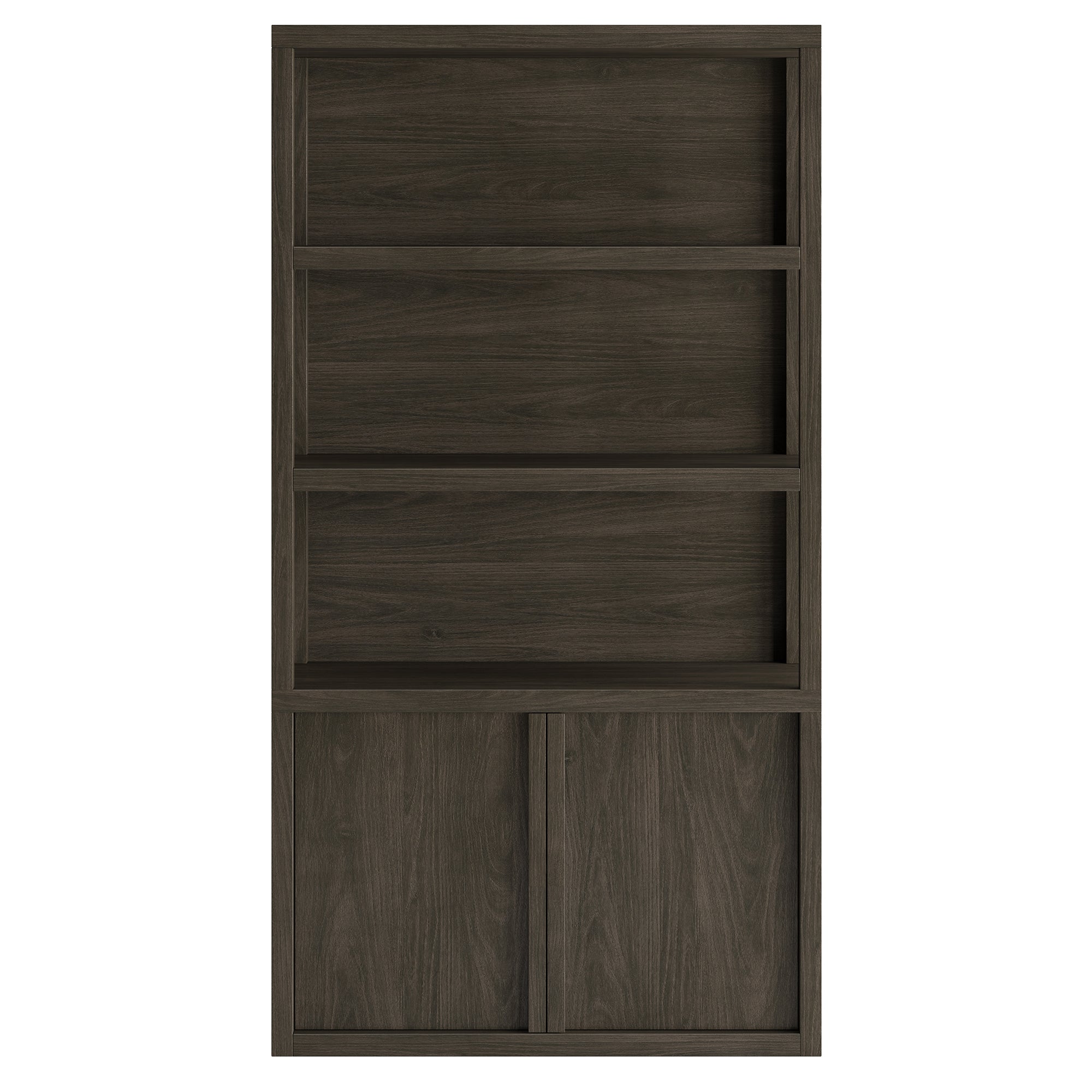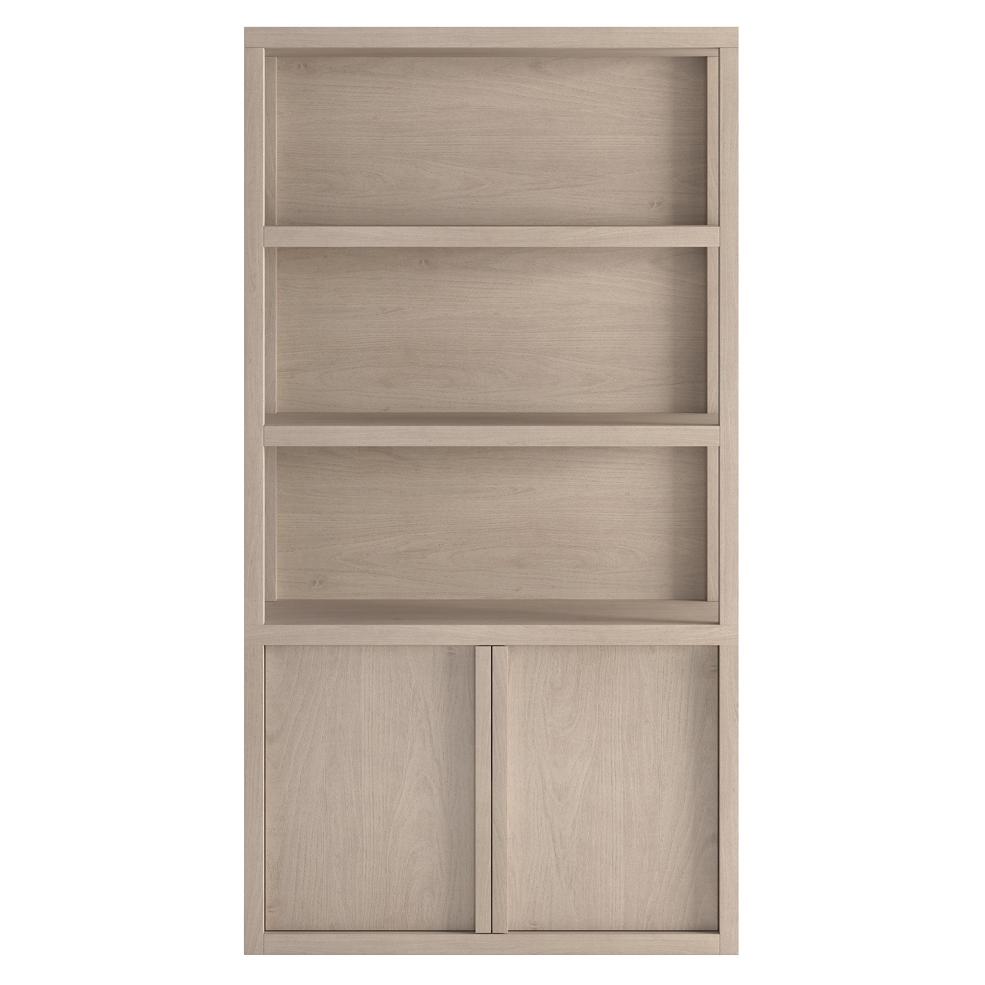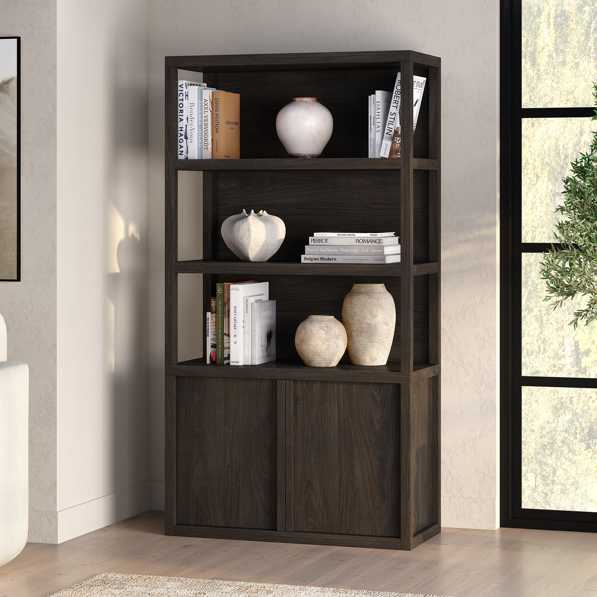 Contemporary and mid-century modern combine in this transitional bookcase. With three tiers of open-framed shelves on top of an enclosed cabinet. Finished in a warm wood tone, with flush wood handles on each cabinet door. Doors swing open and feature an adjustable shelf inside the cabinet as well. A finished back anchors the piece and creates a solid backdrop for your space.