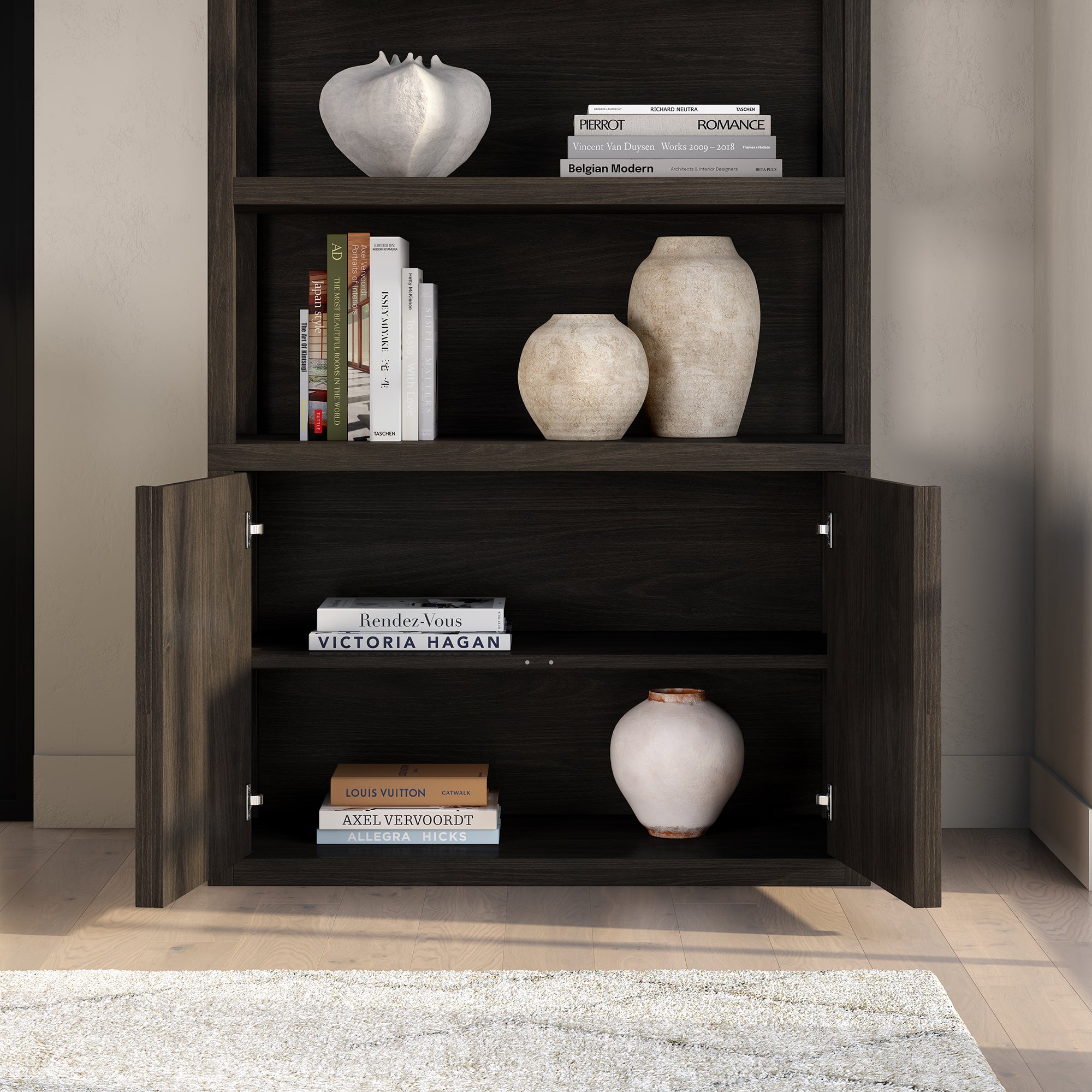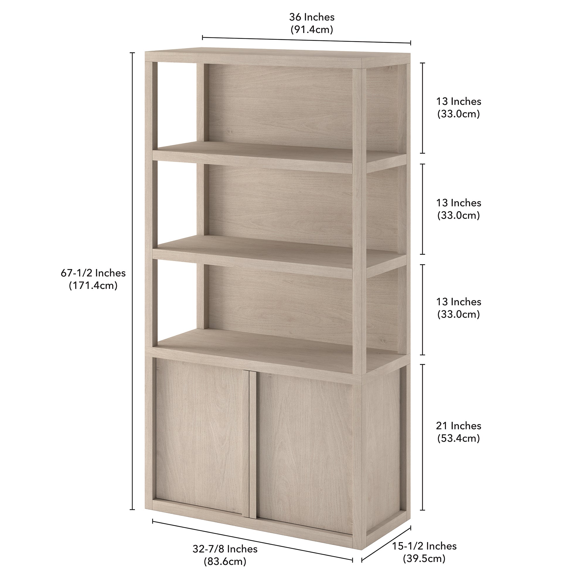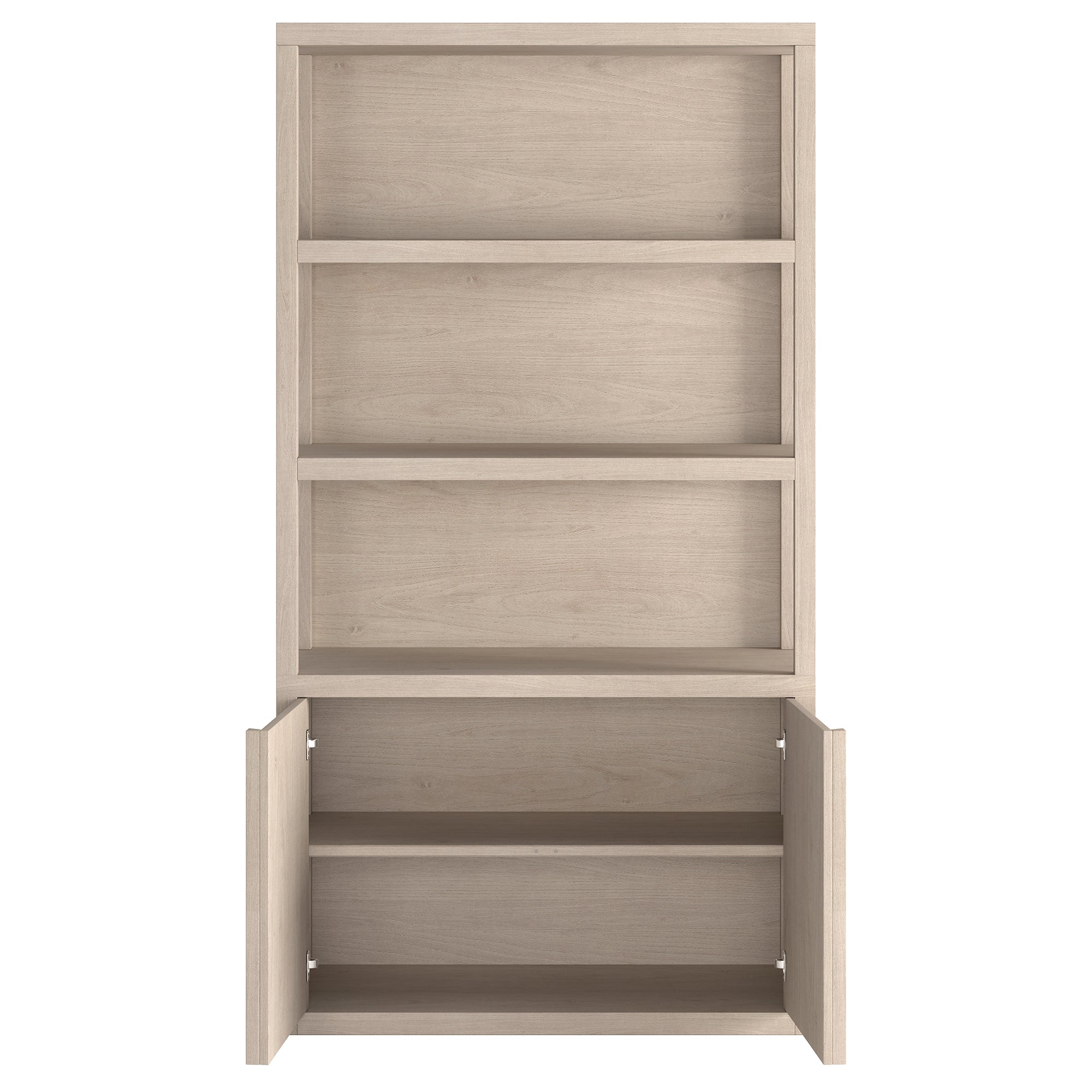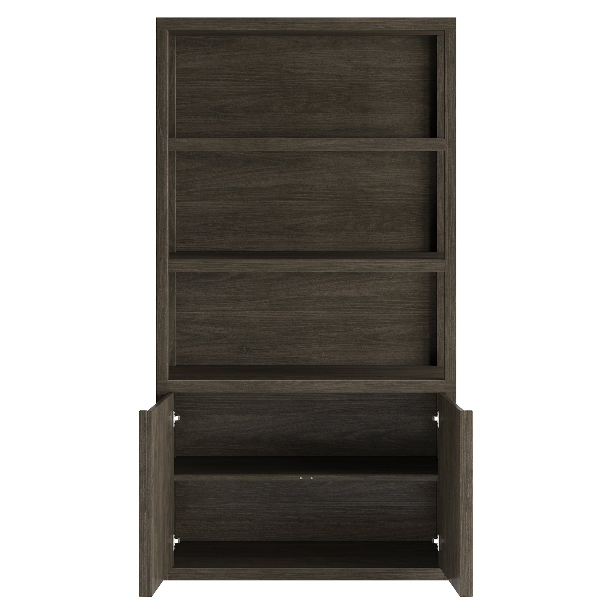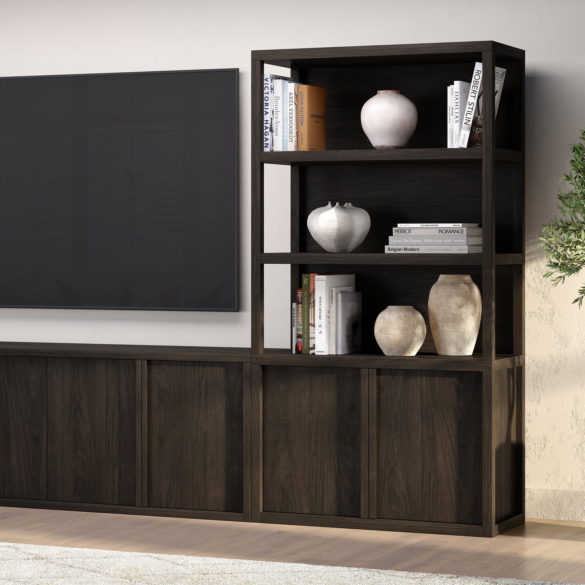 Contemporary and mid-century modern combine in this transitional bookcase. With three tiers of open-framed shelves on top of an enclosed cabinet. Finished in a warm wood tone, with flush wood handles on each cabinet door. Doors swing open and feature an adjustable shelf inside the cabinet as well. A finished back anchors the piece and creates a solid backdrop for your space.
