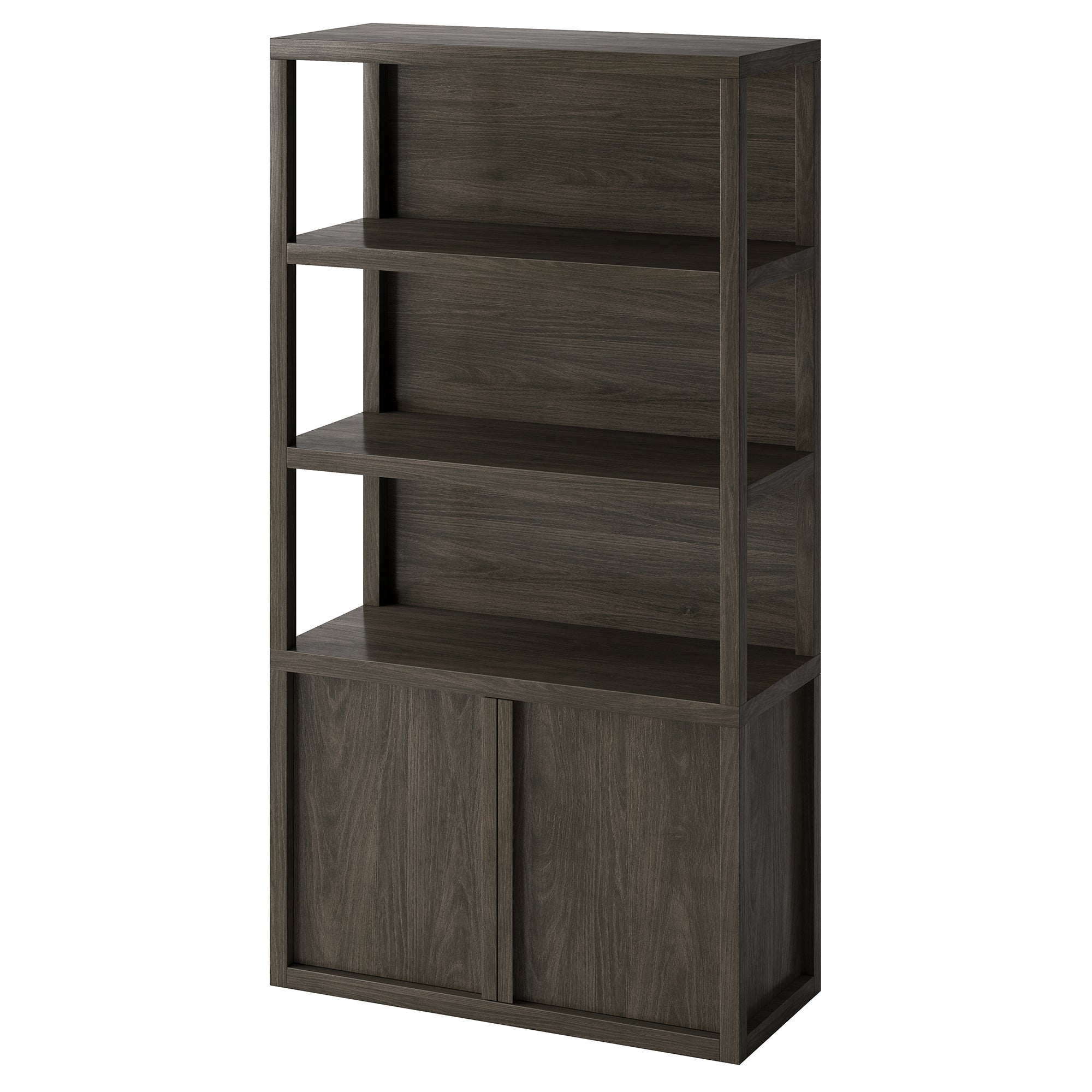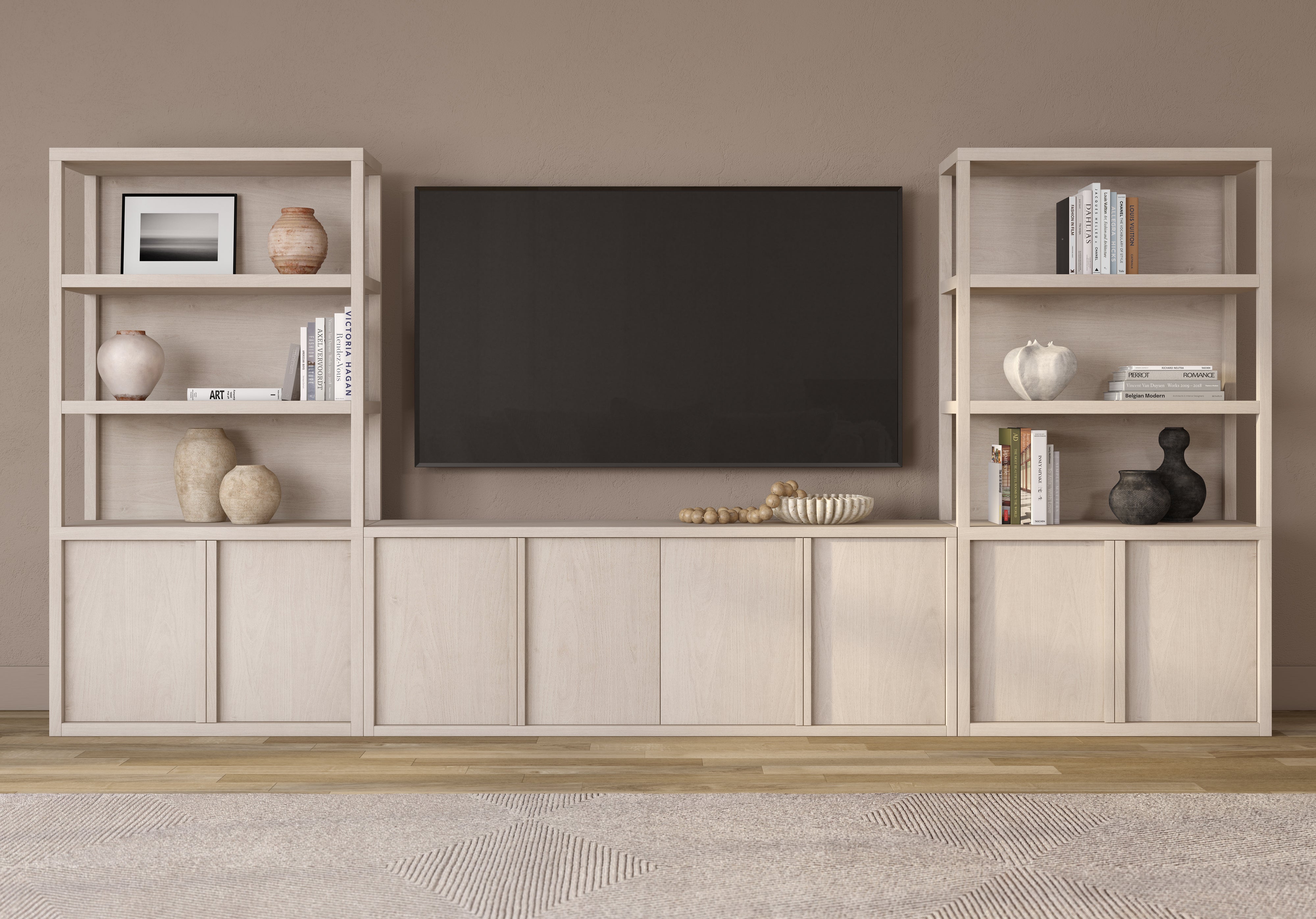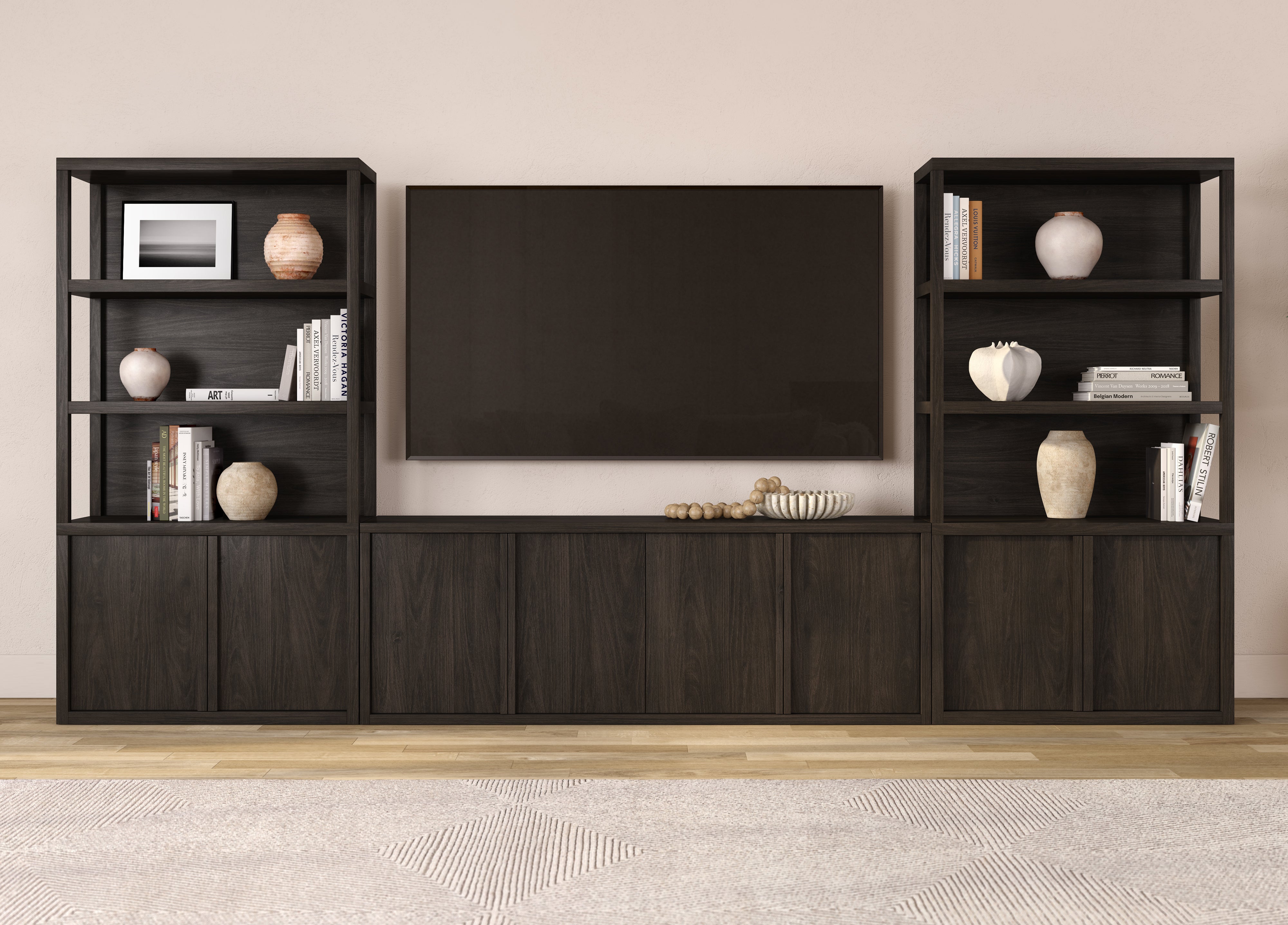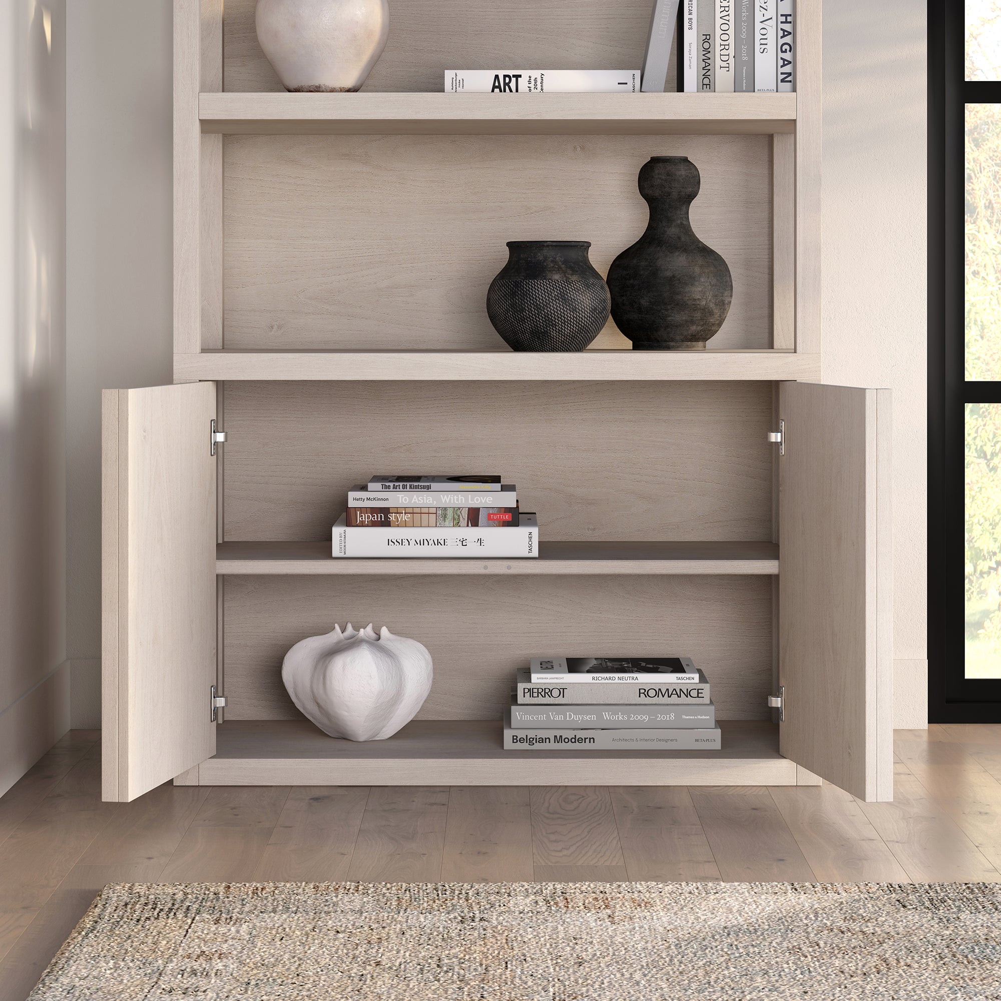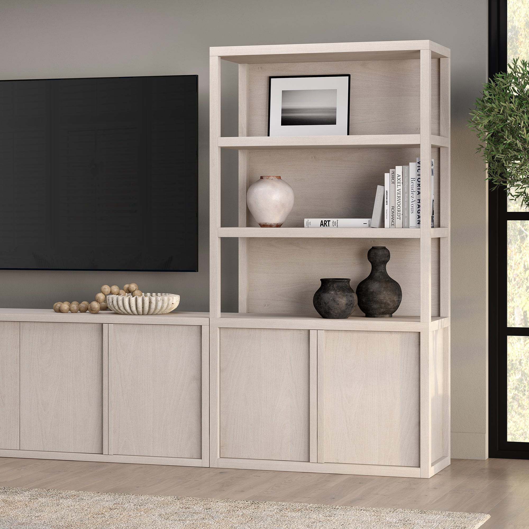 Contemporary and mid-century modern combine in this transitional bookcase. With three tiers of open-framed shelves on top of an enclosed cabinet. Finished in a warm wood tone, with flush wood handles on each cabinet door. Doors swing open and feature an adjustable shelf inside the cabinet as well. A finished back anchors the piece and creates a solid backdrop for your space.