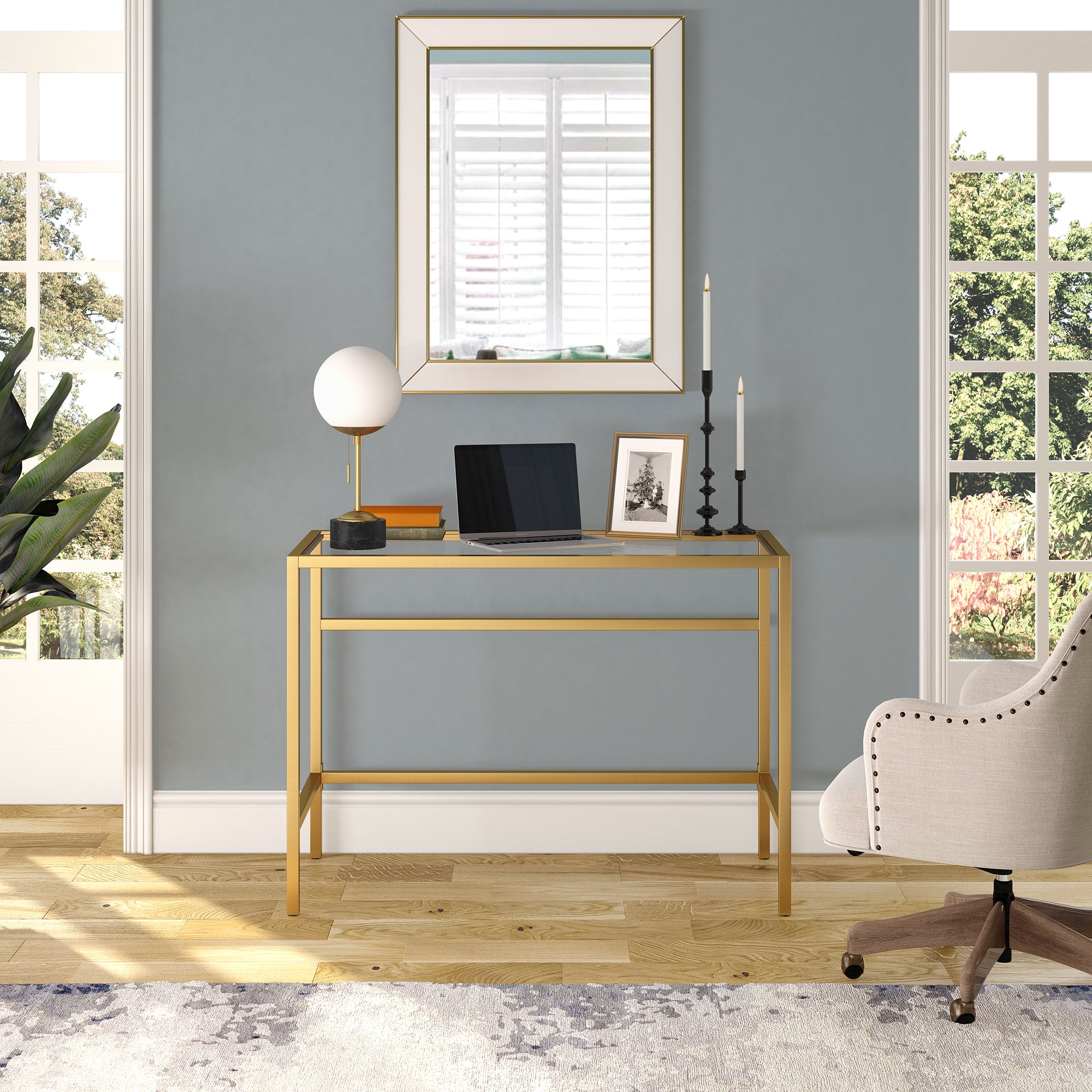 Cultivate effortless modern style with the clean lines of this writing desk. The sleek lines of its steel frame are offset by a sturdy tempered glass top, allowing you to personalize your workspace against a clean backdrop. Its open lower space provides plenty of room to settle in and take on the day. Work from home in style!