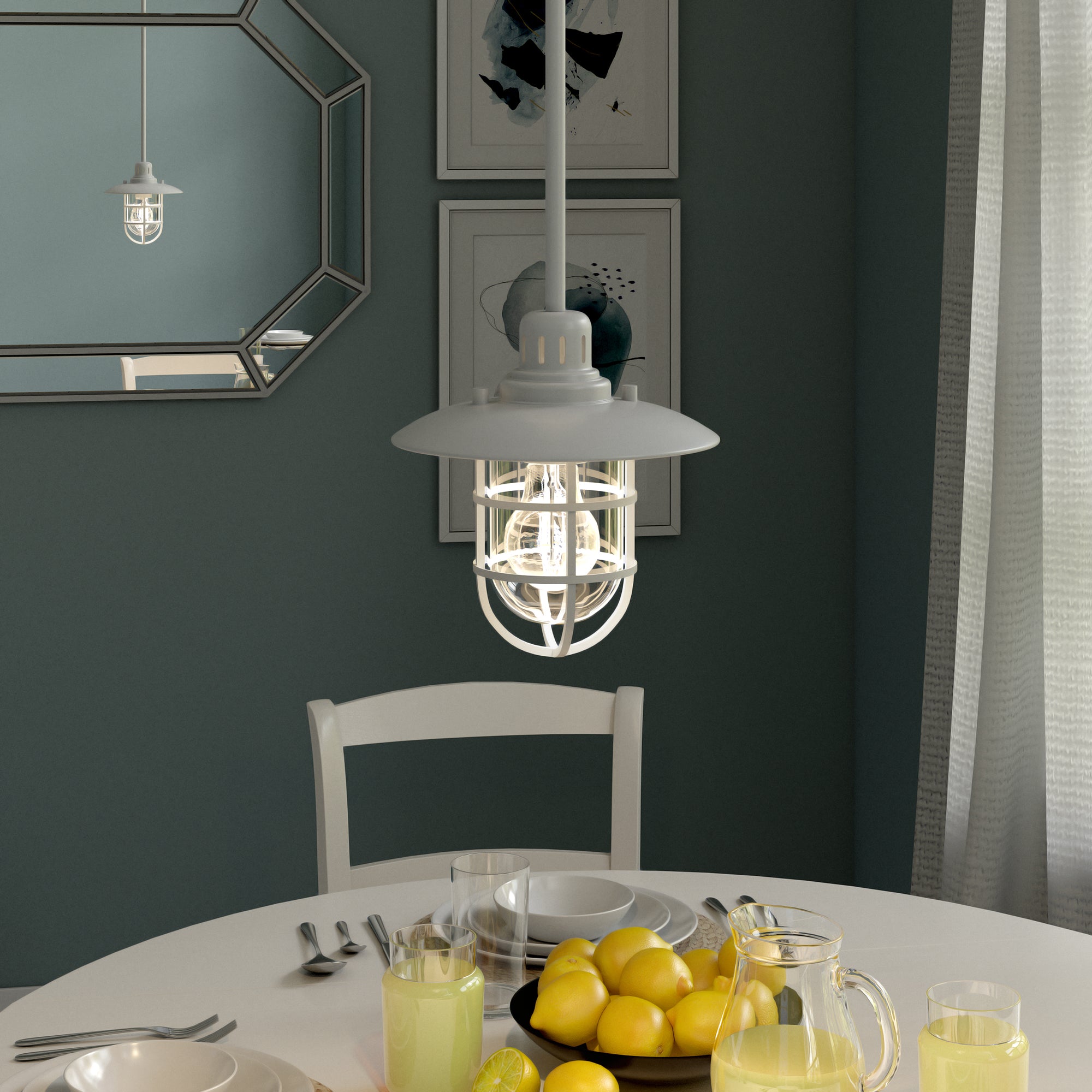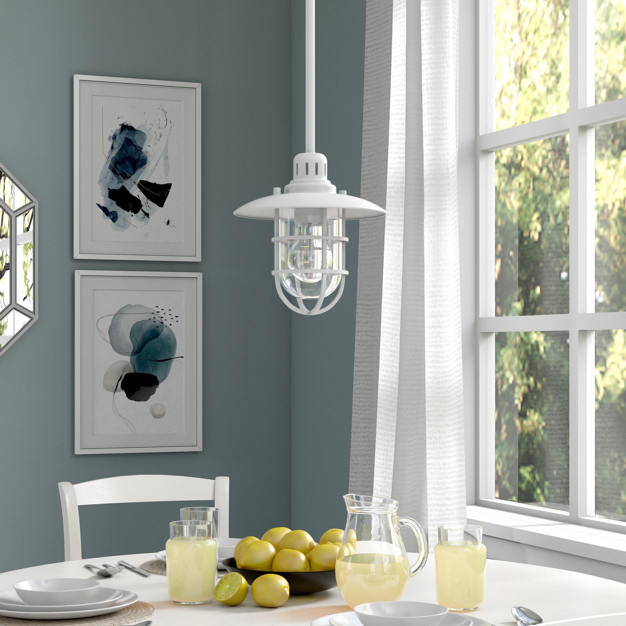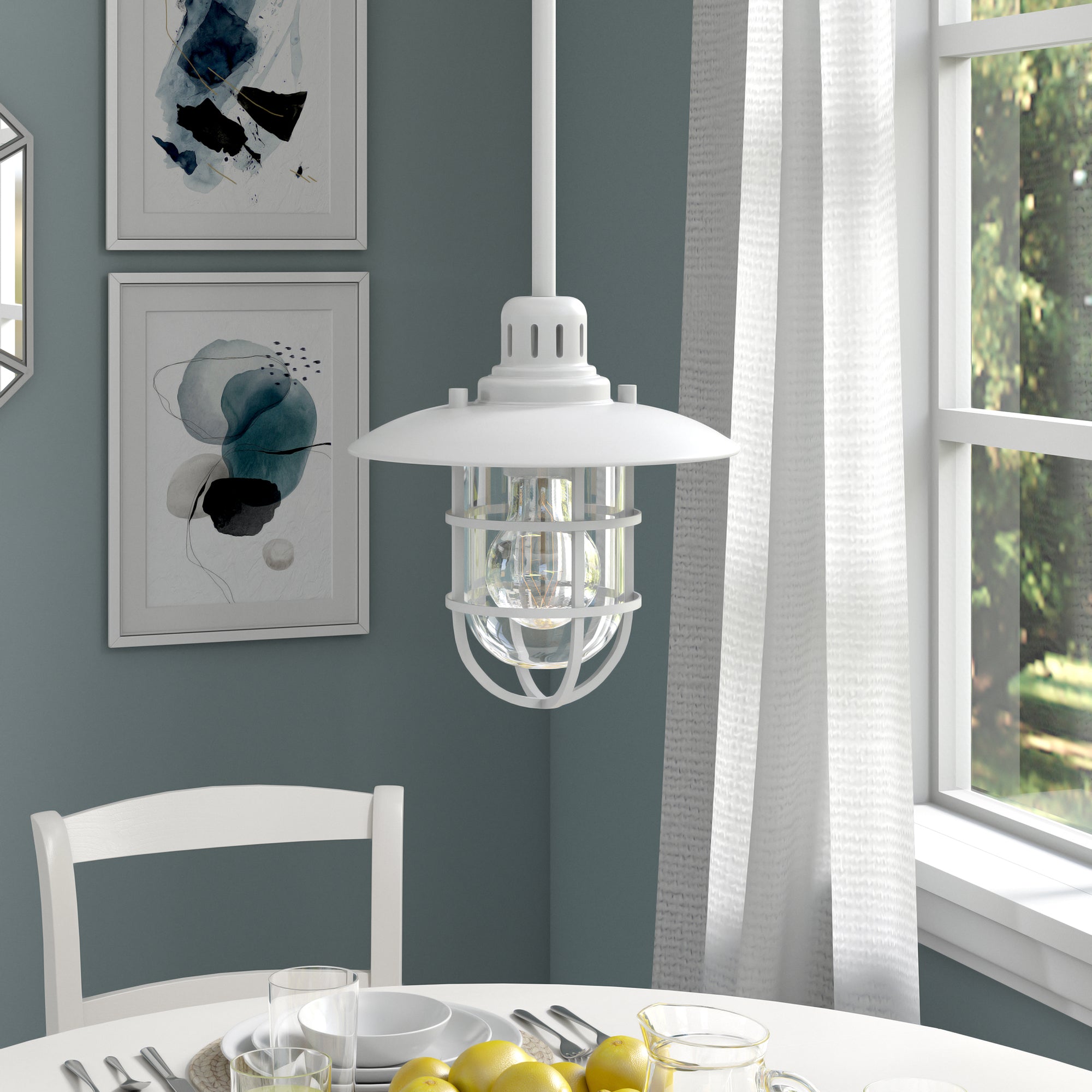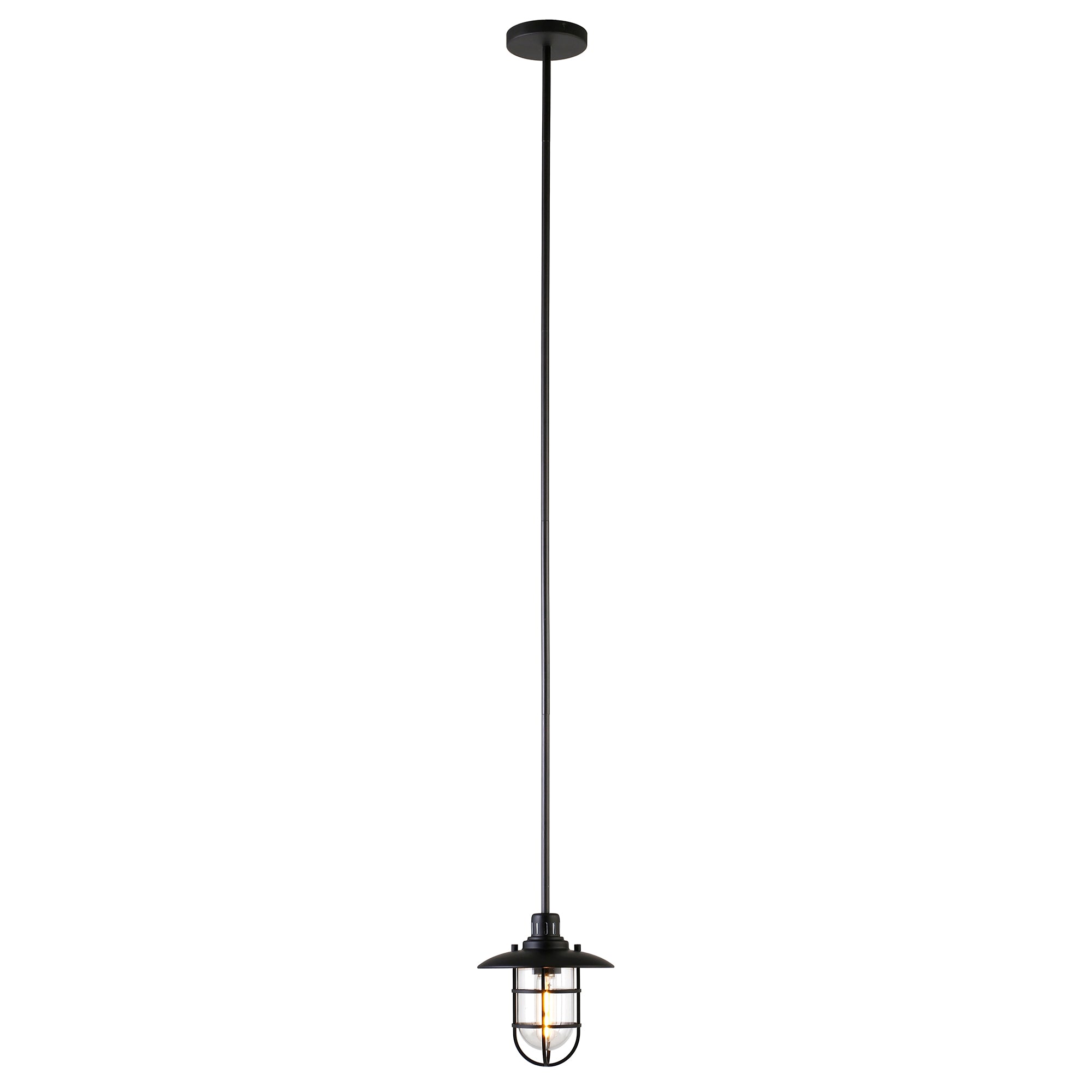 Brighten your kitchen, dining room, or foyer with this nautical-inspired pendant light. The globed glass shade is surrounded by a lantern-style frame, providing both direct and diffused light while allowing the statement light bulb of your choice to shine through. The handcrafted finish continues above the fixture onto the adjustable down rod, creating visual interest throughout the height of your space. This pendant is perfect for your coastal, cottage, or modern farmhouse décor.