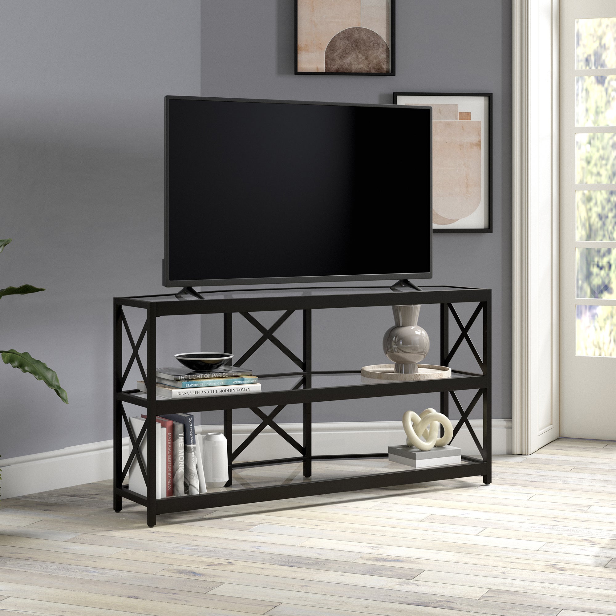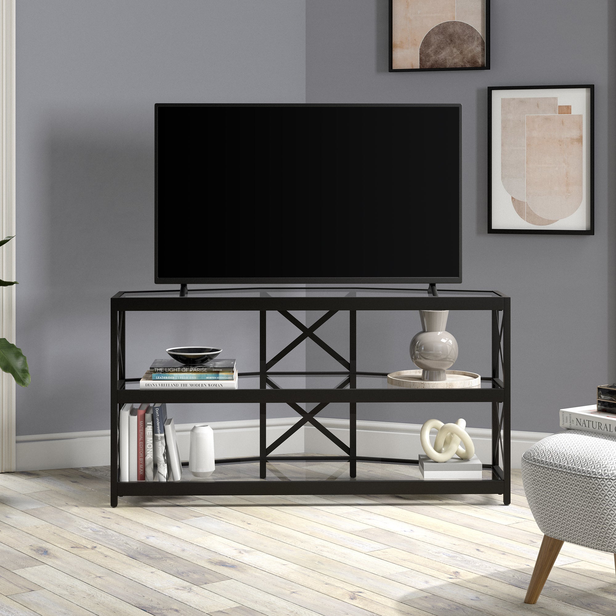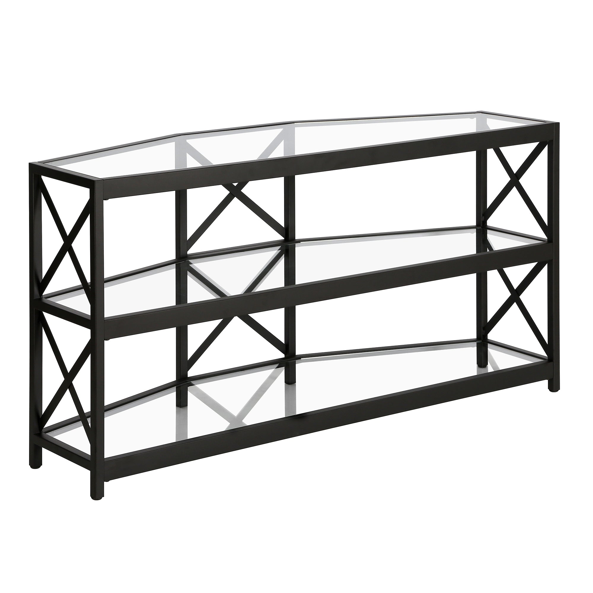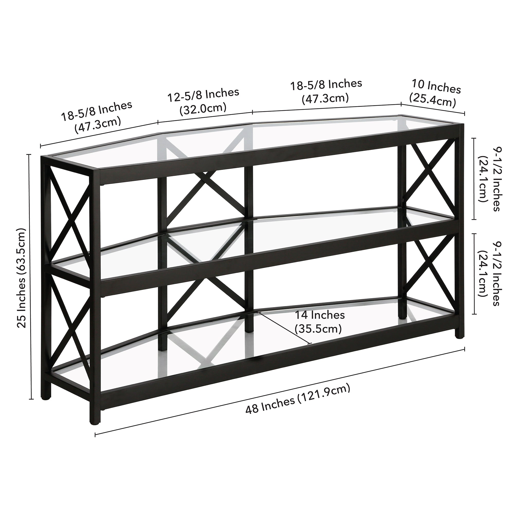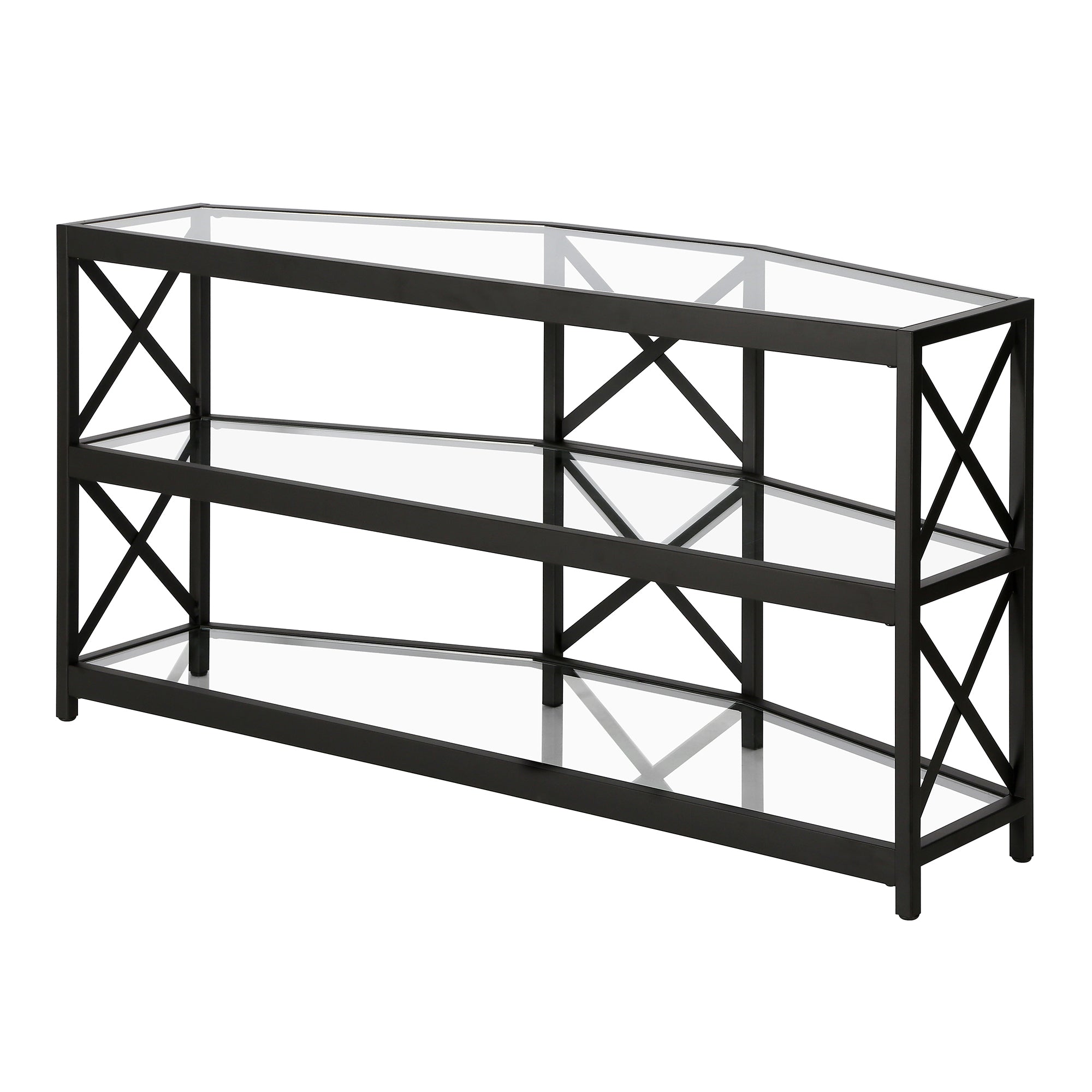 Make the most of your space with the clever shape of this five-sided TV stand. It's designed to nestle perfectly in the corner of your living room, bedroom, or den with plenty of clearance for your cord management situation. The luxe look of repeated geometric X's in rich metallic finishing bring this classic design ahead of the trend curve. Featuring a tempered glass top and shelves, this TV stand is streamlined and durable in any living room or den.