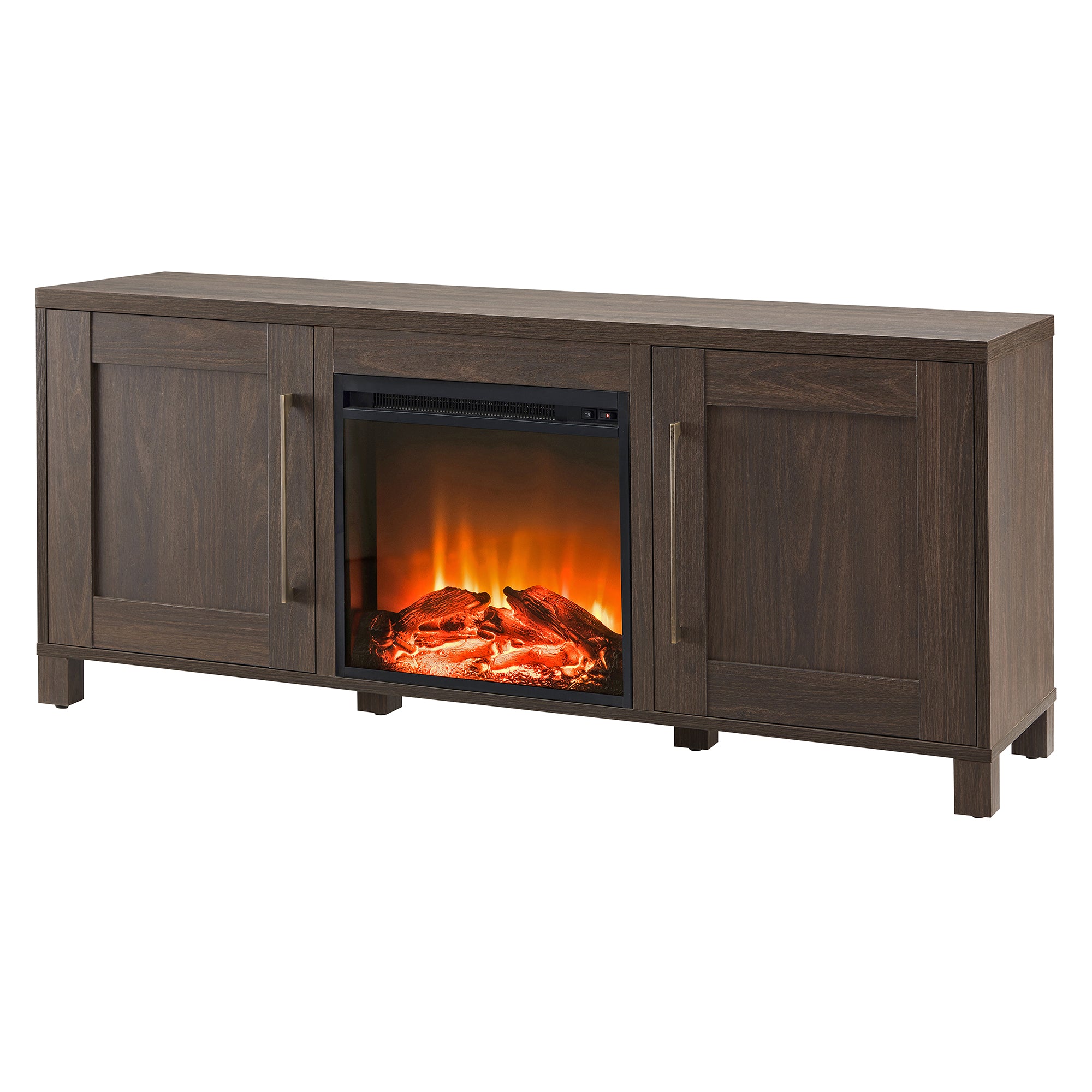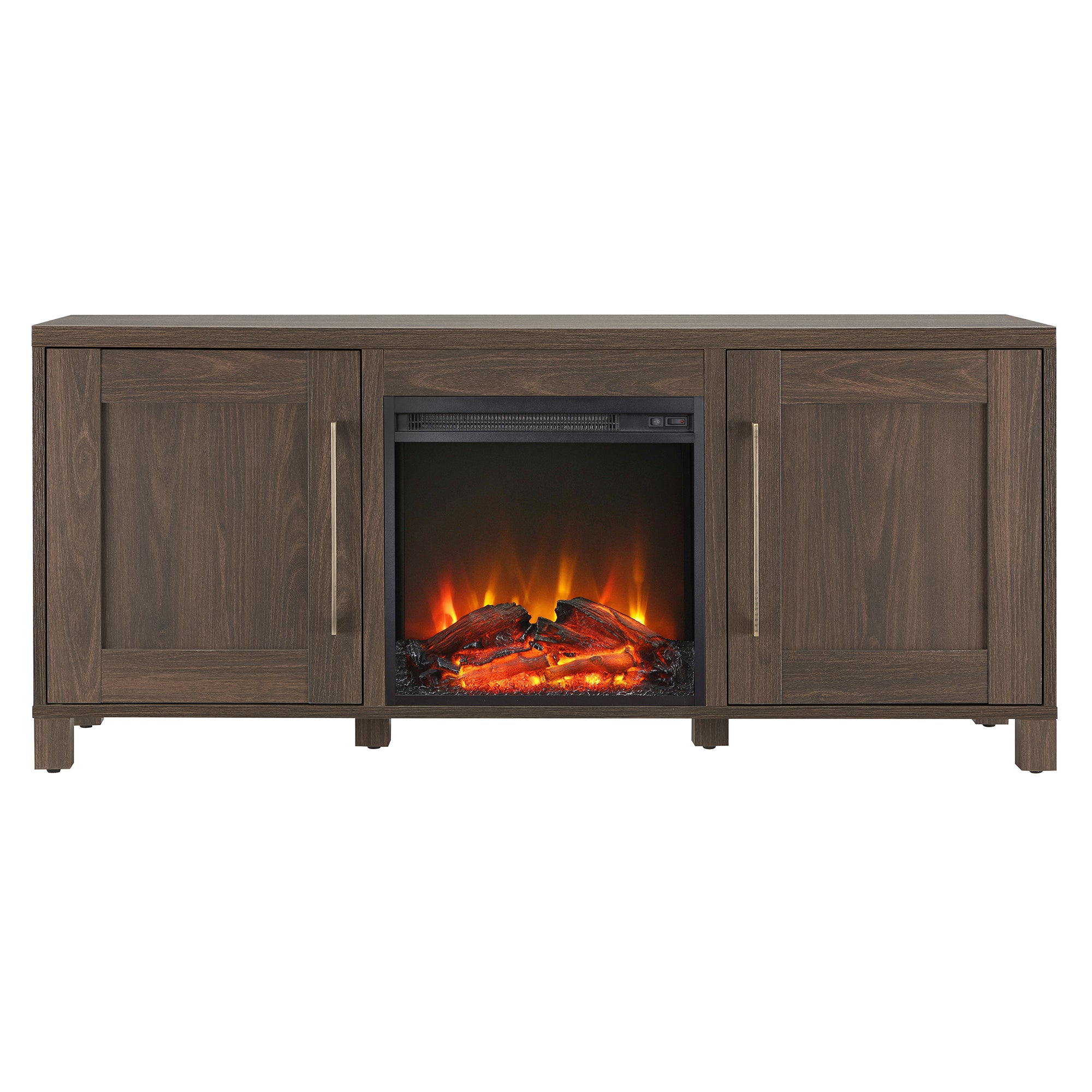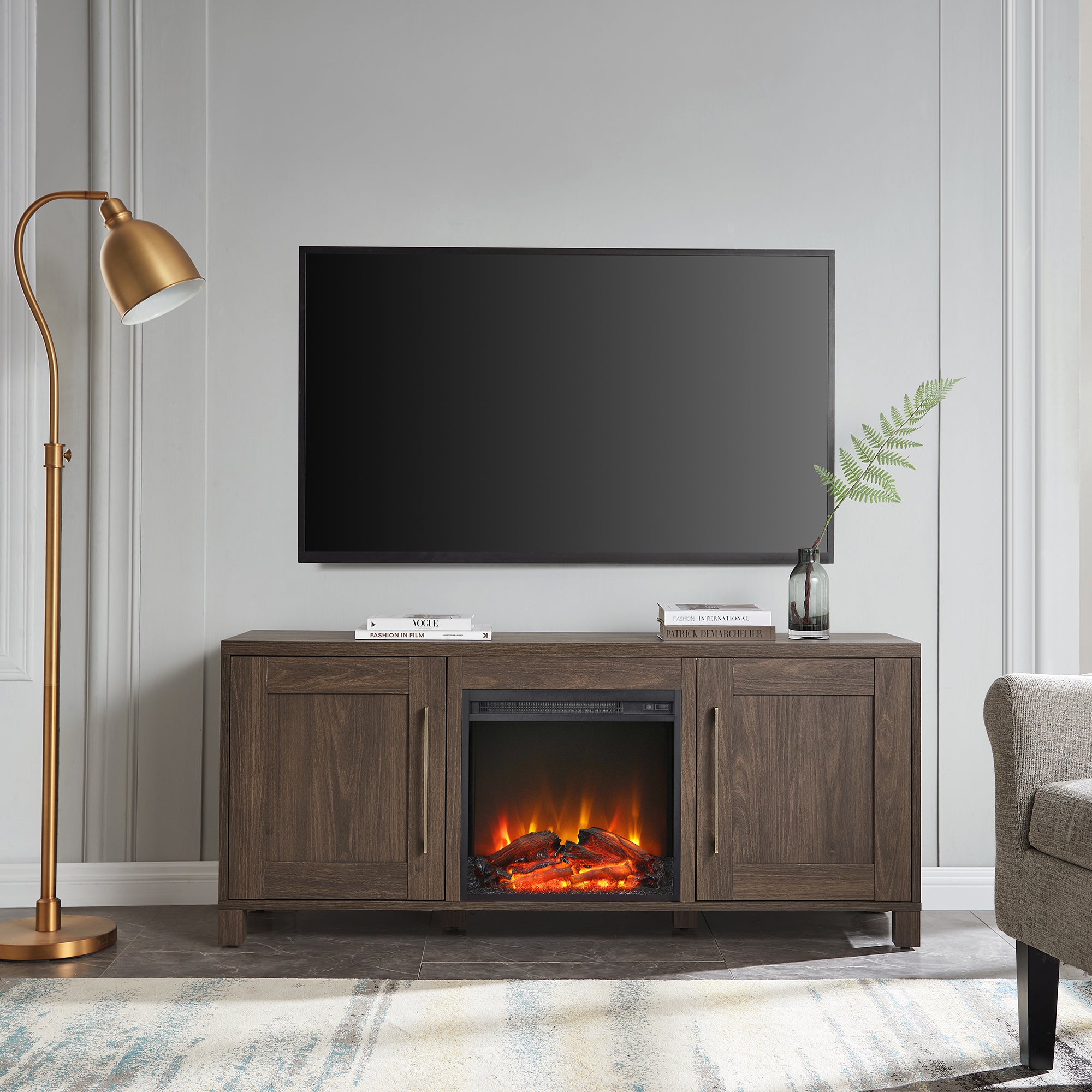 Combine functionality and classic transitional design with this modern TV stand, featuring an inset electric fireplace. Its rich wood tone creates a warm neutral palette that will blend seamlessly into any color scheme, while its classic styling pairs perfectly with the existing design inspiration of your living room, den, or game room. This solid-backed stand features two large enclosed cabinets with sleek brass-finished hardware. Cable management cut-outs and adjustable inner shelves help keep your media storage and consoles organized.