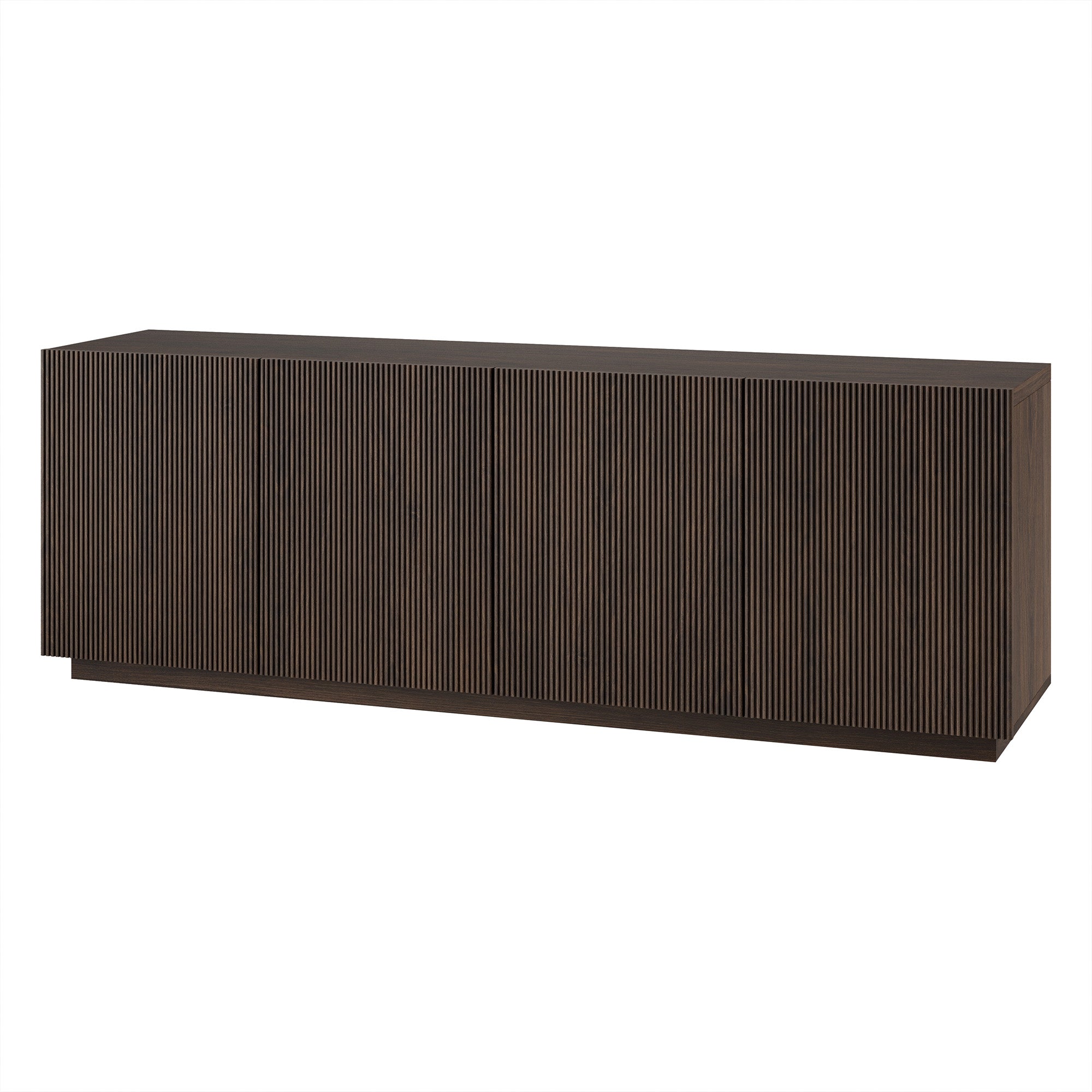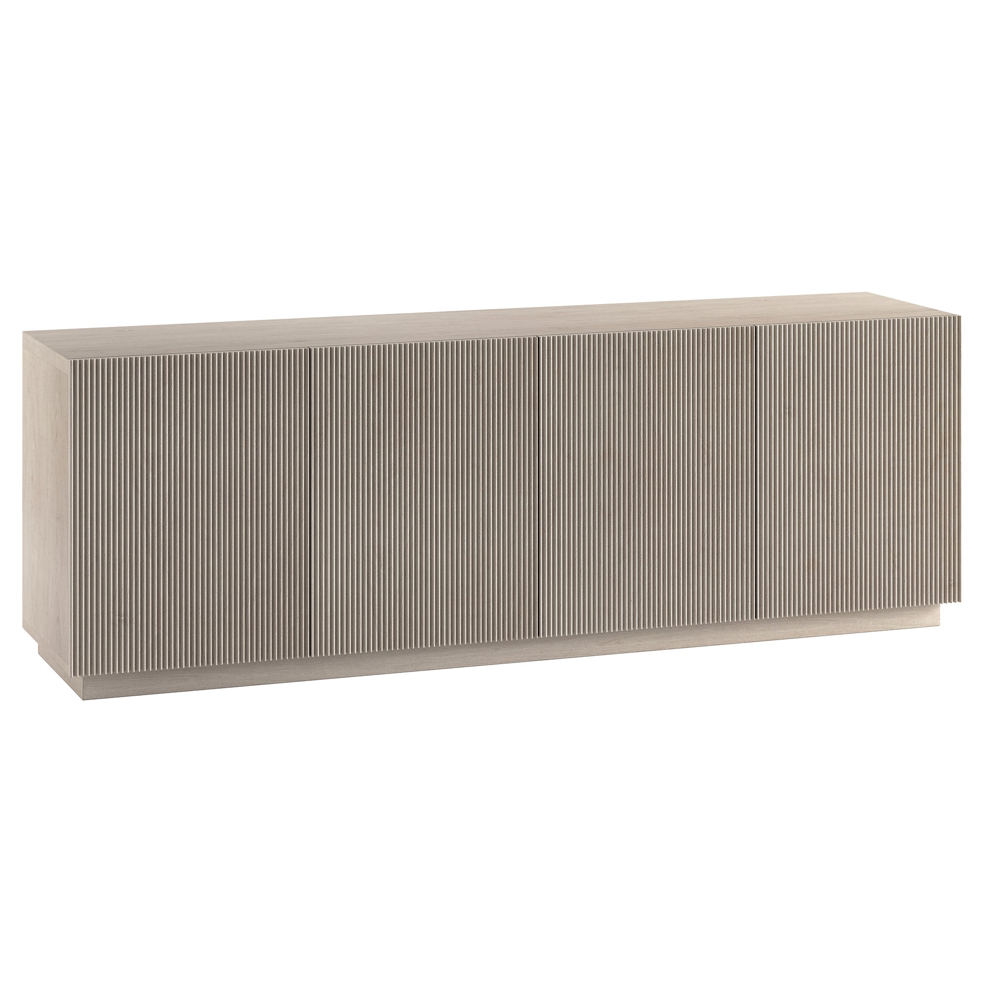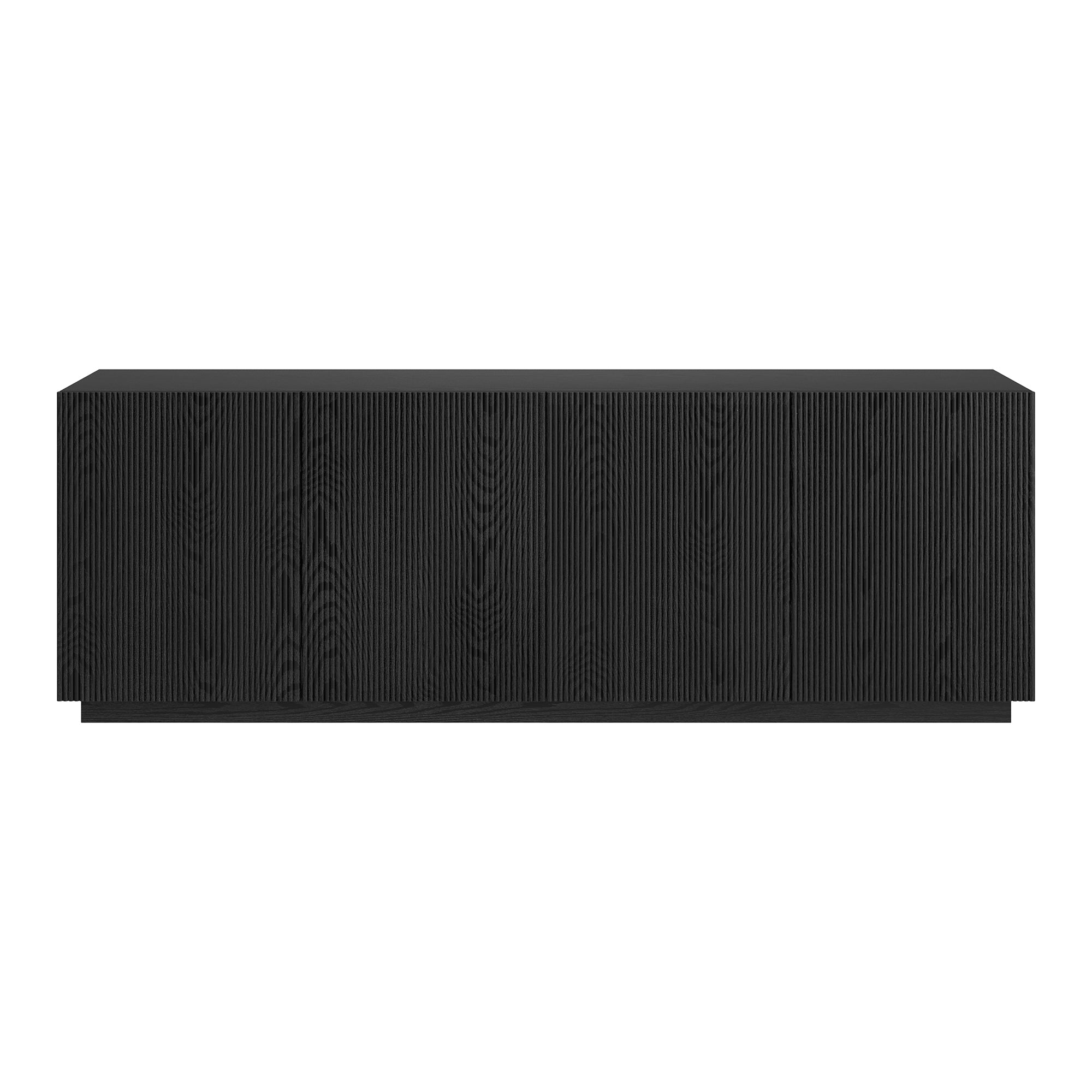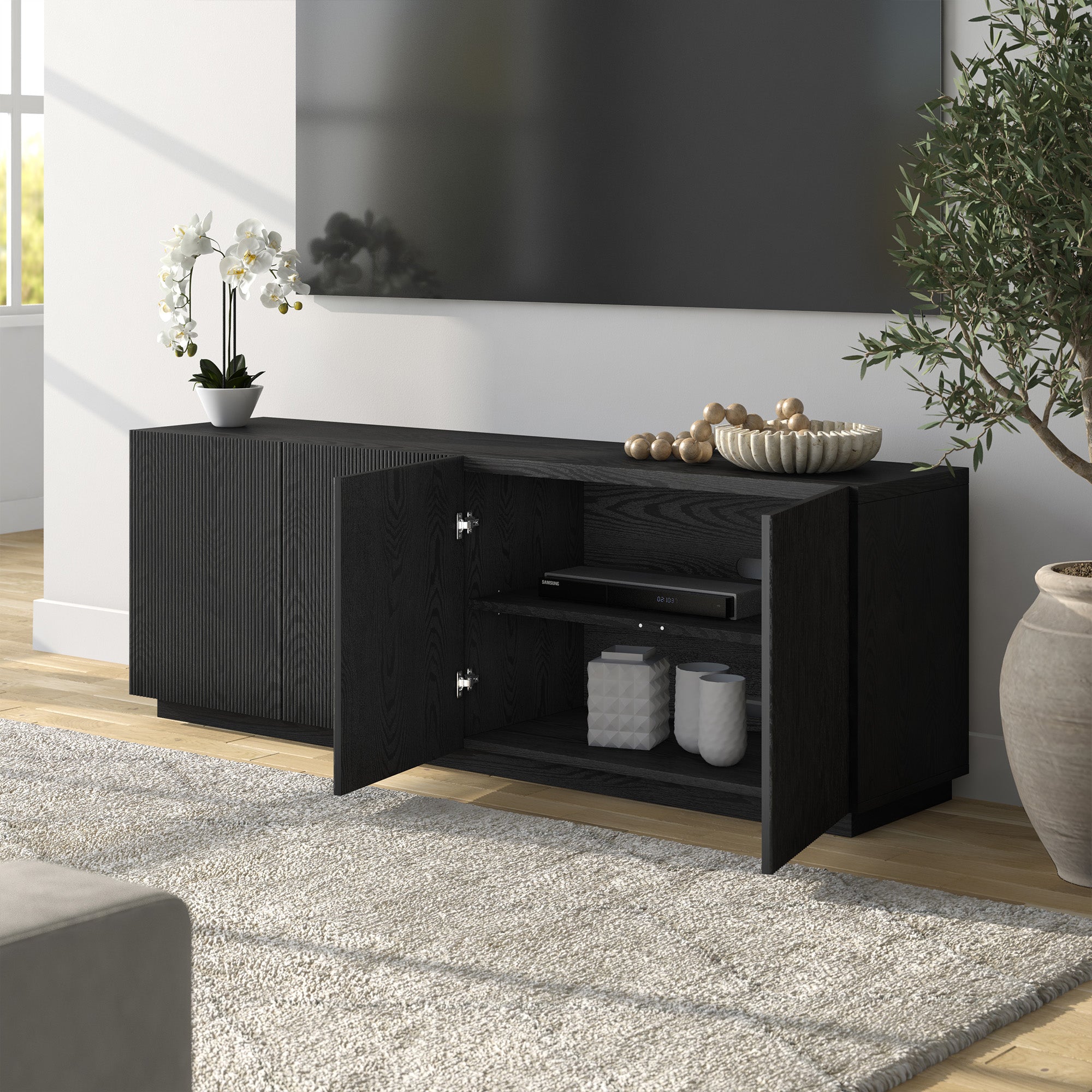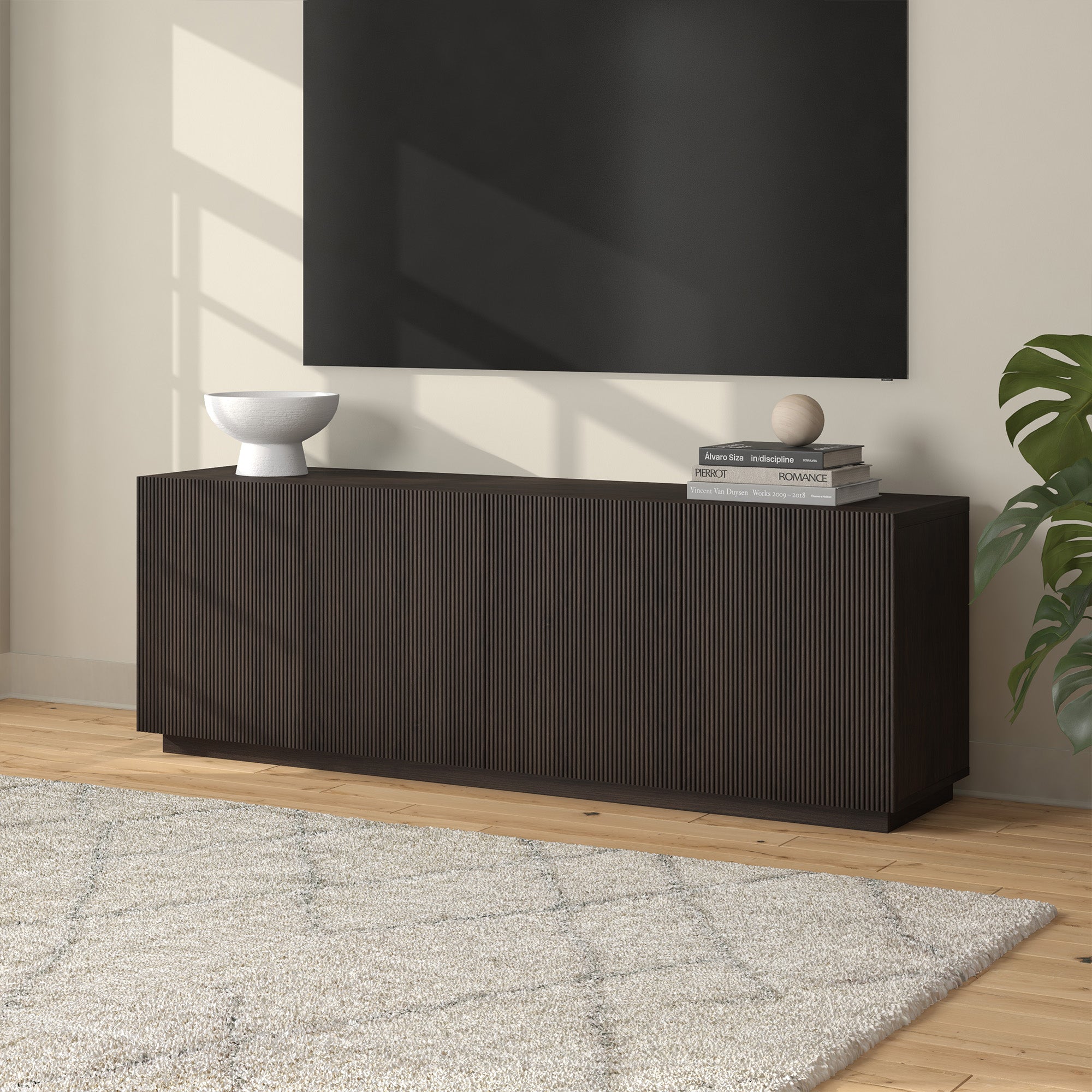 On-trend texture and design combine in this transitional TV stand. With a wood grain finish and textured doors, this piece is sure to be a statement in your living room, den, or game room. The fluted doors from the top edge to the plinth base give the illusion of a seamless transition across the cabinets. Lightly pull on the top or bottom edge to open the doors. The modern contemporary design of the stand features 4 fully enclosed doors with 4 inner shelves, allowing for ample storage for your devices, games, books, and more.