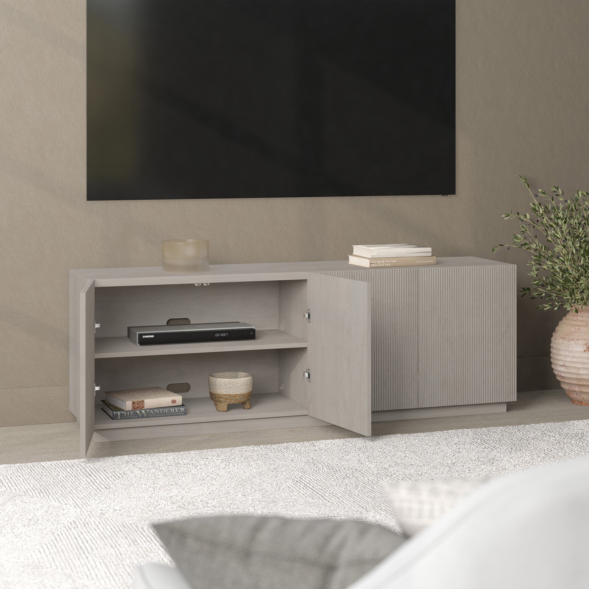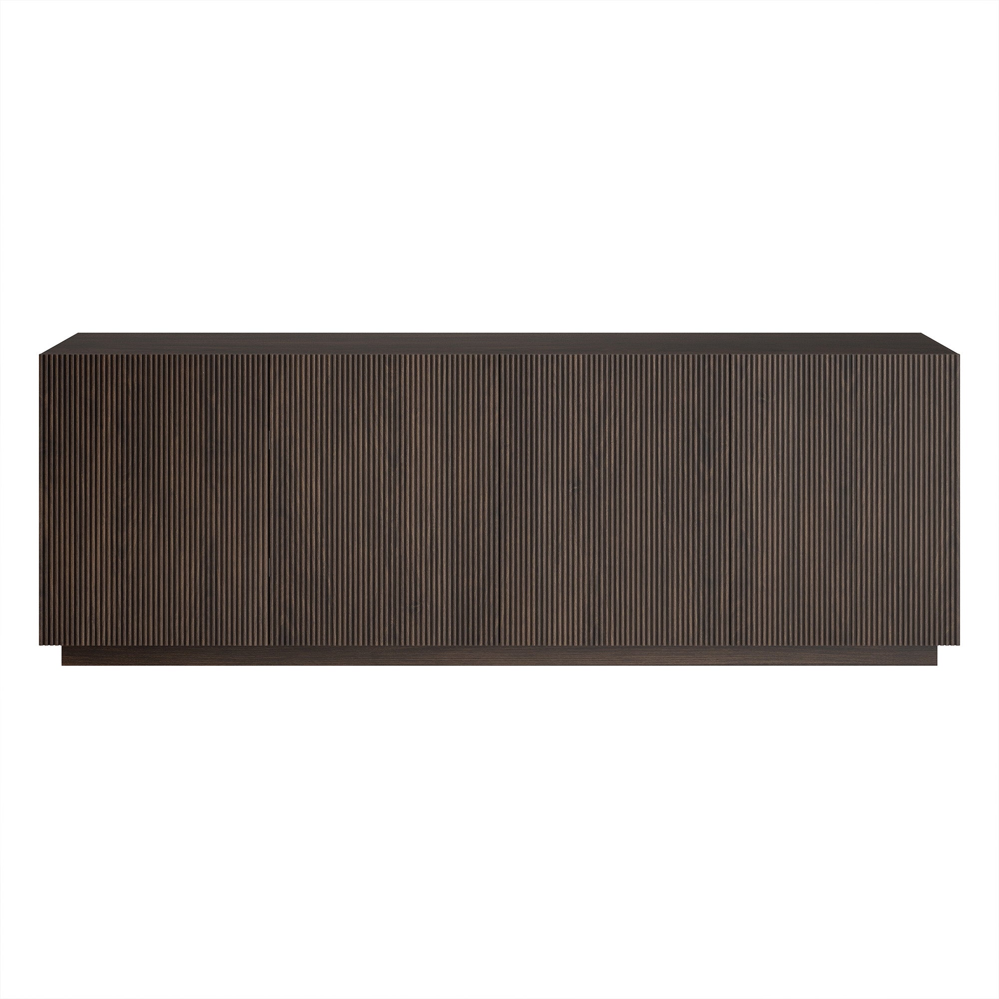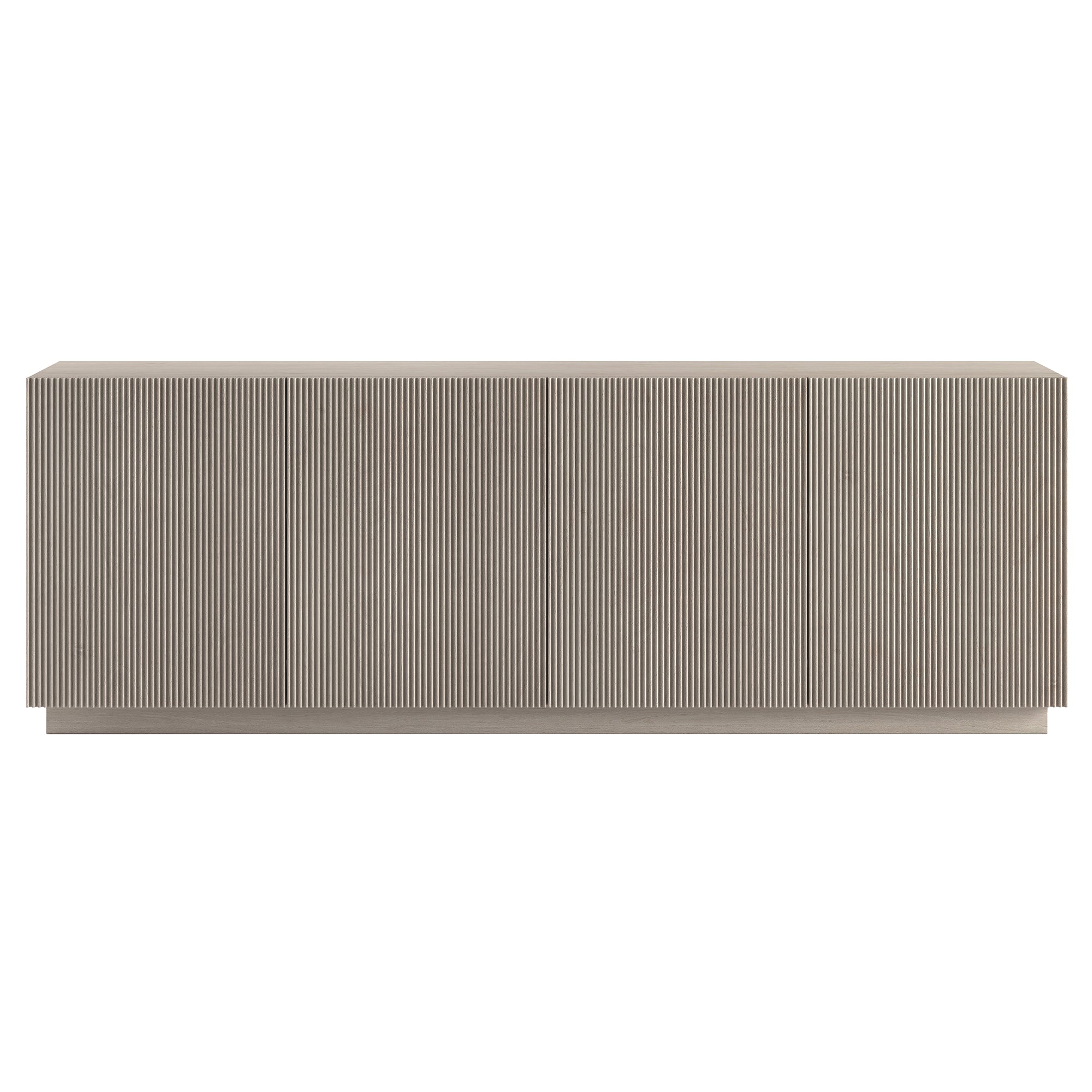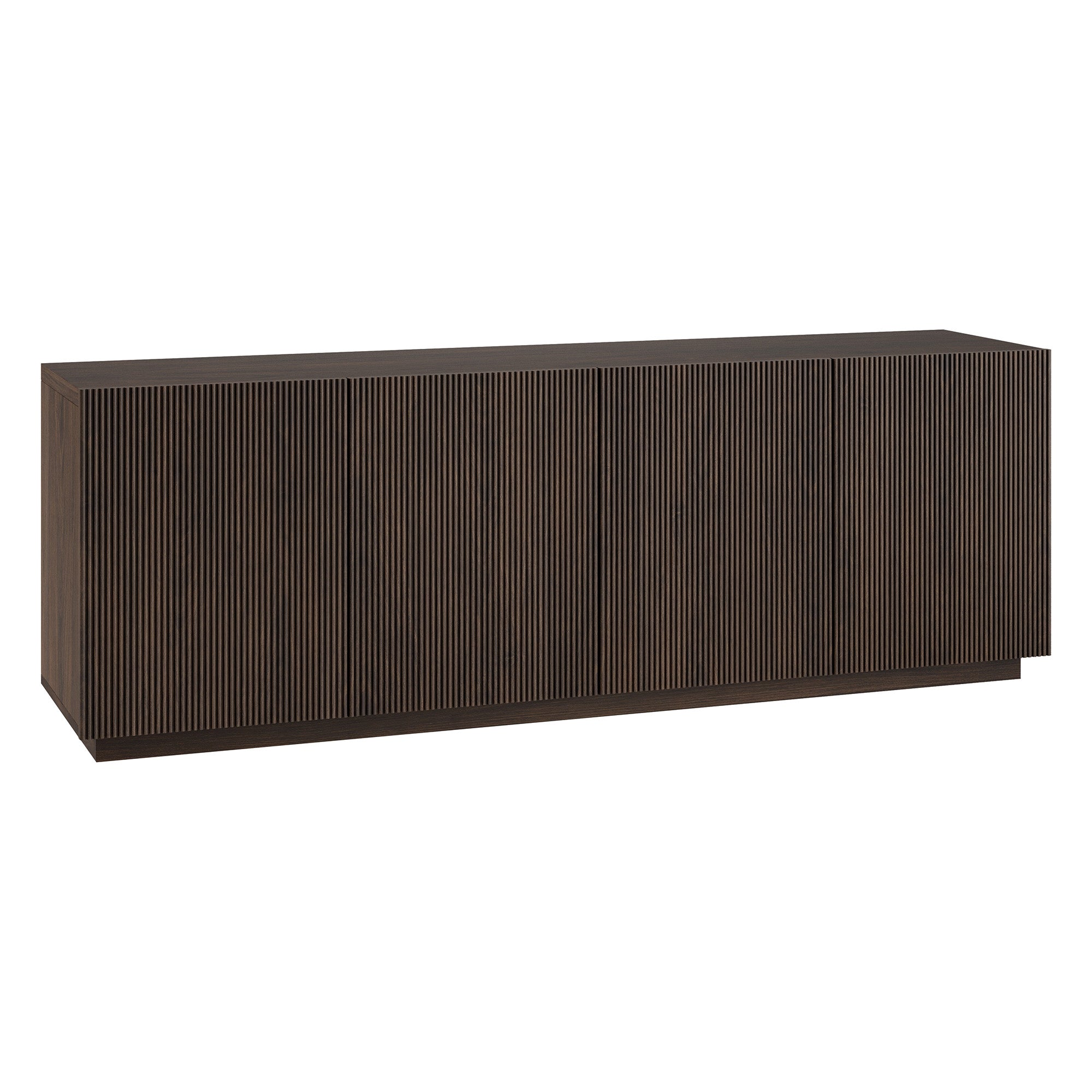 On-trend texture and design combine in this transitional TV stand. With a wood grain finish and textured doors, this piece is sure to be a statement in your living room, den, or game room. The fluted doors from the top edge to the plinth base give the illusion of a seamless transition across the cabinets. Lightly pull on the top or bottom edge to open the doors. The modern contemporary design of the stand features 4 fully enclosed doors with 4 inner shelves, allowing for ample storage for your devices, games, books, and more.