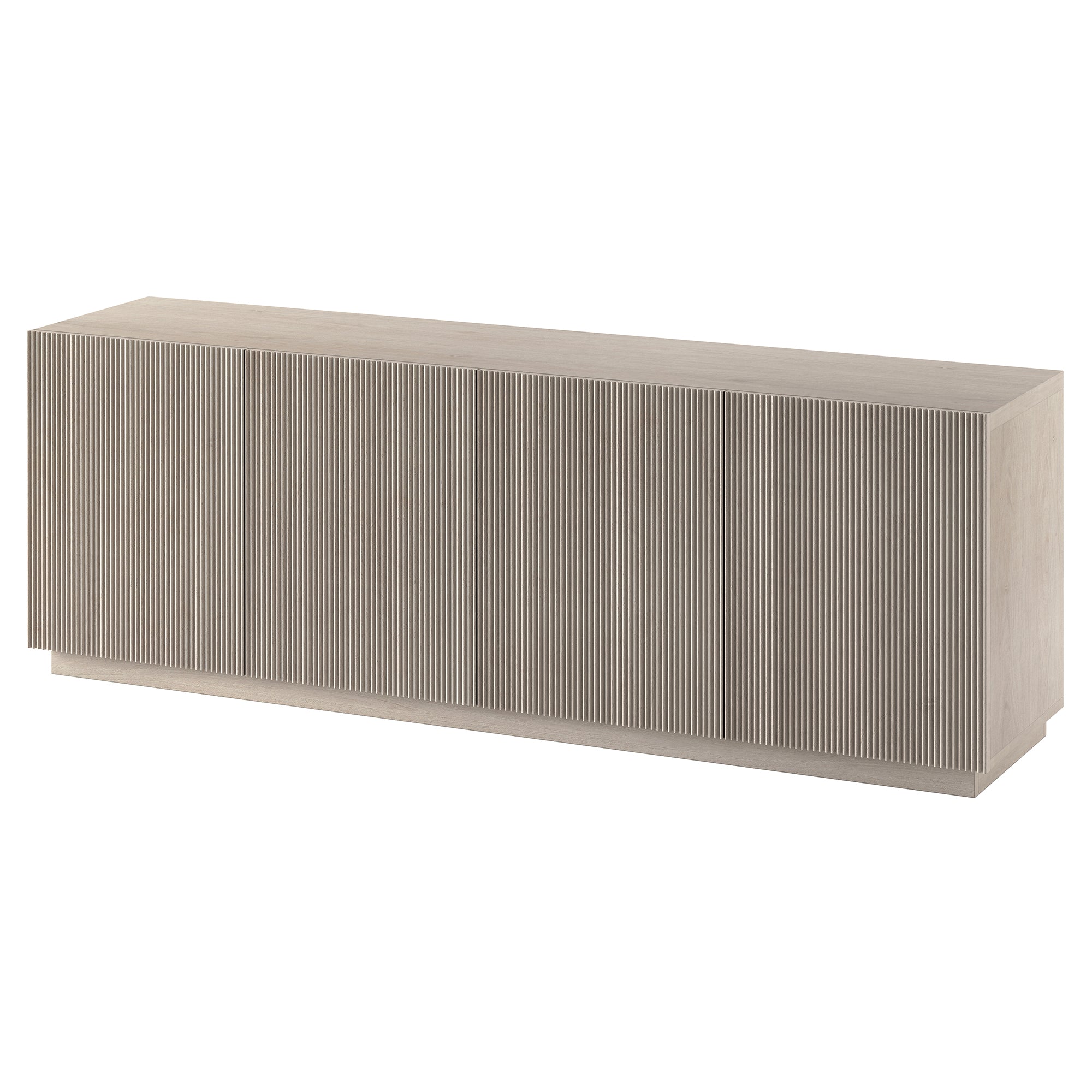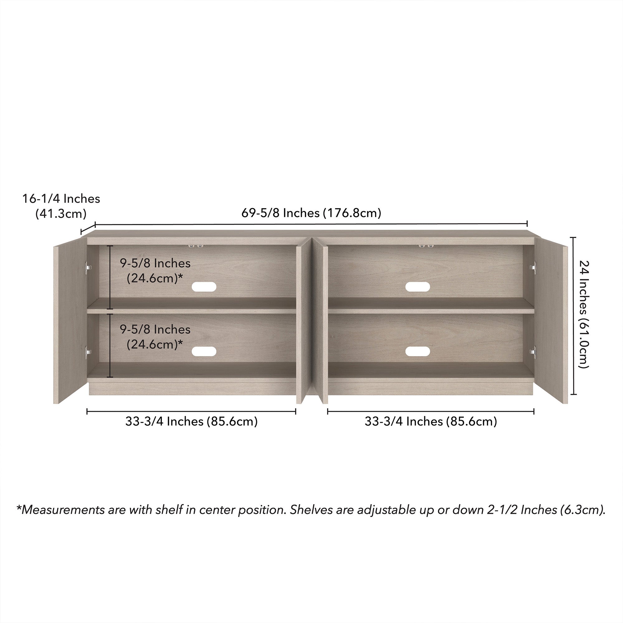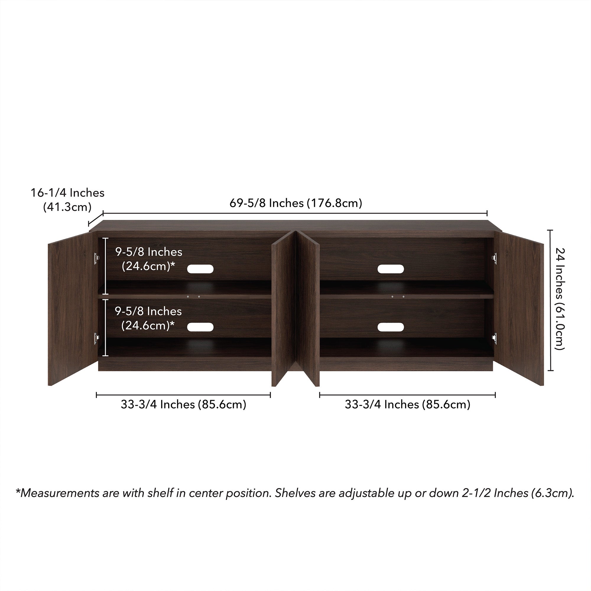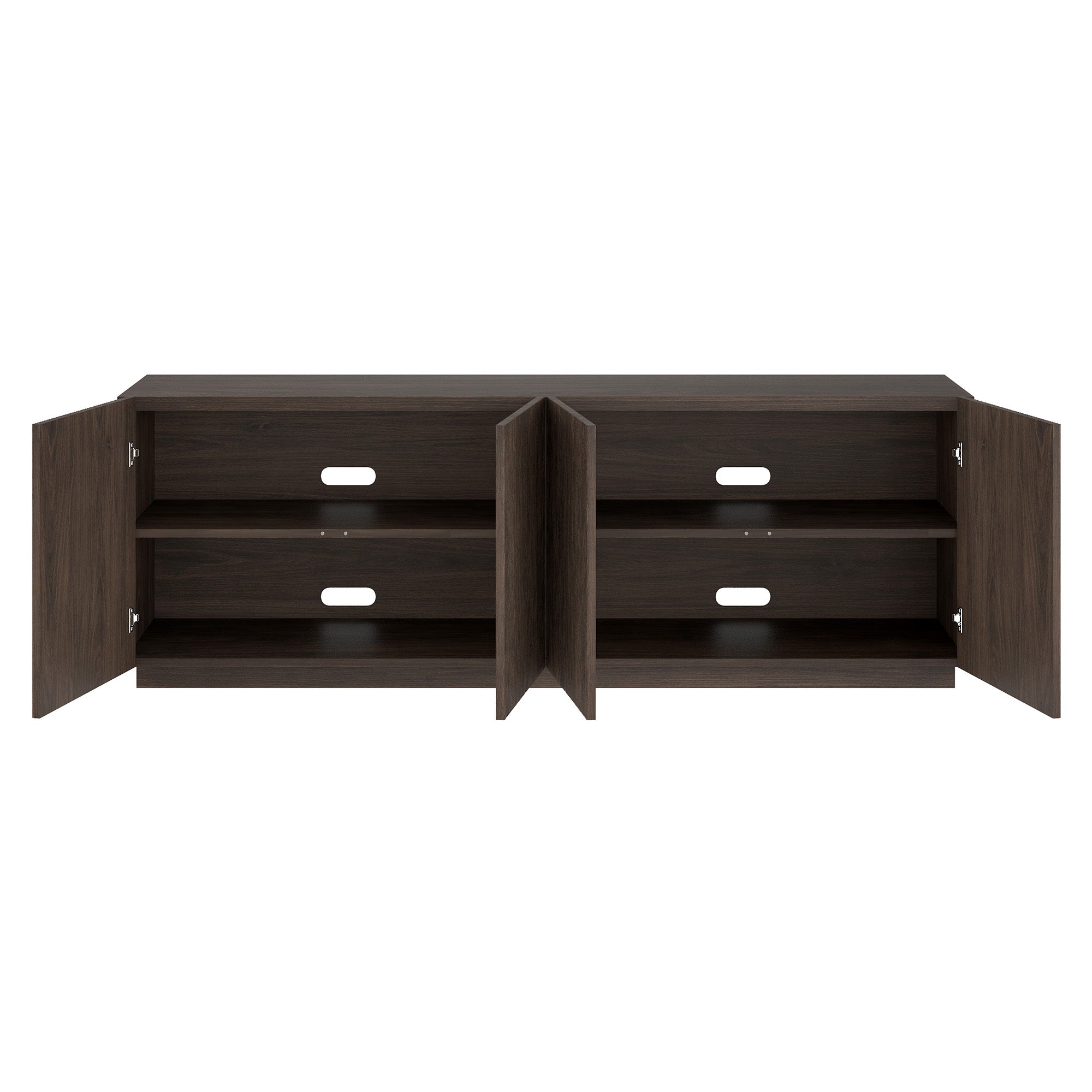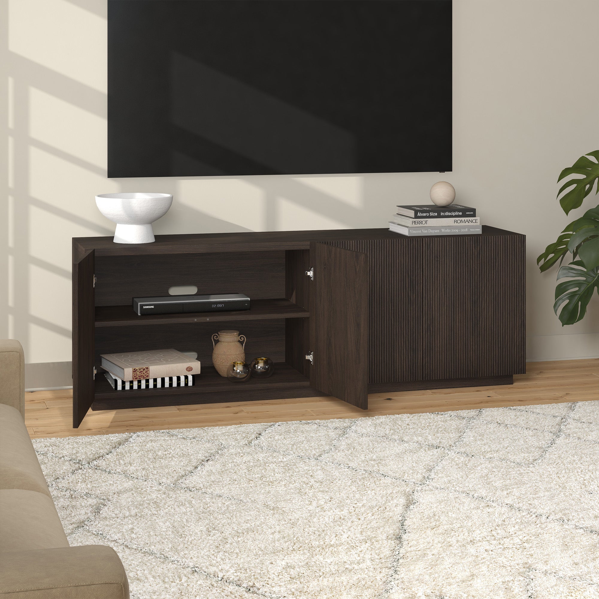 On-trend texture and design combine in this transitional TV stand. With a wood grain finish and textured doors, this piece is sure to be a statement in your living room, den, or game room. The fluted doors from the top edge to the plinth base give the illusion of a seamless transition across the cabinets. Lightly pull on the top or bottom edge to open the doors. The modern contemporary design of the stand features 4 fully enclosed doors with 4 inner shelves, allowing for ample storage for your devices, games, books, and more.