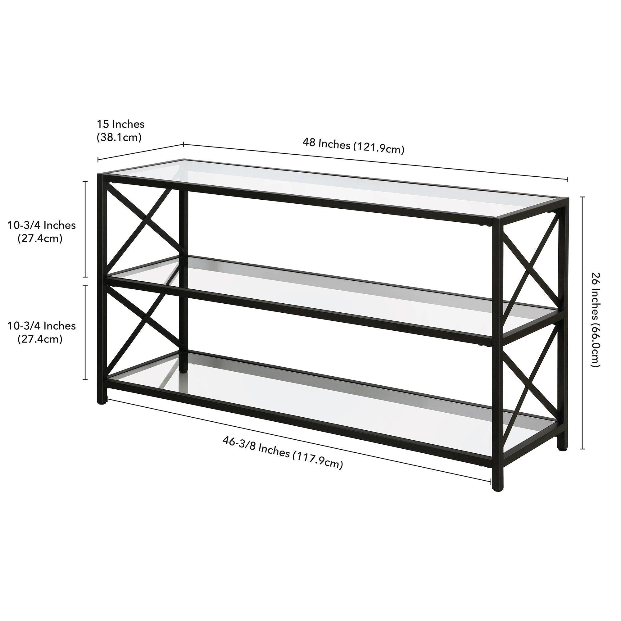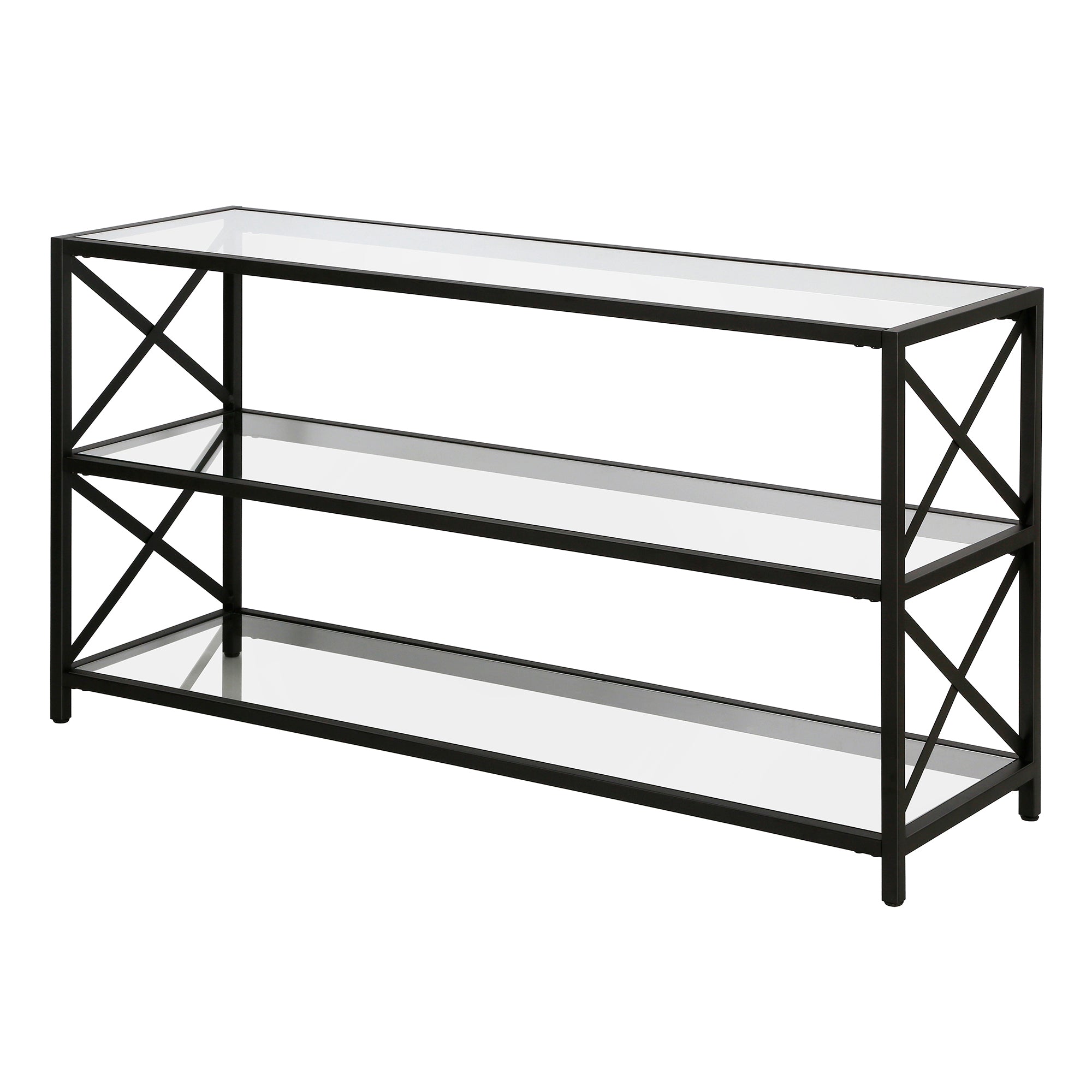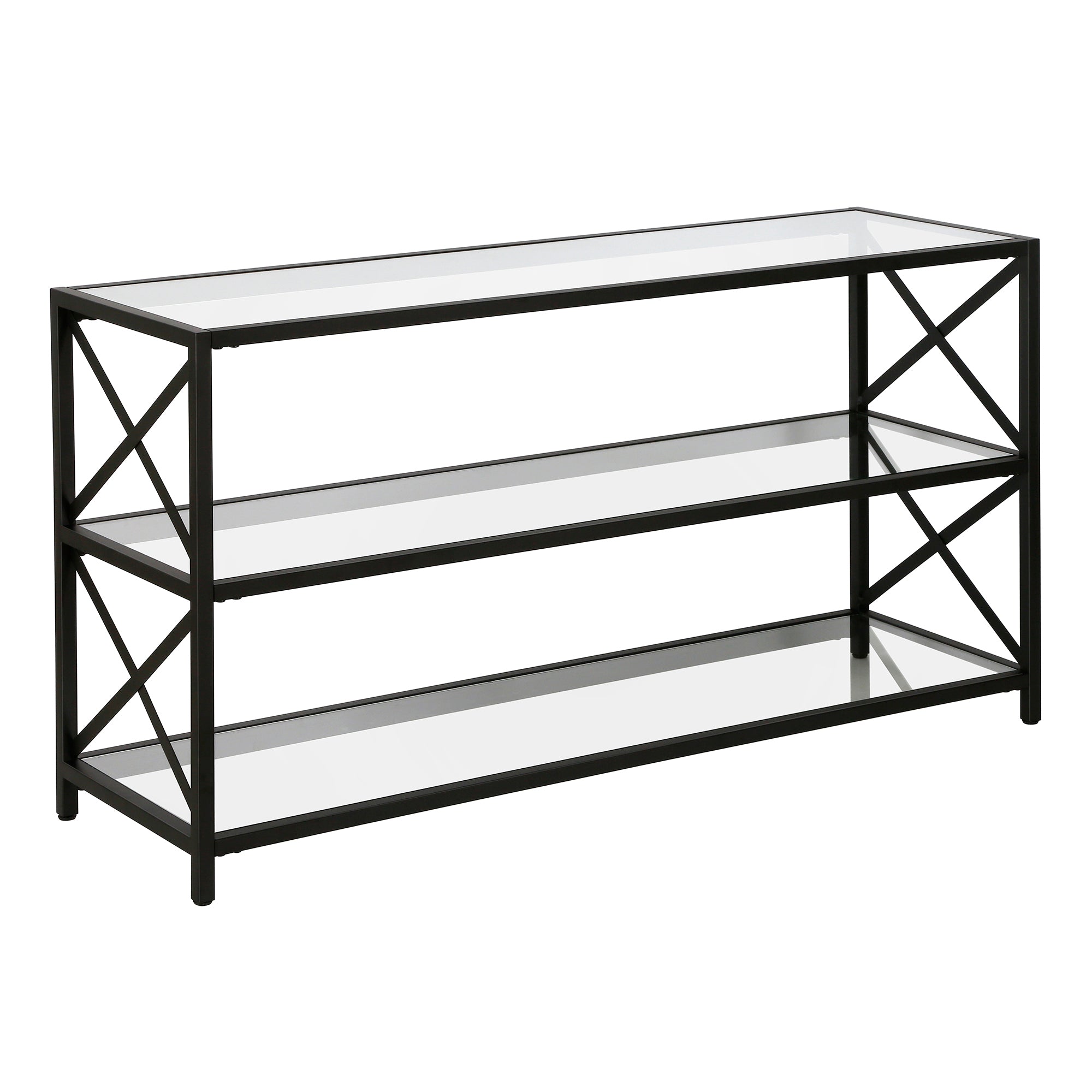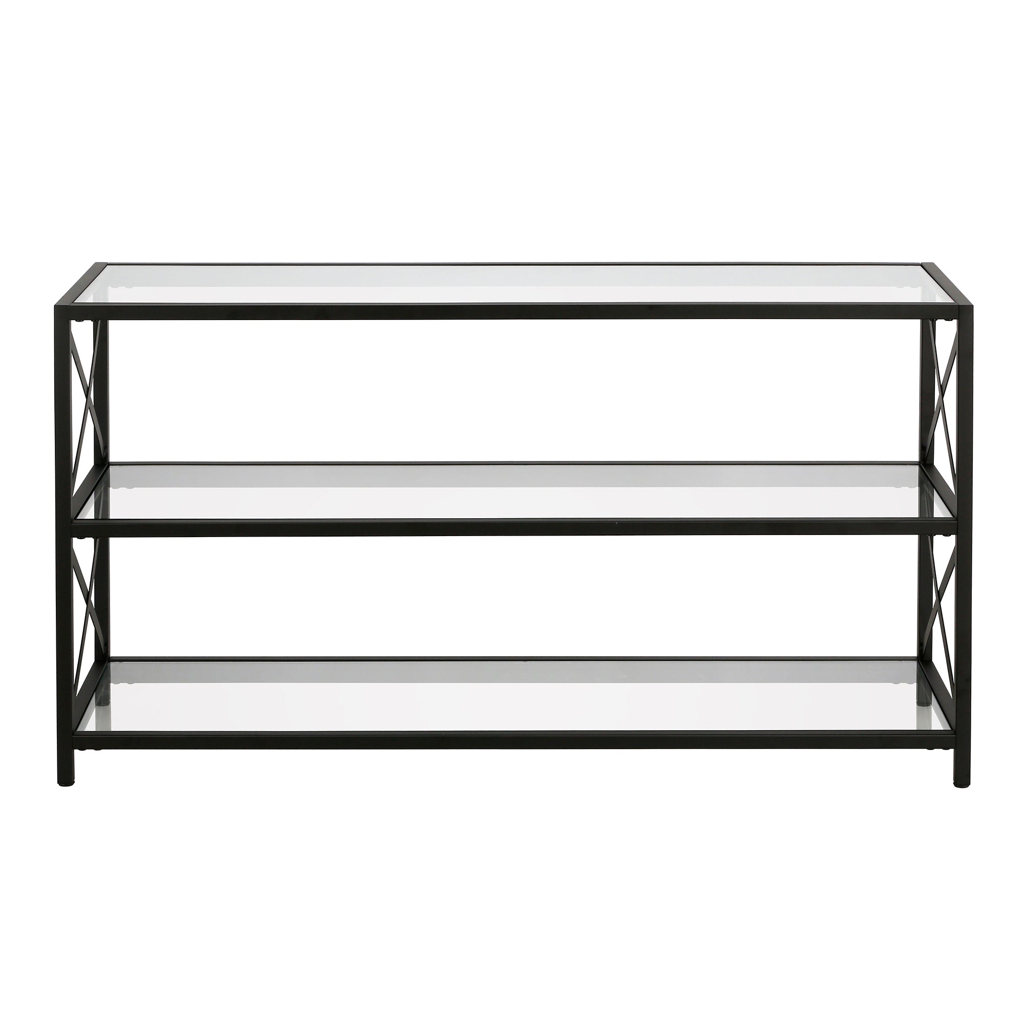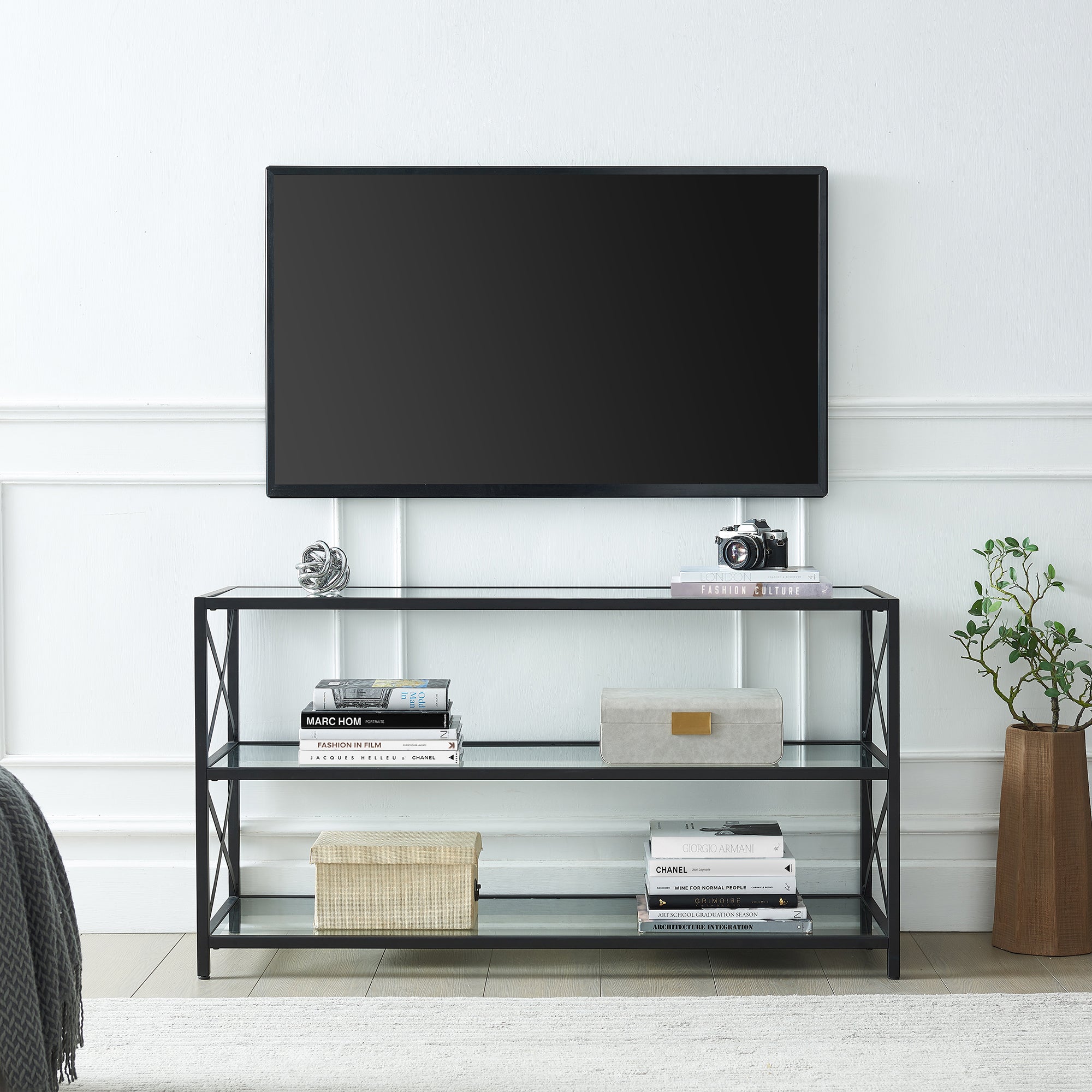 The luxe look of repeated geometric X's in rich metallic finishing bring this classic design ahead of the trend curve. With a tempered glass top, this TV stand is streamlined and durable in any living room or den. Go modern in blackened bronze or glam in golden brass to elevate your entertainment space.