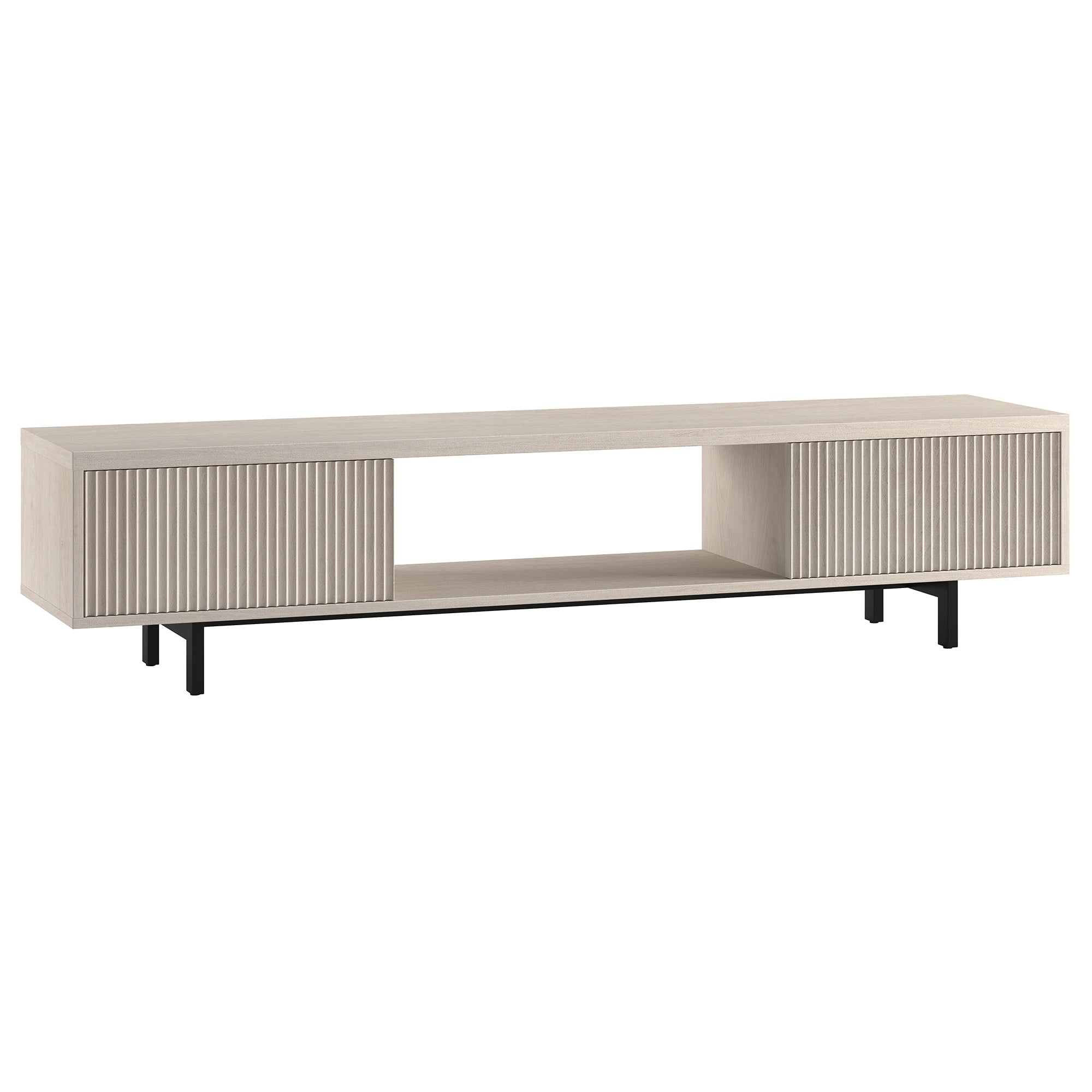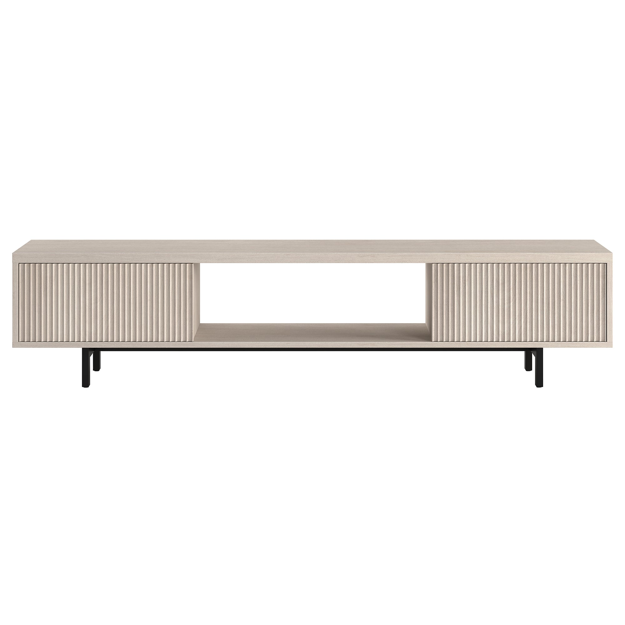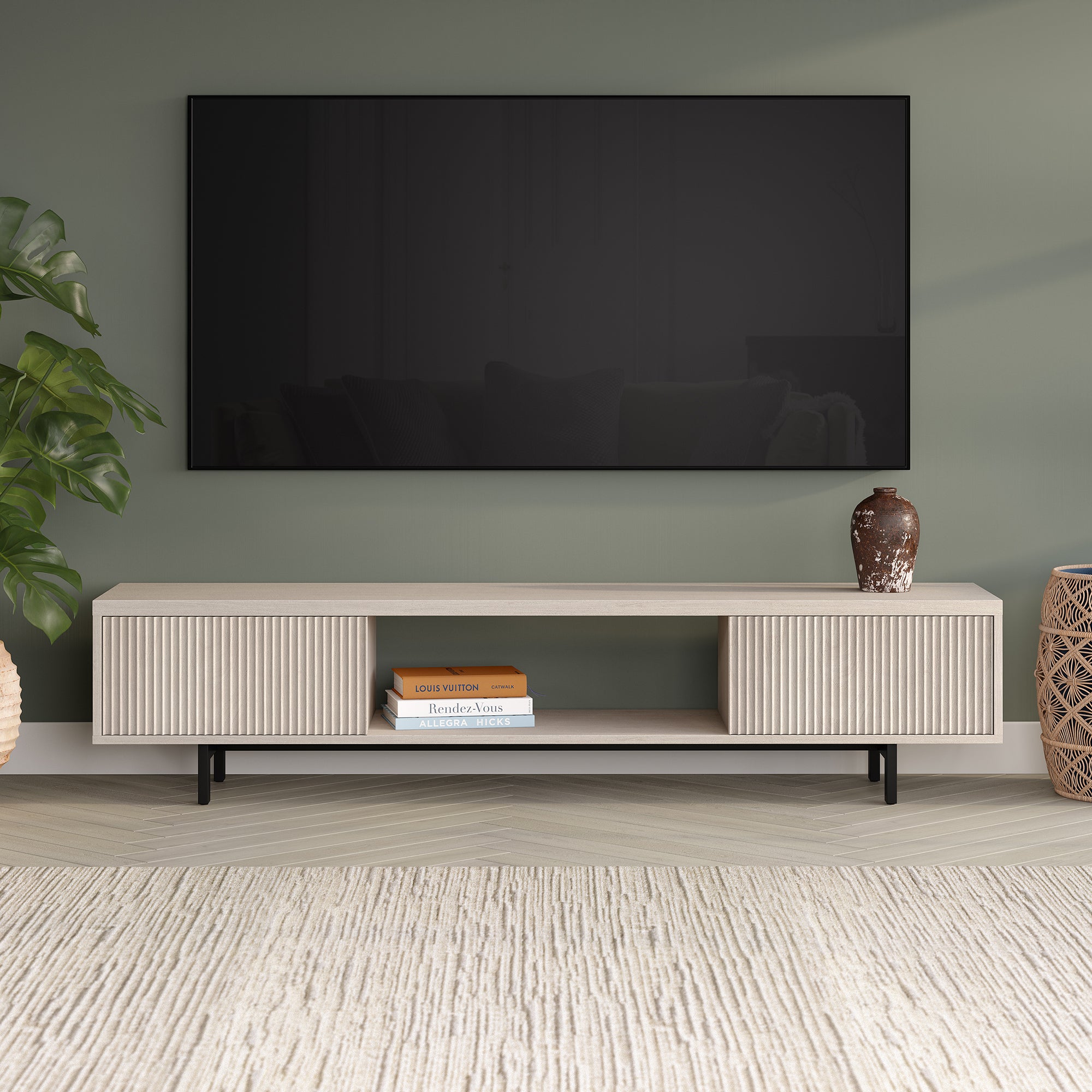 On-trend texture and design combine in this modern TV stand. With a wood grain finish and fluted cabinet doors, this piece is sure to be a statement in your living room, den, or game room. With a minimalist body style and low 16" height, you can focus less on your entertainment center and more on the entertainment! The enclosed cabinets with cable management cutouts create storage options for items you'd rather hide from view, while the open center cutout allows for decorative displays or easy access to frequently used controllers or consoles.