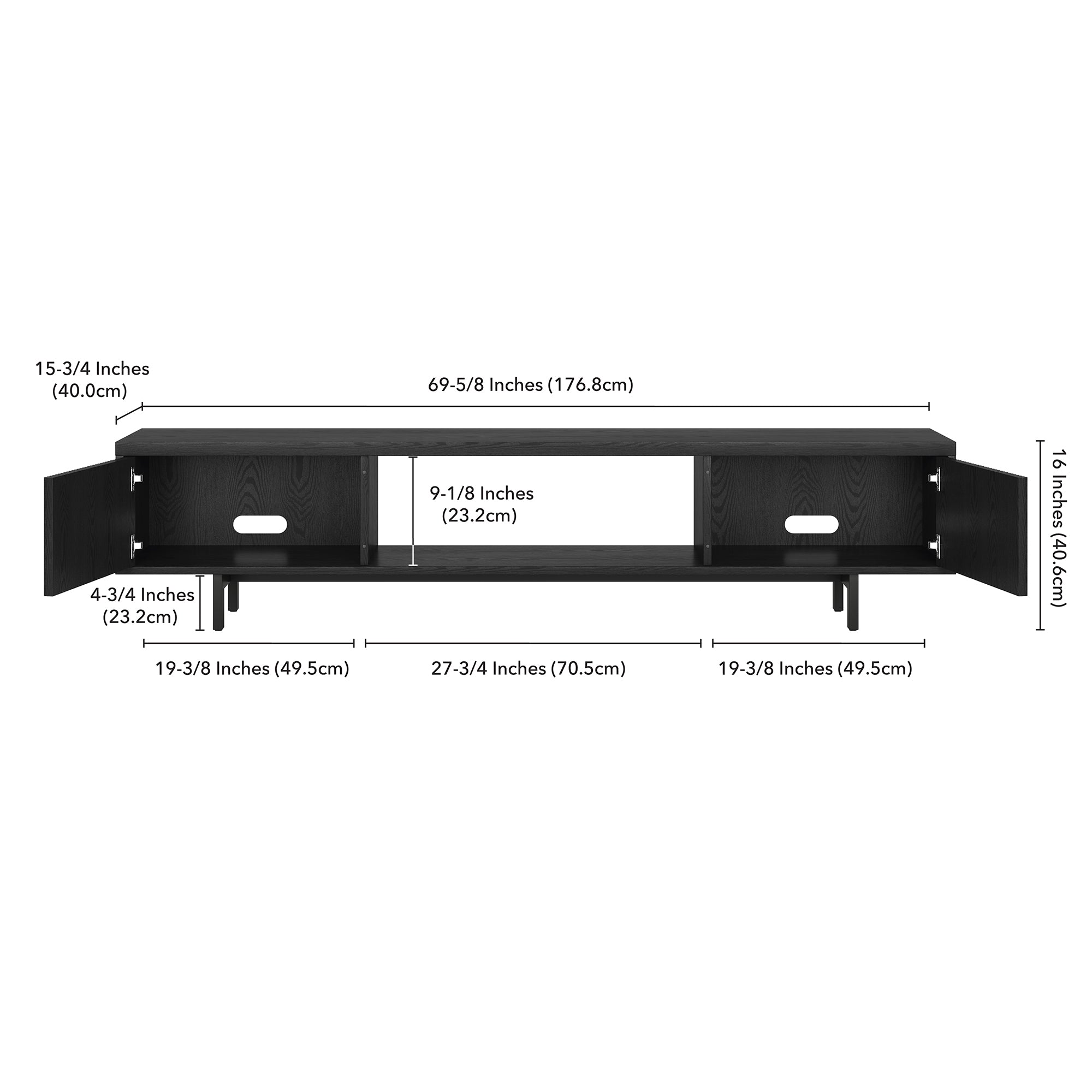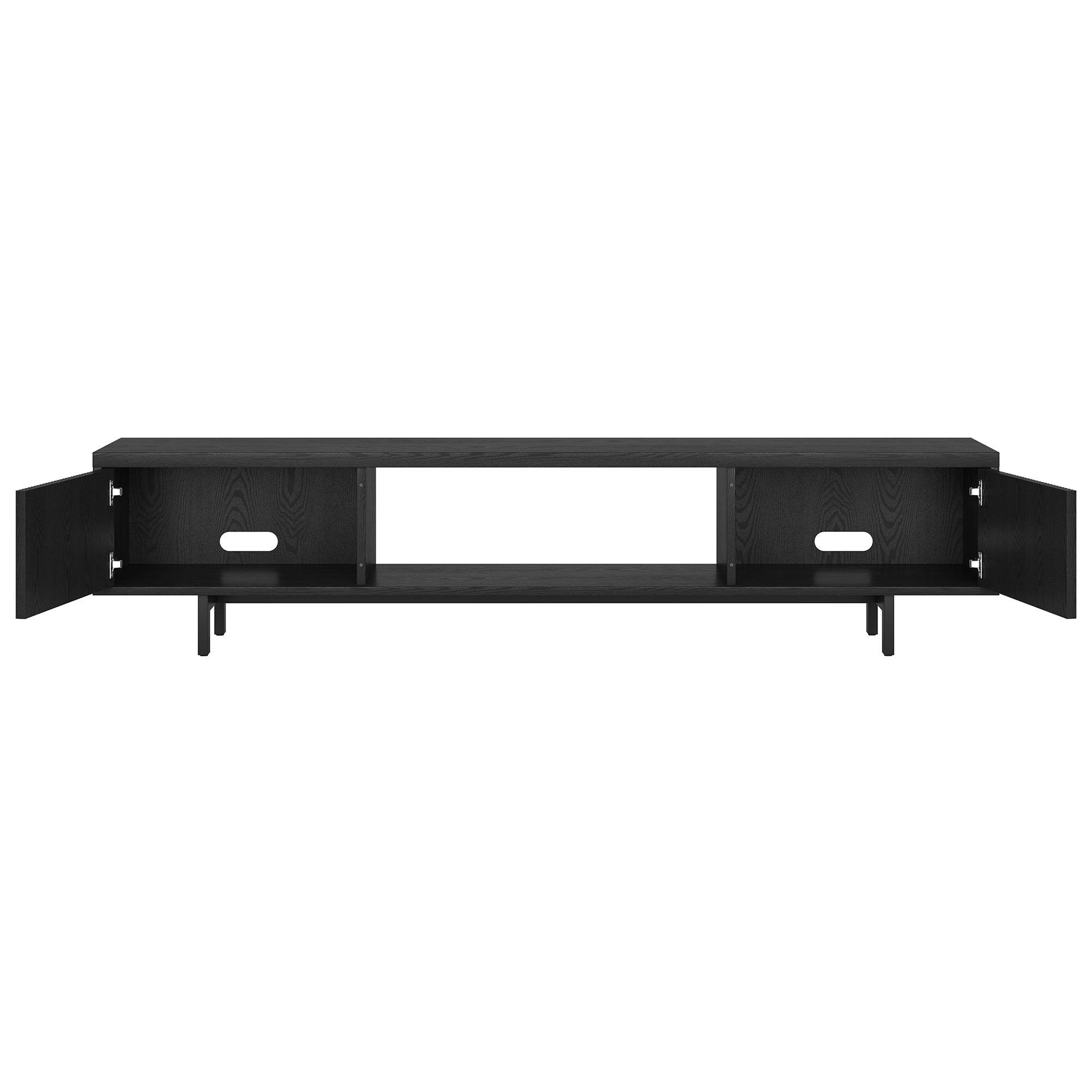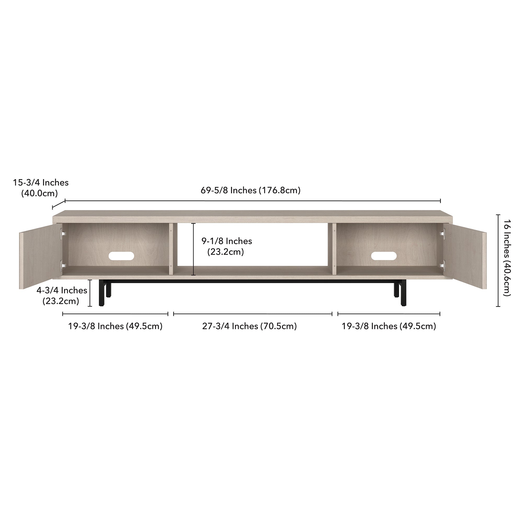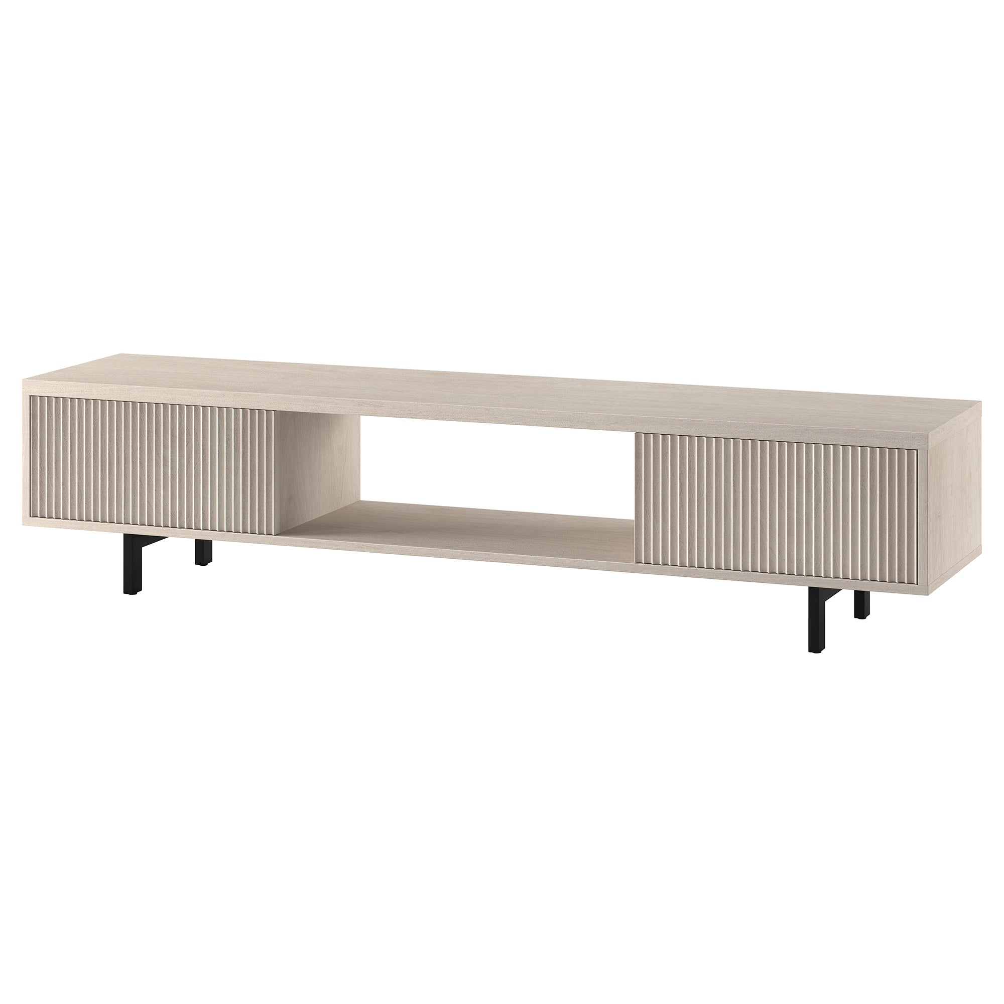 On-trend texture and design combine in this modern TV stand. With a wood grain finish and fluted cabinet doors, this piece is sure to be a statement in your living room, den, or game room. With a minimalist body style and low 16" height, you can focus less on your entertainment center and more on the entertainment! The enclosed cabinets with cable management cutouts create storage options for items you'd rather hide from view, while the open center cutout allows for decorative displays or easy access to frequently used controllers or consoles.