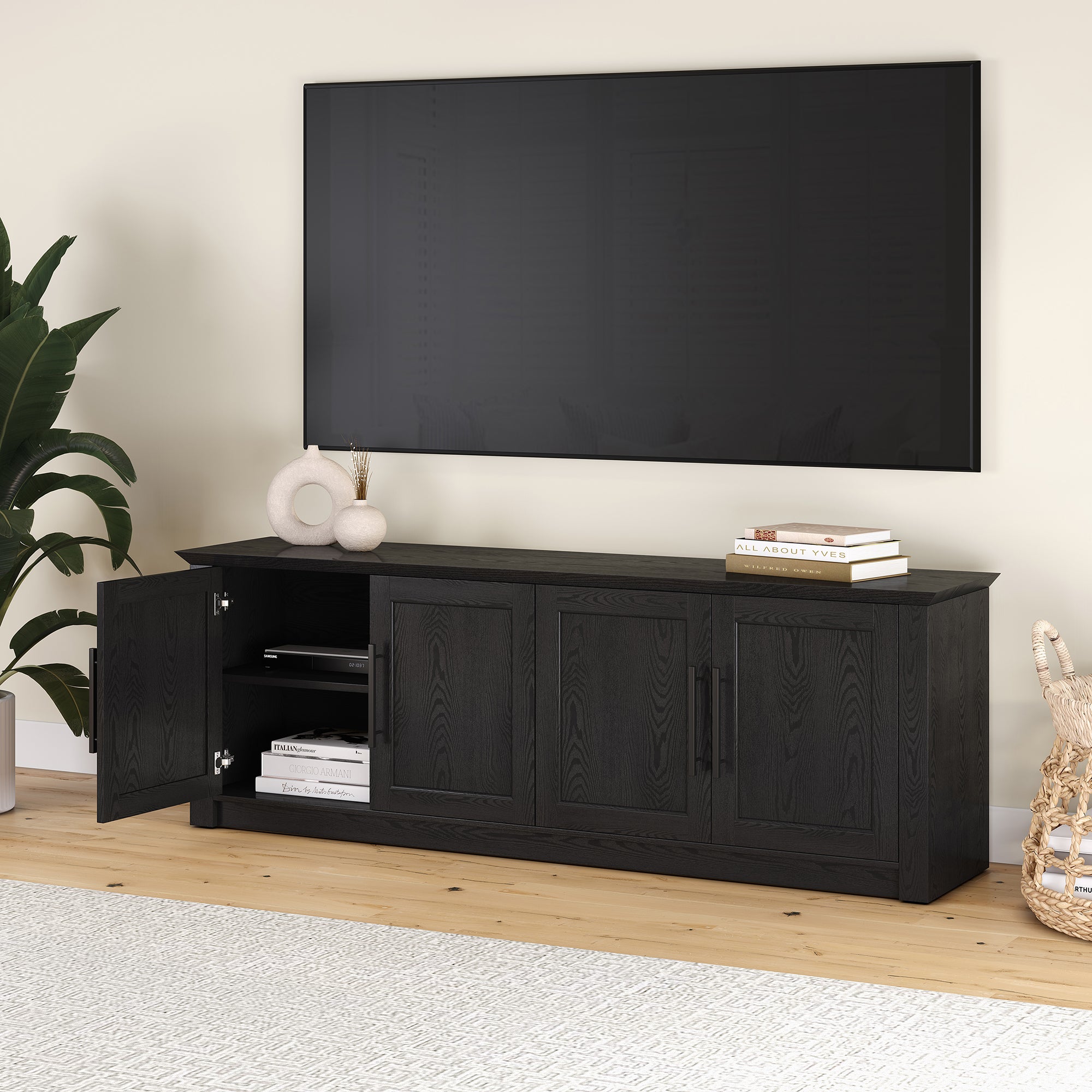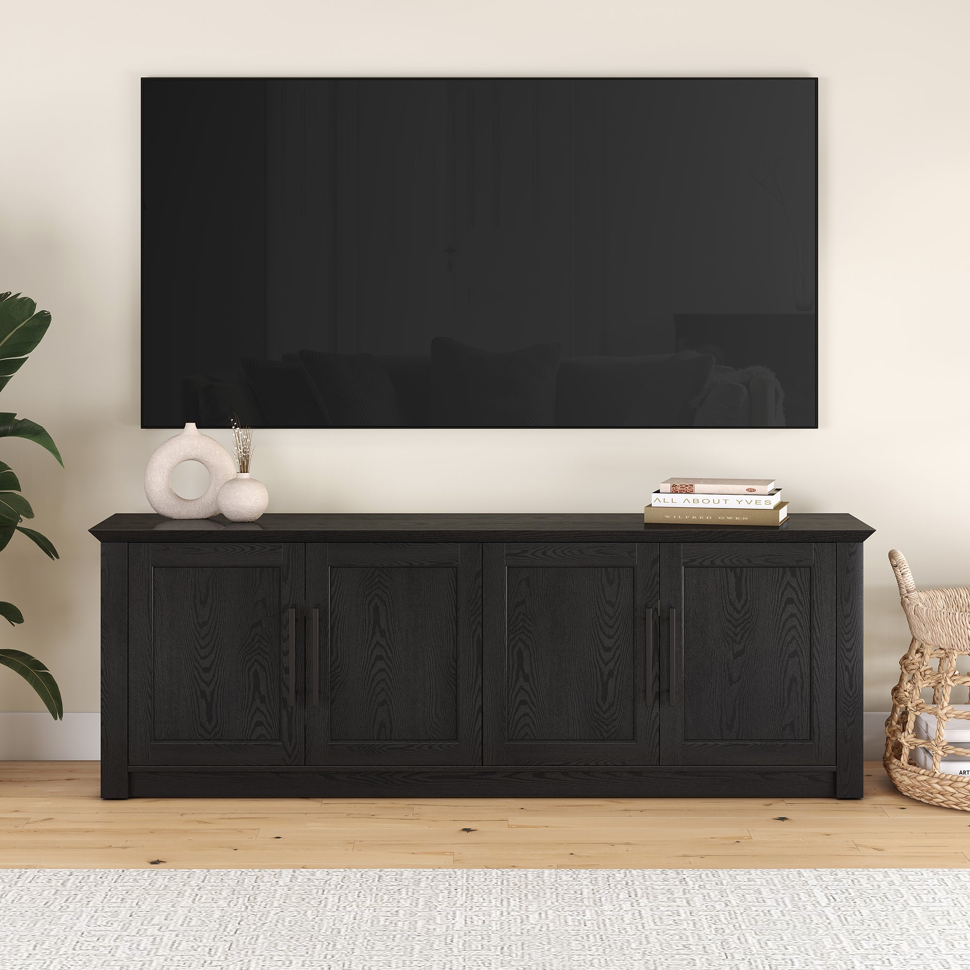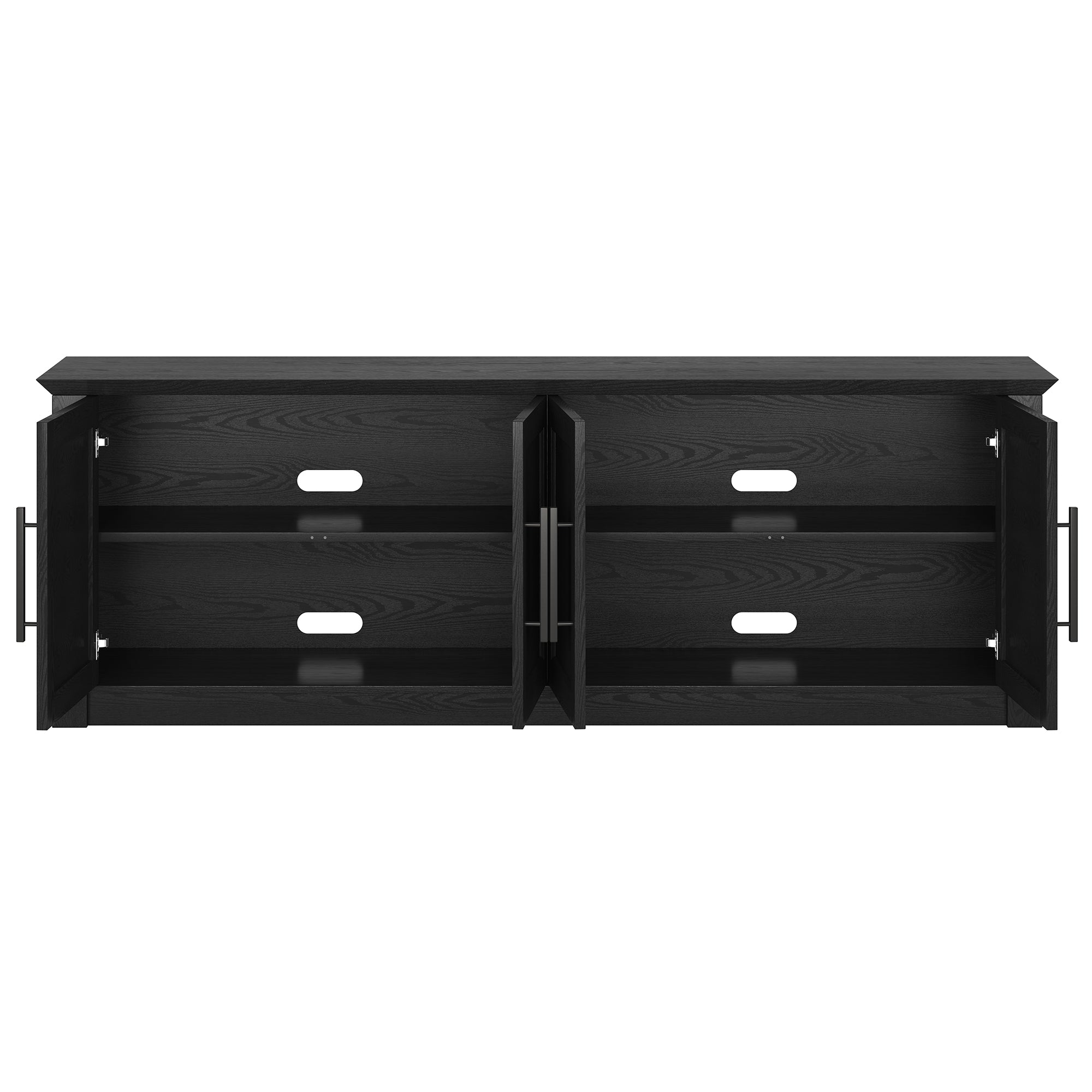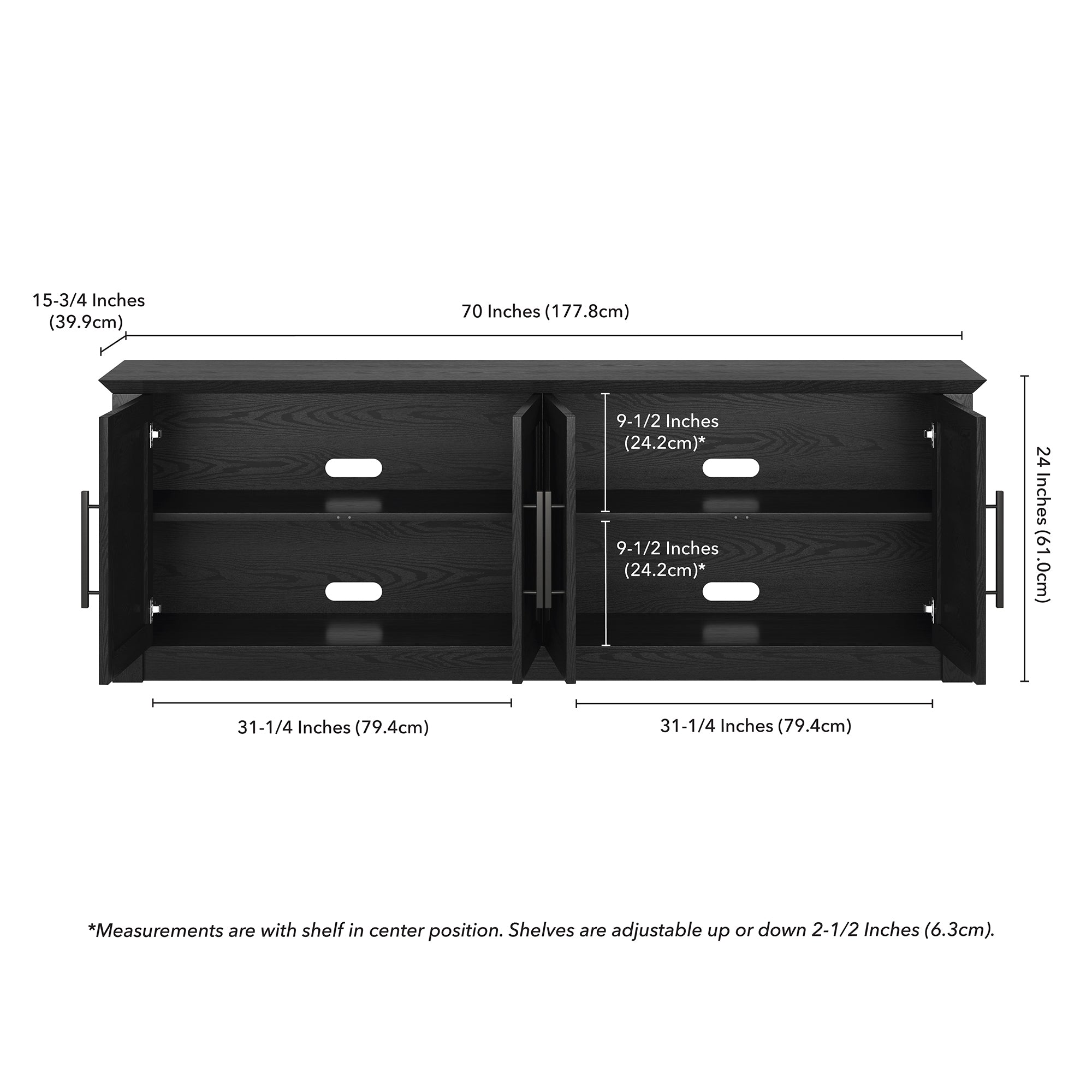 Updated farmhouse style gets a modern edge with this 70" TV stand. With a wood grain finish and sleek black hardware, this piece will blend seamlessly into any color scheme. The console features 4 fully enclosed doors with adjustable inner shelves and cable management cutouts, allowing for ample storage for your devices, games, books, and more. A must-have for living areas and entertainment spaces, this TV stand sets the stage for the big game, a movie marathon, or that season finale everyone’s been talking about.