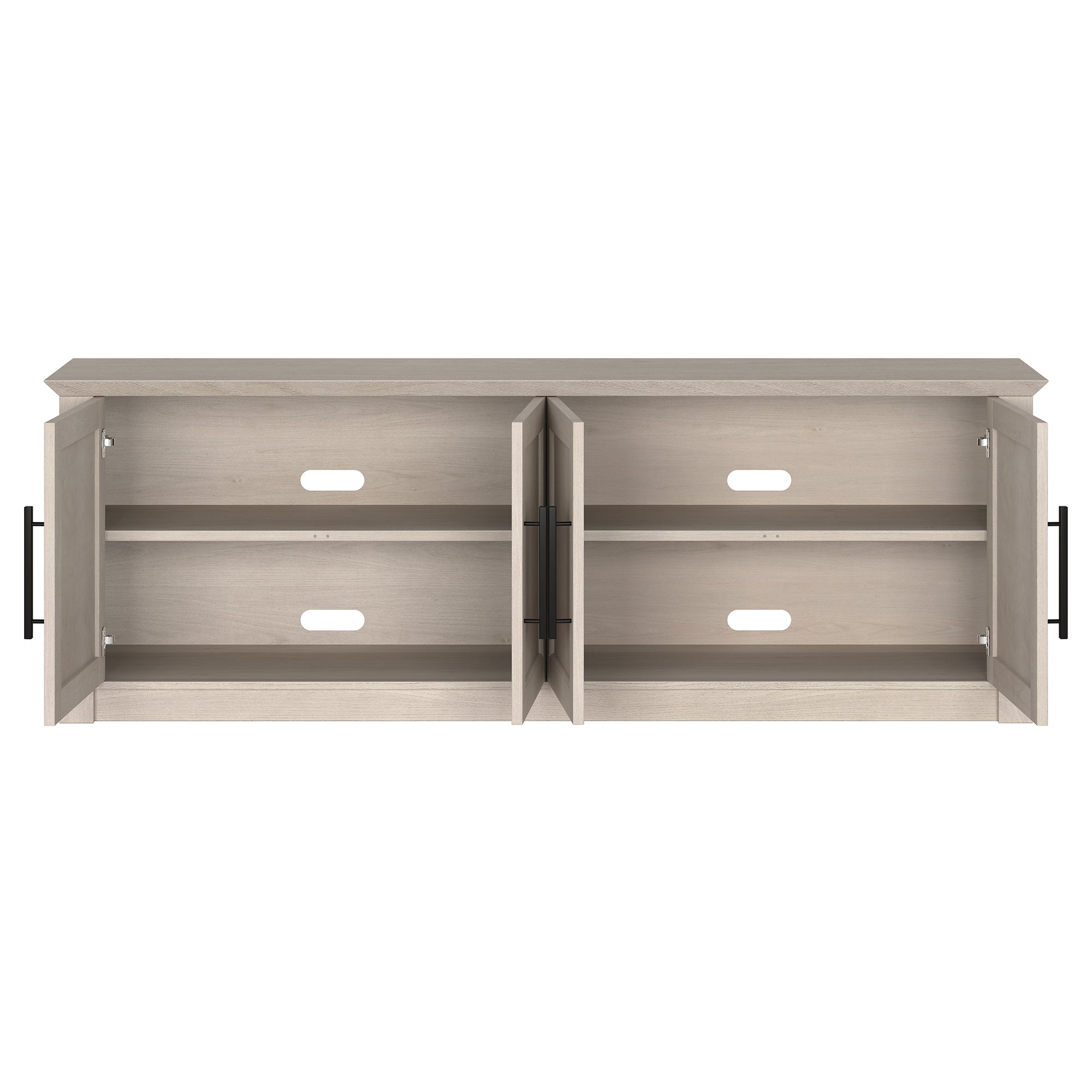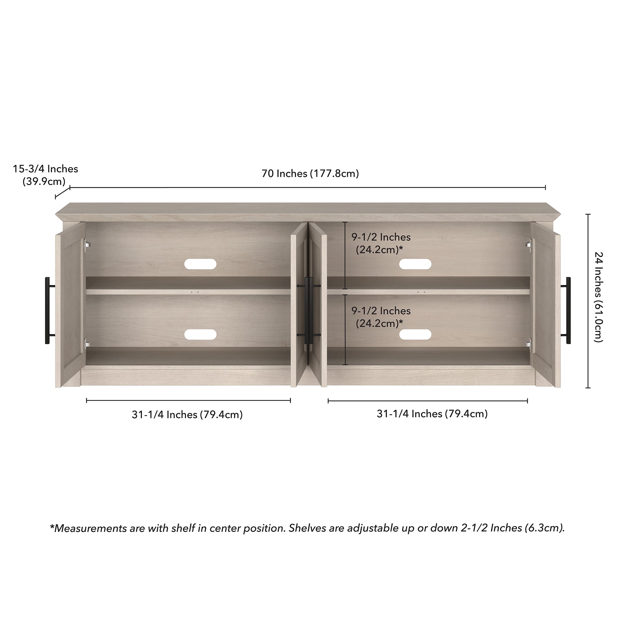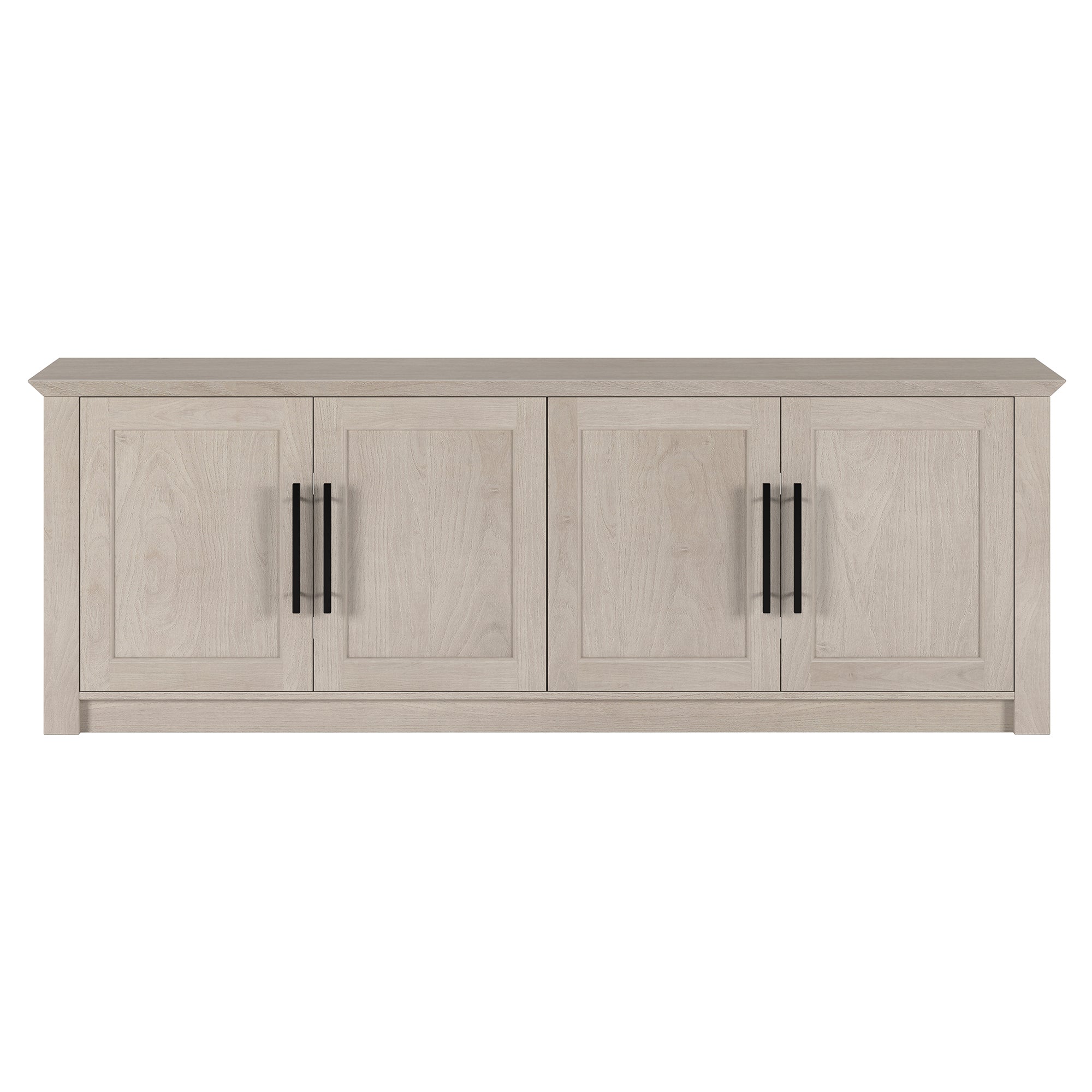 Updated farmhouse style gets a modern edge with this 70" TV stand. With a wood grain finish and sleek black hardware, this piece will blend seamlessly into any color scheme. The console features 4 fully enclosed doors with adjustable inner shelves and cable management cutouts, allowing for ample storage for your devices, games, books, and more. A must-have for living areas and entertainment spaces, this TV stand sets the stage for the big game, a movie marathon, or that season finale everyone’s been talking about.