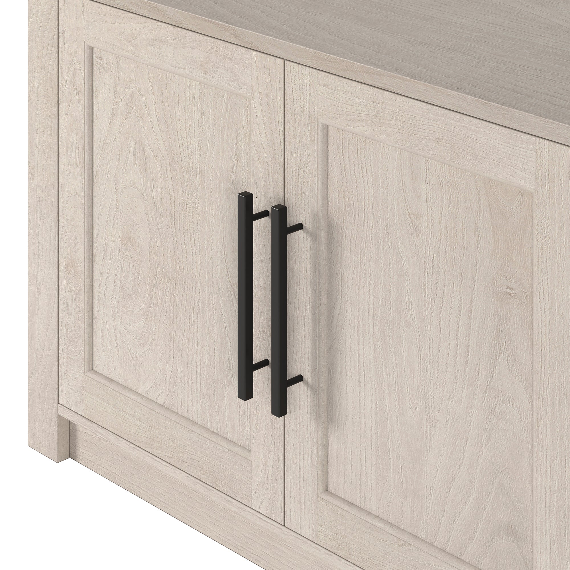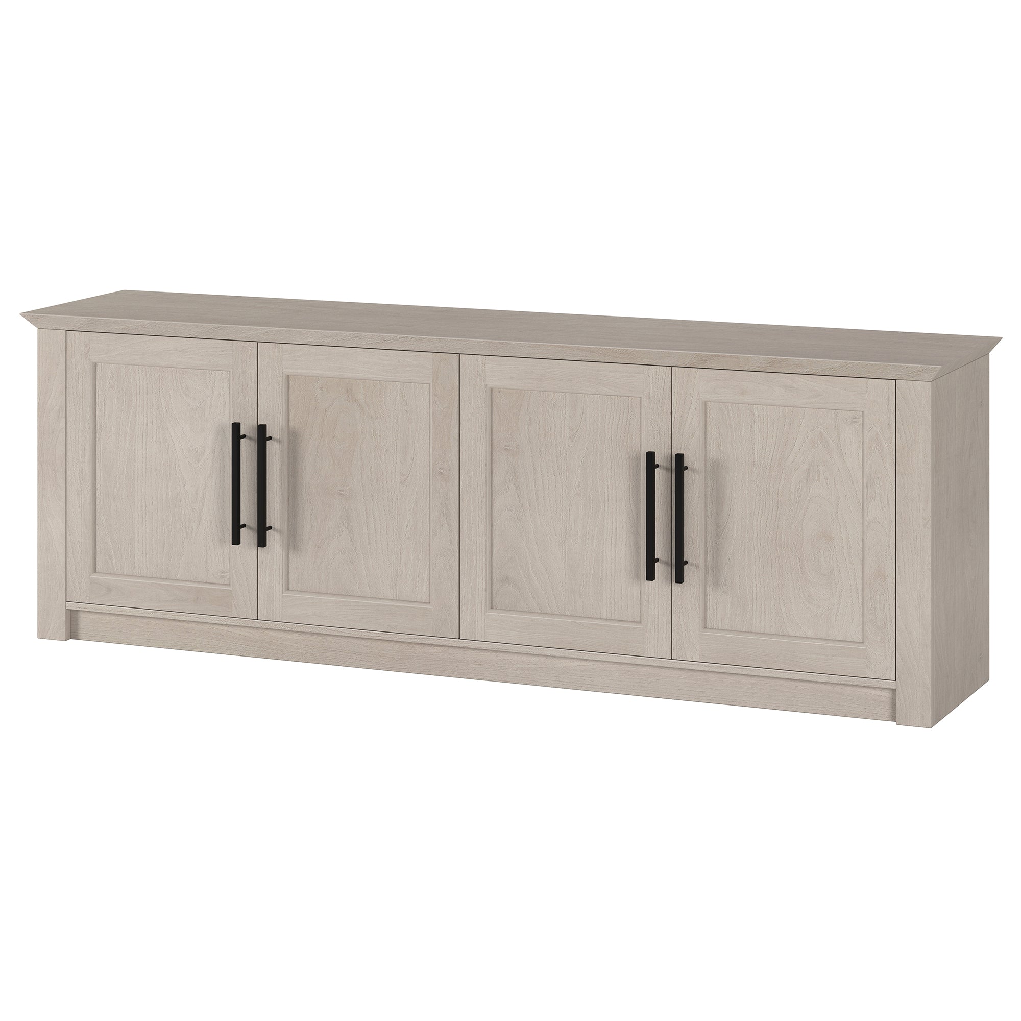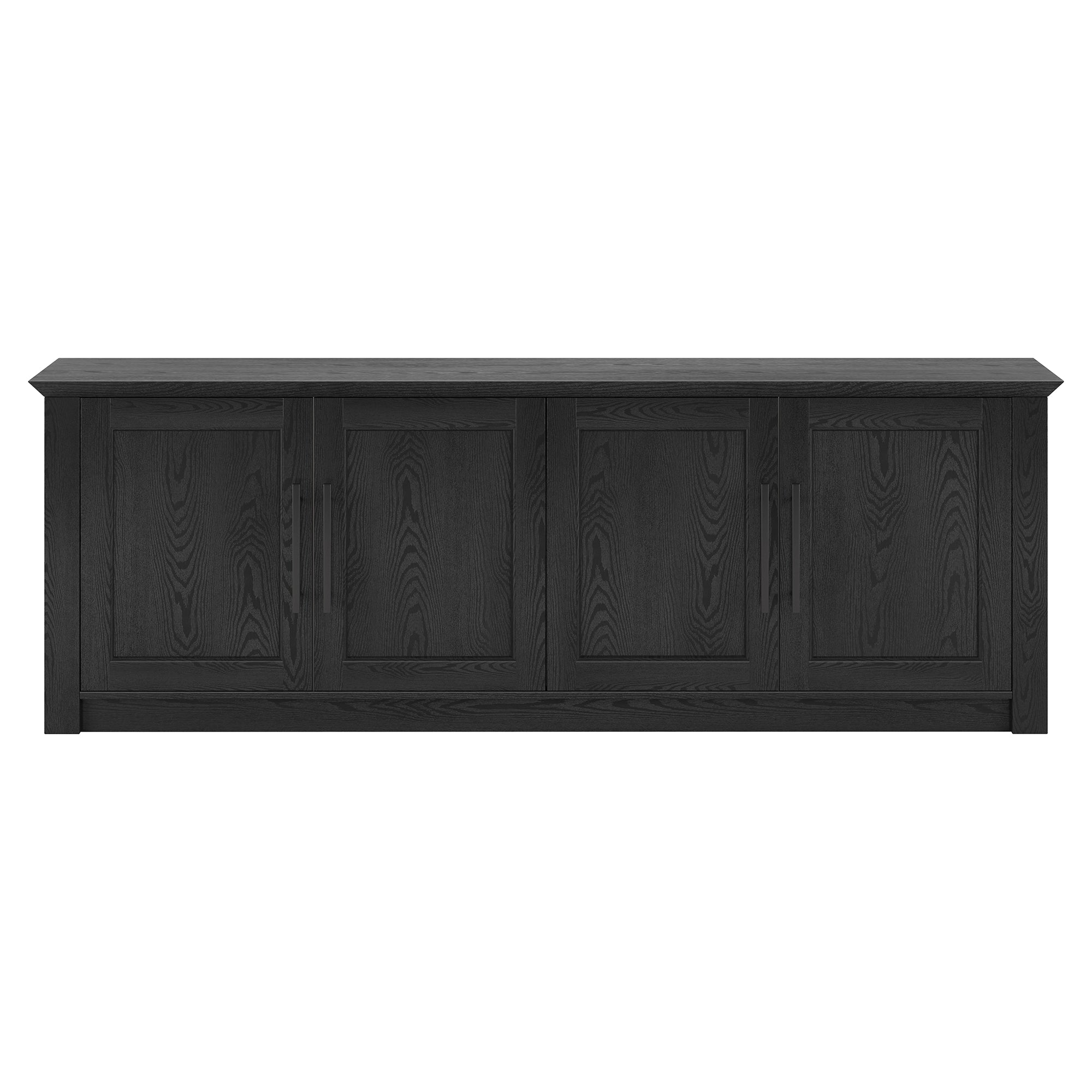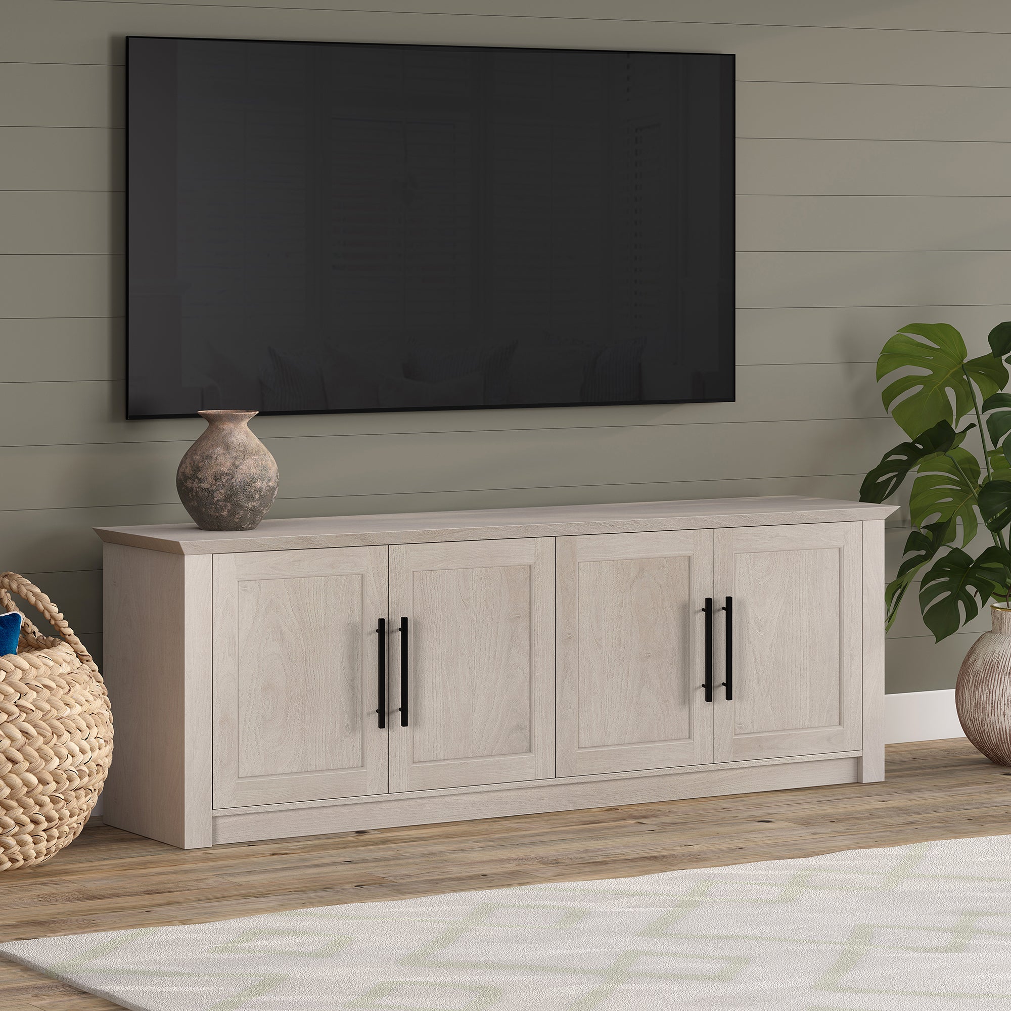 Updated farmhouse style gets a modern edge with this 70" TV stand. With a wood grain finish and sleek black hardware, this piece will blend seamlessly into any color scheme. The console features 4 fully enclosed doors with adjustable inner shelves and cable management cutouts, allowing for ample storage for your devices, games, books, and more. A must-have for living areas and entertainment spaces, this TV stand sets the stage for the big game, a movie marathon, or that season finale everyone’s been talking about.