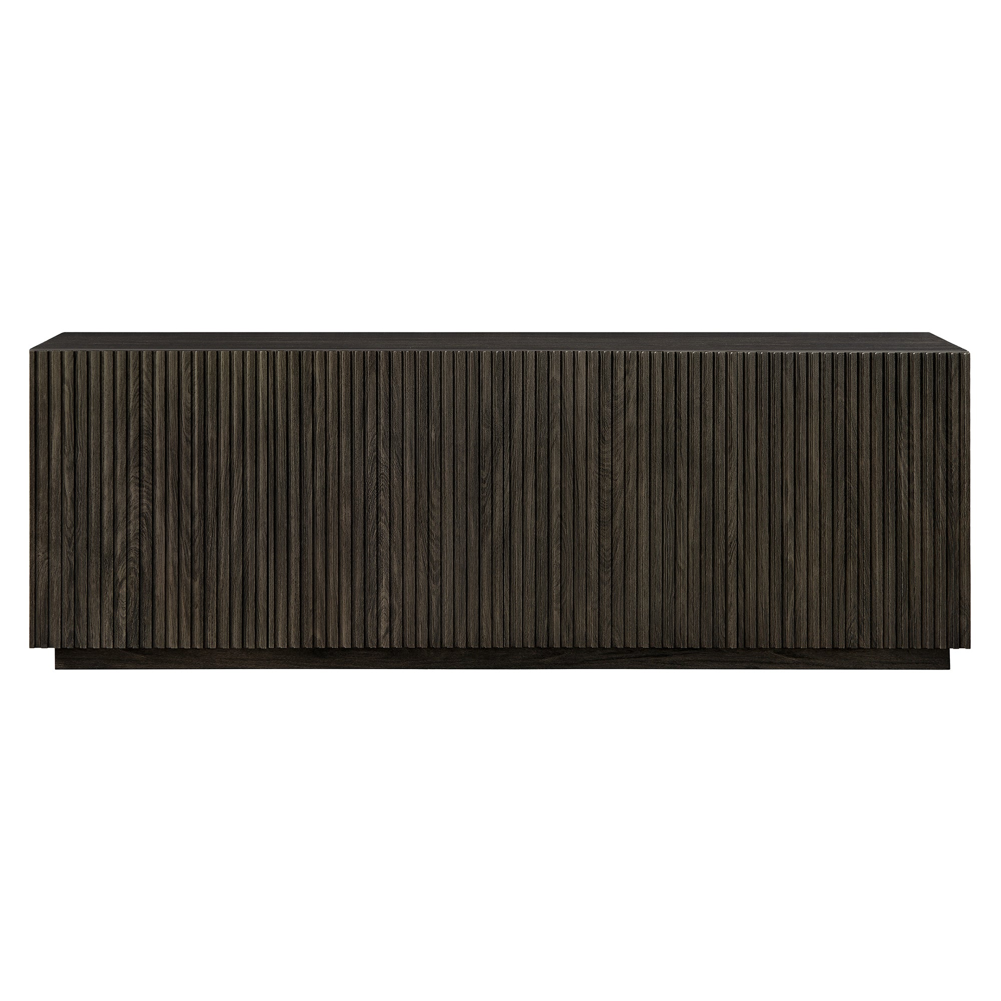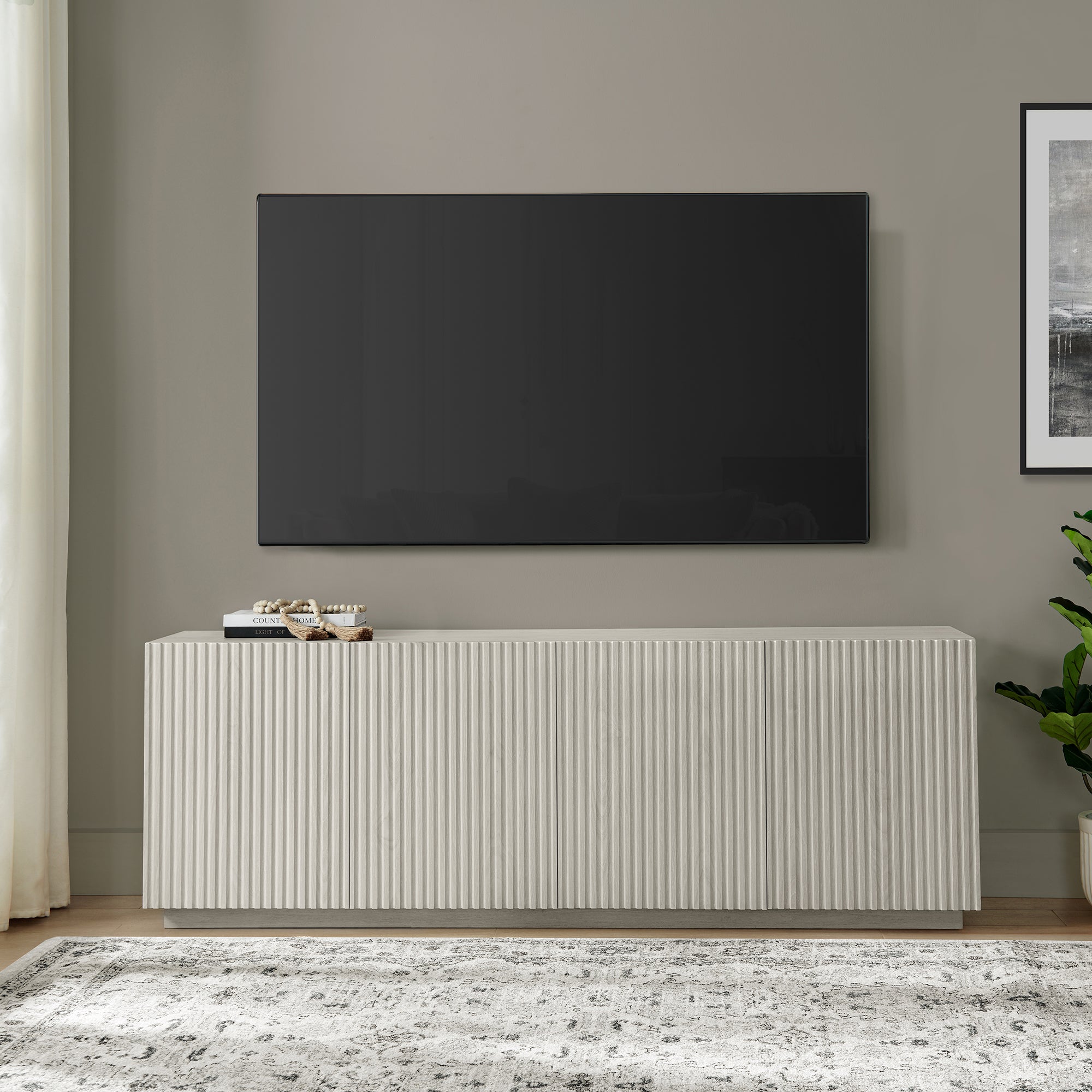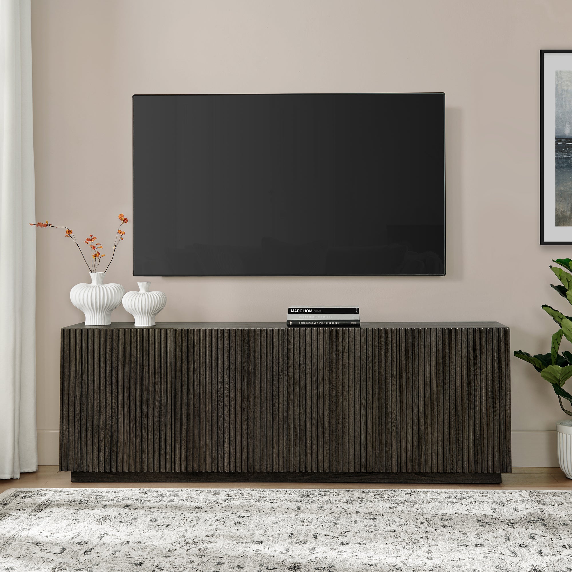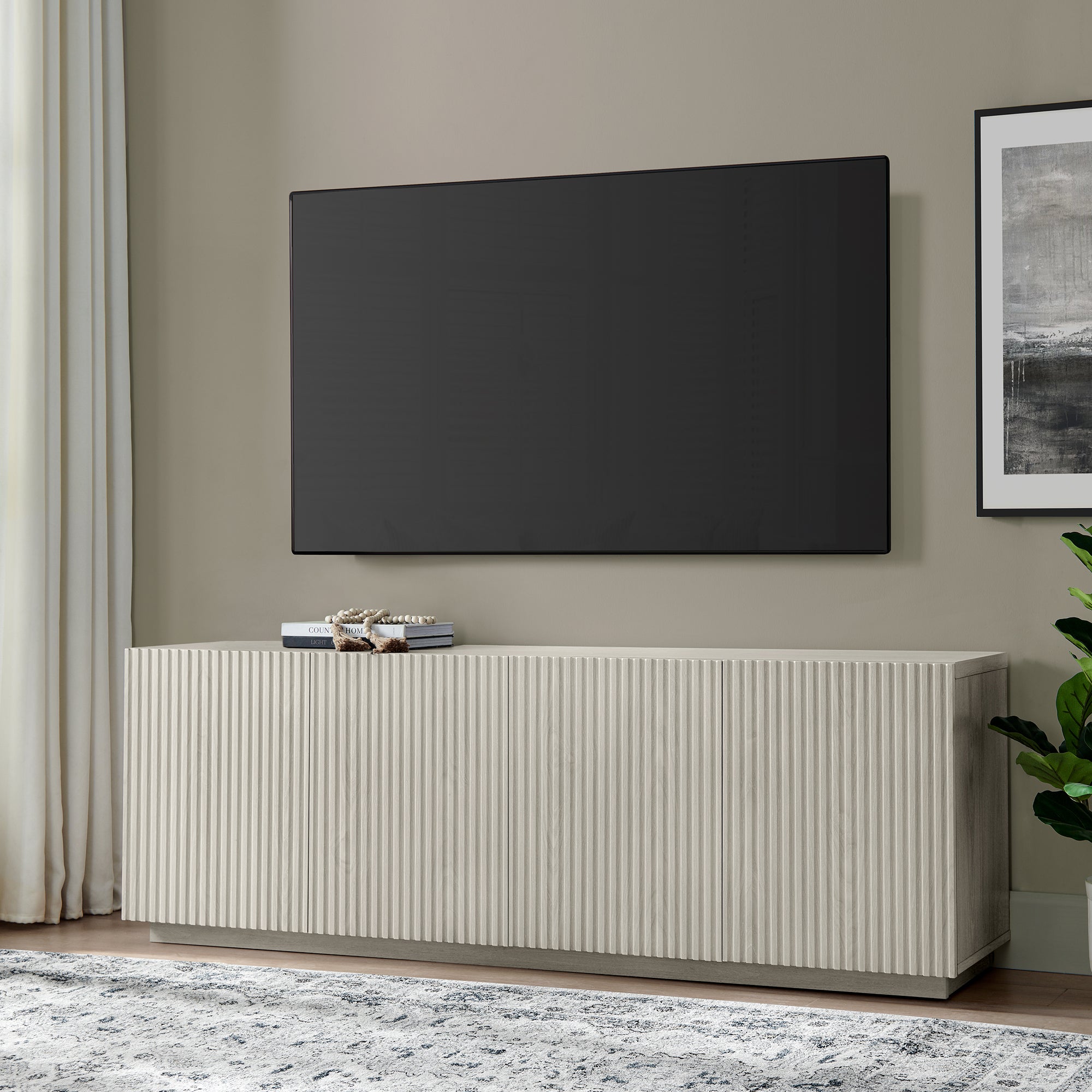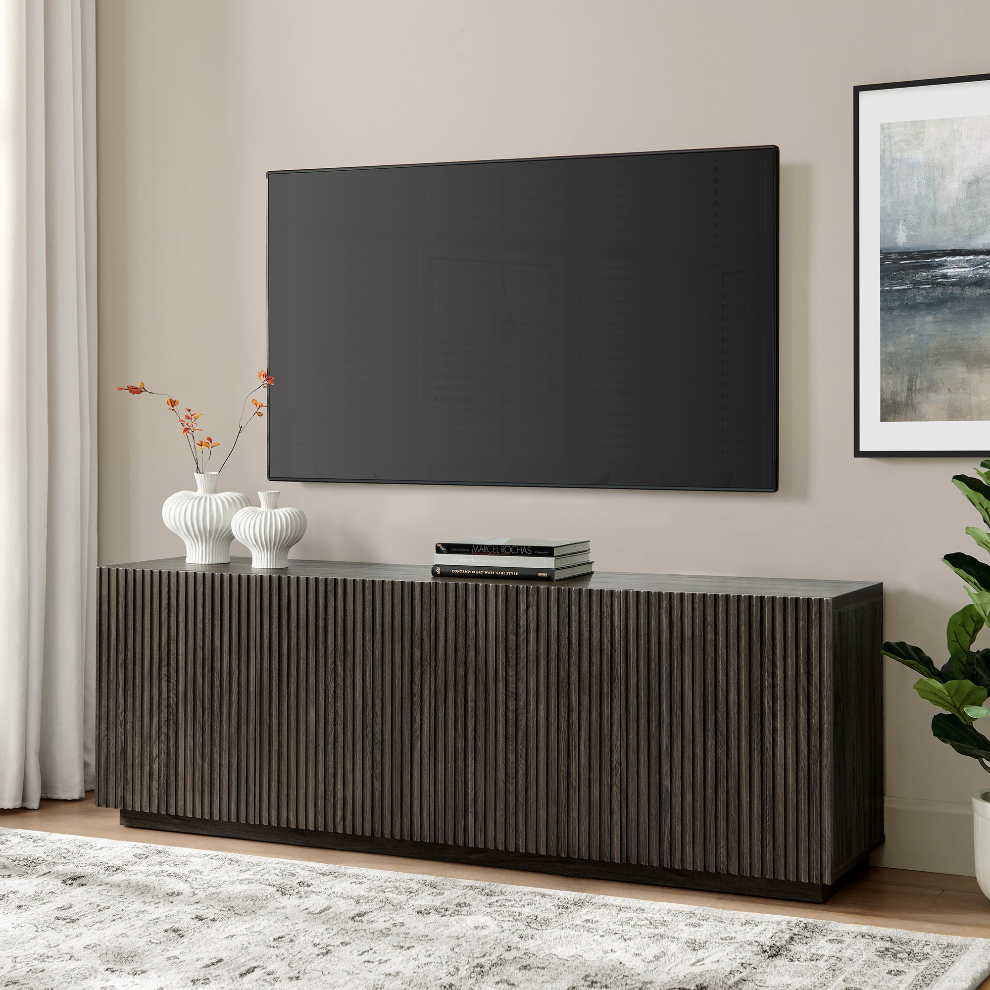 On-trend texture and design combine in this transitional TV stand. With a wood grain finish and vertical fluted doors, this piece is sure to be a statement in your living room, den, or game room. The plinth base gives an illusion of a seamless transition from your floor, while the banded texture adds visual interest. The console features 4 doors behind which you'll find adjustable inner shelves and cable management cutouts, allowing for ample storage for your devices, games, books, and more.