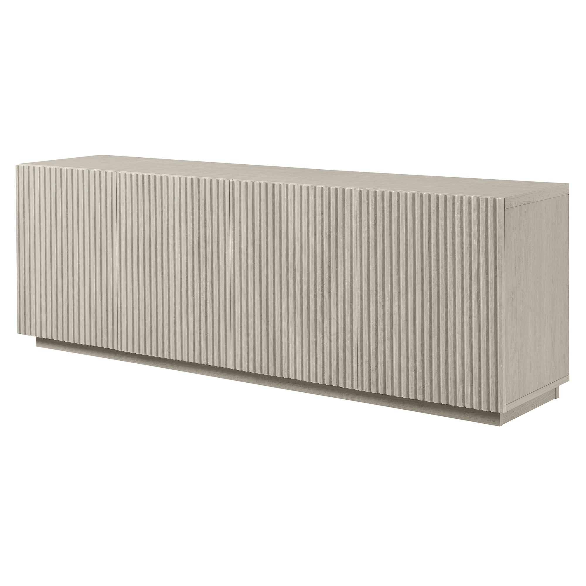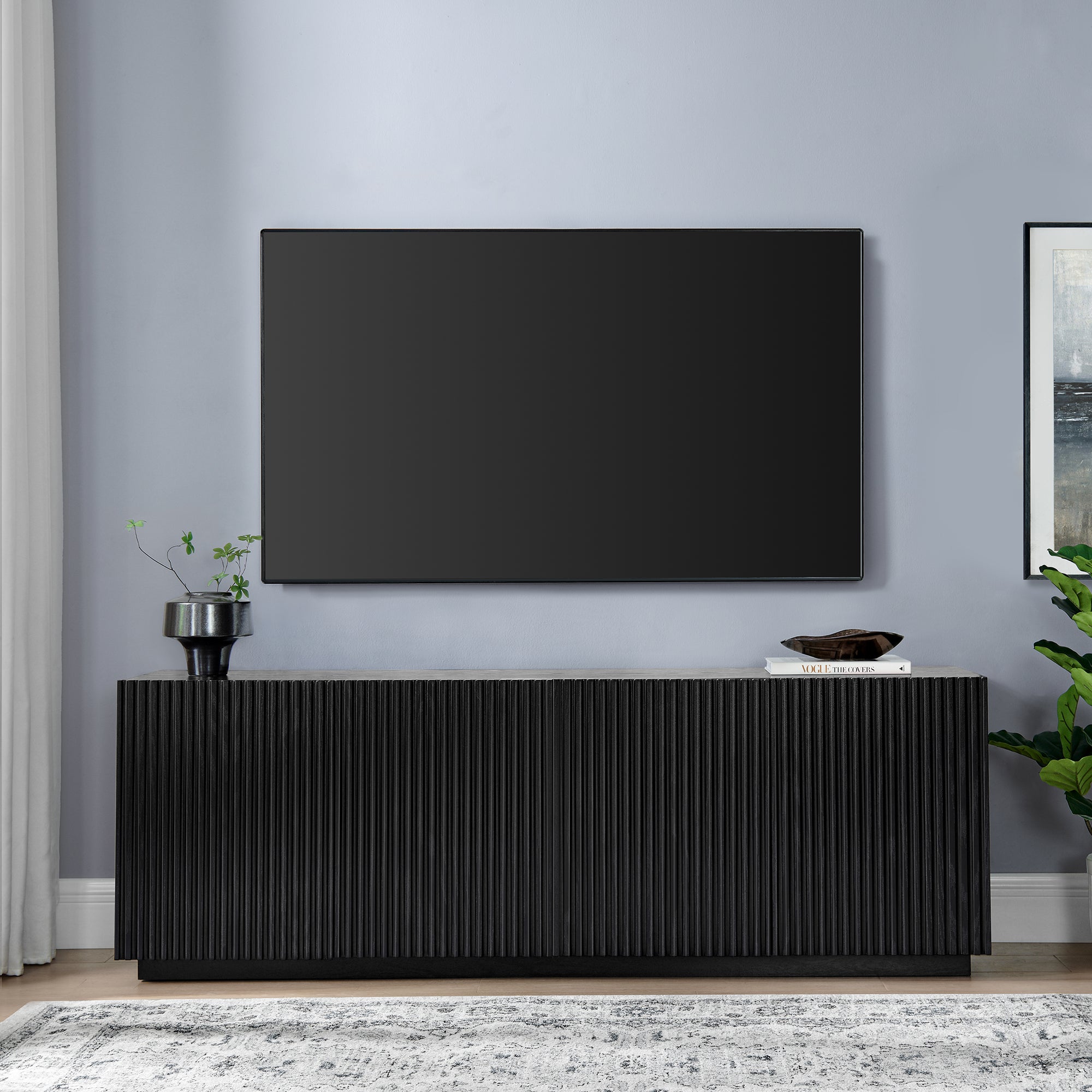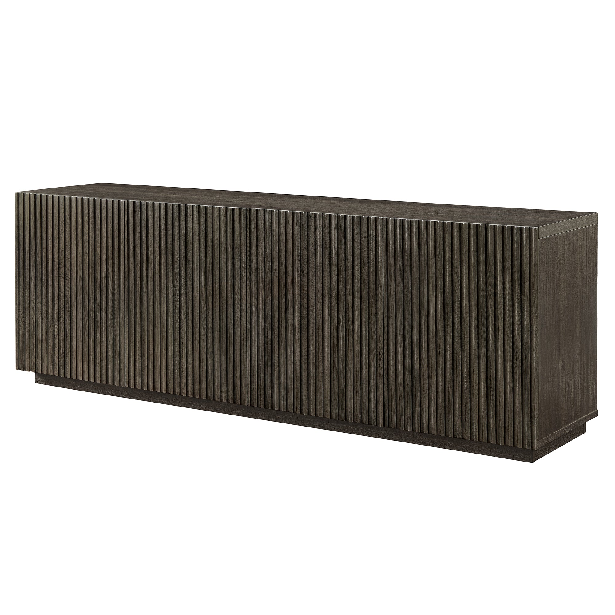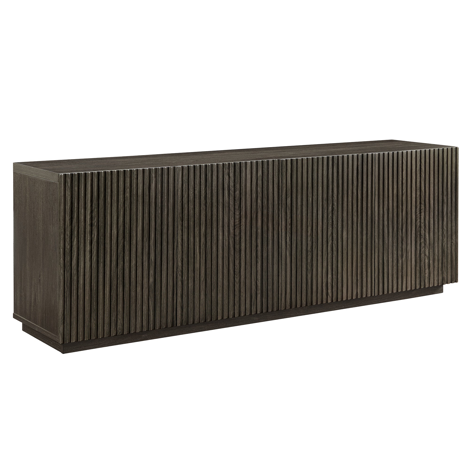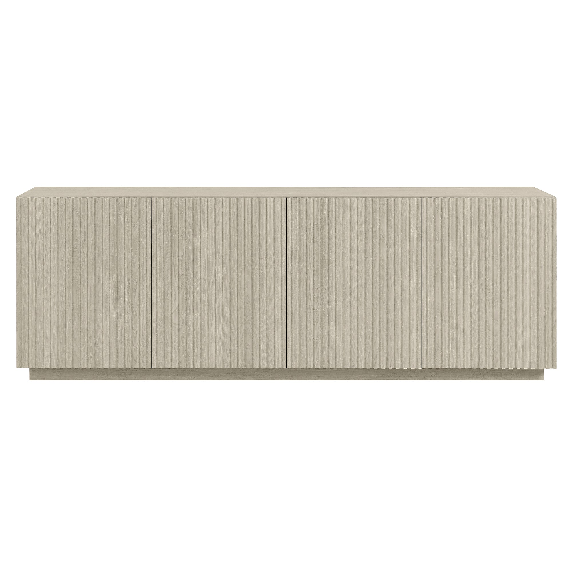 On-trend texture and design combine in this transitional TV stand. With a wood grain finish and vertical fluted doors, this piece is sure to be a statement in your living room, den, or game room. The plinth base gives an illusion of a seamless transition from your floor, while the banded texture adds visual interest. The console features 4 doors behind which you'll find adjustable inner shelves and cable management cutouts, allowing for ample storage for your devices, games, books, and more.