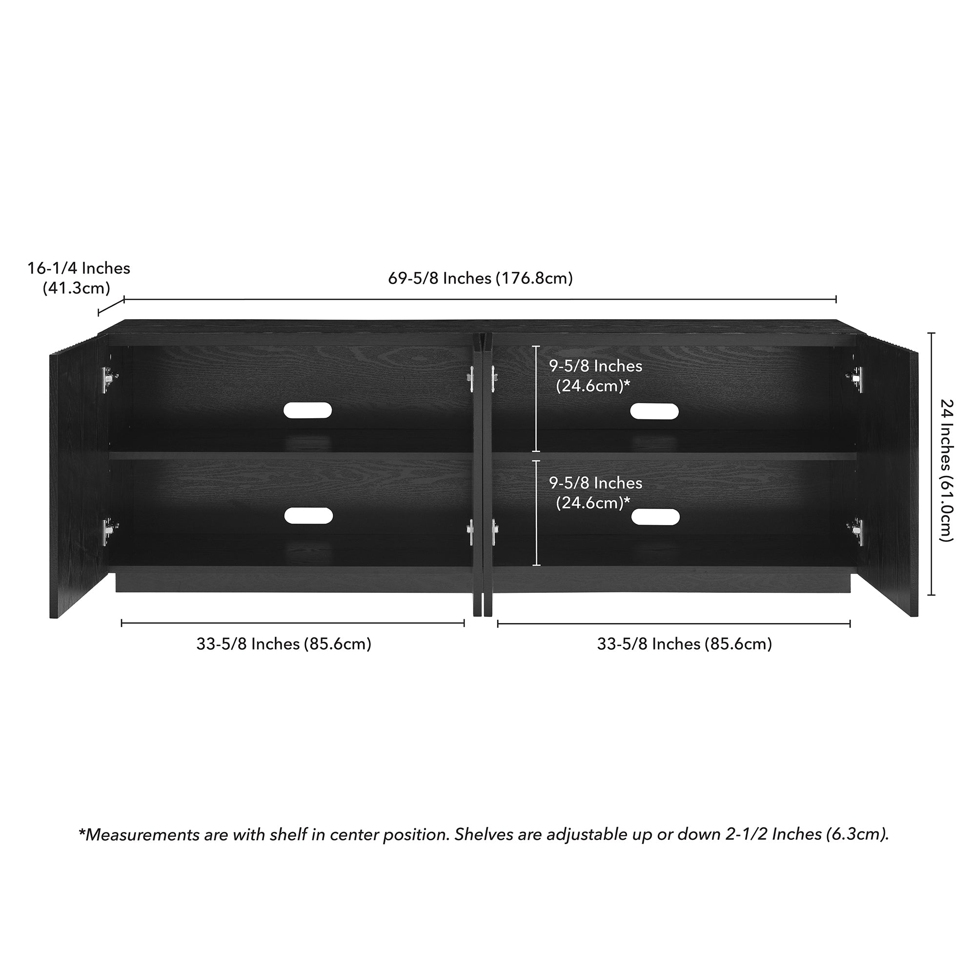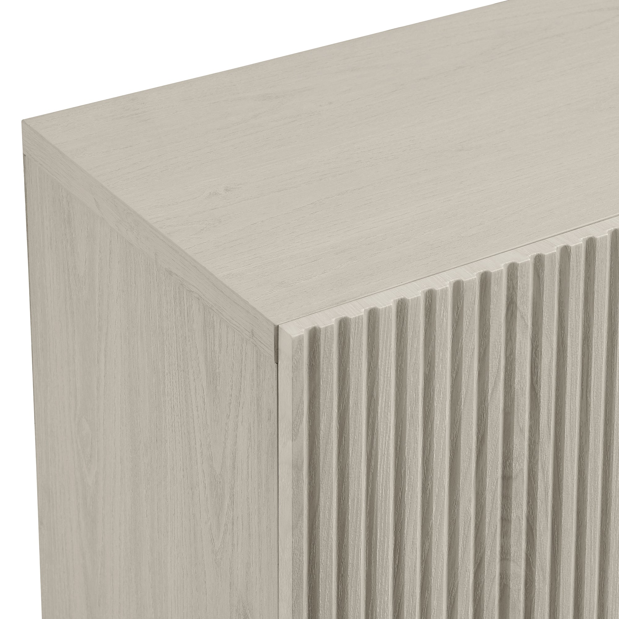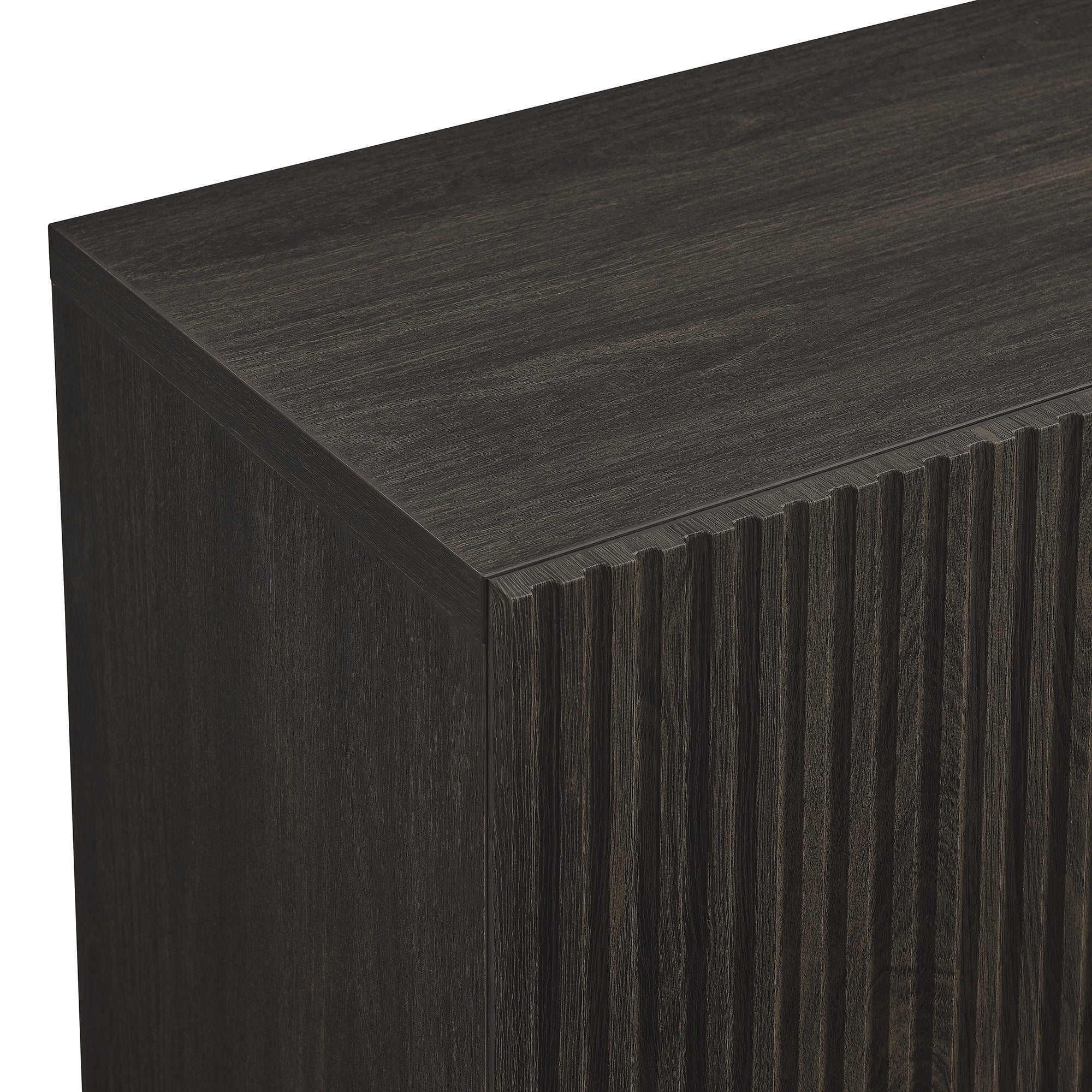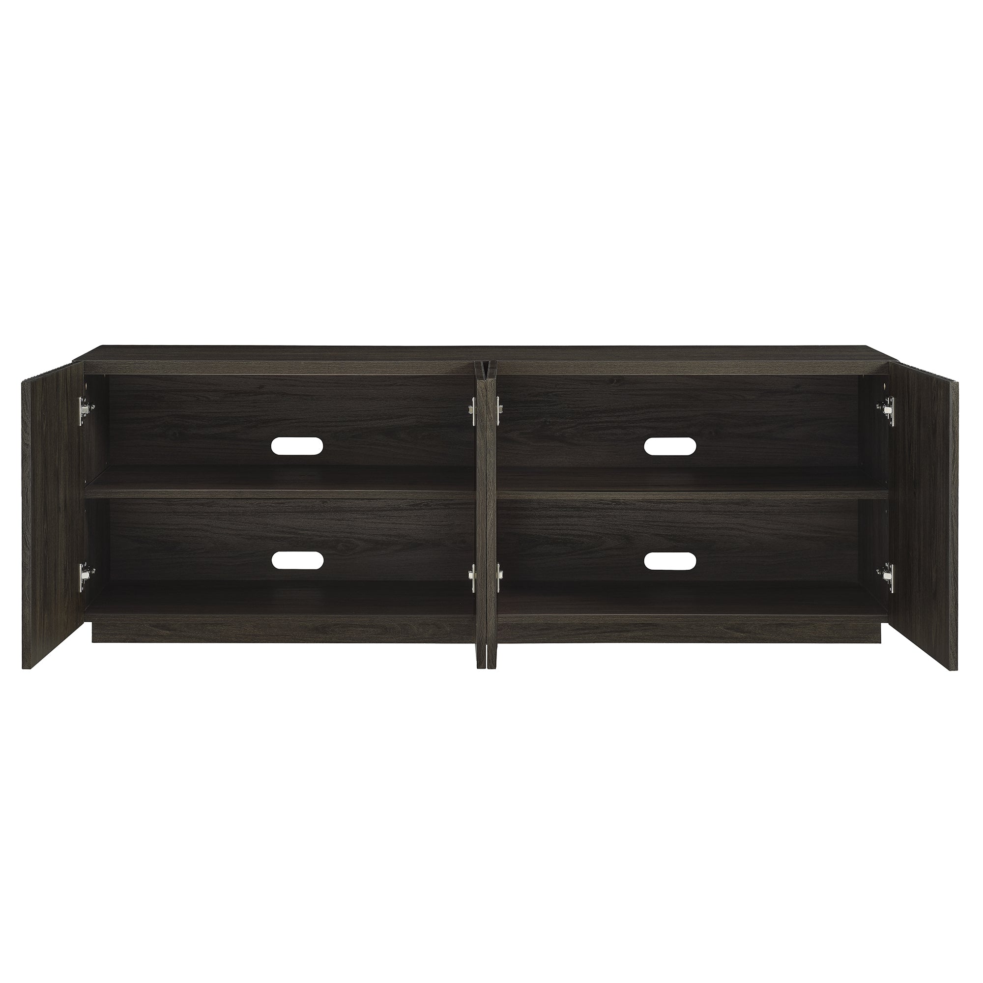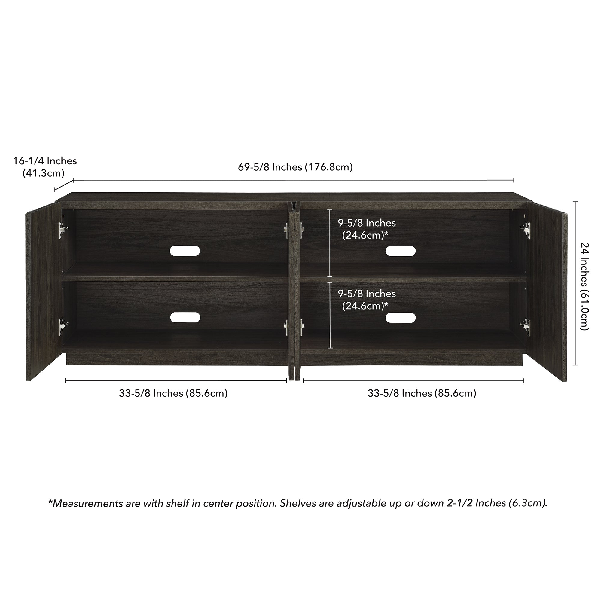 On-trend texture and design combine in this transitional TV stand. With a wood grain finish and vertical fluted doors, this piece is sure to be a statement in your living room, den, or game room. The plinth base gives an illusion of a seamless transition from your floor, while the banded texture adds visual interest. The console features 4 doors behind which you'll find adjustable inner shelves and cable management cutouts, allowing for ample storage for your devices, games, books, and more.