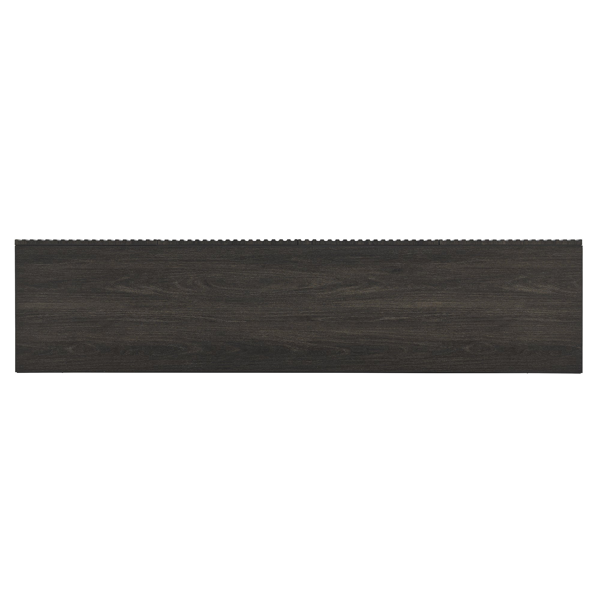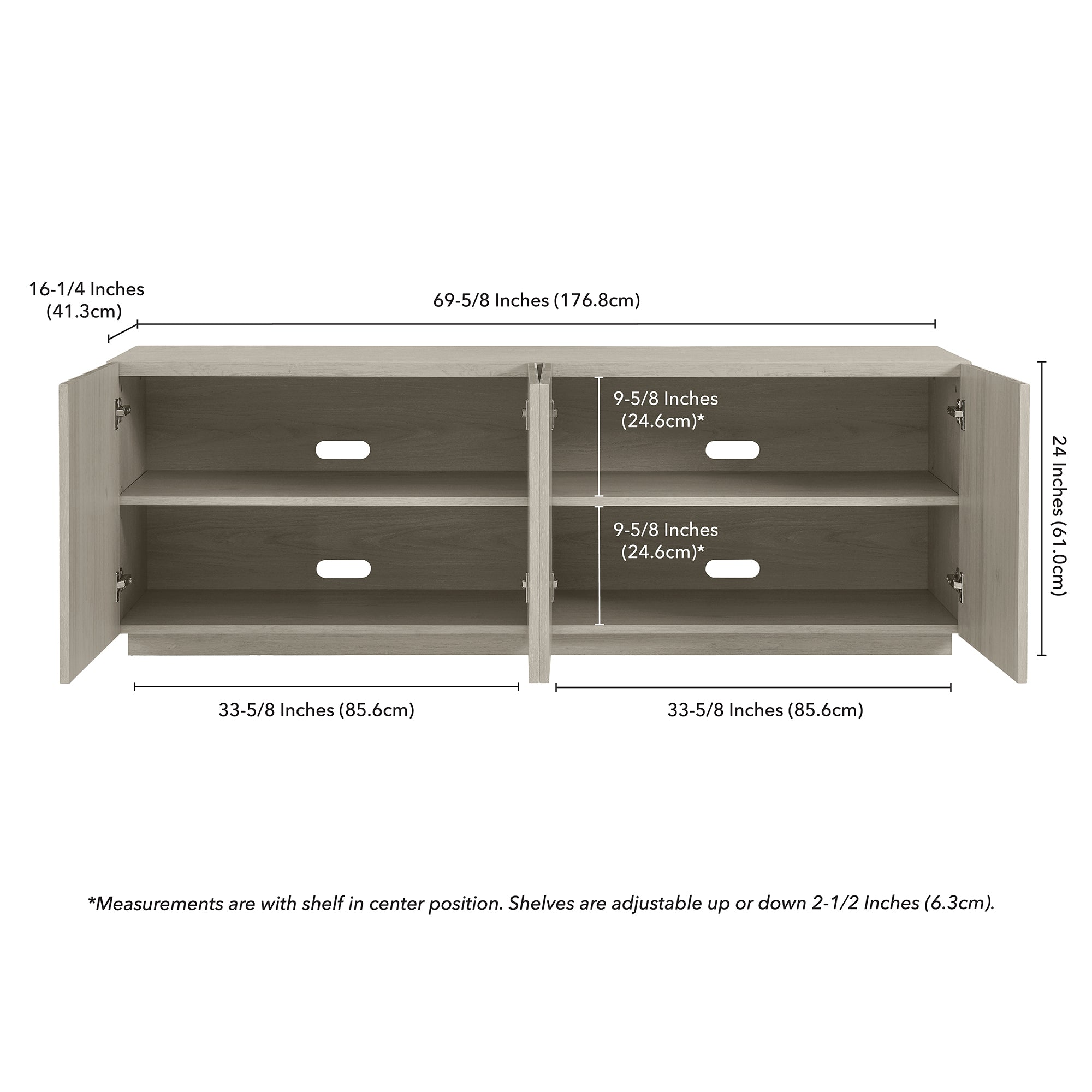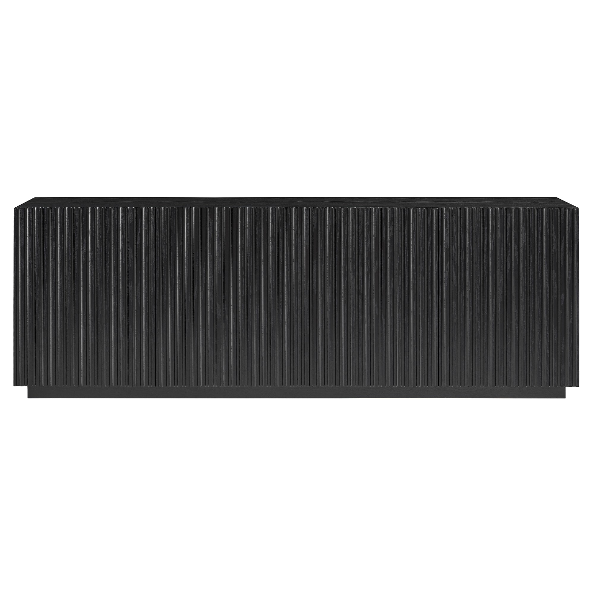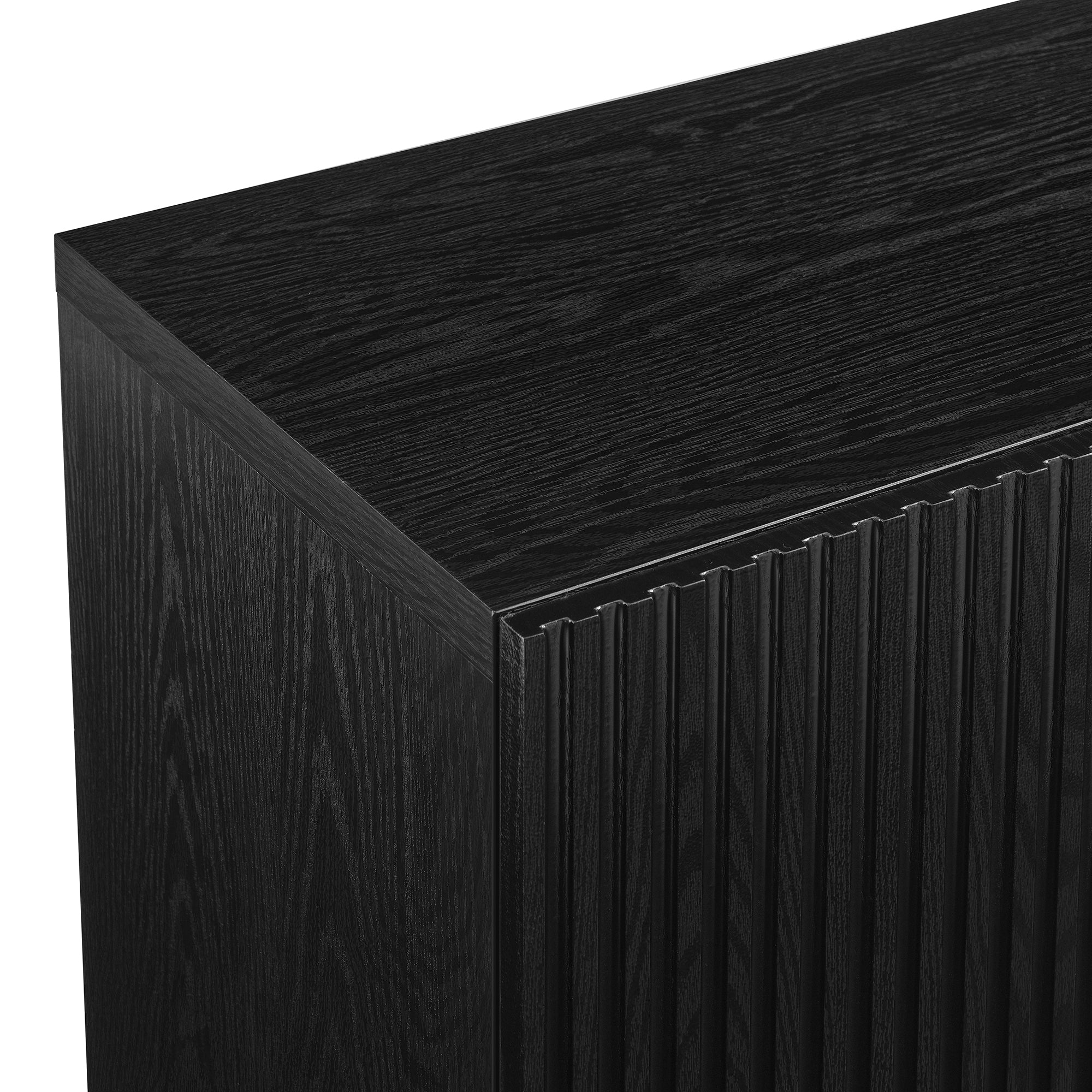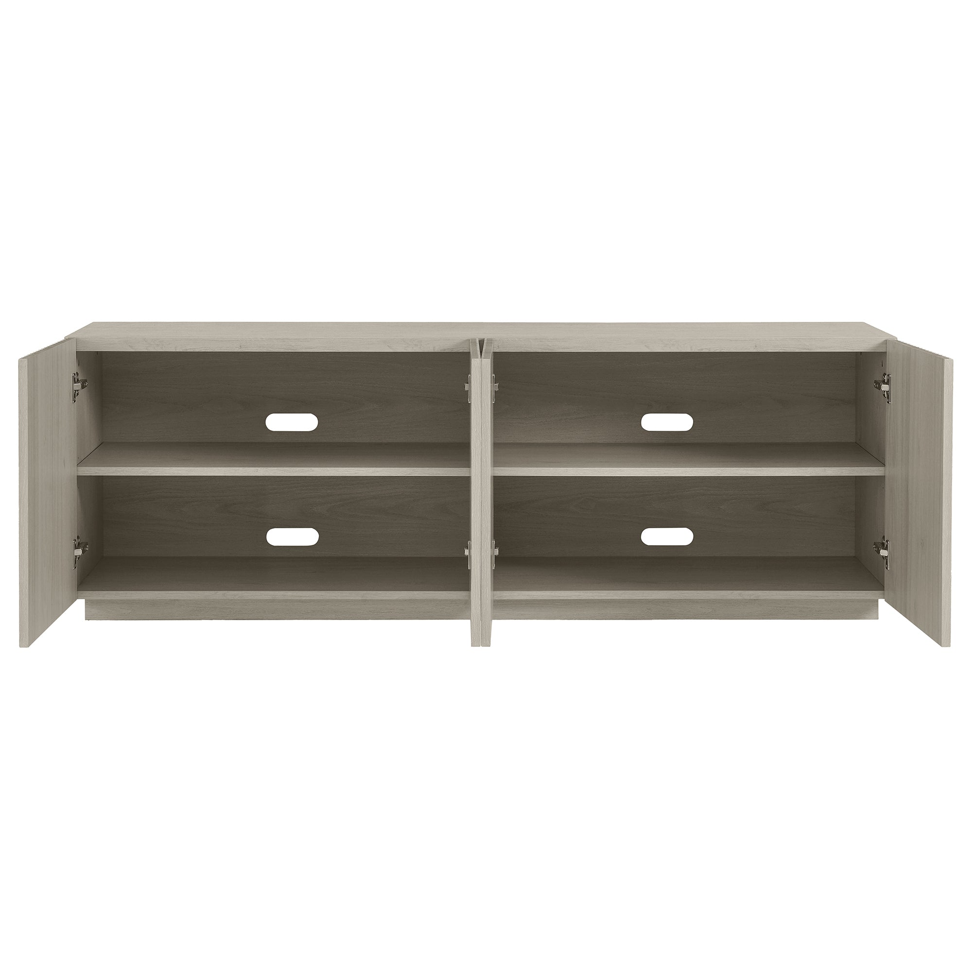 On-trend texture and design combine in this transitional TV stand. With a wood grain finish and vertical fluted doors, this piece is sure to be a statement in your living room, den, or game room. The plinth base gives an illusion of a seamless transition from your floor, while the banded texture adds visual interest. The console features 4 doors behind which you'll find adjustable inner shelves and cable management cutouts, allowing for ample storage for your devices, games, books, and more.