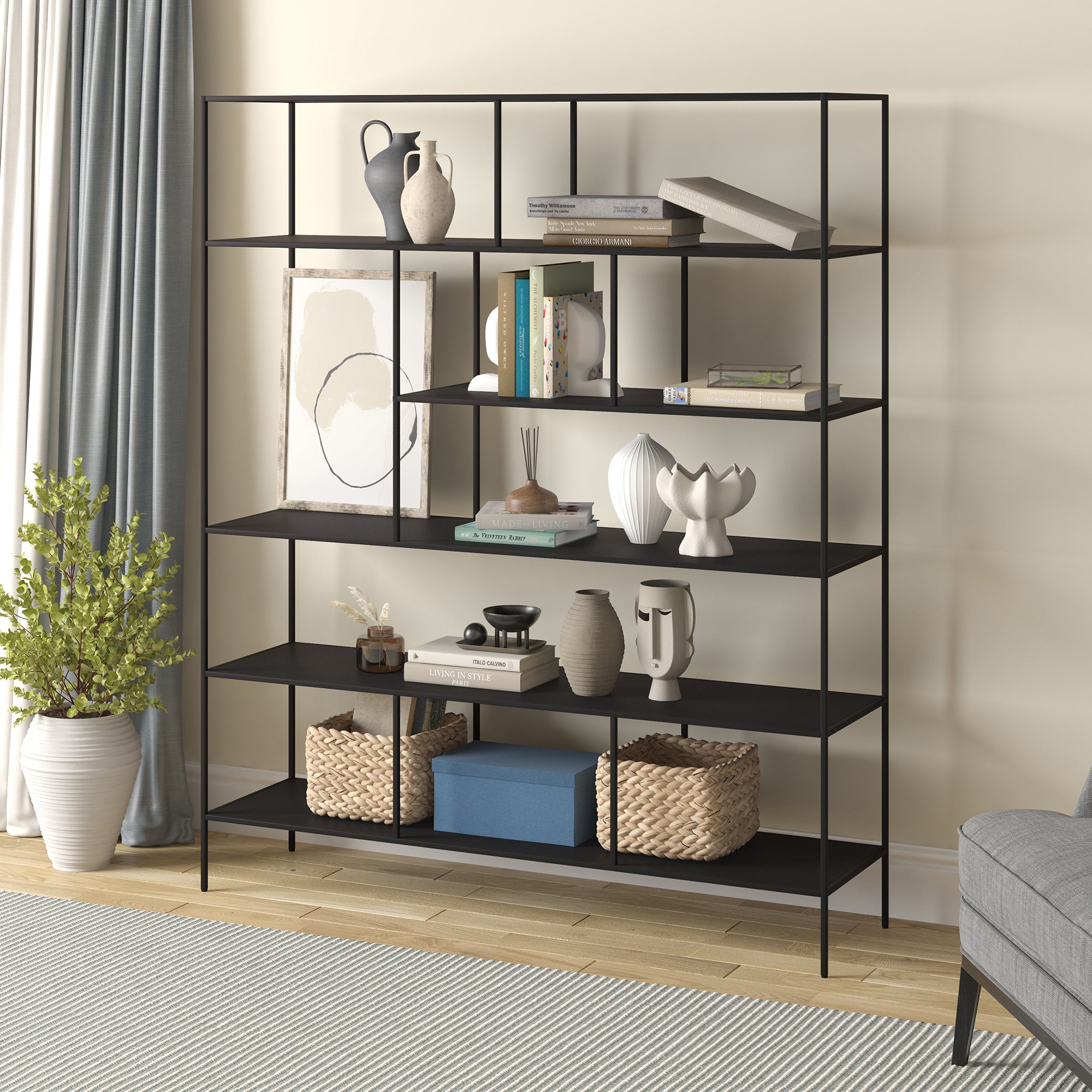 Showcase your favorite books and decorative items in this industrial-inspired 6-tier bookcase. Crafted from sturdy steel and finished in a classic blackened bronze color, it features staggered open shelves for flexible storage options. At 72" tall and 60" wide, there's plenty of space for your entire library. Includes adjustable feet and an anti-tip restraint kit for added stability and safety.