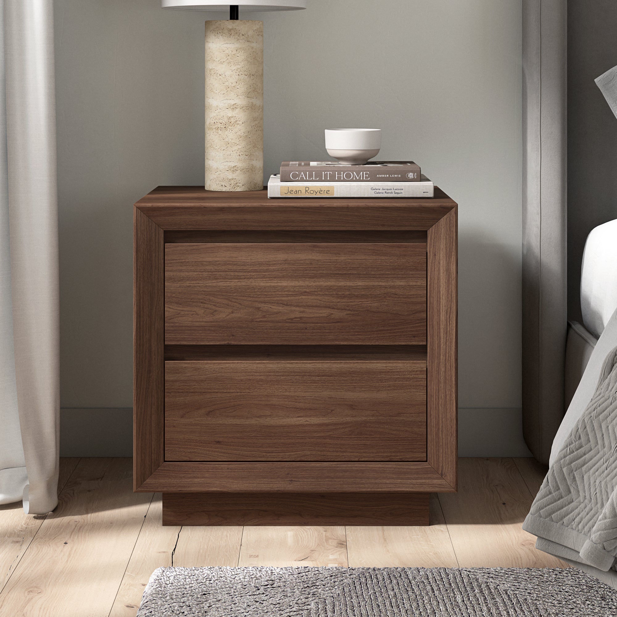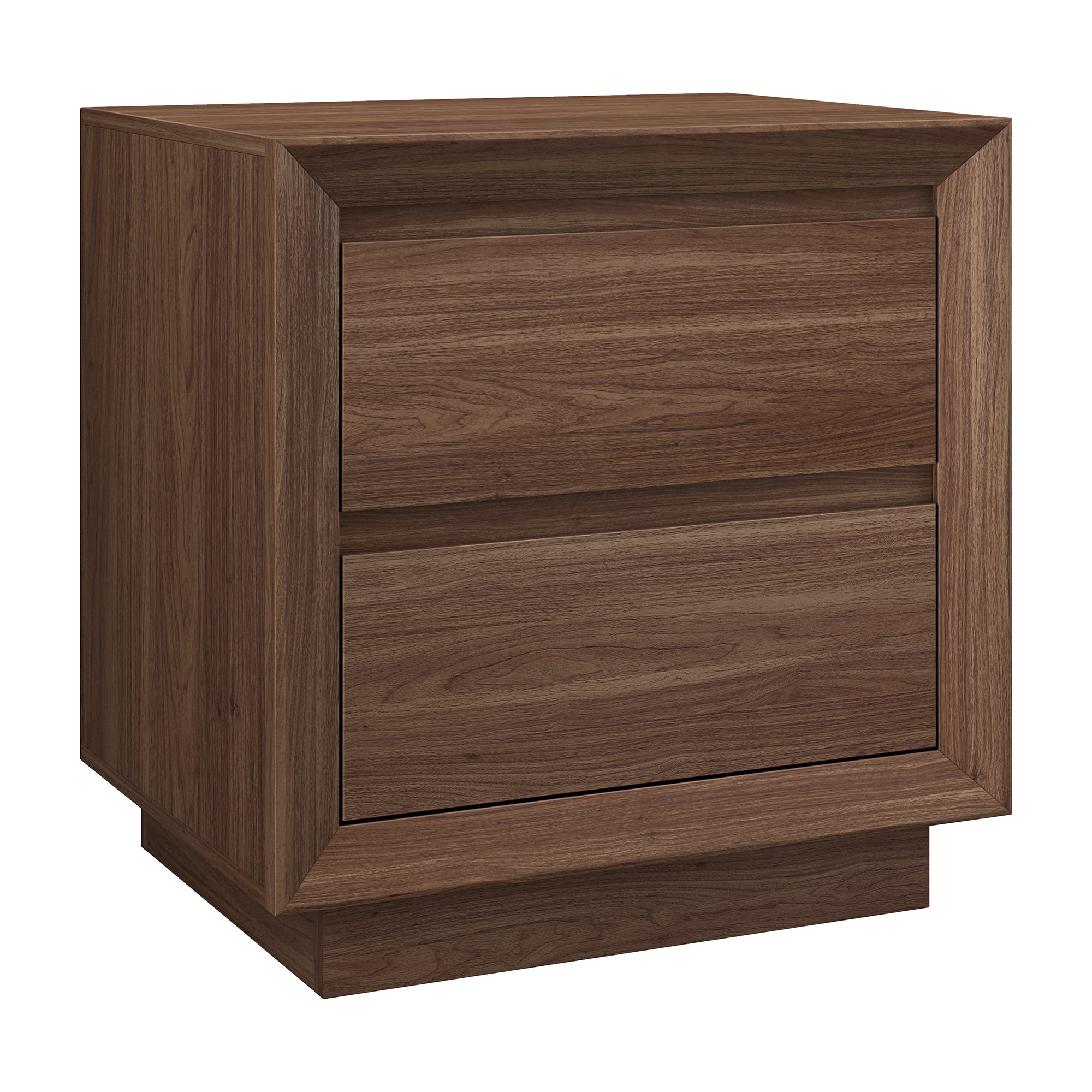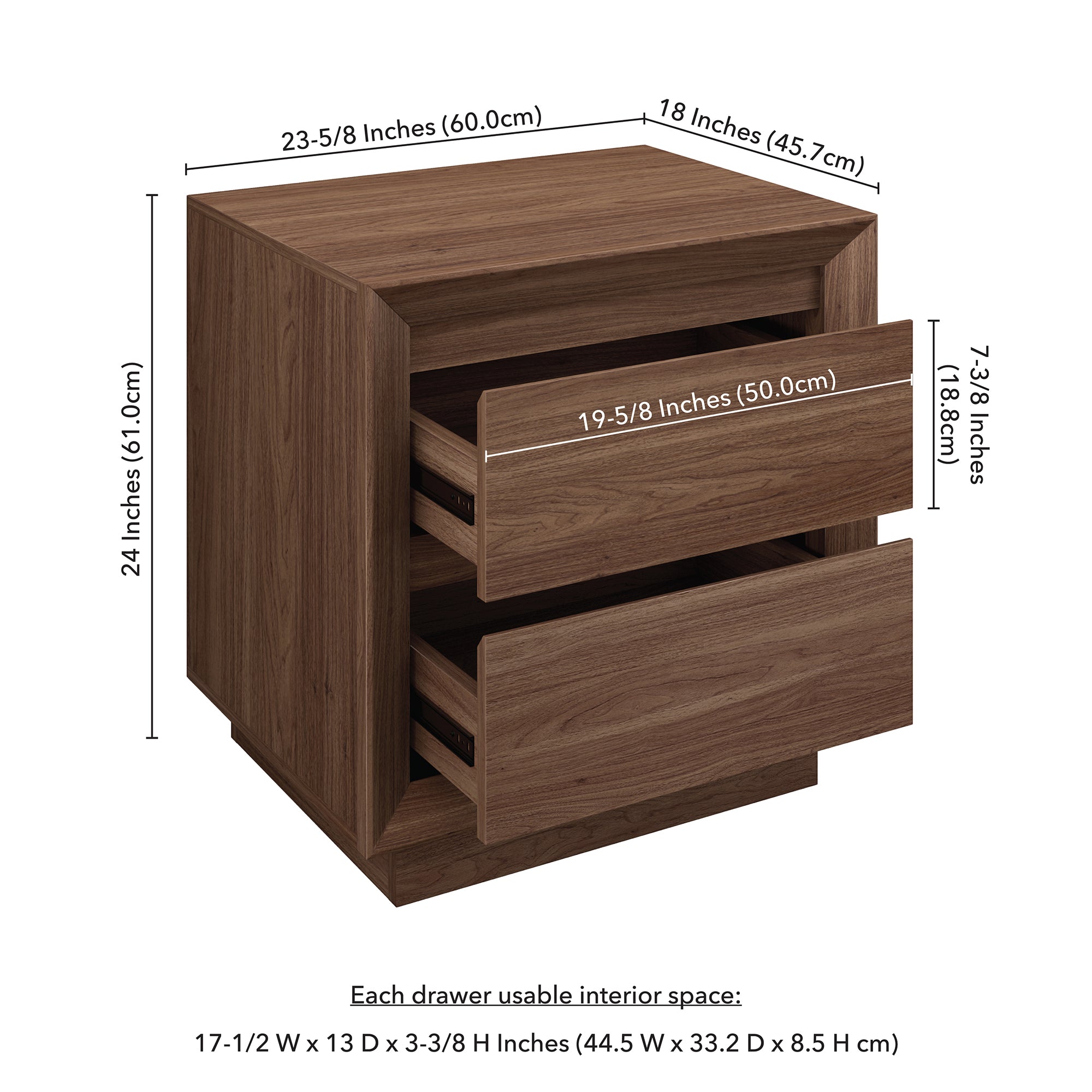 Cultivate on-trend modern style in your bedroom this 24" nightstand. A multipurpose piece that could fit right in your living room or game room space as a side table. This nightstand features two beveled-pull soft glide drawers for storage, inset within a beveled edge front panel. Both drawers features a smooth paneled doors with hand grips on the top edge. The plinth base anchors the look, with a natural wood-look finish in multiple colors adding texture and tonal variation to your roomspace.