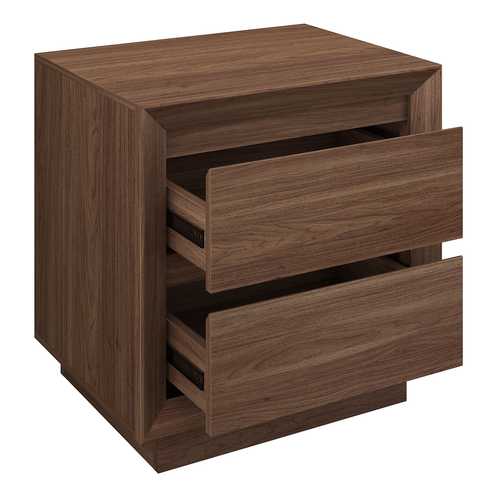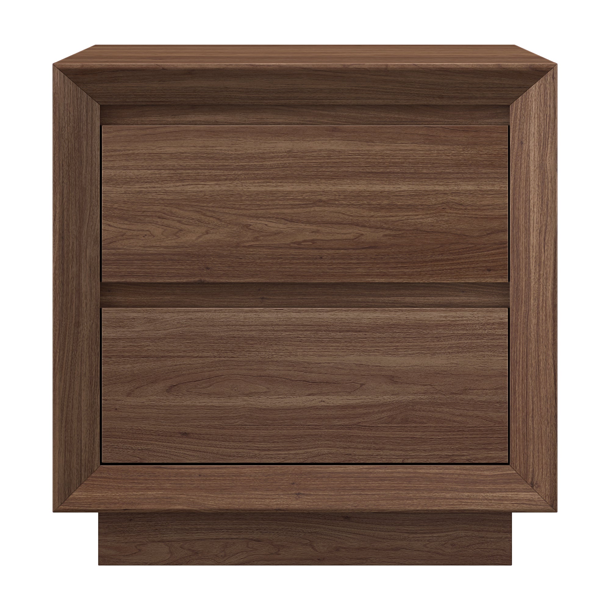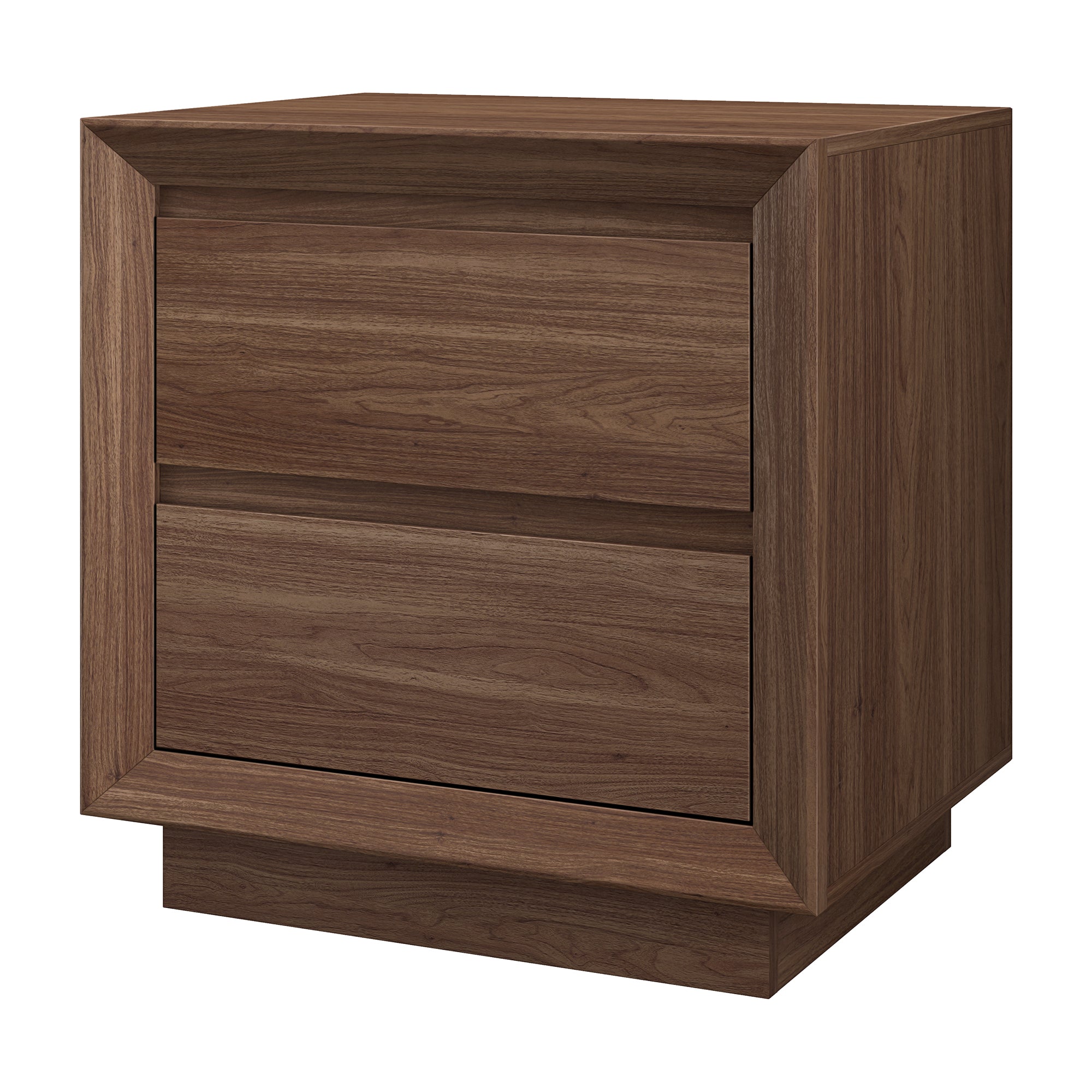 Cultivate on-trend modern style in your bedroom this 24" nightstand. A multipurpose piece that could fit right in your living room or game room space as a side table. This nightstand features two beveled-pull soft glide drawers for storage, inset within a beveled edge front panel. Both drawers features a smooth paneled doors with hand grips on the top edge. The plinth base anchors the look, with a natural wood-look finish in multiple colors adding texture and tonal variation to your roomspace.