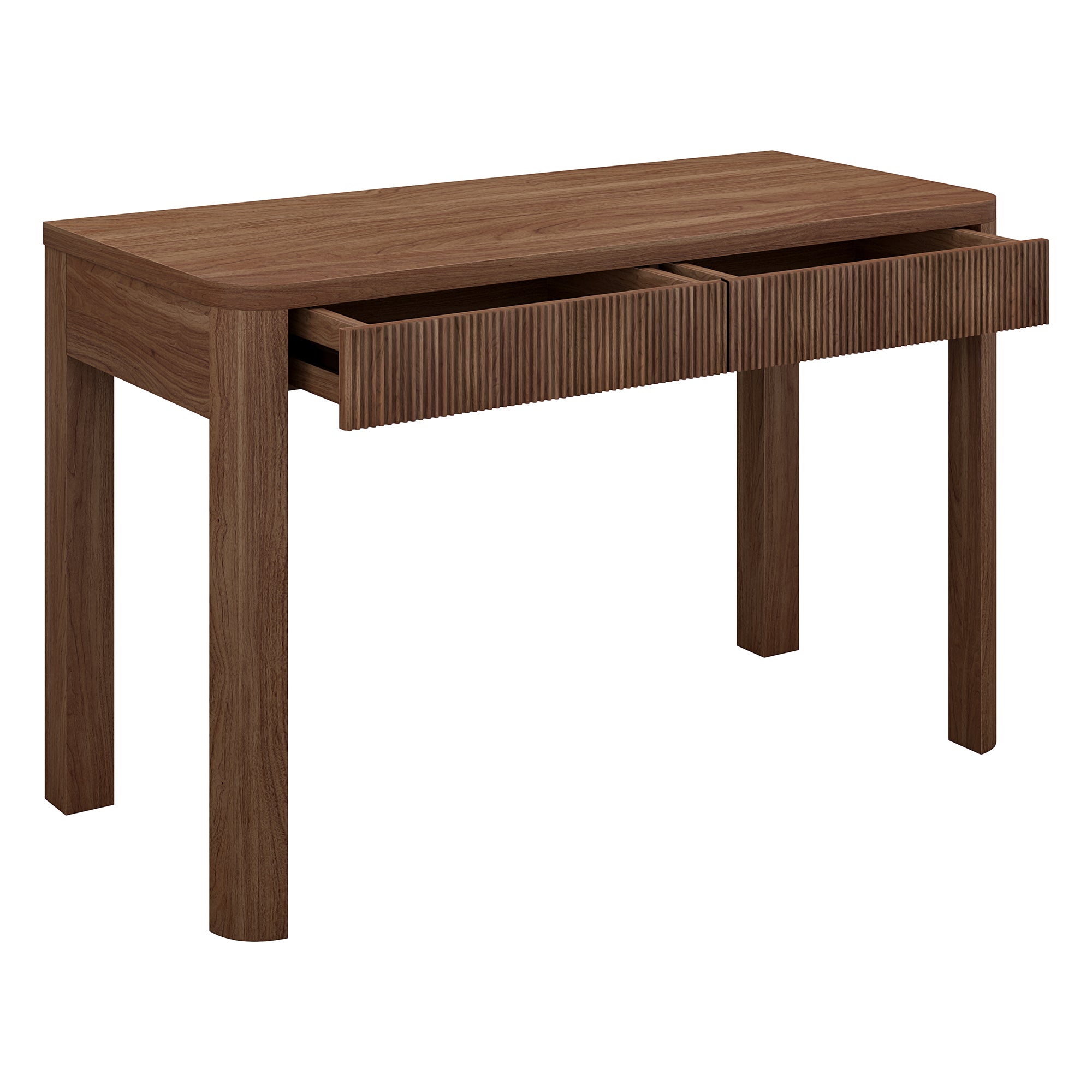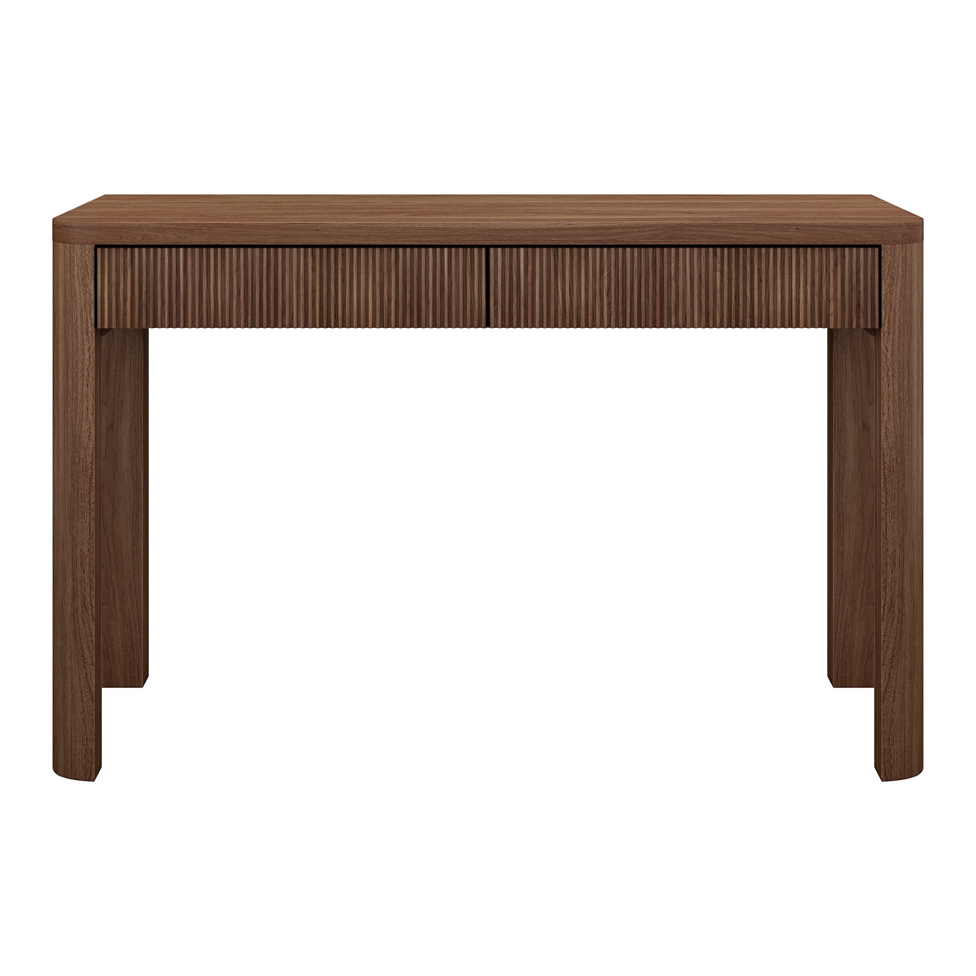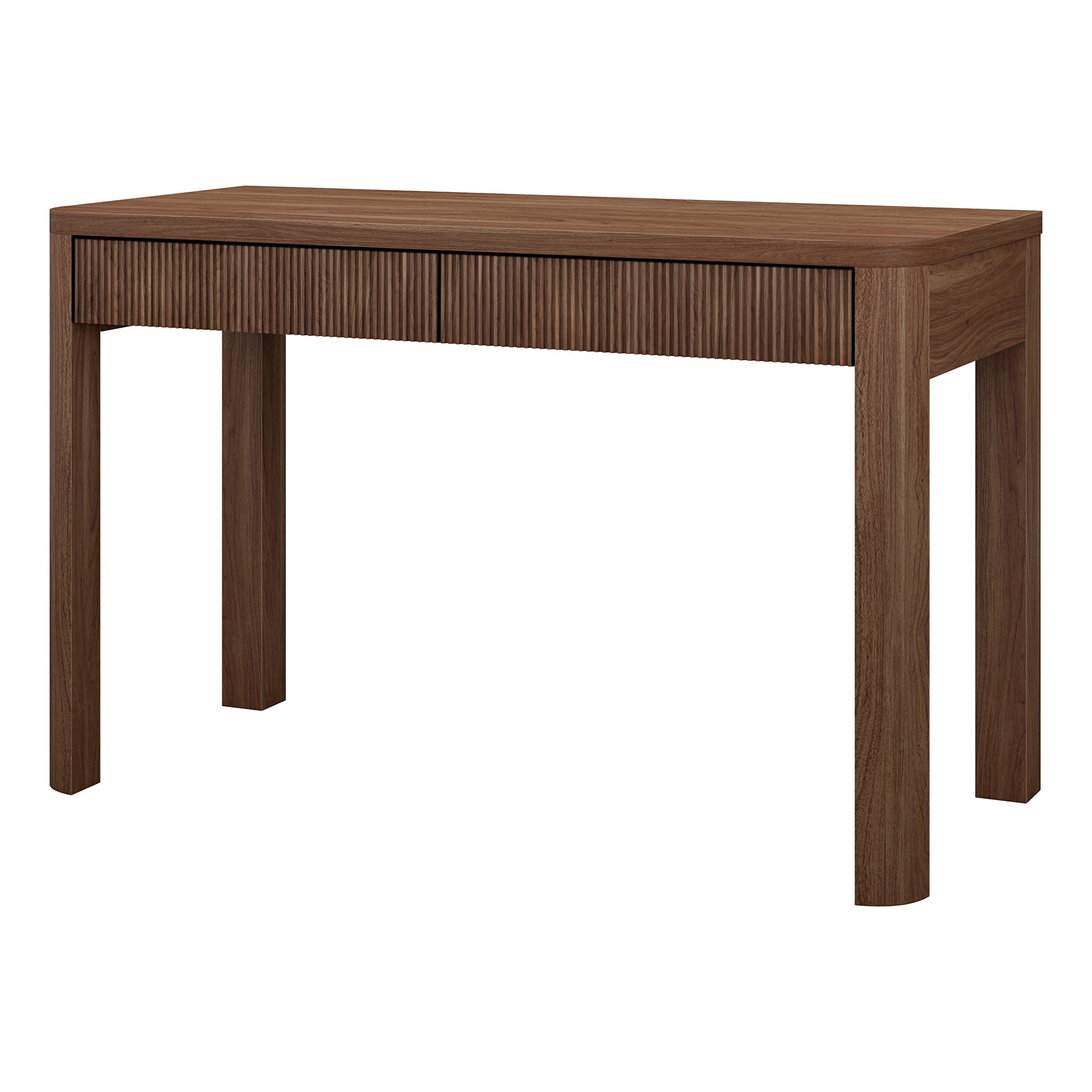 Cultivate on-trend modern style in your home office, game room, or vanity area with this 48" desk. The rounded-off legs create a soft, slightly retro shape, topped with a sturdy MDF desktop. This desk features two fluted soft-glide drawers for storage, while the open lower space provides plenty of room to settle in and take on the day. It’s time to work from home in style!