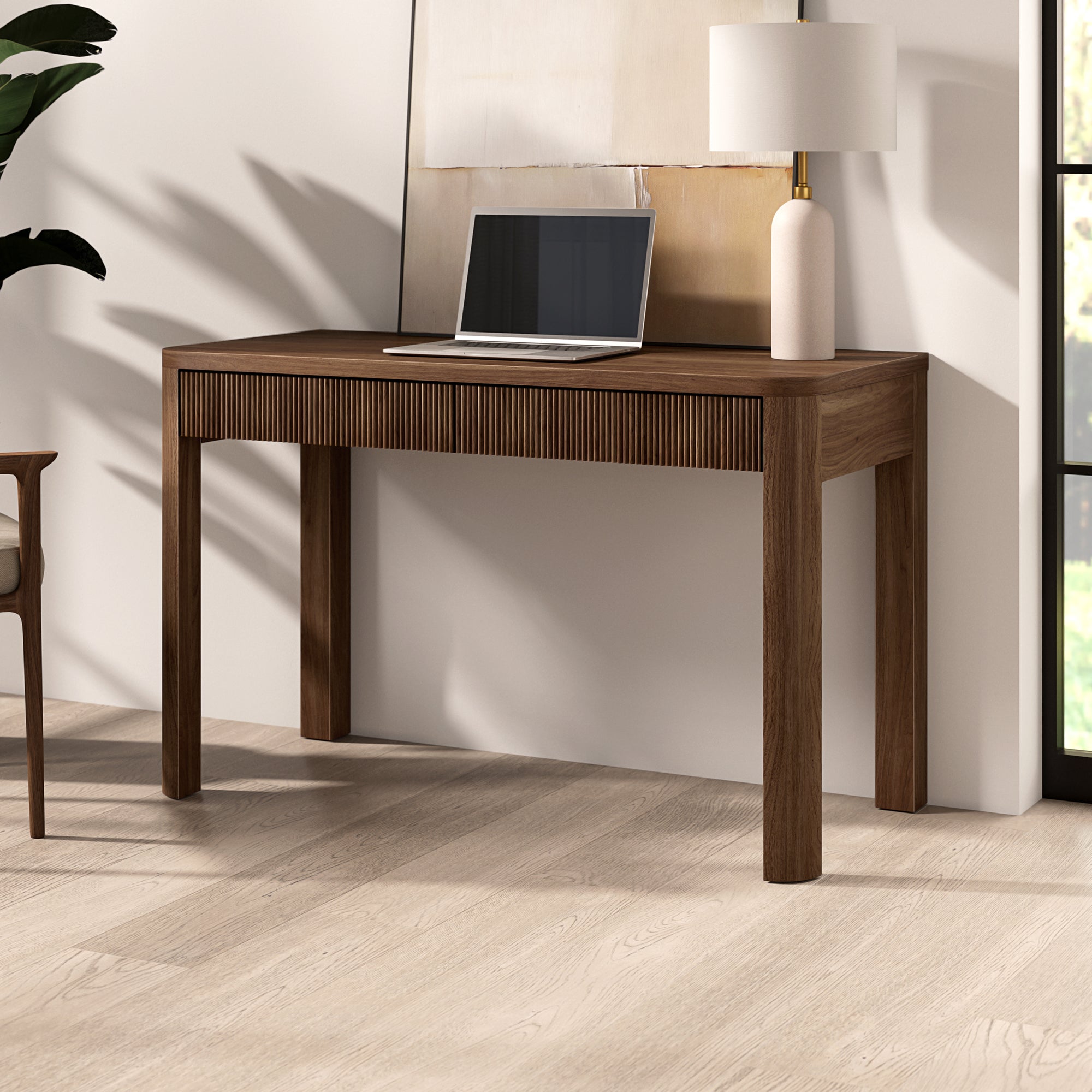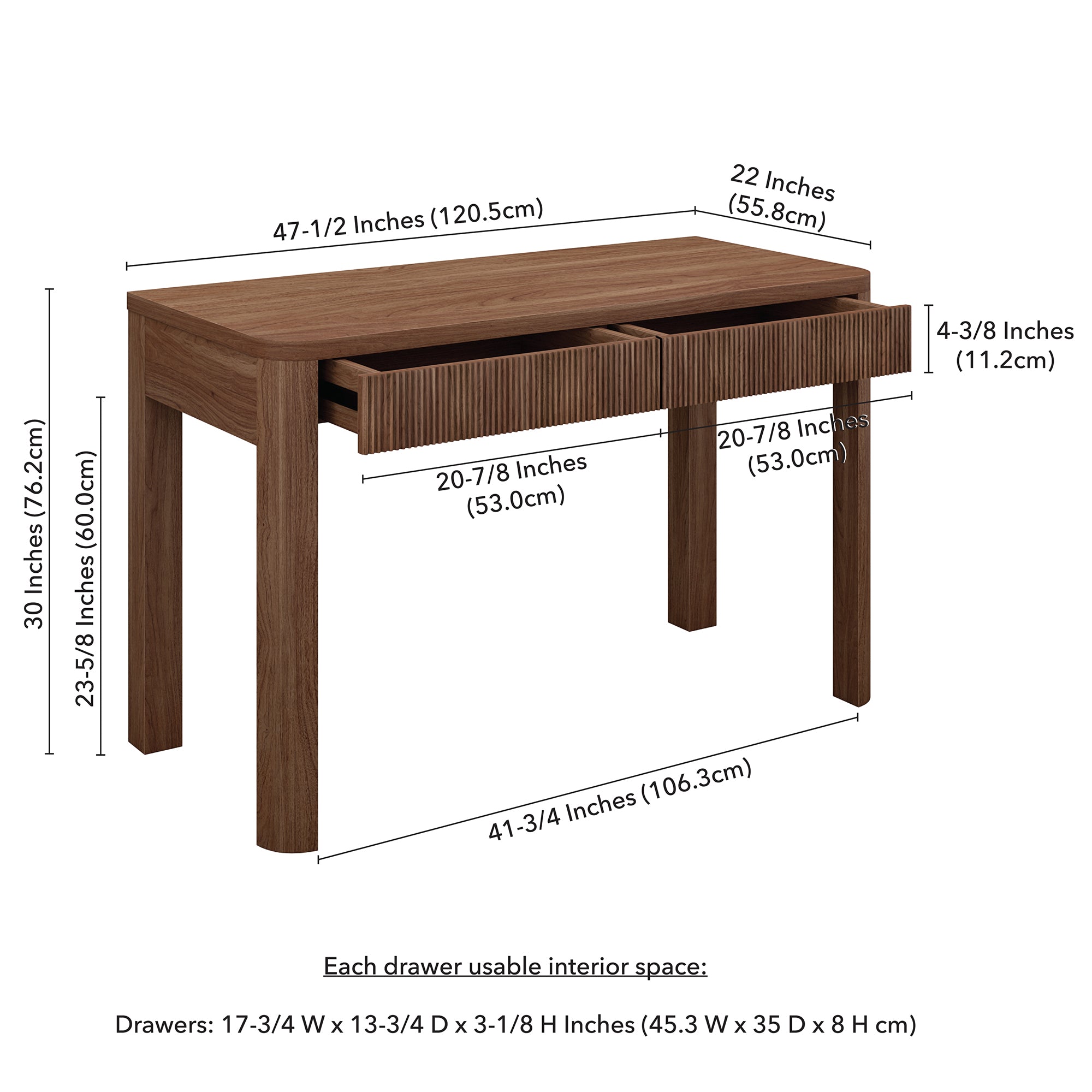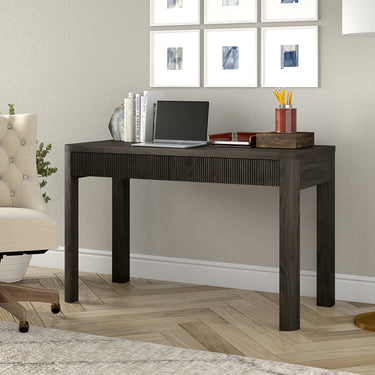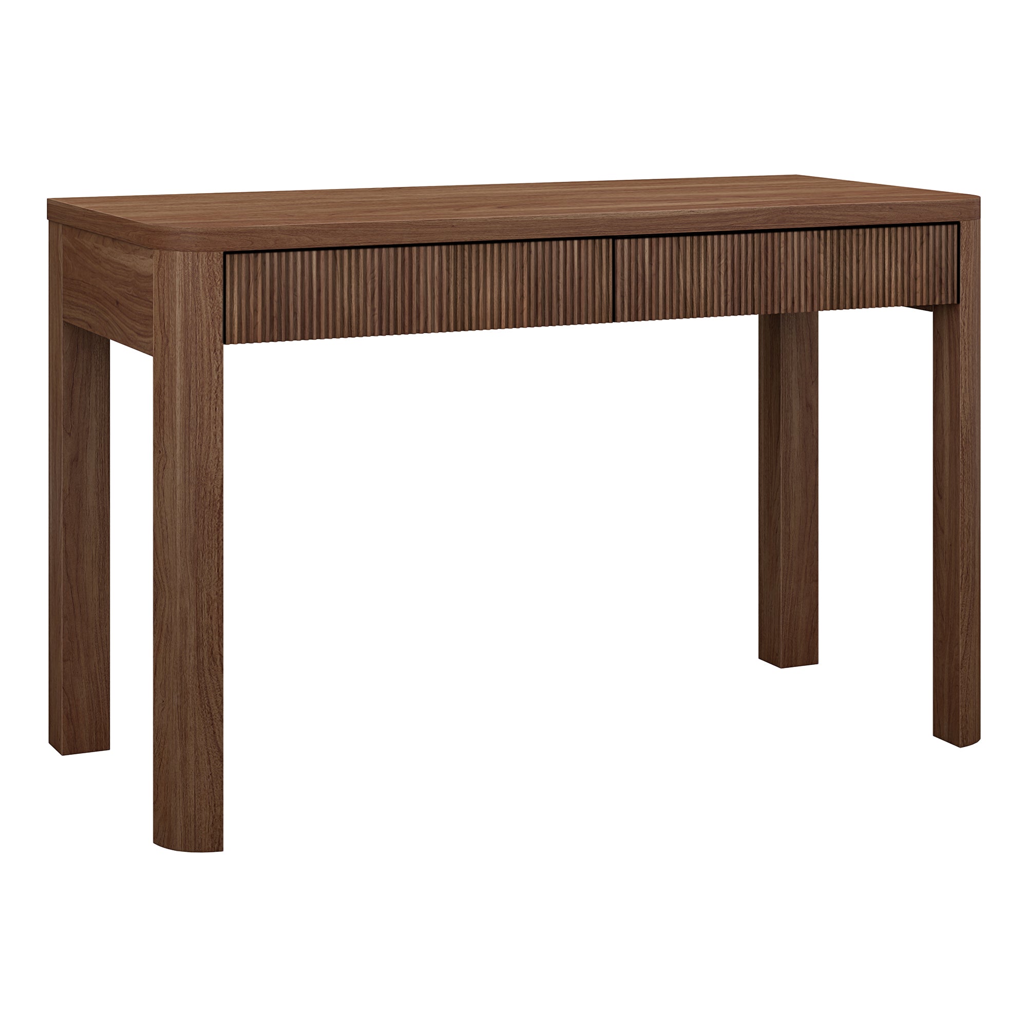 Cultivate on-trend modern style in your home office, game room, or vanity area with this 48" desk. The rounded-off legs create a soft, slightly retro shape, topped with a sturdy MDF desktop. This desk features two fluted soft-glide drawers for storage, while the open lower space provides plenty of room to settle in and take on the day. It’s time to work from home in style!