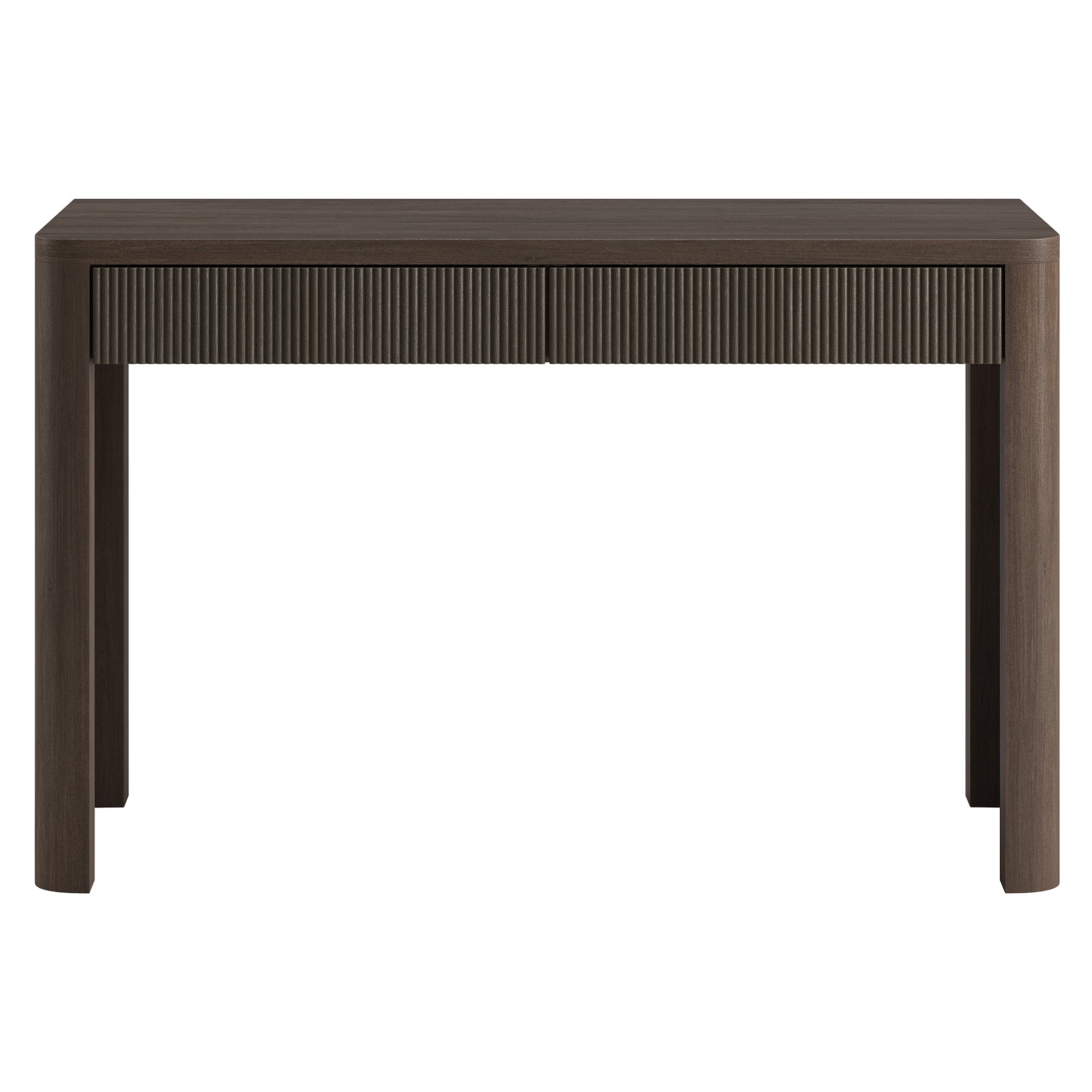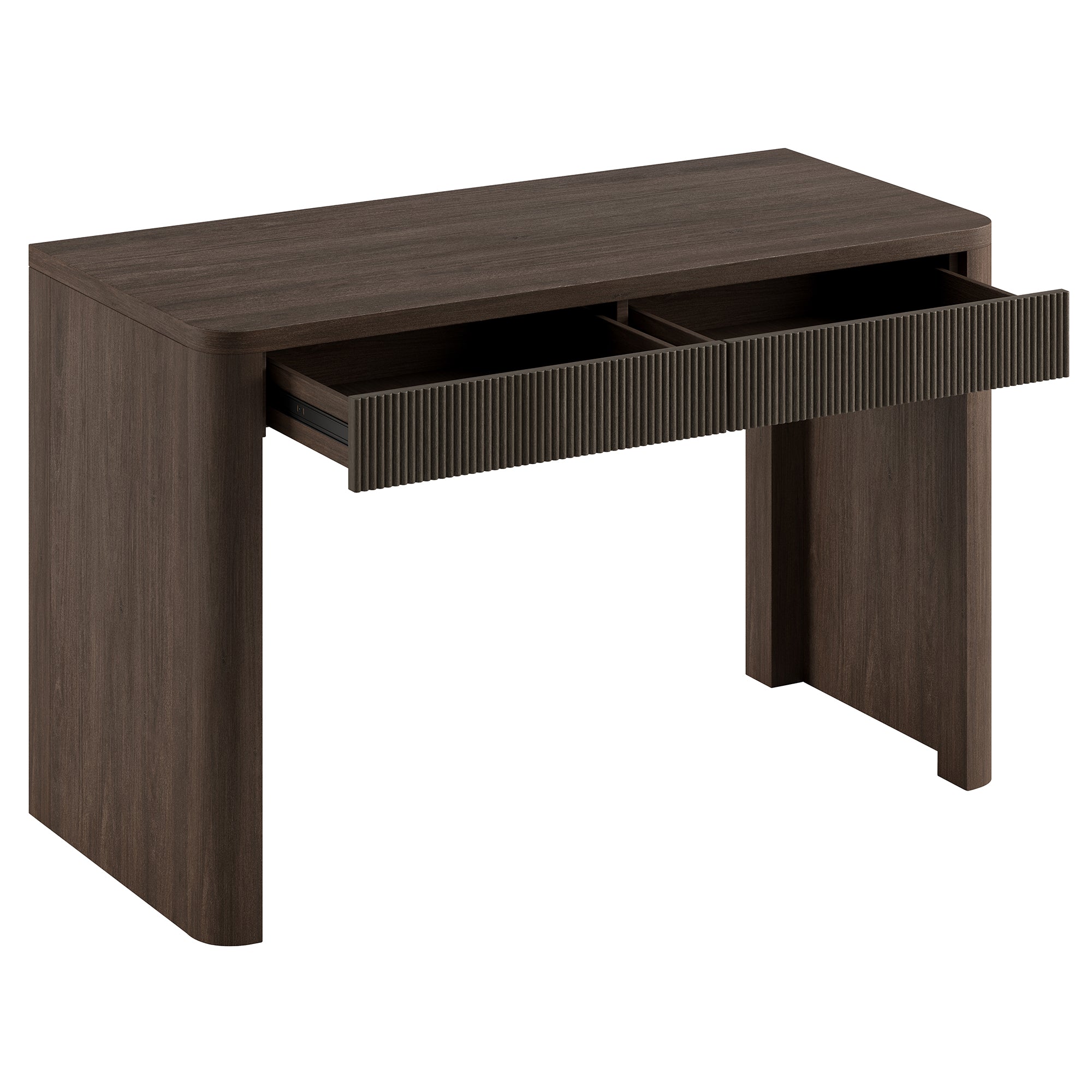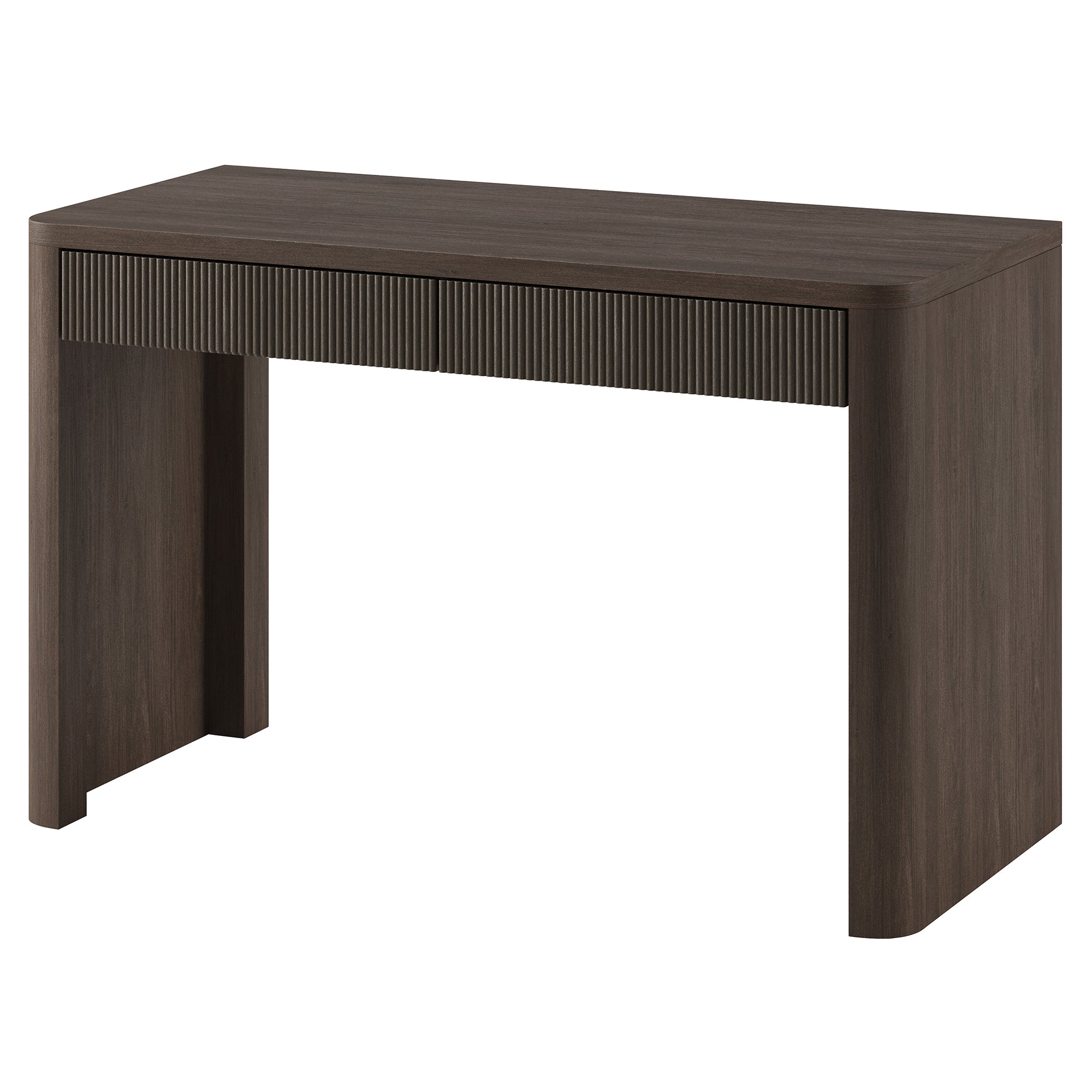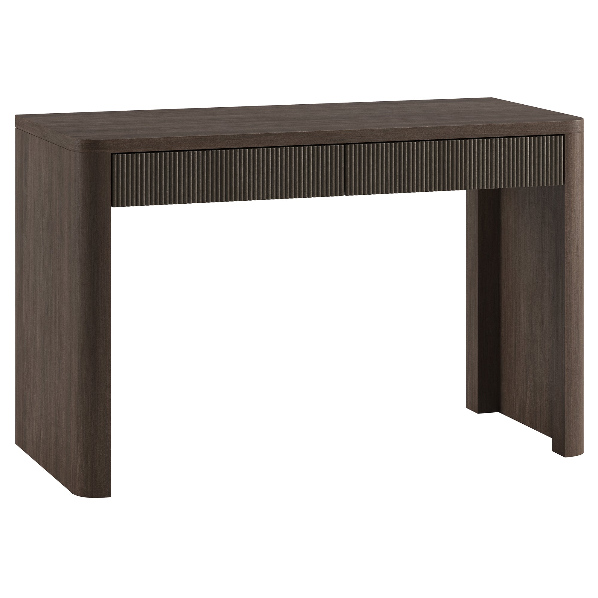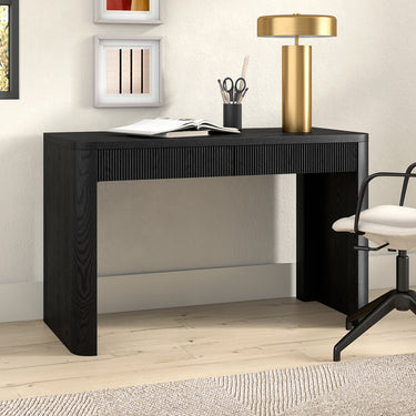 Cultivate on-trend modern style in your home office, game room, or vanity area with this 47.5" desk. With rounded, fluted edges creating a soft, slightly retro shape, topped with a sturdy MDF desktop. This desk features two soft-glide drawers for storage, while the open lower space provides plenty of room to settle in and take on the day. It’s time to work from home in style!