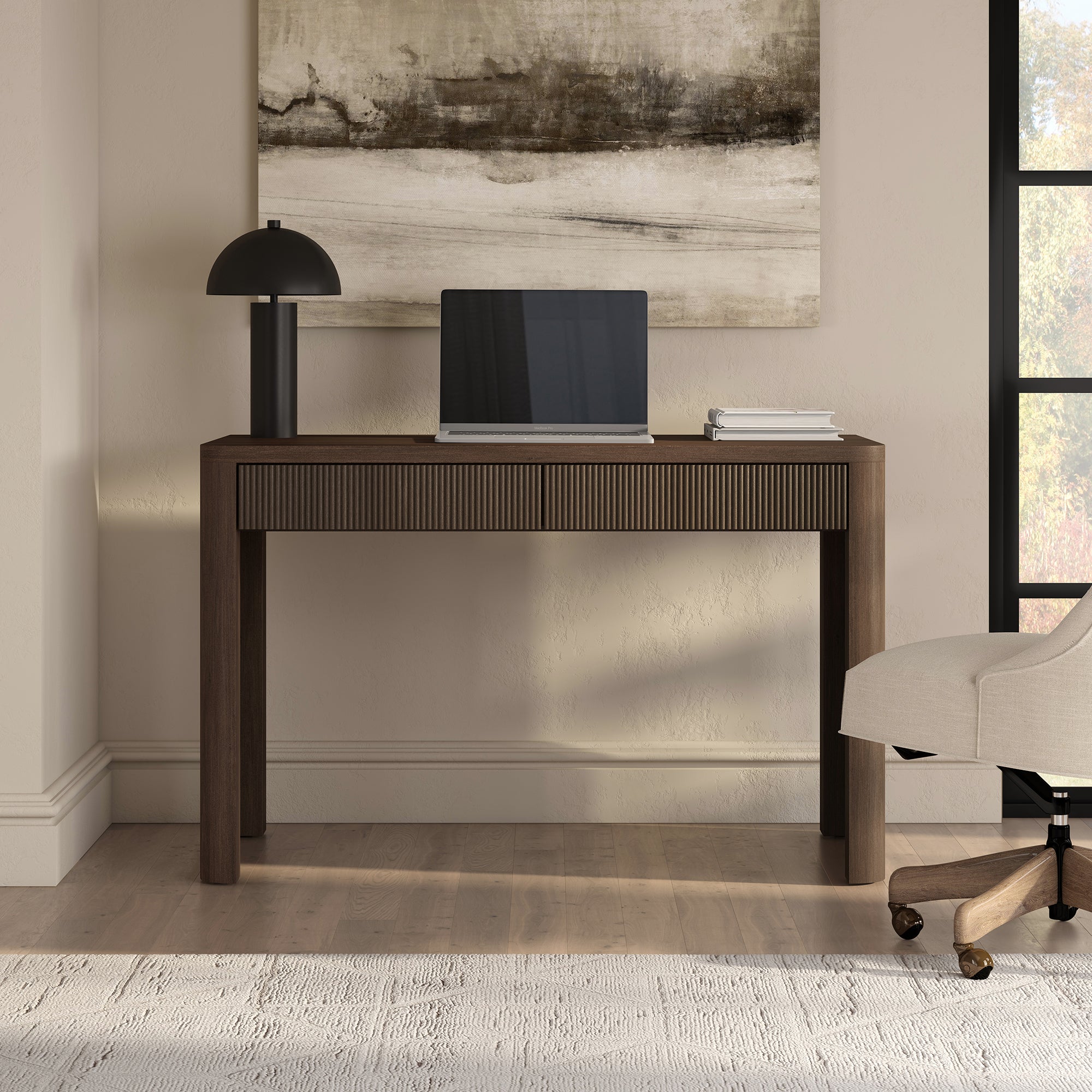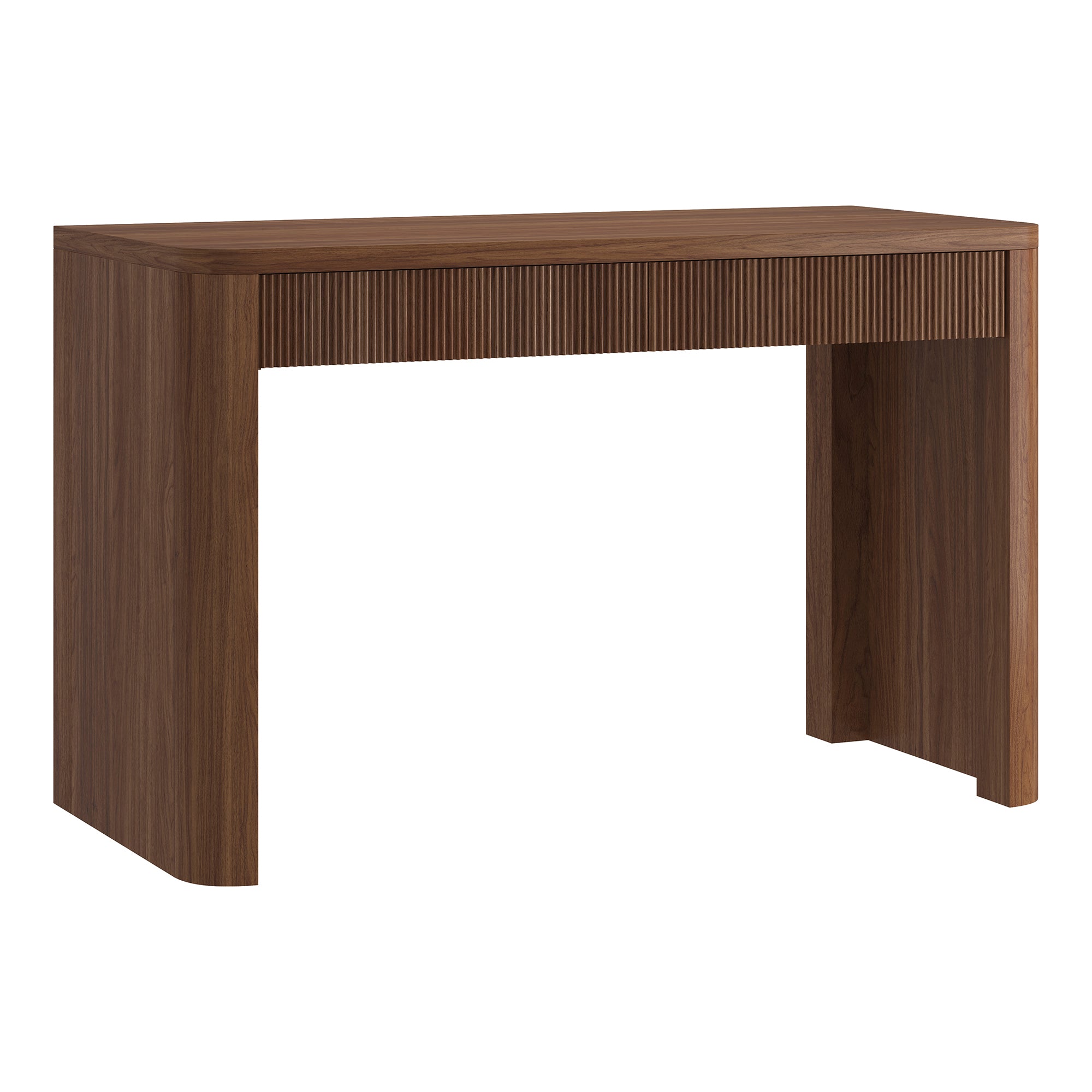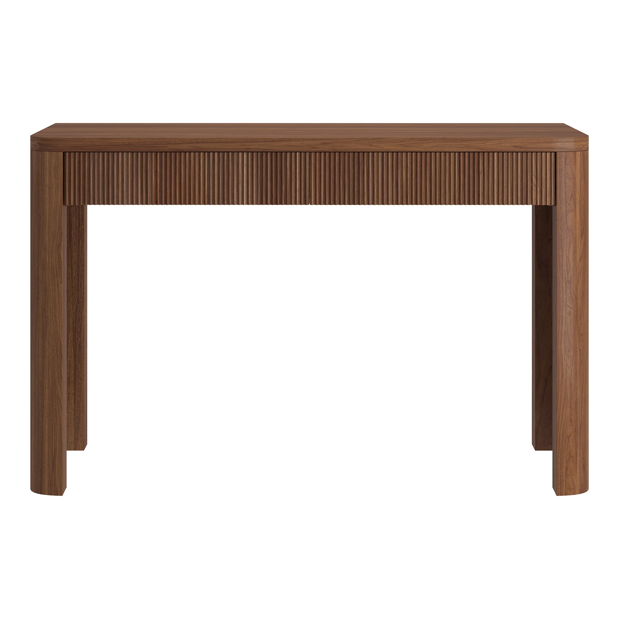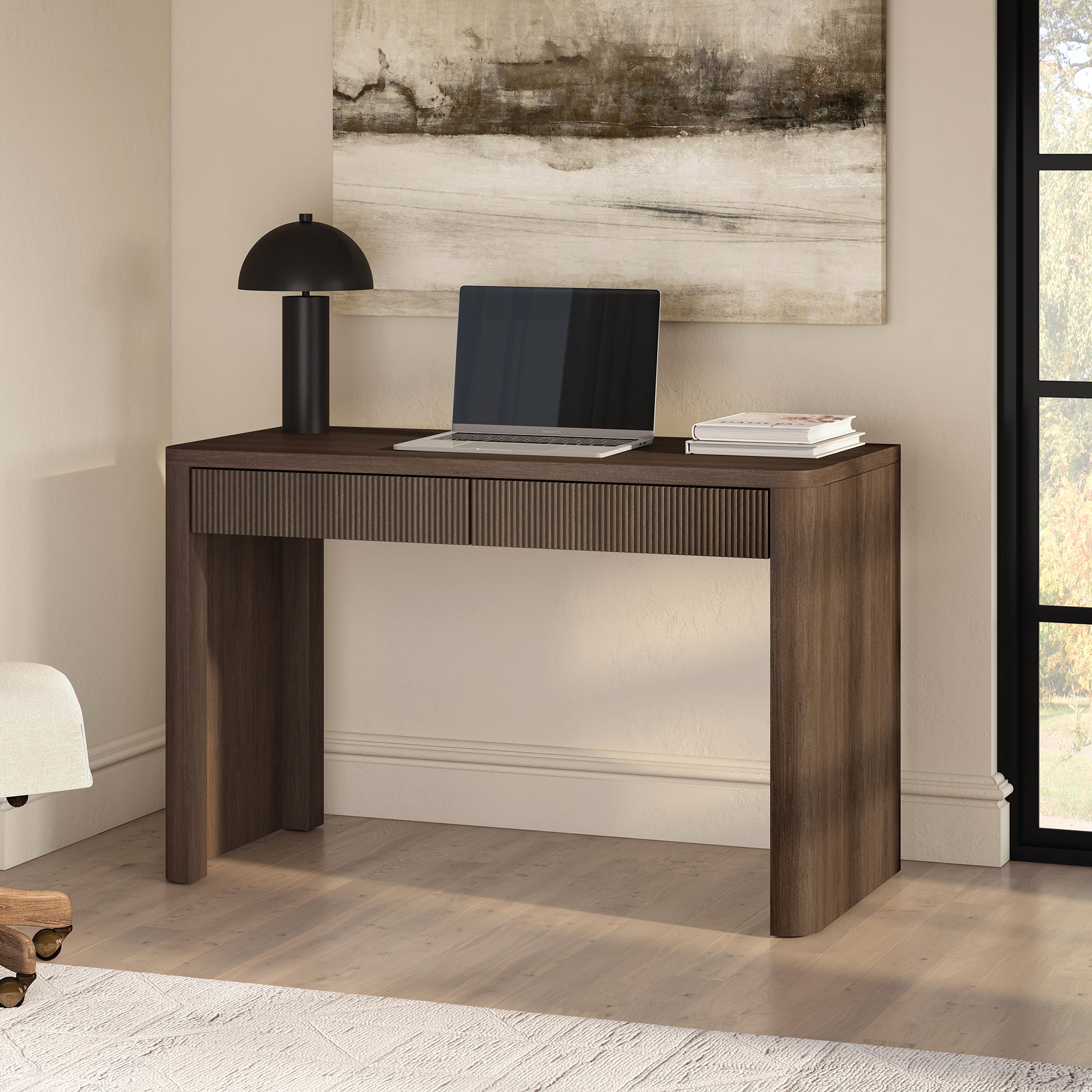 Cultivate on-trend modern style in your home office, game room, or vanity area with this 47.5" desk. With rounded, fluted edges creating a soft, slightly retro shape, topped with a sturdy MDF desktop. This desk features two soft-glide drawers for storage, while the open lower space provides plenty of room to settle in and take on the day. It’s time to work from home in style!