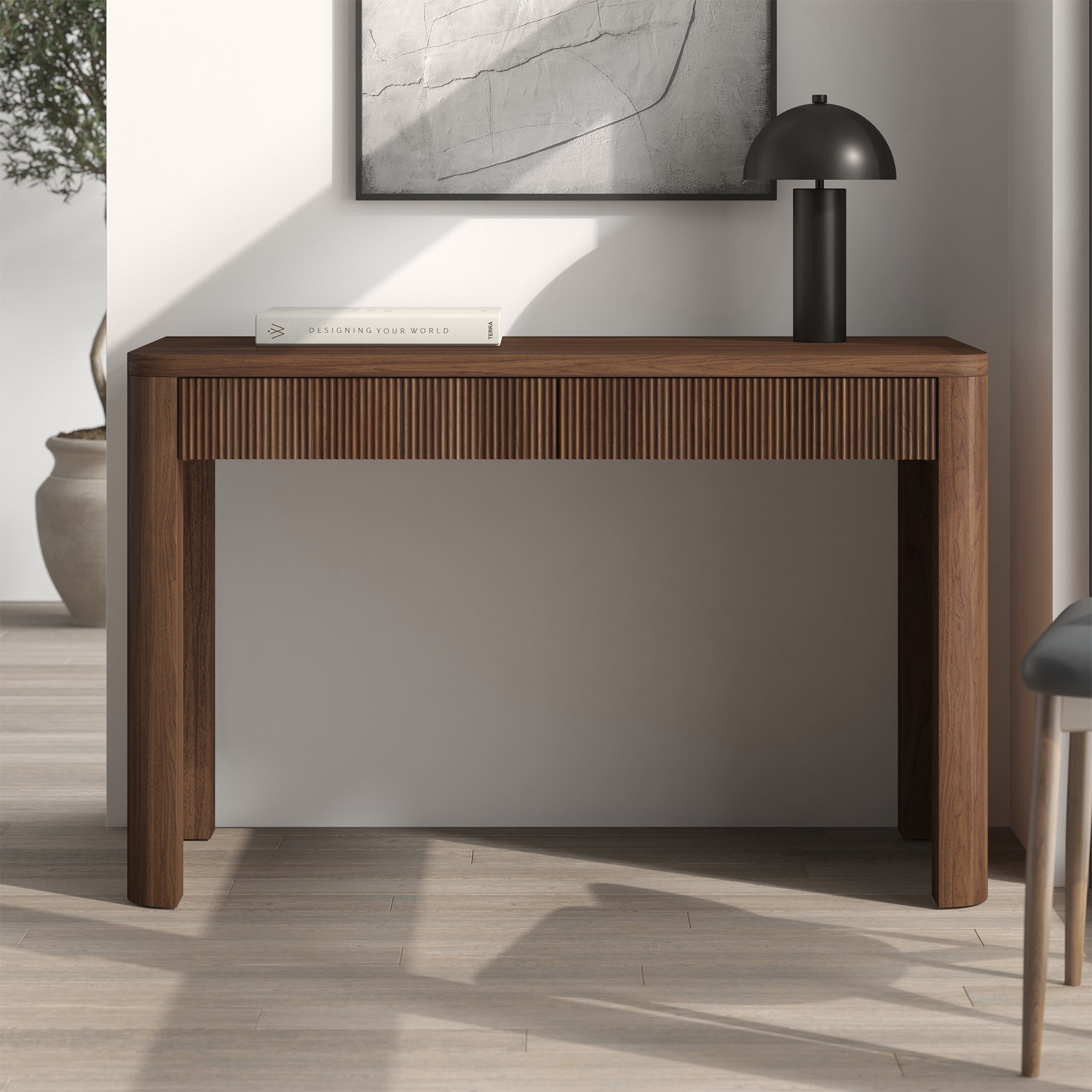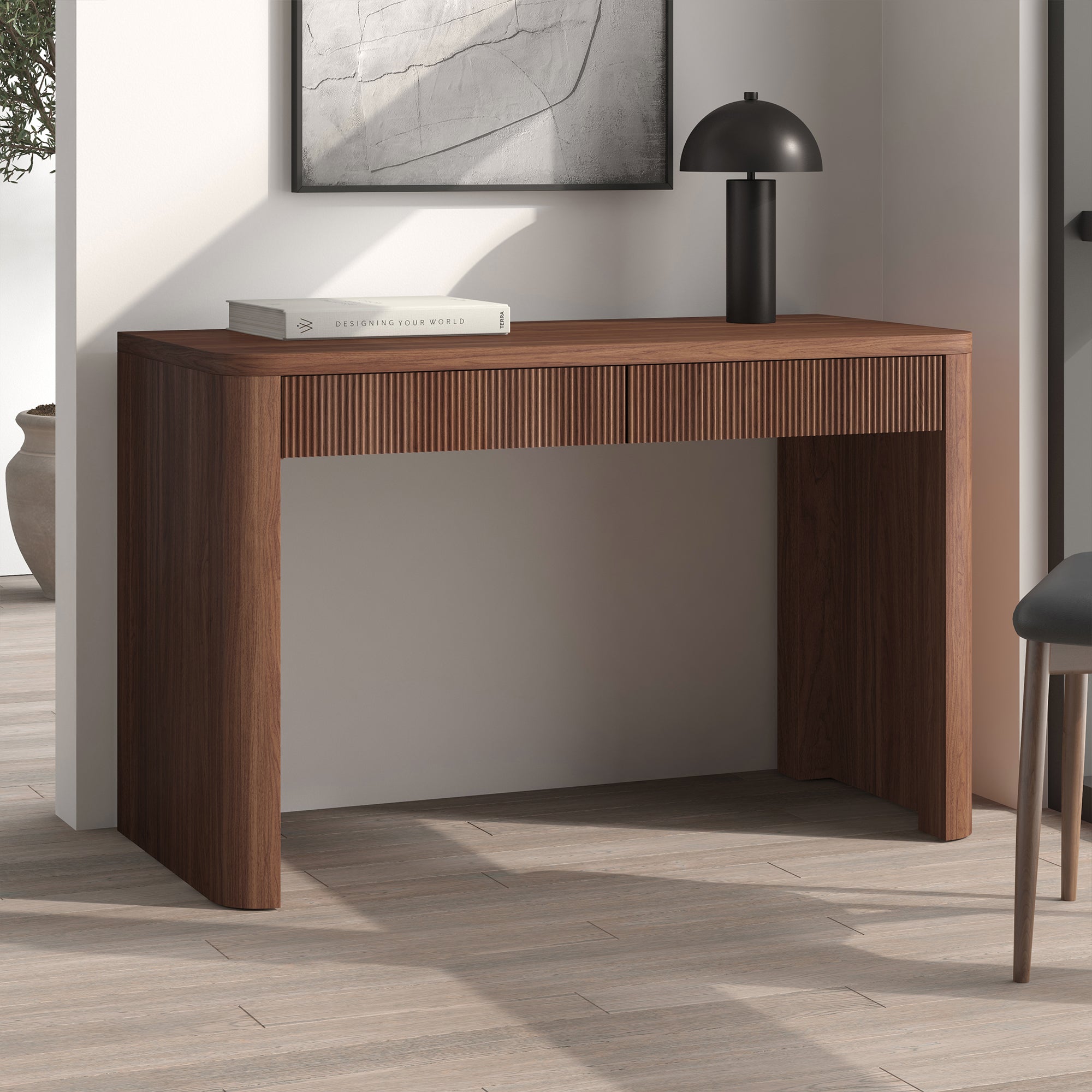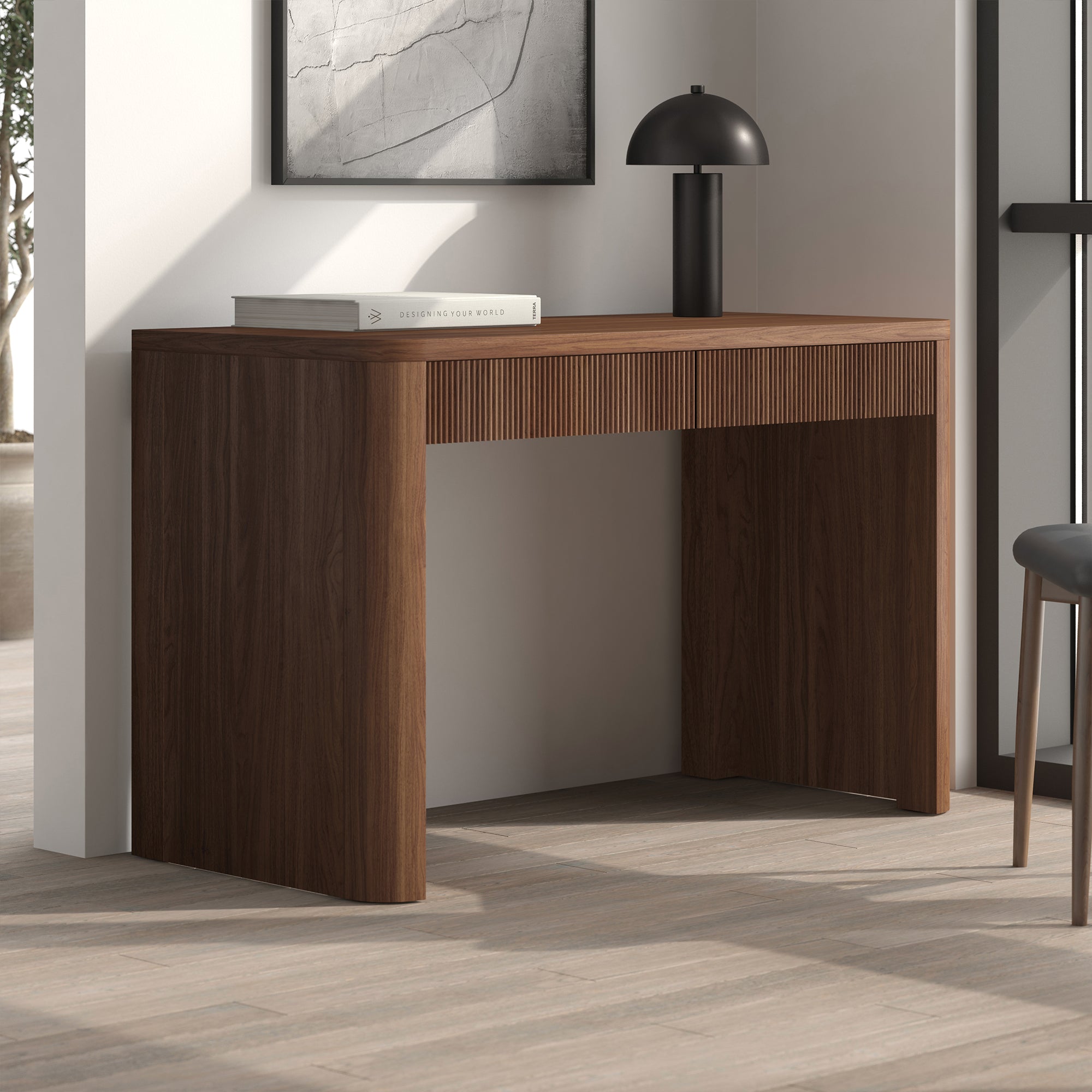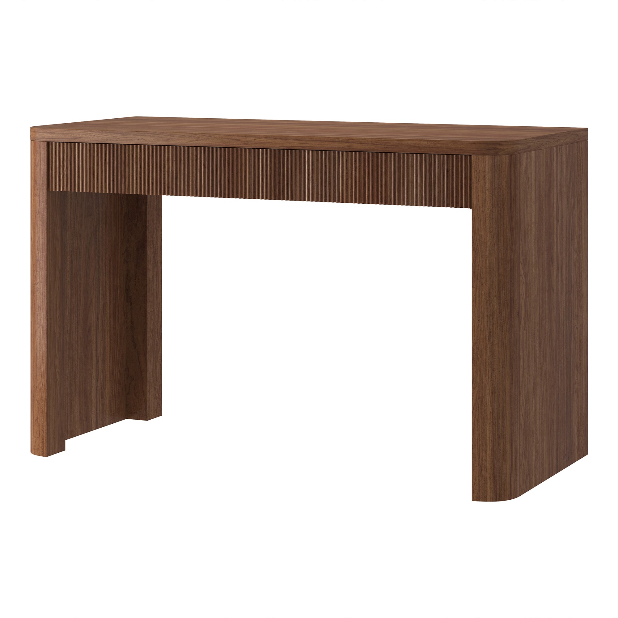 Cultivate on-trend modern style in your home office, game room, or vanity area with this 47.5" desk. With rounded, fluted edges creating a soft, slightly retro shape, topped with a sturdy MDF desktop. This desk features two soft-glide drawers for storage, while the open lower space provides plenty of room to settle in and take on the day. It’s time to work from home in style!