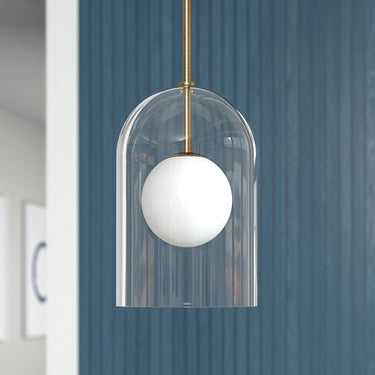 Create a show-stopping lighting moment anywhere in your home with this double layered pendant light. A clear outer glass dome contains a white milk glass globe, the nestled shapes playing off each other in a contrast of modern elegance and retro ambiance. The contrasting steel base and down rod complement the look while letting the unique shades take center stage. One 6-inch rod and four 12-inch rods are included to help you customize this piece to fit your space perfectly.