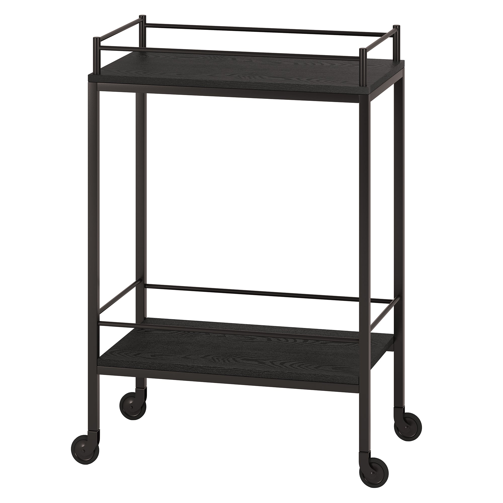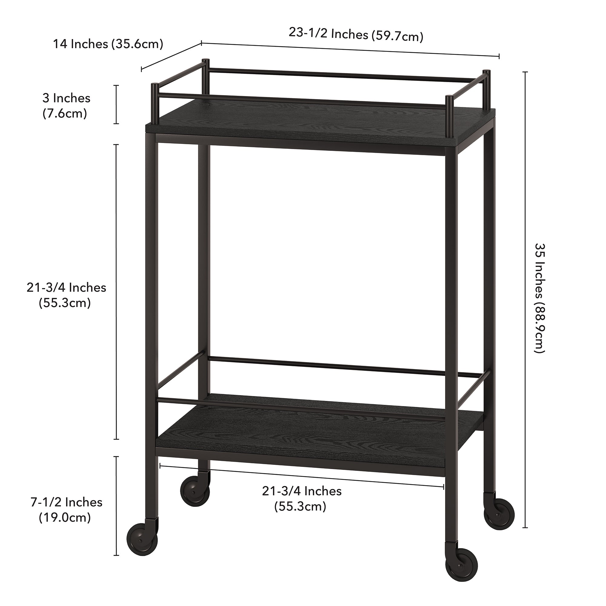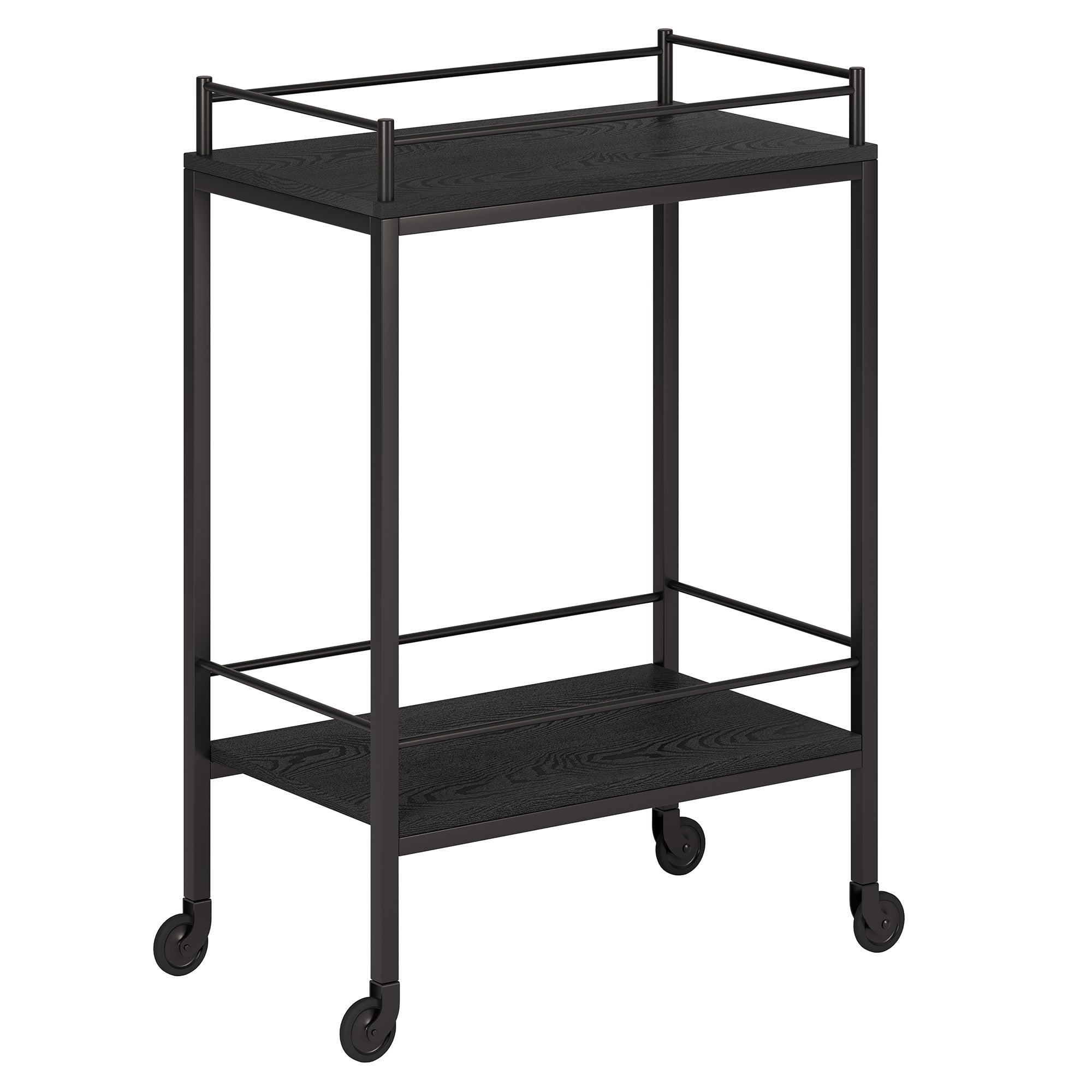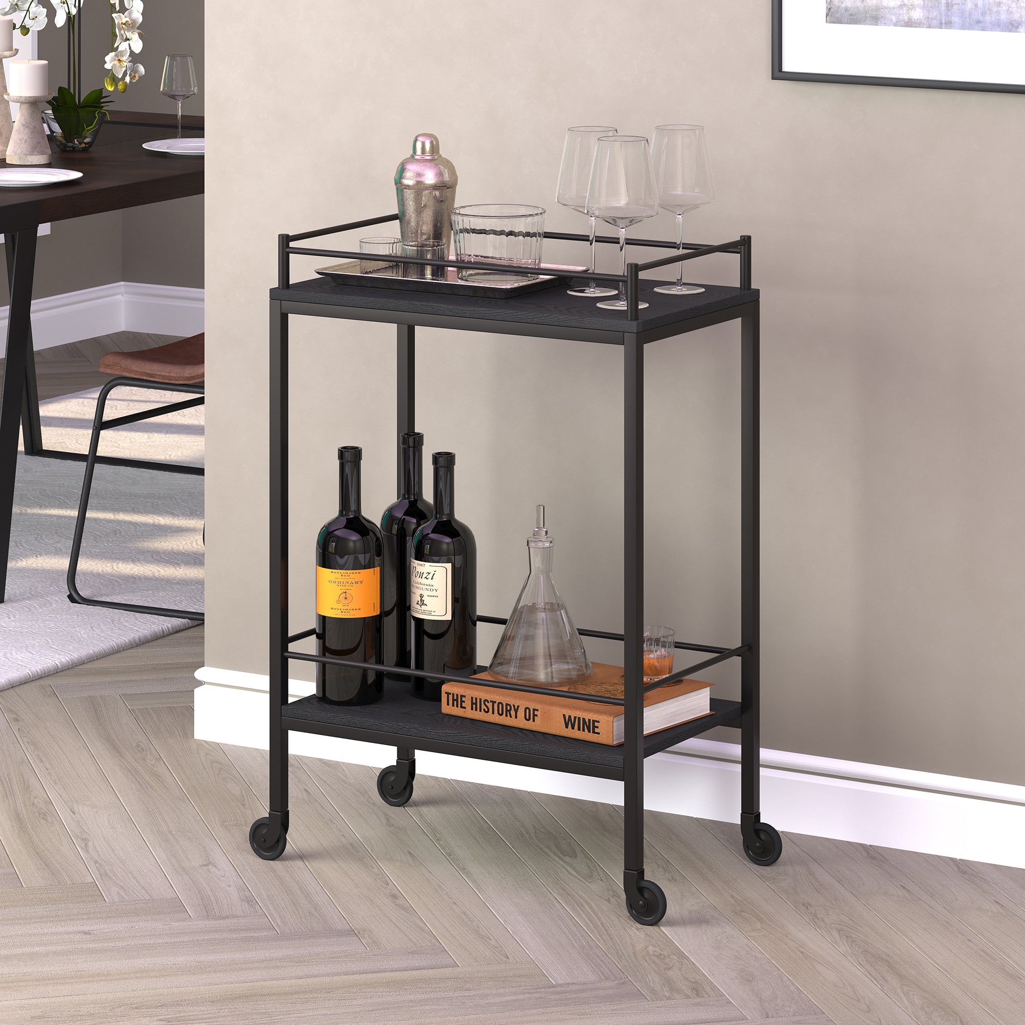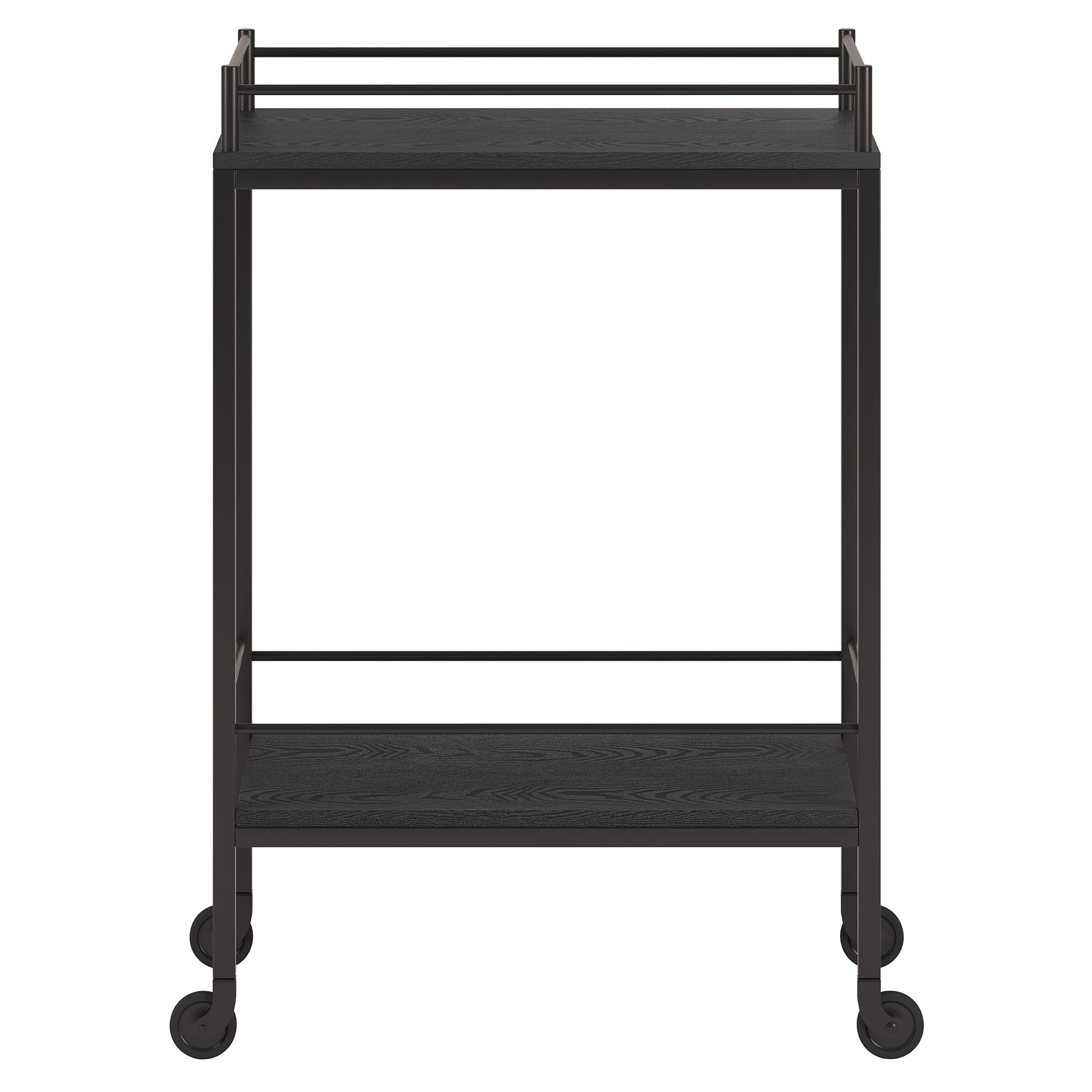 Form meets function in this modern bar cart. The framed top and shelf keep your barware and mixers safe, while four wheels provide easy mobility. The cart’s clean lined frame is finished in blackened bronze, perfectly complemented by rustic wood-finish MDF. Not a party animal? Re-purpose this piece as a coffee station, mobile vanity, or nightstand!