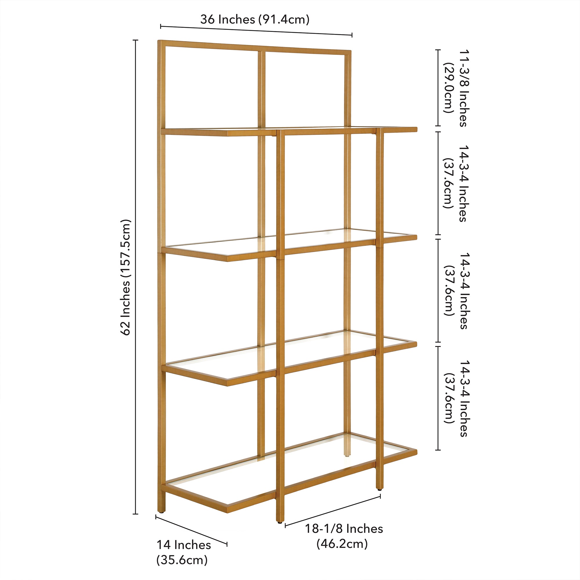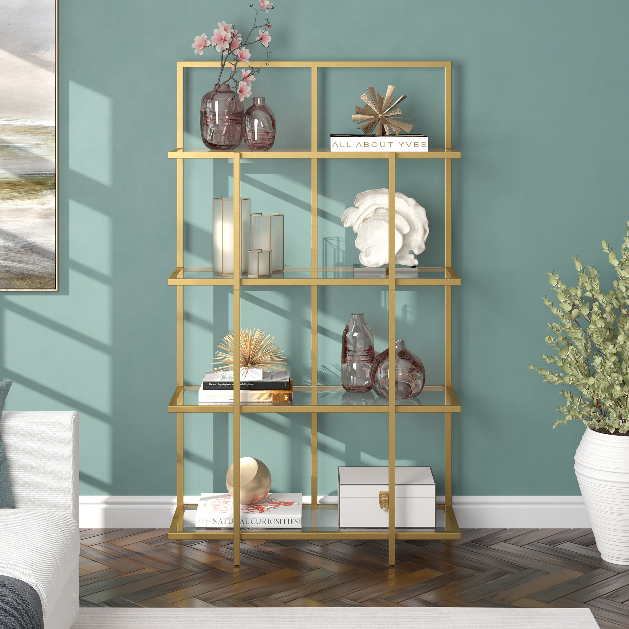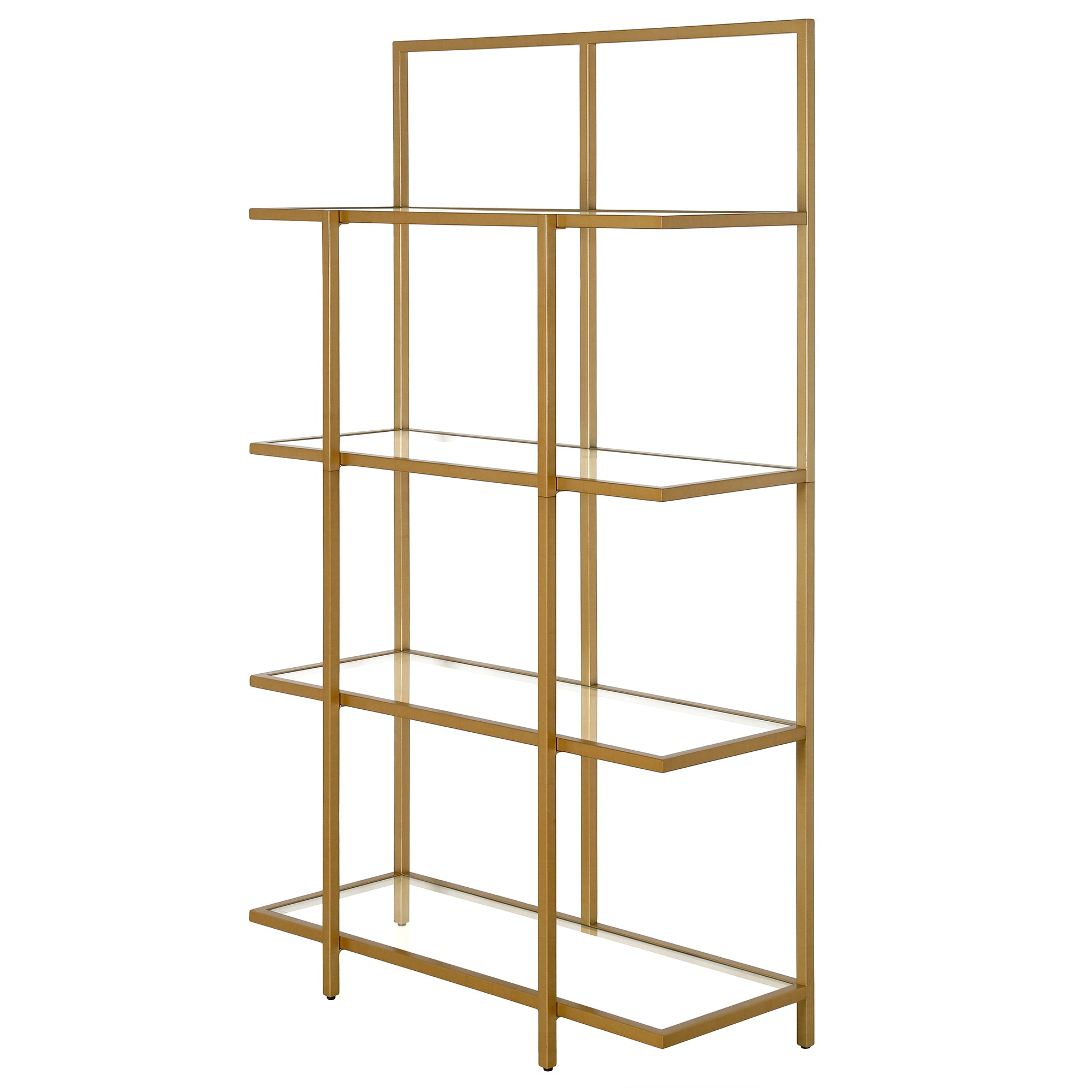 Showcase your favorite books and decorative items with this industrial-inspired 4-tiered bookcase. Clean architectural lines evoke a modern look, creating visual interest in the interplay of its 5-legged frame. Crafted of steel and sturdy tempered glass, its finished in a classic neutral metallic tone, allowing it to pair effortlessly with your existing den or home office décor. At 62” tall, there’s plenty of space to keep your library in order without overwhelming a smaller space.