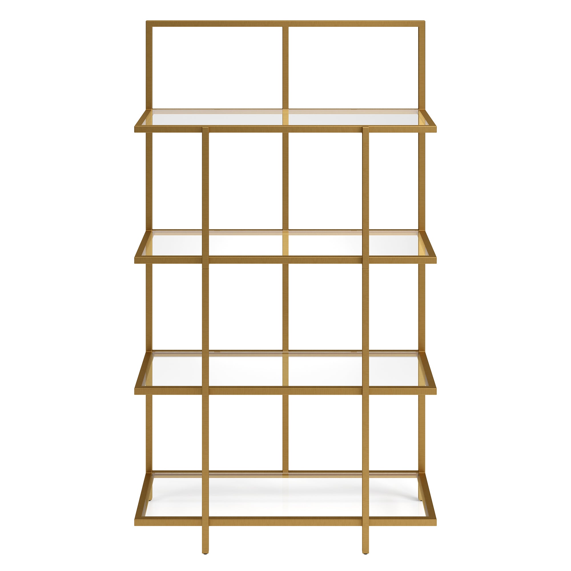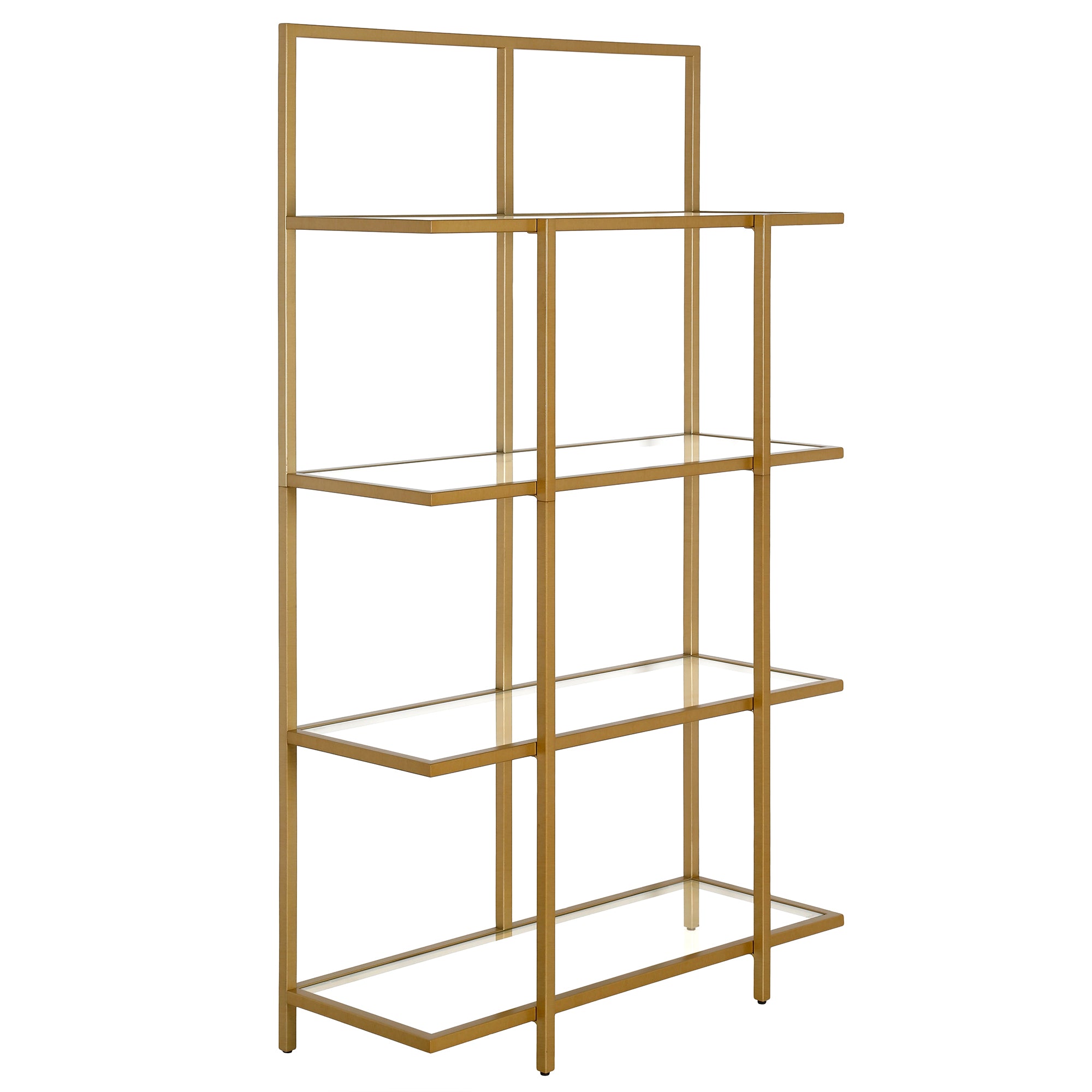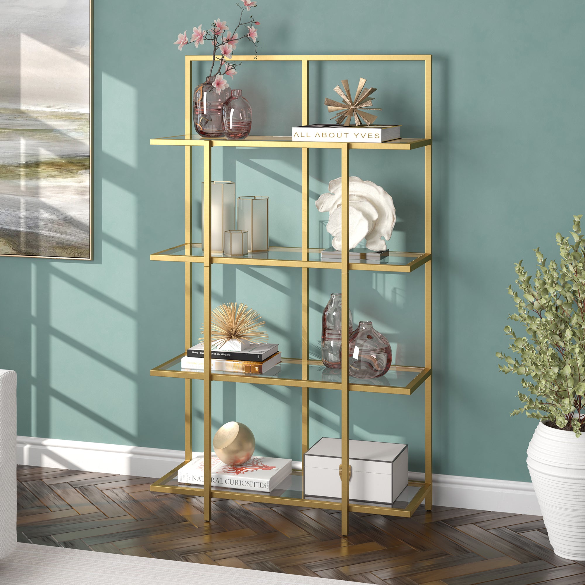 Showcase your favorite books and decorative items with this industrial-inspired 4-tiered bookcase. Clean architectural lines evoke a modern look, creating visual interest in the interplay of its 5-legged frame. Crafted of steel and sturdy tempered glass, its finished in a classic neutral metallic tone, allowing it to pair effortlessly with your existing den or home office décor. At 62” tall, there’s plenty of space to keep your library in order without overwhelming a smaller space.