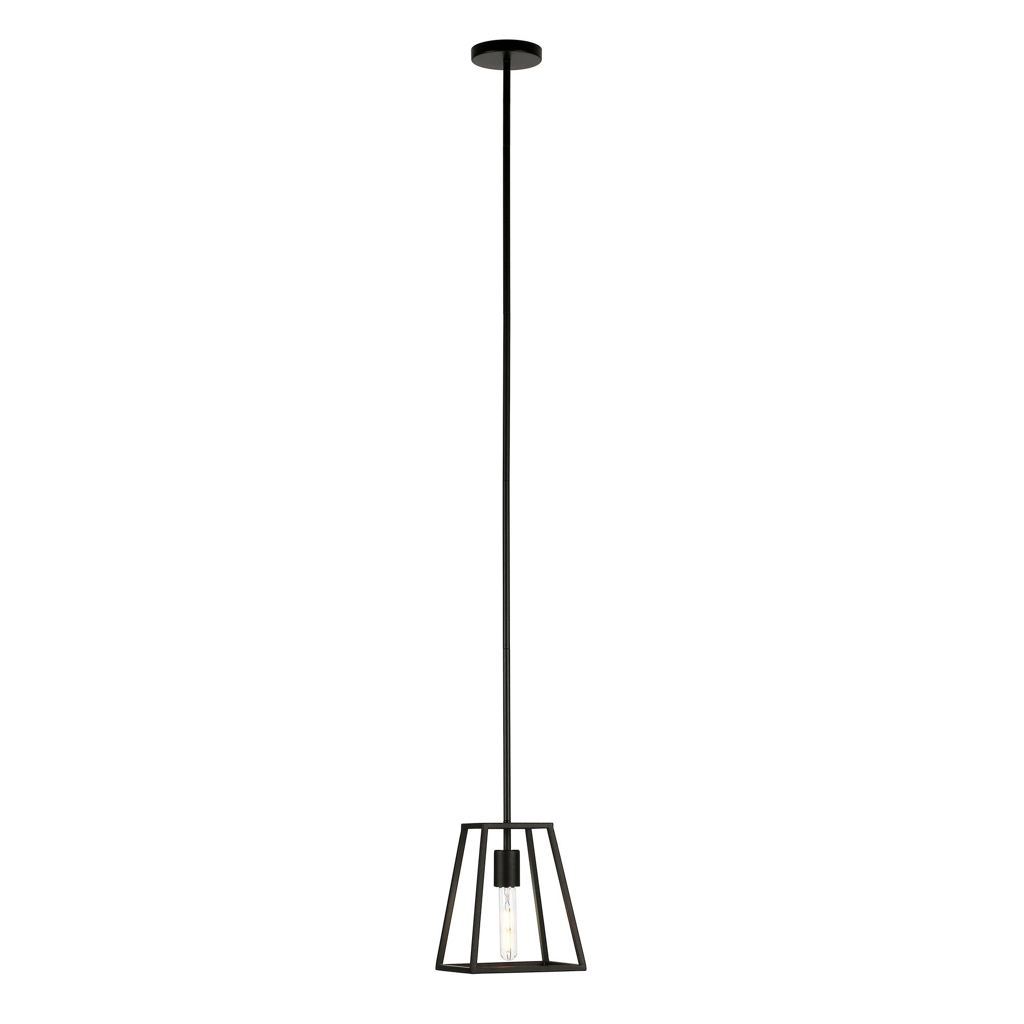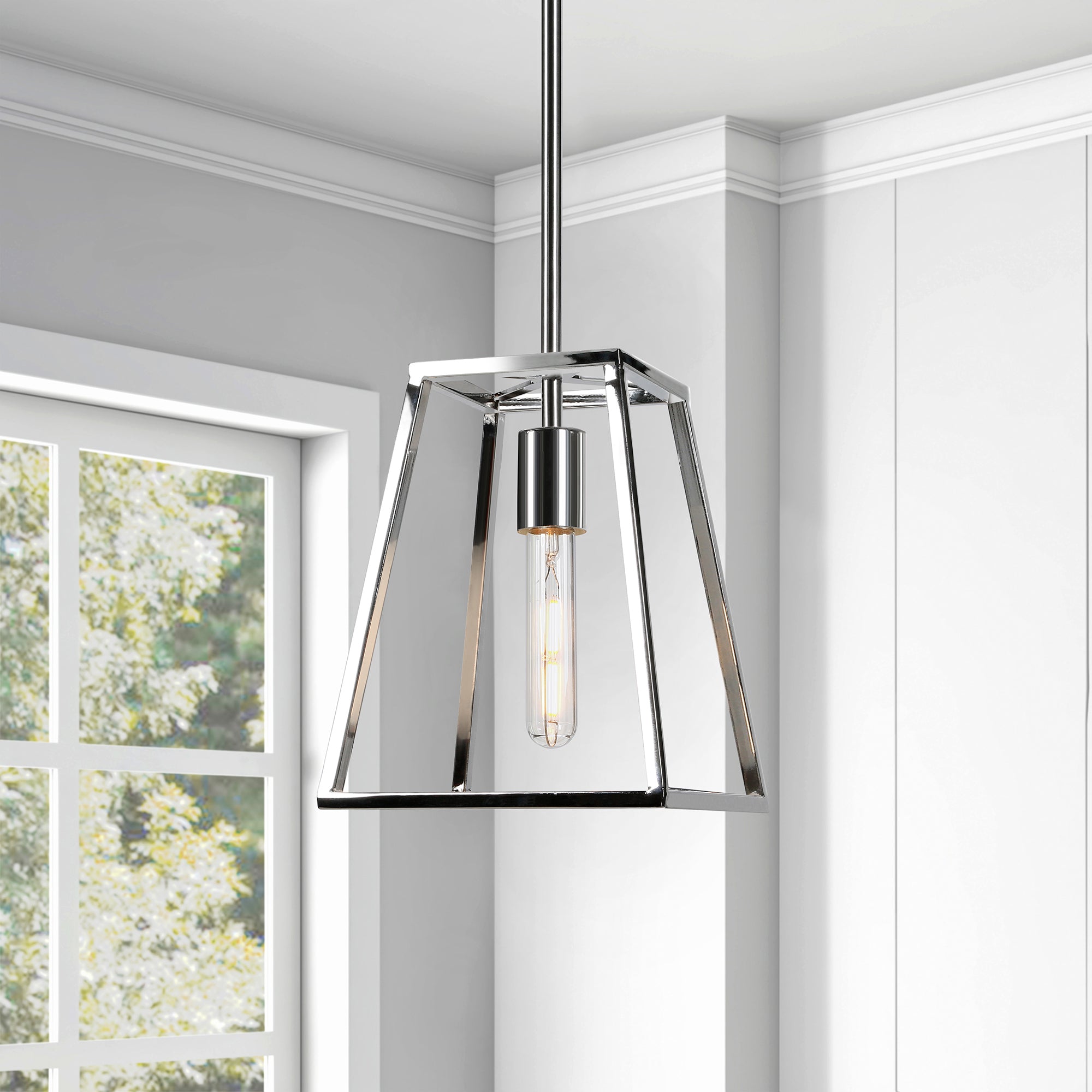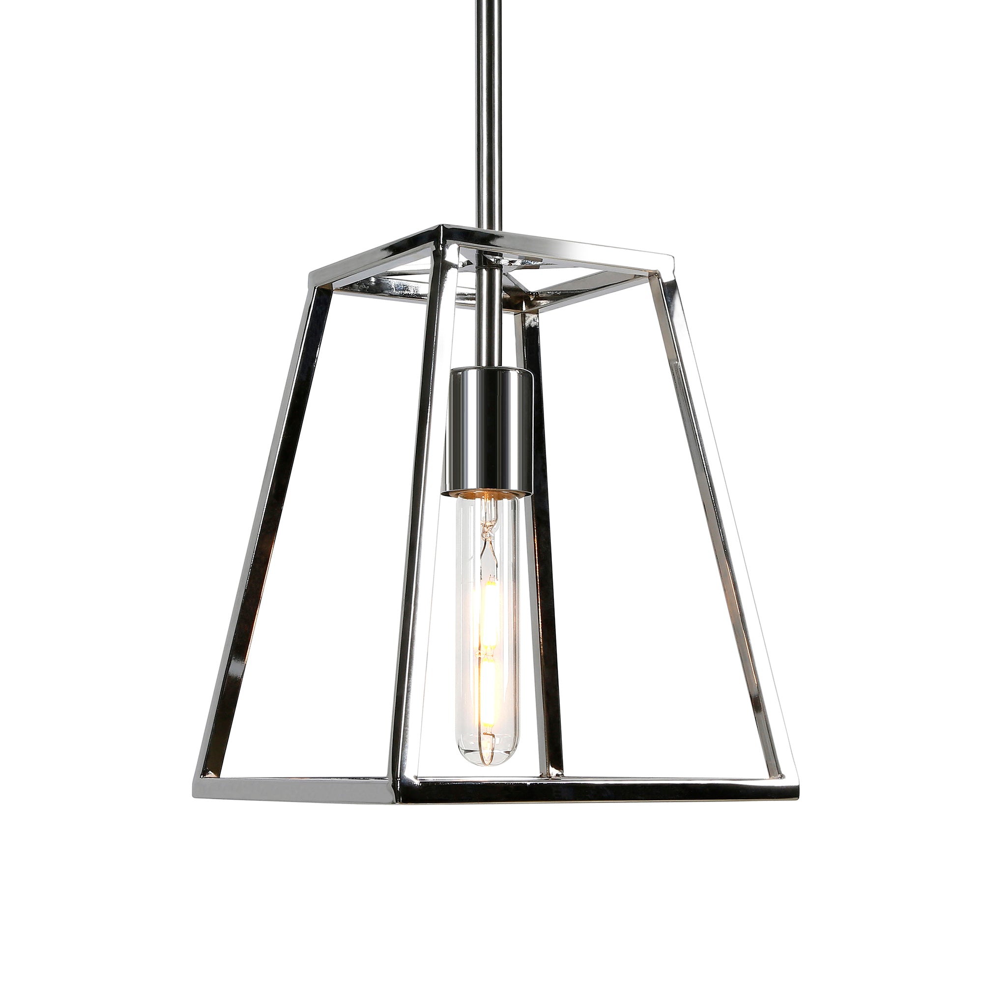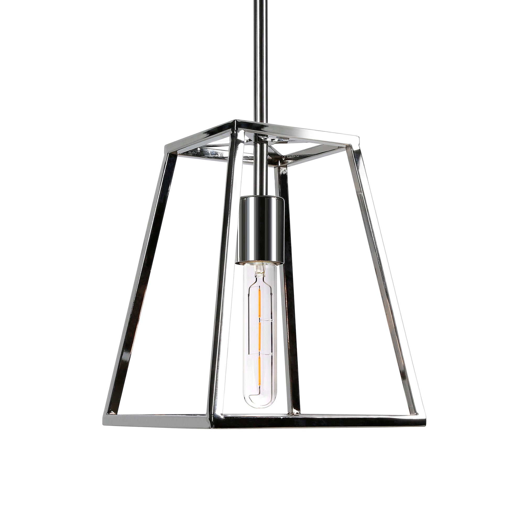 Bring an industrial, modern feel to your living space with this geometric, open-framed pendant. Featuring a clean-cut, rhombus shaped frame allowing an exposed view to the bulb (not included). The hardware is finished in cool silver nickel and includes an 8 ft polyester cord.