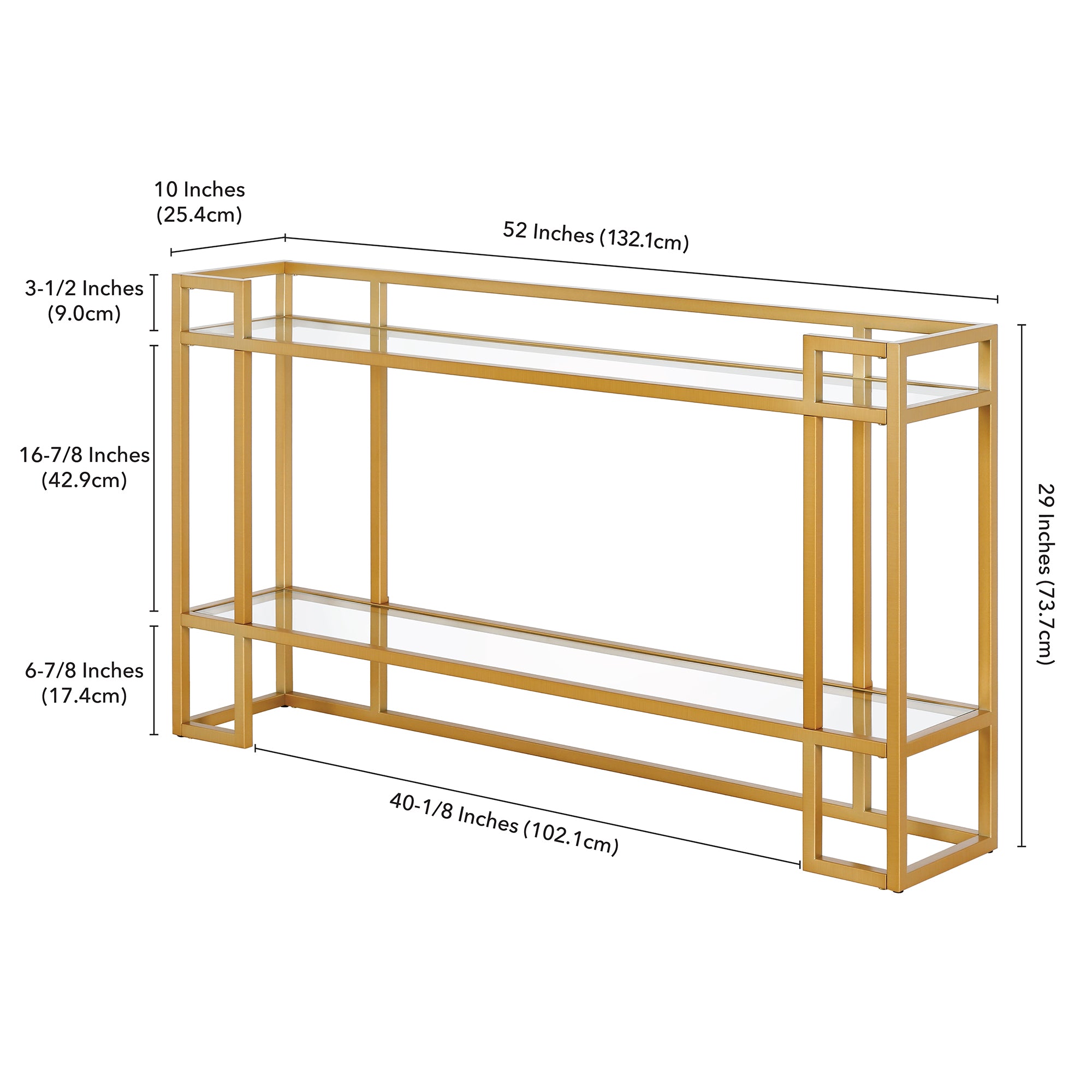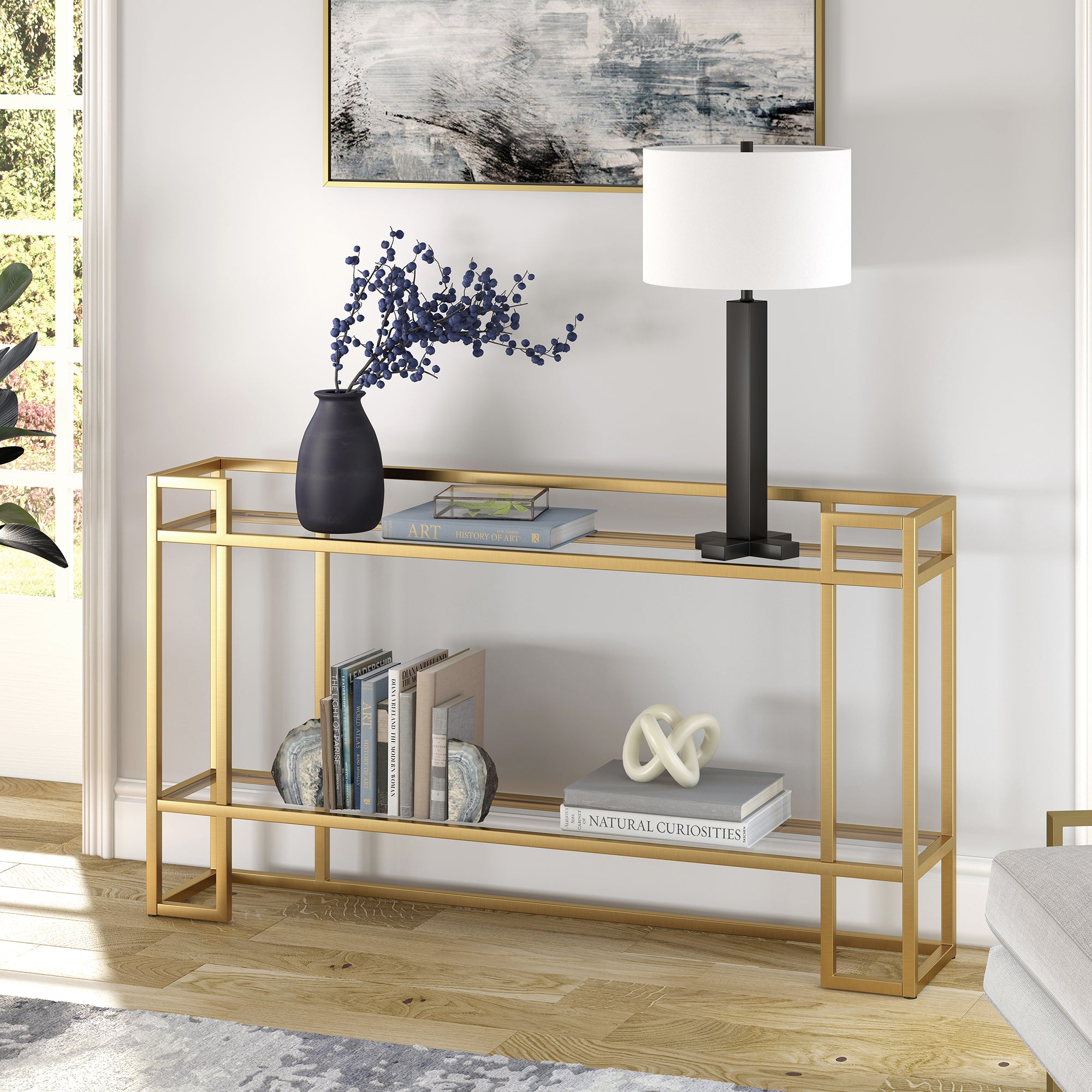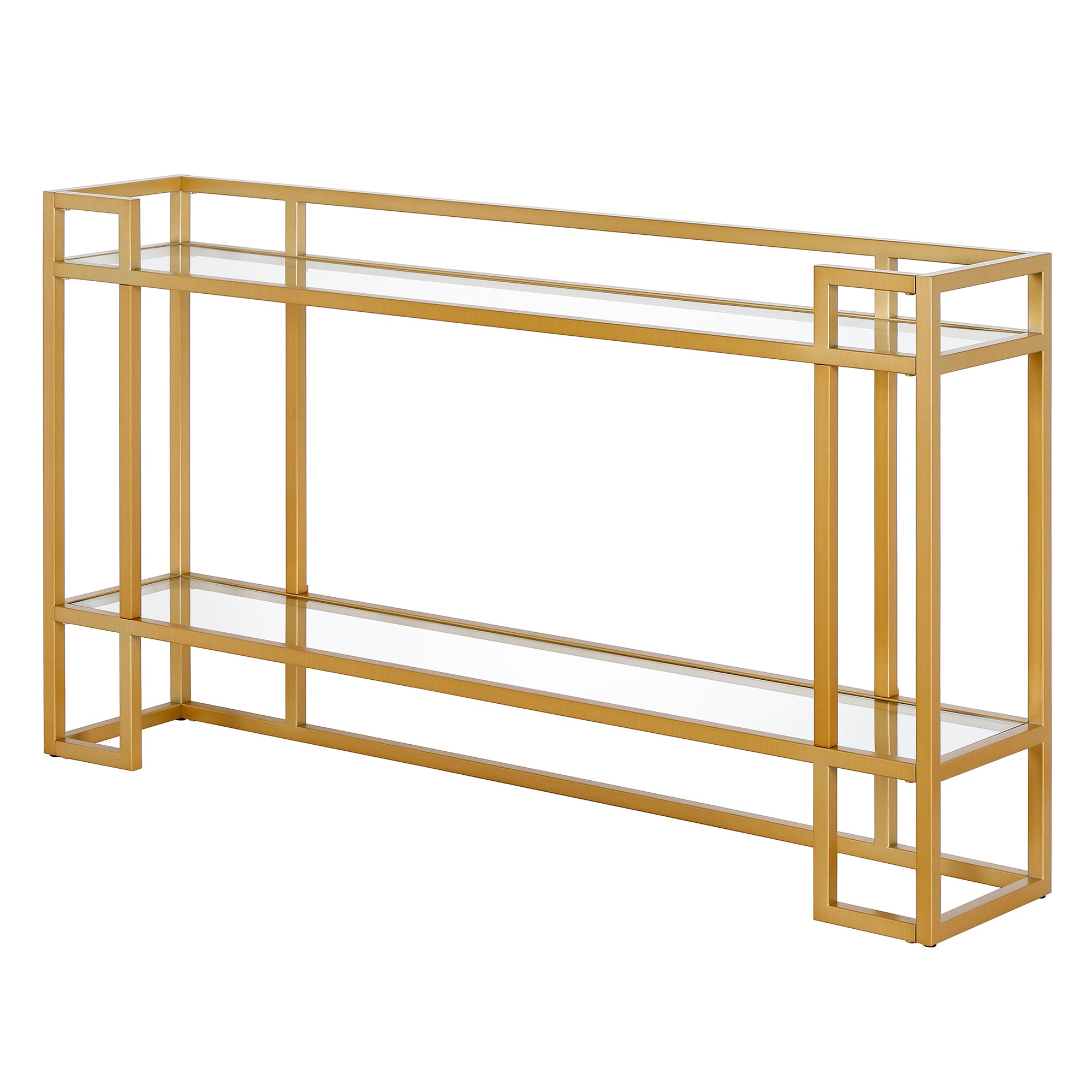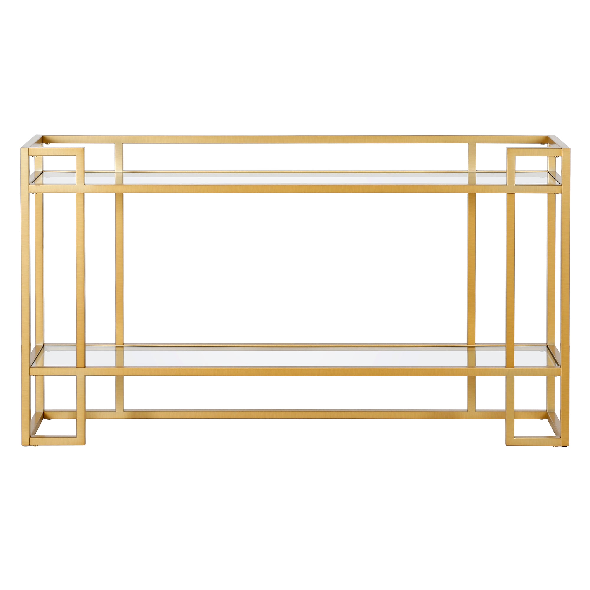 A strong linear profile sets this Art Deco-inspired console table apart. Its overlapping geometric lines offset the durable tempered glass tabletop and shelf, creating an artful backdrop for framed photos, flowers, or your favorite collections of decorative items. The streamlined look and neutral metallic finish pairs seamlessly with your existing color scheme and décor style.