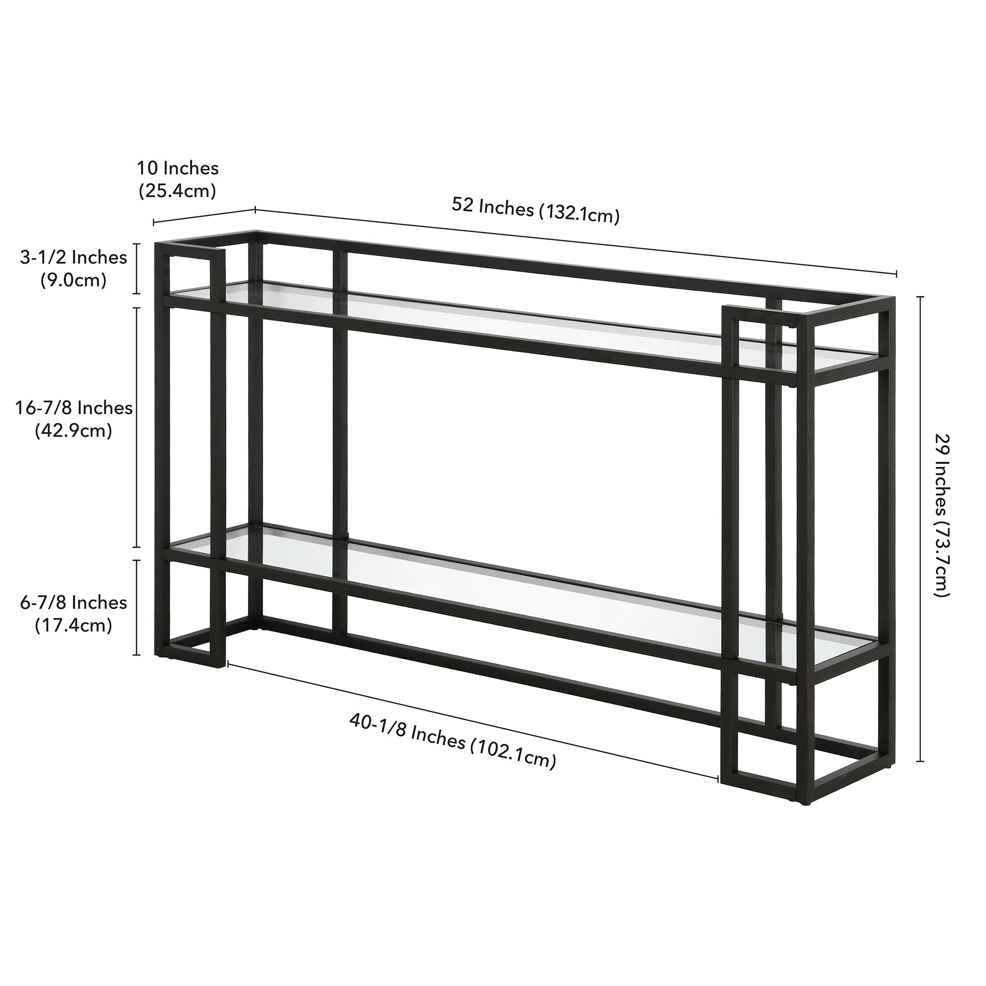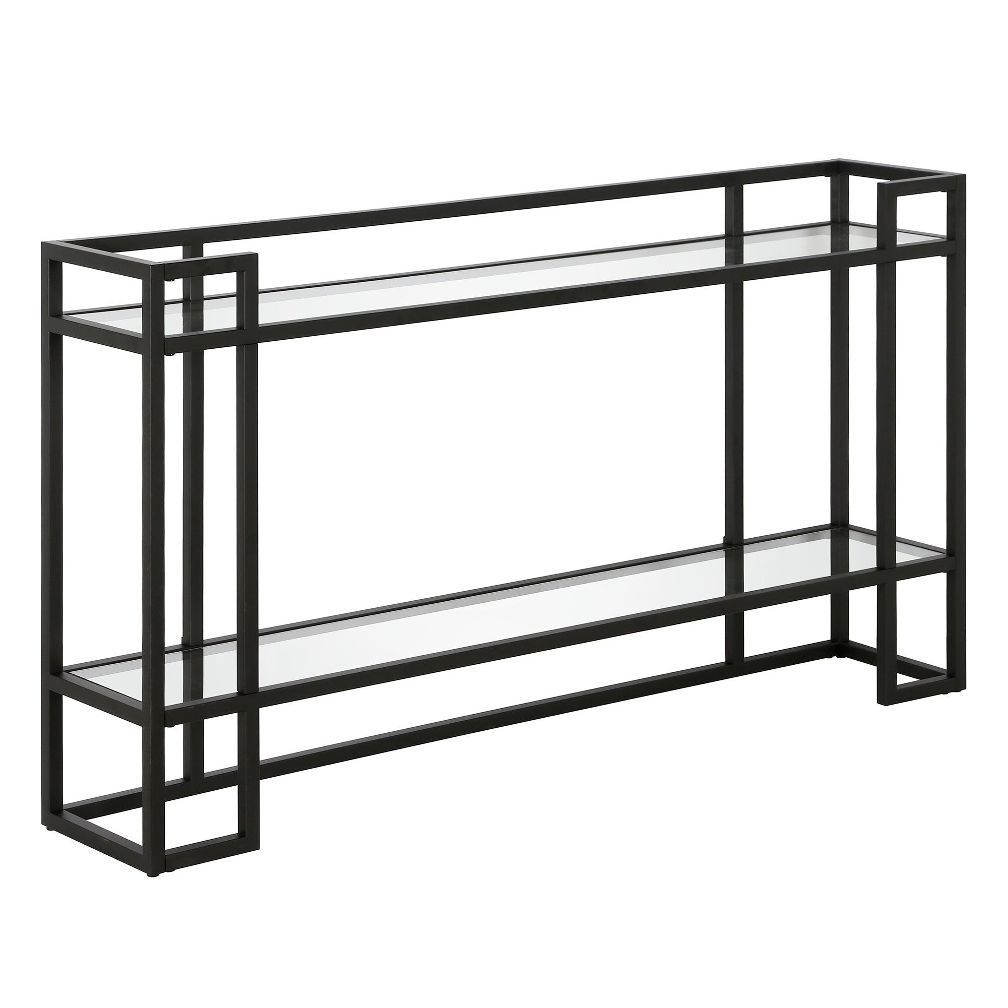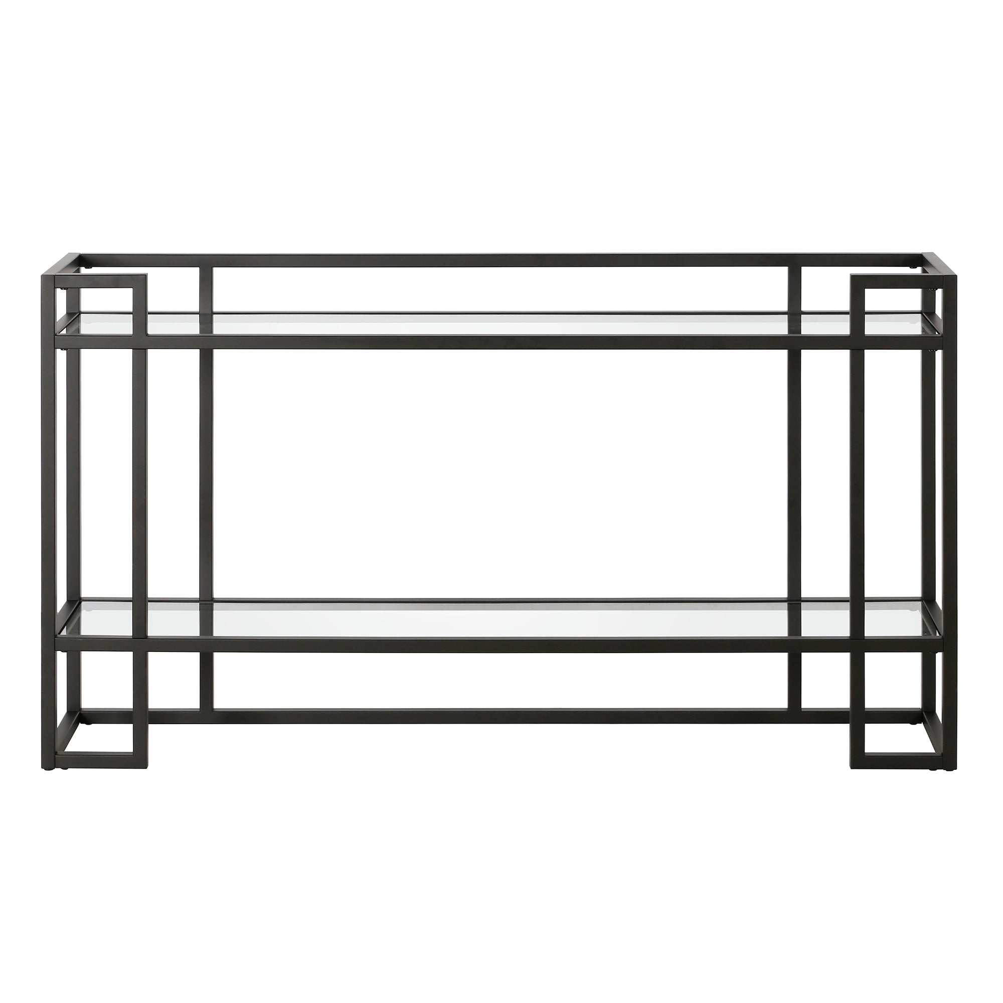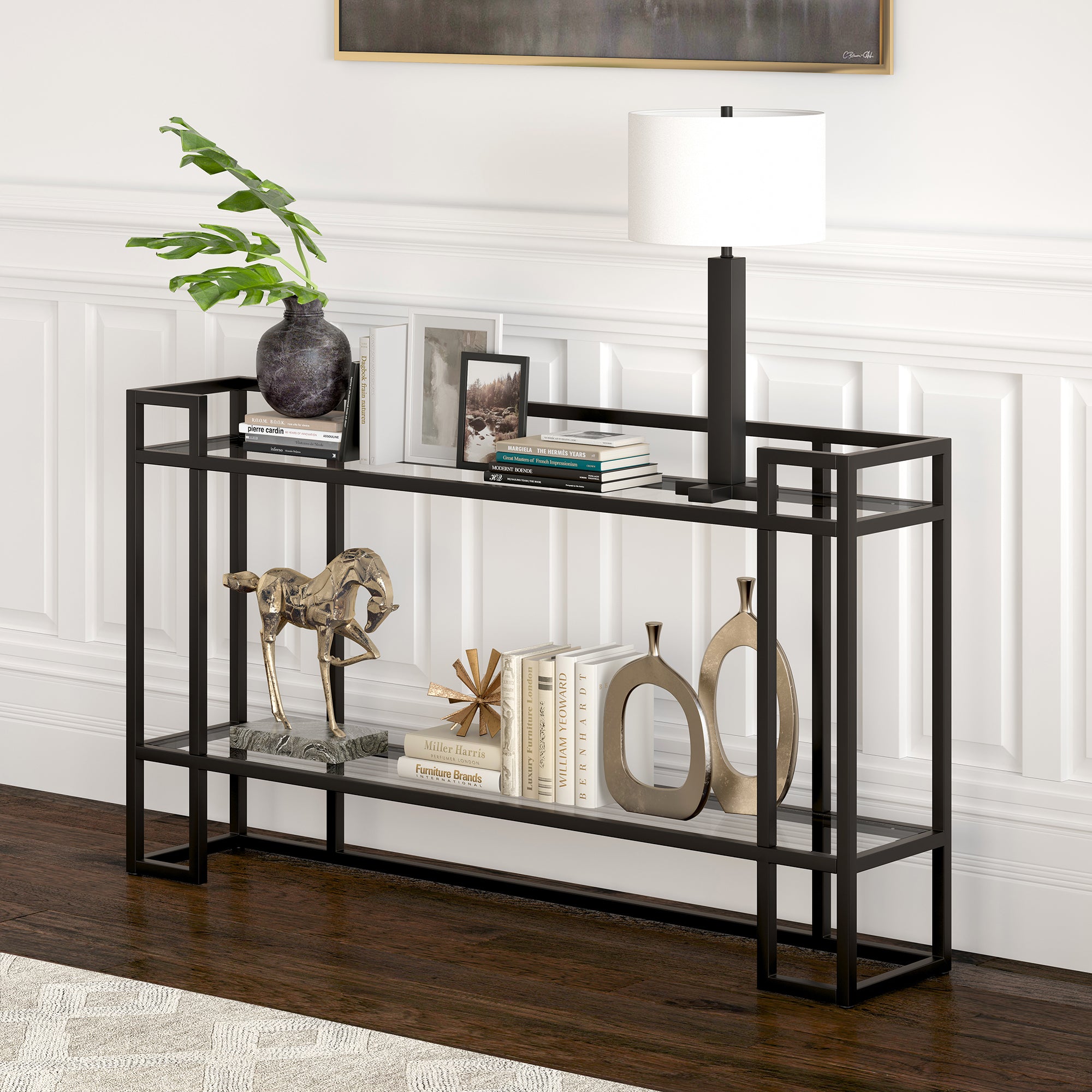 A strong linear profile sets this Art Deco-inspired console table apart. Its overlapping geometric lines offset the durable tempered glass tabletop and shelf, creating an artful backdrop for framed photos, flowers, or your favorite collections of decorative items. The streamlined look and neutral metallic finish pairs seamlessly with your existing color scheme and décor style.