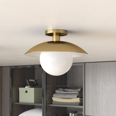 Timeless and elegant, this semi flush mount ceiling light creates a classic look in your entranceway, hallway, or dining room. Styled with a hint of a retro inspiration, this fixture remains thoroughly modern with on-trend finishes. The enclosed white milk glass shade diffuses light against the inner white finish of the metal overhang, creating ample yet gentle light throughout your space without a glare.